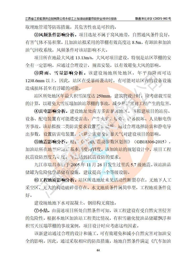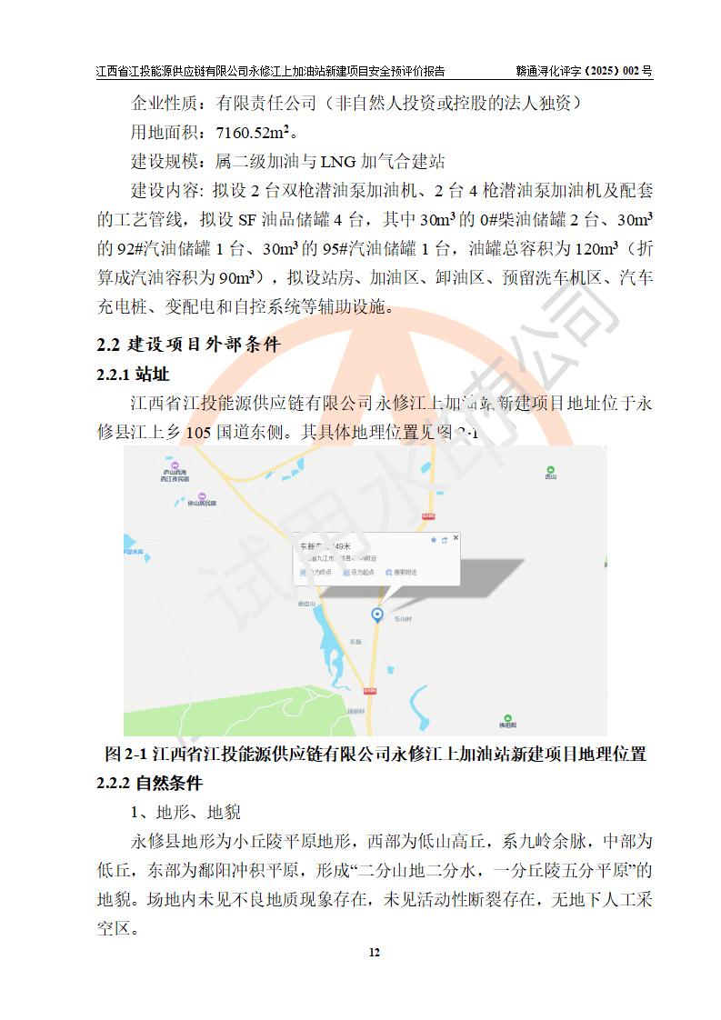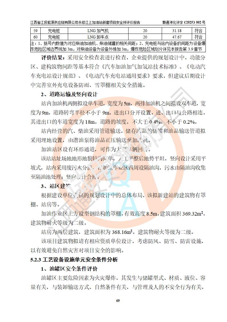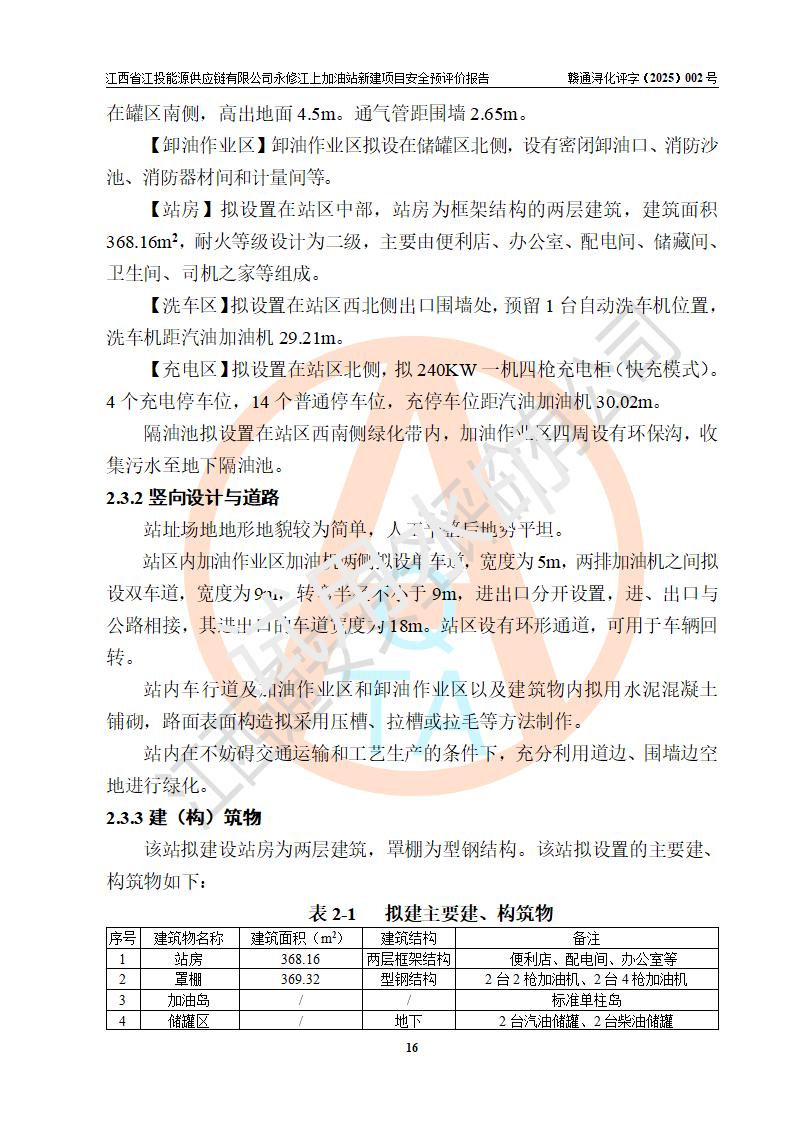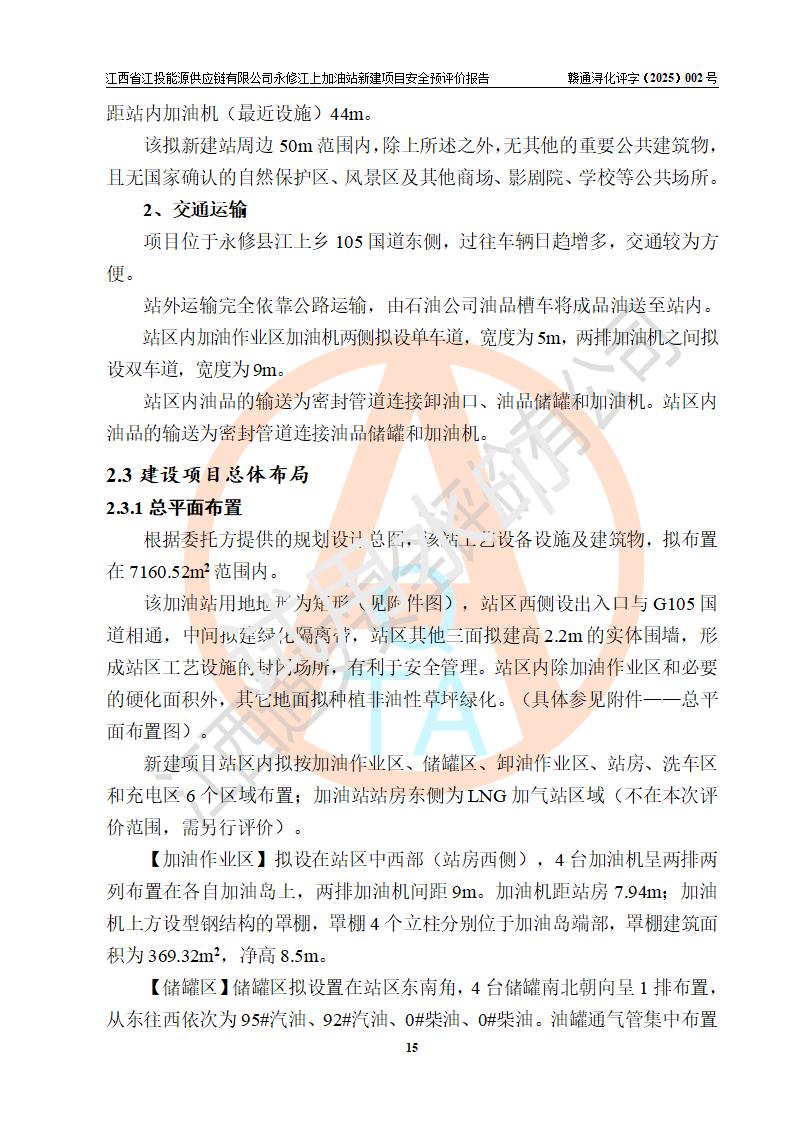 項目簡介 | 江西省江投能源供應鏈有限公司是一家專門從事成品油經(jīng)營的有限責任公司(非自然人投資或控股的法人獨資),住所在江西省南昌市經(jīng)濟技術開發(fā)區(qū)雙港大道中聯(lián)村;現(xiàn)企業(yè)擬投資建設江西省江投能源供應鏈有限公司永修江上加油站新建項目,項目擬建地址在永修縣江上鄉(xiāng)105國道東側,新建項目已取得九江市商務局網(wǎng)點規(guī)劃確認的通知,同時已取得永修縣行政審批局簽發(fā)的《江西省企業(yè)投資項目備案通知書》,項目統(tǒng)一代碼為2410-360425-04-01-430117,該項目的建設用地已取得永修縣自然資源局頒發(fā)的不動產(chǎn)權證書:贛(2024)永修縣不動產(chǎn)權第0010955號。 該項目新建加油站擬與LNG加氣站合并建設,LNG加氣站部分不在本次評價范圍,僅做一般性描述;該項目站房西側為加油站罩棚,站房東側為加氣站罩棚,加油站罐區(qū)擬設置在站區(qū)東南角,加氣站罩棚東側擬設置LNG撬裝設備1臺,站區(qū)北側擬設置停車位,西部4個停車位擬設置4臺**充電樁,站區(qū)西北角擬設置一處預留自動洗車機位置。 該項目新建加油站總用地面積為7160.52m2,屬于加油與LNG加氣合建站,站內(nèi)擬設2臺雙槍潛油泵加油機、2臺4槍潛油泵加油機及配套的工藝管線,擬設SF油品儲罐4臺,其中30m3的0#柴油儲罐2臺、30m3的92#汽油儲罐1臺、30m3的95#汽油儲罐1臺,油罐總容積為120m3(折算成汽油容積為90m3),站內(nèi)另設60m3LNG撬裝設備1臺,按現(xiàn)行的《汽車加油加氣加氫站技術標準》表3.0.16的規(guī)定劃分,該站屬二級加油與LNG加氣合建站。 | |||