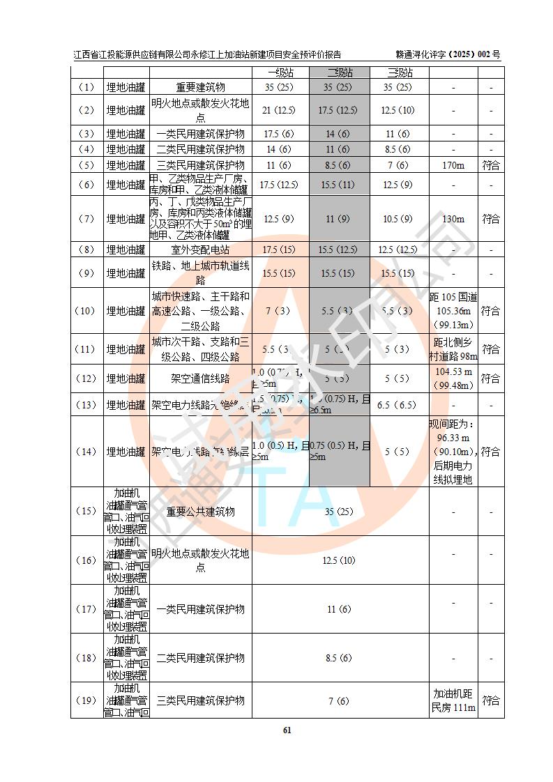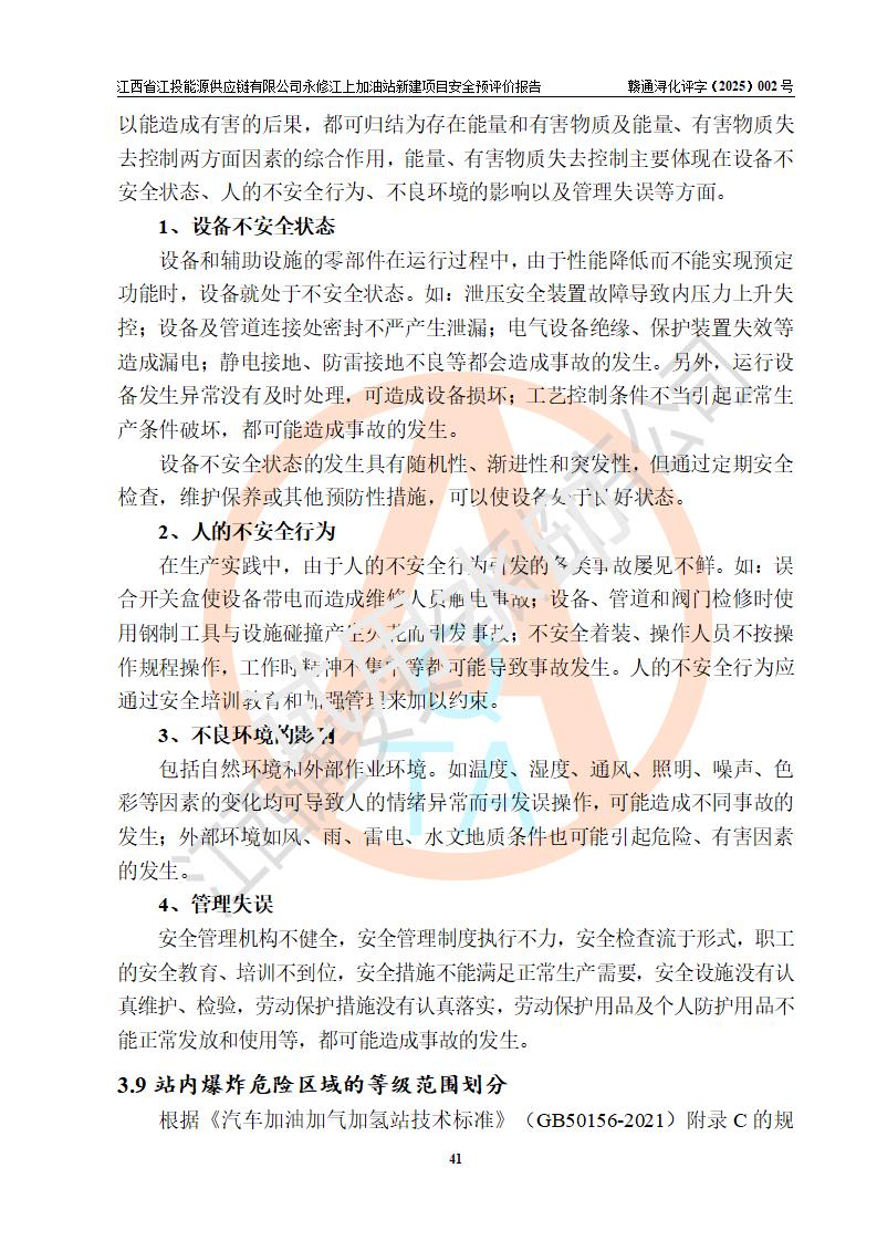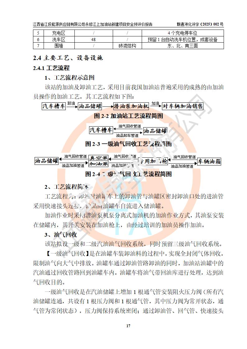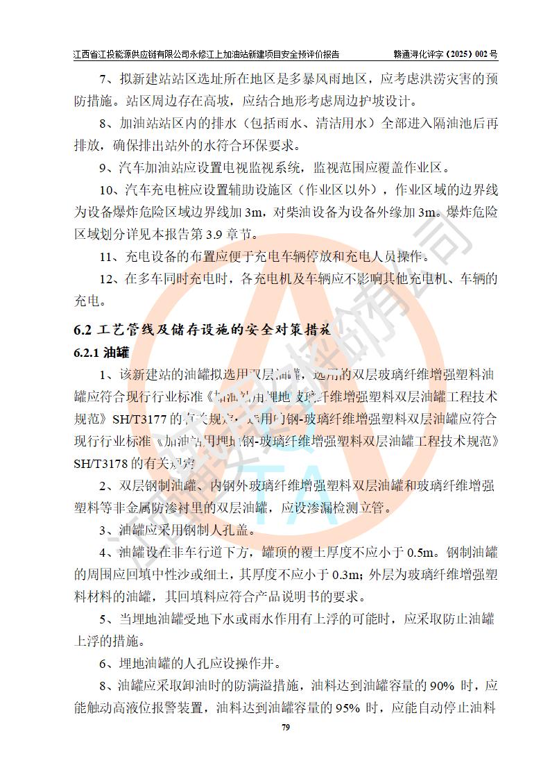 項目簡介 | 江西省江投能源供應鏈有限公司是一家專門從事成品油經(jīng)營的有限責任公司(非自然人投資或控股的法人獨資),住所在江西省南昌市經(jīng)濟技術開發(fā)區(qū)雙港大道中聯(lián)村;現(xiàn)企業(yè)擬投資建設江西省江投能源供應鏈有限公司永修江上加油站新建項目,項目擬建地址在永修縣江上鄉(xiāng)105國道東側,新建項目已取得九江市商務局網(wǎng)點規(guī)劃確認的通知,同時已取得永修縣行政審批局簽發(fā)的《江西省企業(yè)投資項目備案通知書》,項目統(tǒng)一代碼為2410-360425-04-01-430117,該項目的建設用地已取得永修縣自然資源局頒發(fā)的不動產(chǎn)權證書:贛(2024)永修縣不動產(chǎn)權第0010955號。 該項目新建加油站擬與LNG加氣站合并建設,LNG加氣站部分不在本次評價范圍,僅做一般性描述;該項目站房西側為加油站罩棚,站房東側為加氣站罩棚,加油站罐區(qū)擬設置在站區(qū)東南角,加氣站罩棚東側擬設置LNG撬裝設備1臺,站區(qū)北側擬設置停車位,西部4個停車位擬設置4臺**充電樁,站區(qū)西北角擬設置一處預留自動洗車機位置。 該項目新建加油站總用地面積為7160.52m2,屬于加油與LNG加氣合建站,站內(nèi)擬設2臺雙槍潛油泵加油機、2臺4槍潛油泵加油機及配套的工藝管線,擬設SF油品儲罐4臺,其中30m3的0#柴油儲罐2臺、30m3的92#汽油儲罐1臺、30m3的95#汽油儲罐1臺,油罐總容積為120m3(折算成汽油容積為90m3),站內(nèi)另設60m3LNG撬裝設備1臺,按現(xiàn)行的《汽車加油加氣加氫站技術標準》表3.0.16的規(guī)定劃分,該站屬二級加油與LNG加氣合建站。 | |||