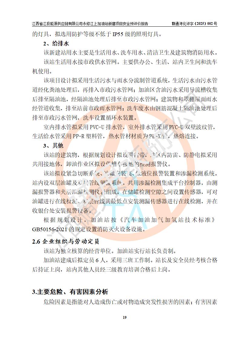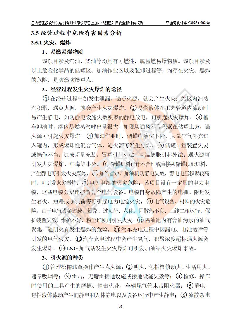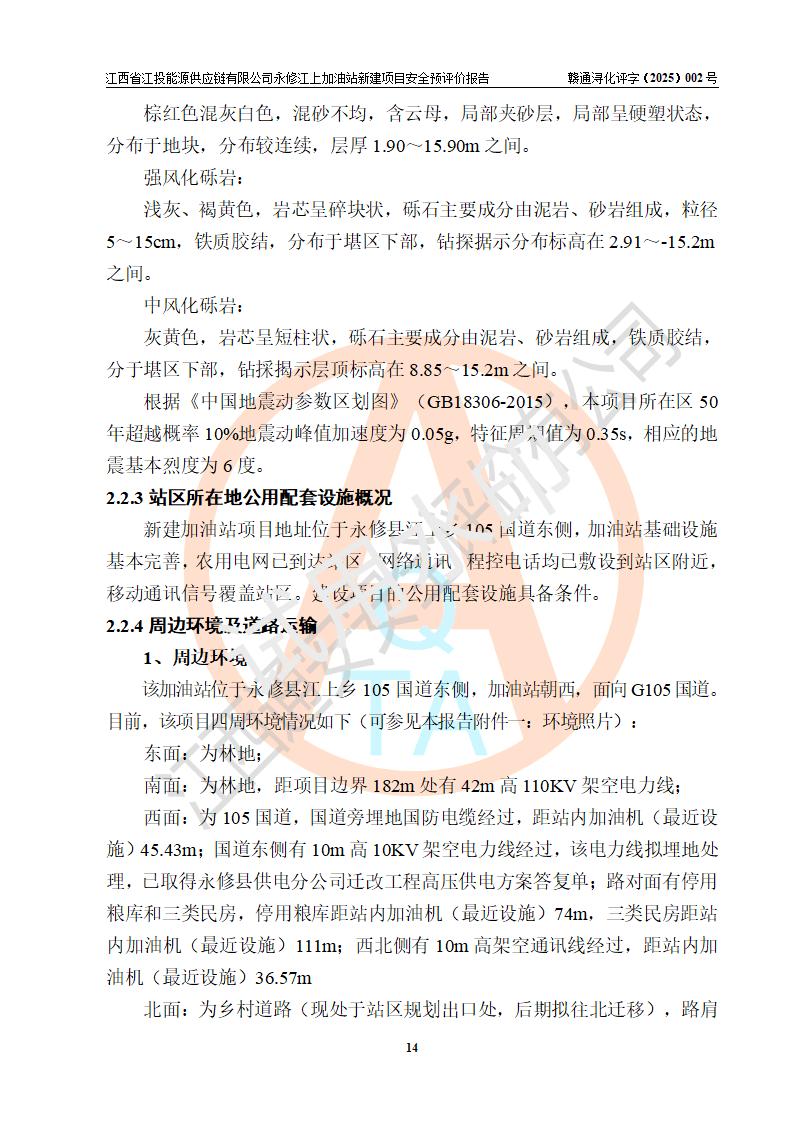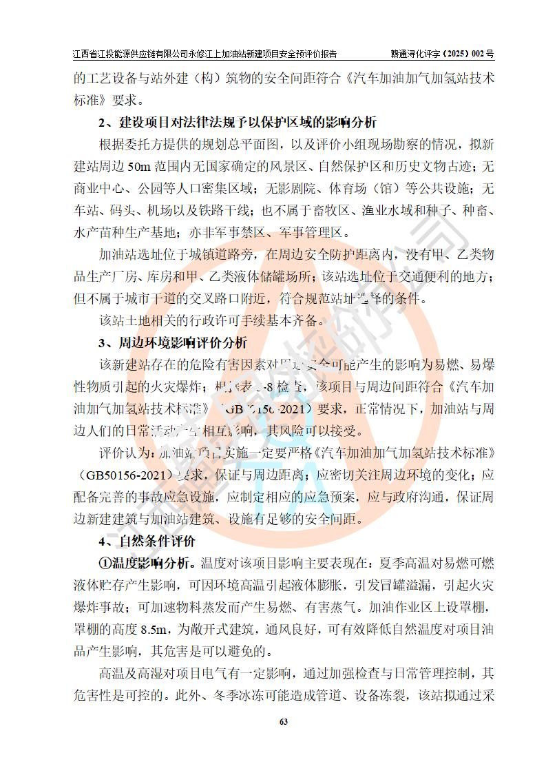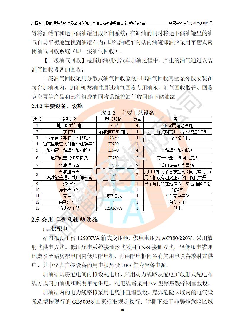 項目簡介 | 江西省江投能源供應鏈有限公司是一家專門從事成品油經(jīng)營的有限責任公司(非自然人投資或控股的法人獨資),住所在江西省南昌市經(jīng)濟技術開發(fā)區(qū)雙港大道中聯(lián)村;現(xiàn)企業(yè)擬投資建設江西省江投能源供應鏈有限公司永修江上加油站新建項目,項目擬建地址在永修縣江上鄉(xiāng)105國道東側,新建項目已取得九江市商務局網(wǎng)點規(guī)劃確認的通知,同時已取得永修縣行政審批局簽發(fā)的《江西省企業(yè)投資項目備案通知書》,項目統(tǒng)一代碼為2410-360425-04-01-430117,該項目的建設用地已取得永修縣自然資源局頒發(fā)的不動產(chǎn)權證書:贛(2024)永修縣不動產(chǎn)權第0010955號。 該項目新建加油站擬與LNG加氣站合并建設,LNG加氣站部分不在本次評價范圍,僅做一般性描述;該項目站房西側為加油站罩棚,站房東側為加氣站罩棚,加油站罐區(qū)擬設置在站區(qū)東南角,加氣站罩棚東側擬設置LNG撬裝設備1臺,站區(qū)北側擬設置停車位,西部4個停車位擬設置4臺**充電樁,站區(qū)西北角擬設置一處預留自動洗車機位置。 該項目新建加油站總用地面積為7160.52m2,屬于加油與LNG加氣合建站,站內(nèi)擬設2臺雙槍潛油泵加油機、2臺4槍潛油泵加油機及配套的工藝管線,擬設SF油品儲罐4臺,其中30m3的0#柴油儲罐2臺、30m3的92#汽油儲罐1臺、30m3的95#汽油儲罐1臺,油罐總容積為120m3(折算成汽油容積為90m3),站內(nèi)另設60m3LNG撬裝設備1臺,按現(xiàn)行的《汽車加油加氣加氫站技術標準》表3.0.16的規(guī)定劃分,該站屬二級加油與LNG加氣合建站。 | |||