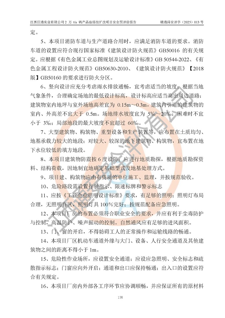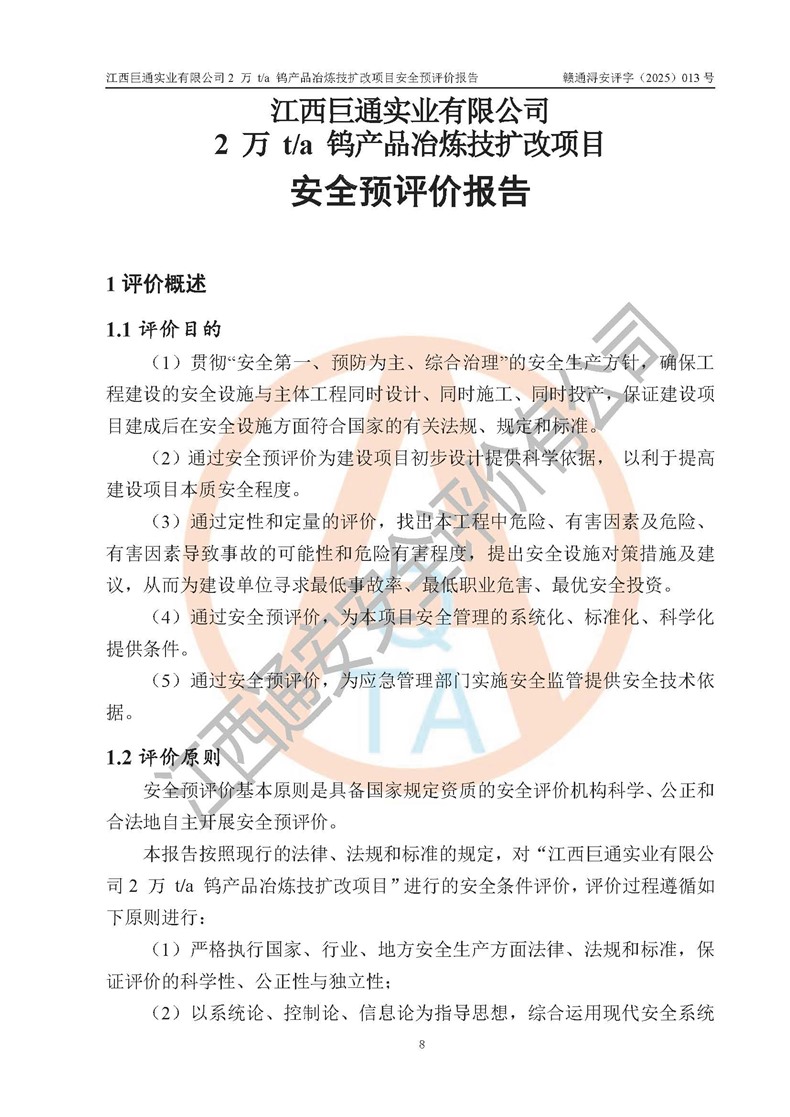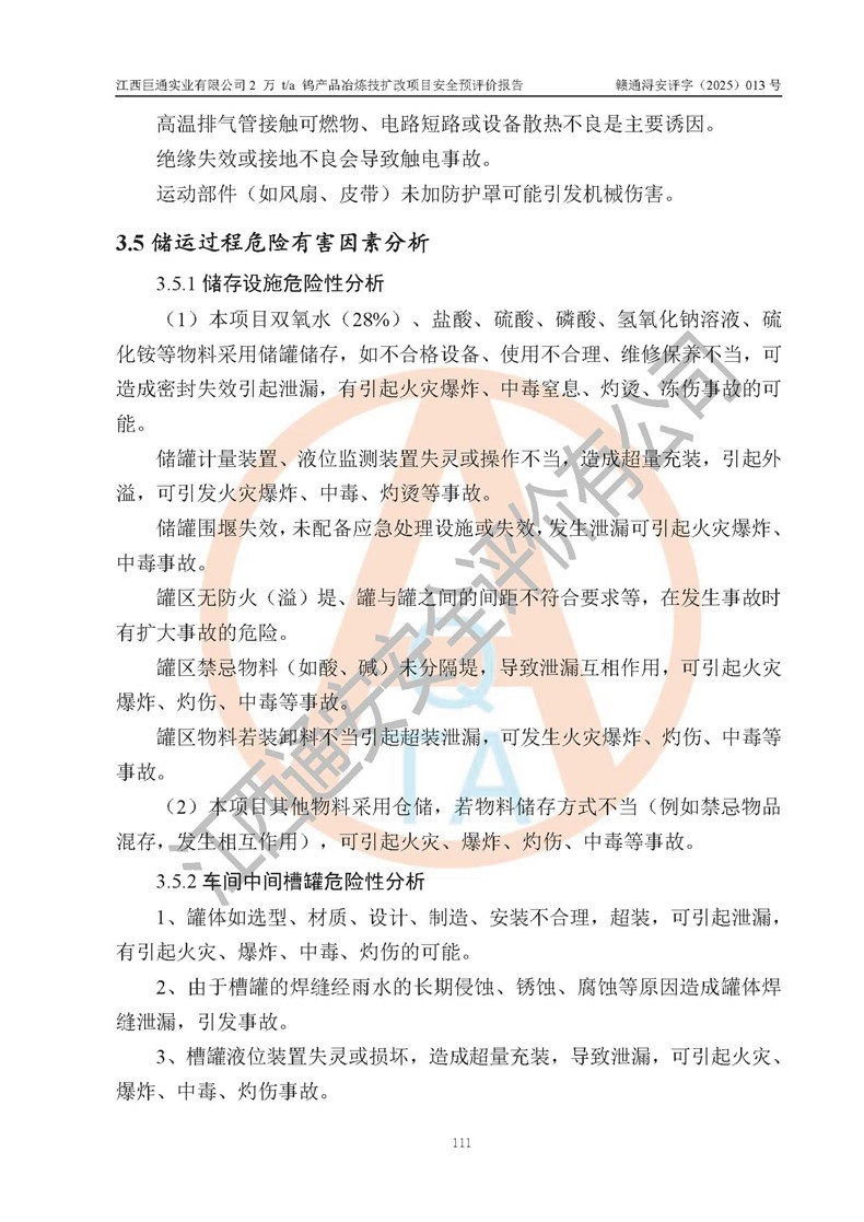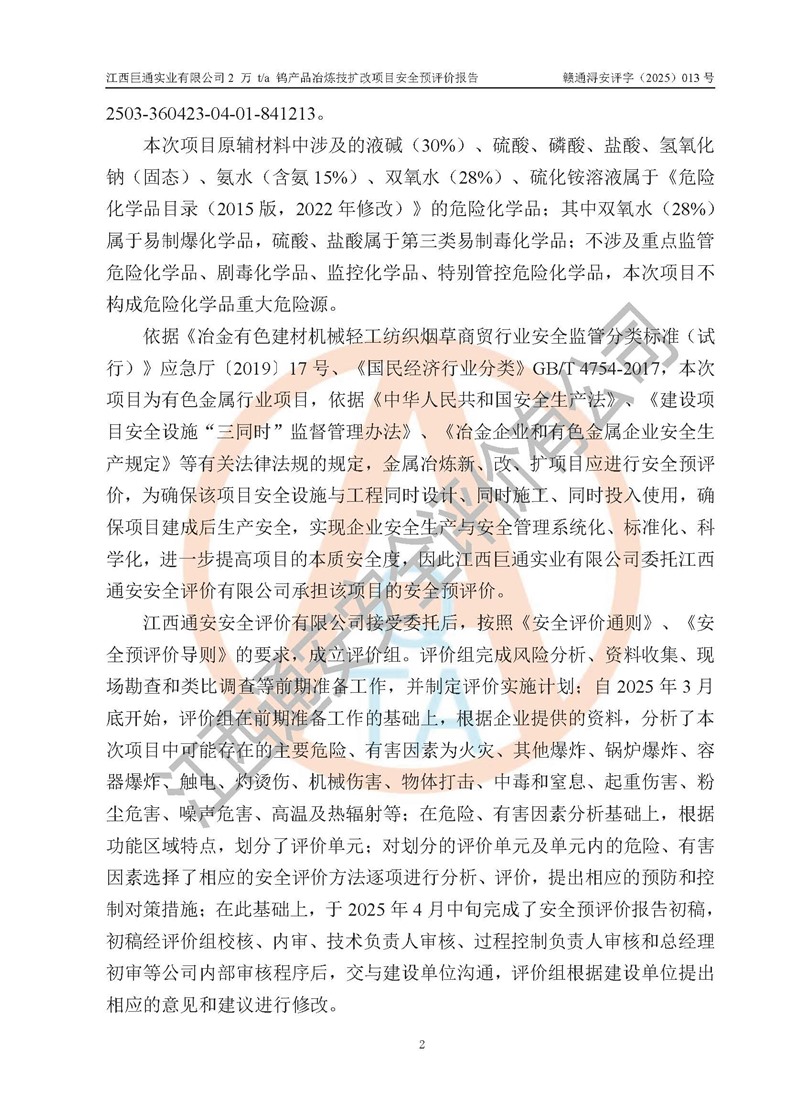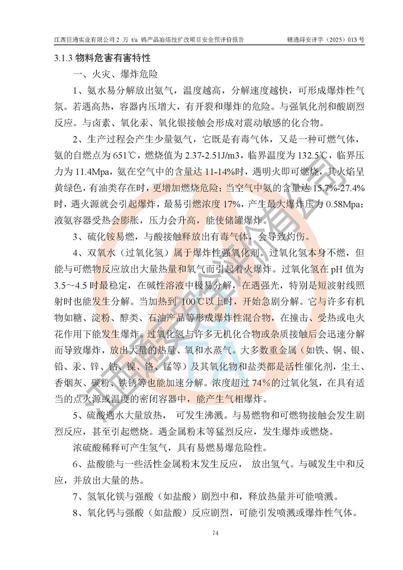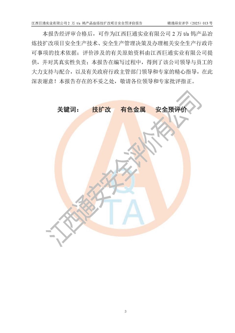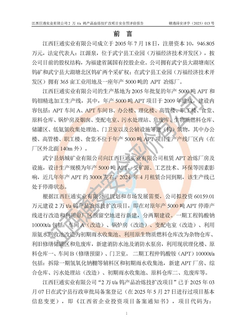 評(píng)價(jià)報(bào)告名稱 | 江西巨通實(shí)業(yè)有限公司2 萬 t/a 鎢產(chǎn)品冶煉技擴(kuò)改項(xiàng)目安全預(yù)評(píng)價(jià)報(bào)告 | |||