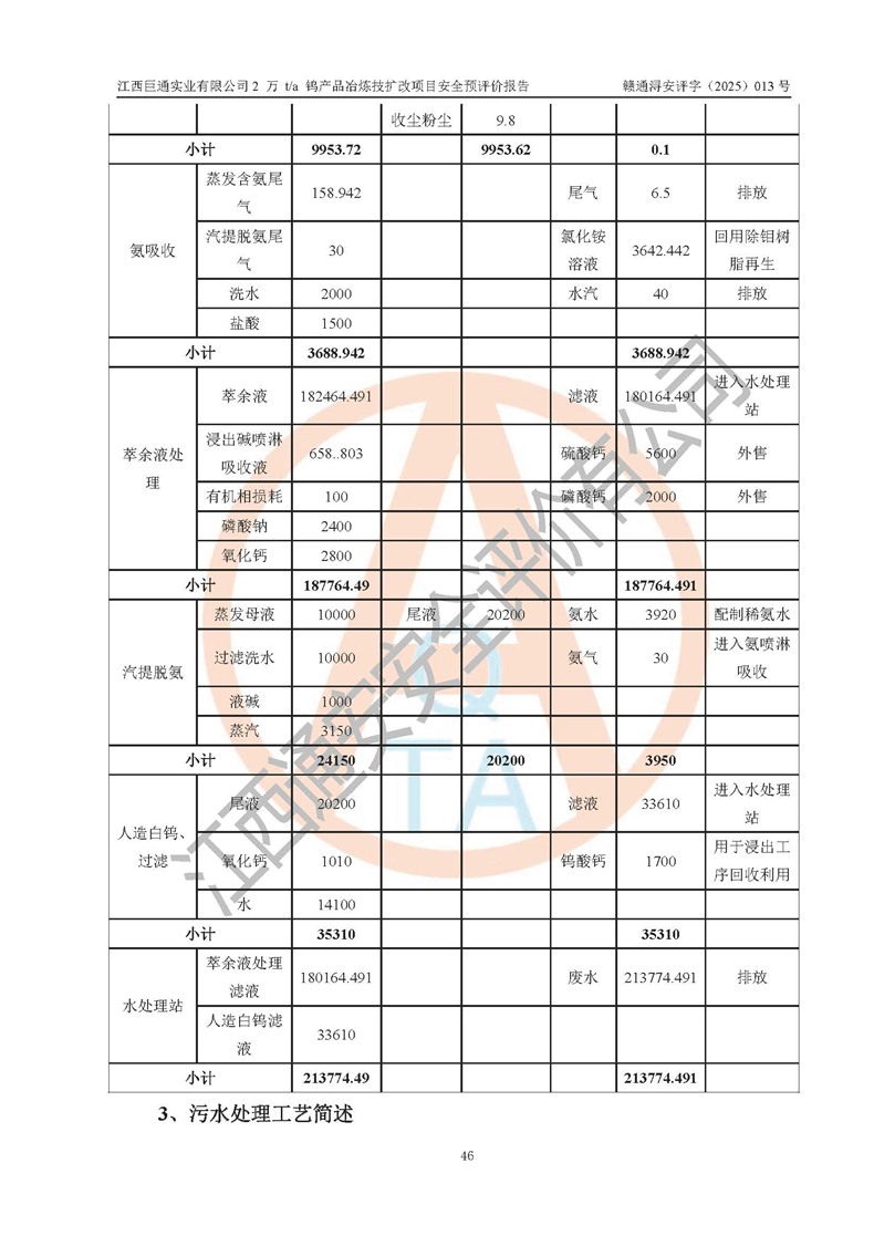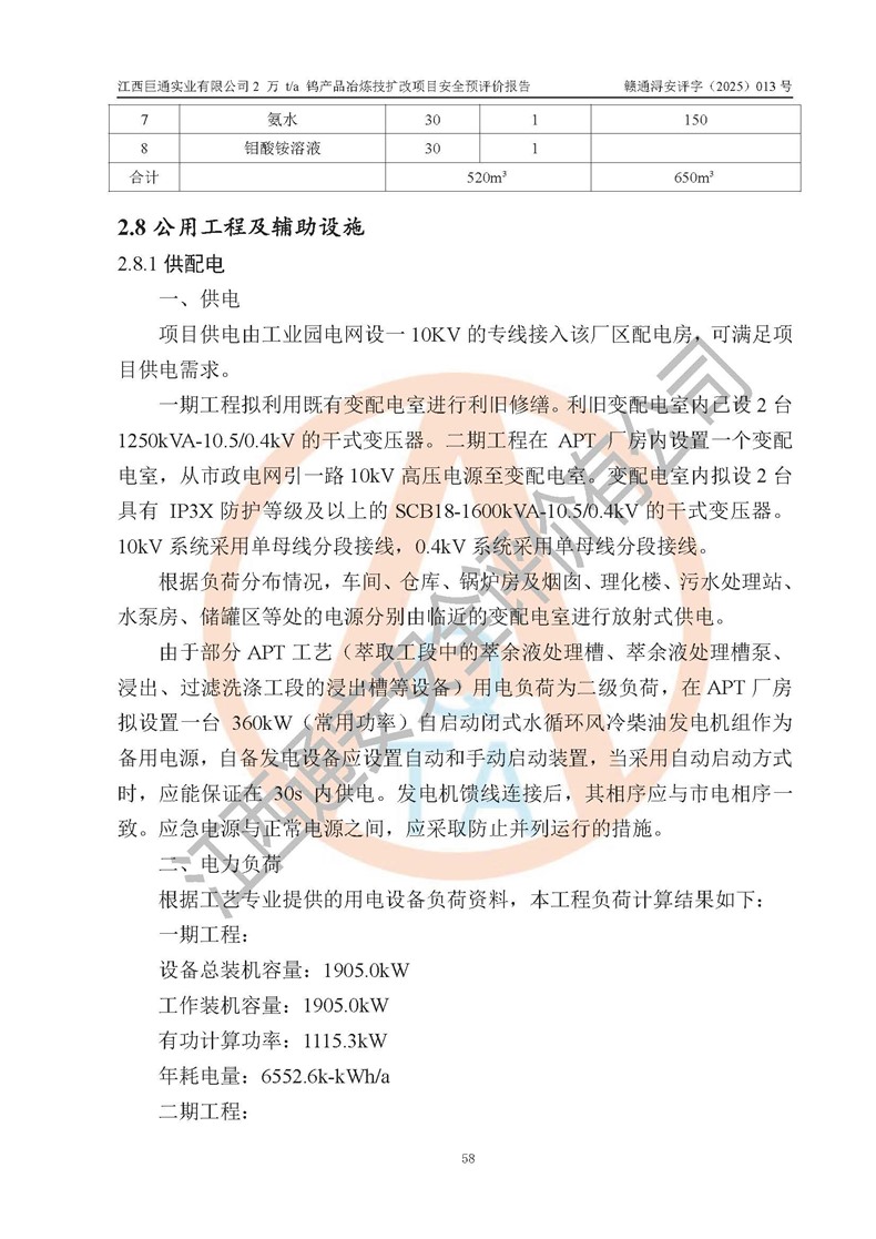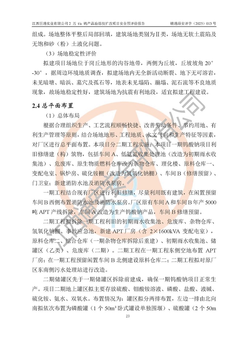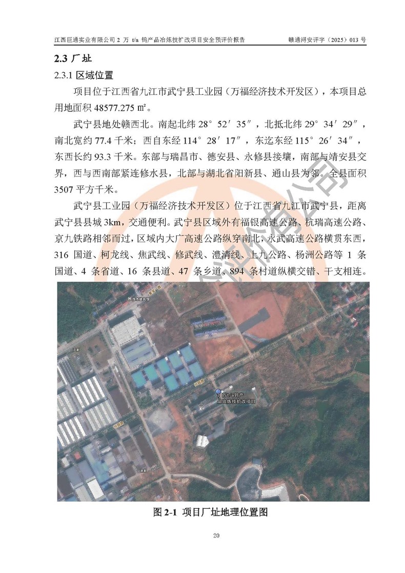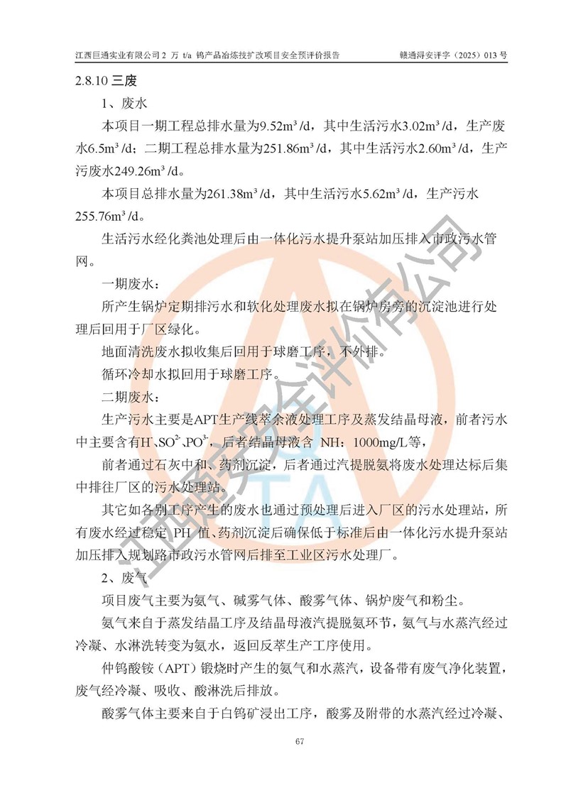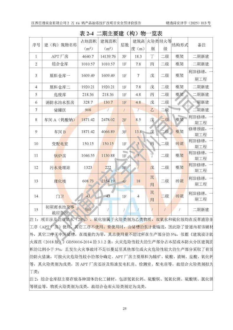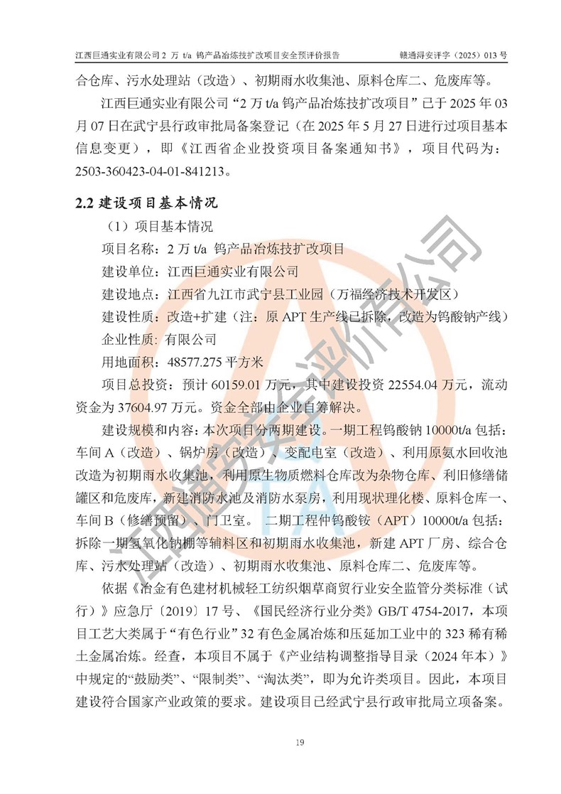 項(xiàng)目簡介 | 江西巨通實(shí)業(yè)有限公司成立于2005年7月18日,注冊(cè)資本10,946.805萬元,法定**人:江源泉,位于武寧縣工業(yè)園(萬福經(jīng)濟(jì)技術(shù)開發(fā)區(qū)),按公司目前的股權(quán)結(jié)構(gòu),為福建省屬國有控股企業(yè)。公司擁有武寧縣大湖塘南區(qū)鎢礦和武寧縣大湖塘北區(qū)鎢礦兩個(gè)采礦權(quán);在武寧縣工業(yè)園(萬福經(jīng)濟(jì)技術(shù)開發(fā)區(qū))擁有365畝工業(yè)用地及一座年產(chǎn)5000噸的 APT 冶煉廠。 江西巨通實(shí)業(yè)有限公司的生產(chǎn)基地為2005年批復(fù)的年產(chǎn)5000噸APT和鎢鉬精選加工生產(chǎn)線,其中,年產(chǎn)5000噸APT項(xiàng)目于2009年建成,建設(shè)內(nèi)容包括:APT車間A、APT車間B、辦公樓、理化樓、高管樓、職工樓、食堂、原料倉庫、鍋爐房及煙囪、變配電室、污水處理站、危廢庫、生物質(zhì)燃料倉庫、儲(chǔ)罐區(qū)、低氨氮收集處理池、門衛(wèi)室以及公輔設(shè)施等建(構(gòu))筑物,其中辦公樓、高管樓、職工樓、食堂不位于年產(chǎn)5000噸APT項(xiàng)目生產(chǎn)產(chǎn)線廠區(qū)內(nèi)(在廠區(qū)外北面140m外),不在本次評(píng)價(jià)范圍之內(nèi)。 武寧縣炳城礦業(yè)有限公司向江西巨通實(shí)業(yè)有限公司租賃APT冶煉廠房及設(shè)施,設(shè)計(jì)生產(chǎn)規(guī)模為年產(chǎn)5000噸APT,受礦源、工藝技術(shù)、**等因素影響,近幾年年產(chǎn)APT約3000t左右。2024 年4月租賃合同到期,該生產(chǎn)線已處于停滯狀態(tài)。 根據(jù)江西巨通實(shí)業(yè)有限公司規(guī)劃和市場(chǎng)發(fā)展需要,公司擬投資60159.01萬元建設(shè)2萬t/a鎢產(chǎn)品冶煉技擴(kuò)改項(xiàng)目,即在對(duì)原年產(chǎn)5000噸APT停滯產(chǎn)線進(jìn)行改造和利用原廠區(qū)預(yù)留空地進(jìn)行新建,分兩期建設(shè)。一期工程鎢酸鈉10000t/a包括:車間A(改造)、鍋爐房(改造)、變配電室(改造)、利用原氨水回收池改造為初期雨水收集池、利用原生物質(zhì)燃料倉庫改為雜物倉庫、利舊修繕儲(chǔ)罐區(qū)和危廢庫,新建消防水池及消防水泵房,利用現(xiàn)狀理化樓、原料倉庫一、車間B(修繕預(yù)留)、門衛(wèi)室。 二期工程仲鎢酸銨(APT)10000t/a包括:拆除一期氫氧化鈉棚等輔料區(qū)和初期雨水收集池,新建APT廠房、綜合倉庫、污水處理站(改造)、初期雨水收集池、原料倉庫二、危廢庫等。 江西巨通實(shí)業(yè)有限公司“2萬t/a鎢產(chǎn)品冶煉技擴(kuò)改項(xiàng)目”已于2025年03月07日在武寧縣行政審批局備案登記(在2025年5月27日進(jìn)行過項(xiàng)目基本信息變更),即《江西省企業(yè)投資項(xiàng)目備案通知書》,項(xiàng)目代碼為:2503-360423-04-01-841213。 | |||