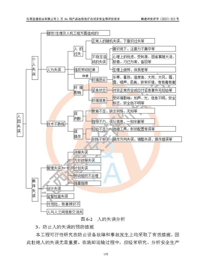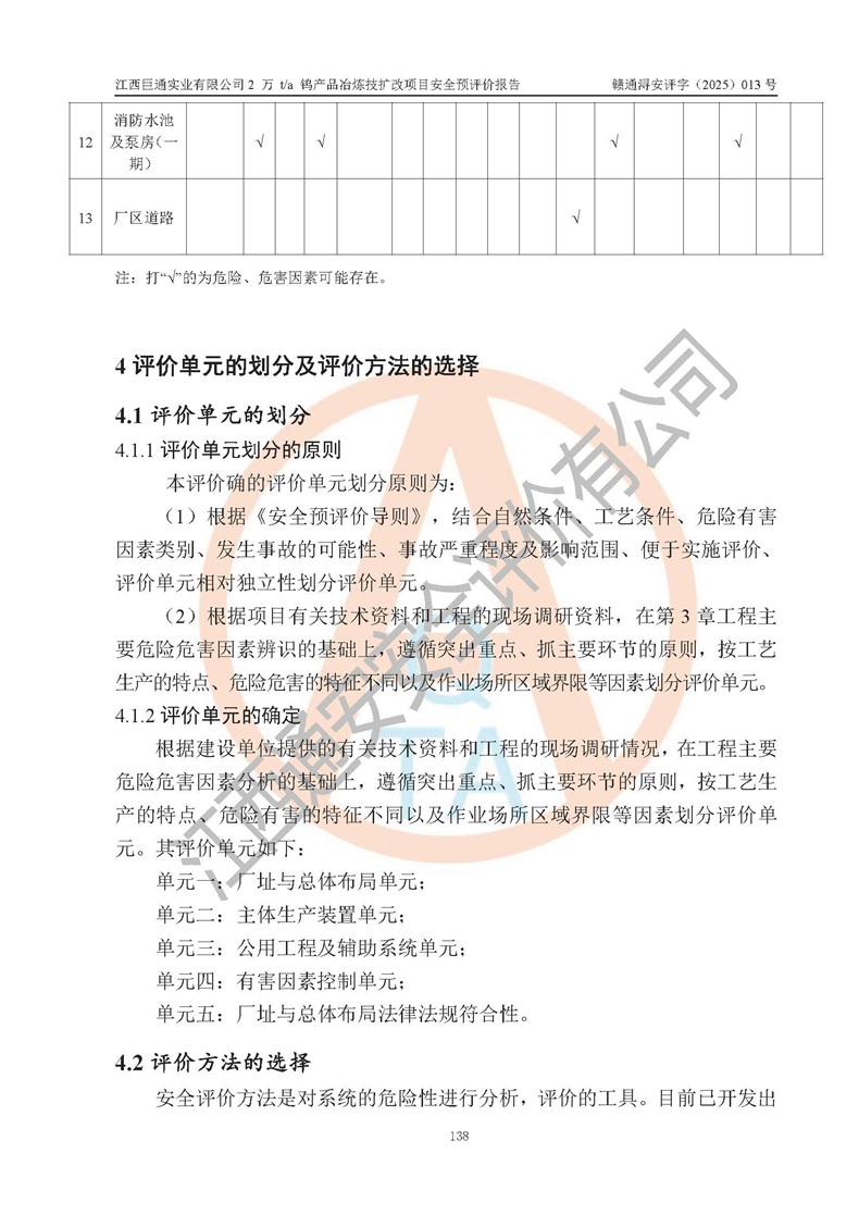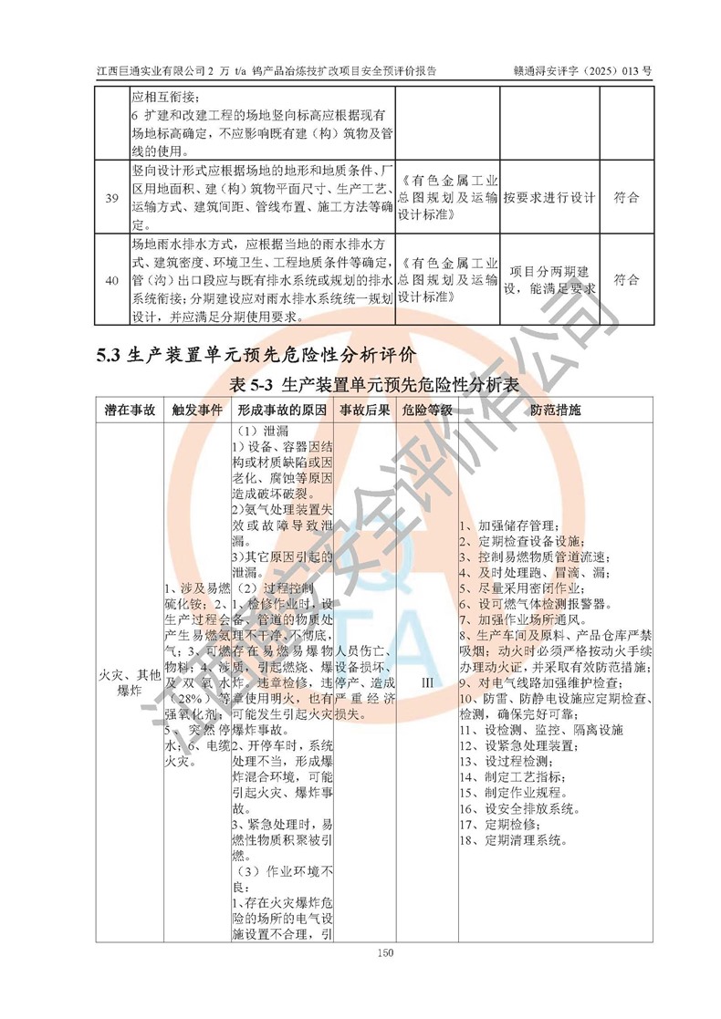 評(píng)價(jià)結(jié)論 | 江西巨通實(shí)業(yè)有限公司“2 萬 t/a 鎢產(chǎn)品冶煉技擴(kuò)改項(xiàng)目”的廠址及總體布局、周邊環(huán)境、自然環(huán)境能滿足建設(shè)安全條件;項(xiàng)目選擇的工藝過程及設(shè)備設(shè)施的安全可靠性能達(dá)到**法規(guī)、標(biāo)準(zhǔn)規(guī)定要求;項(xiàng)目存在的危險(xiǎn)有害因素可控,在落實(shí)本評(píng)價(jià)報(bào)告提出的有關(guān)安全對(duì)策措施后,其危險(xiǎn)有害程度能達(dá)到可以接受的程度,項(xiàng)目建設(shè)能夠?qū)崿F(xiàn)安全生產(chǎn)條件。 | |||