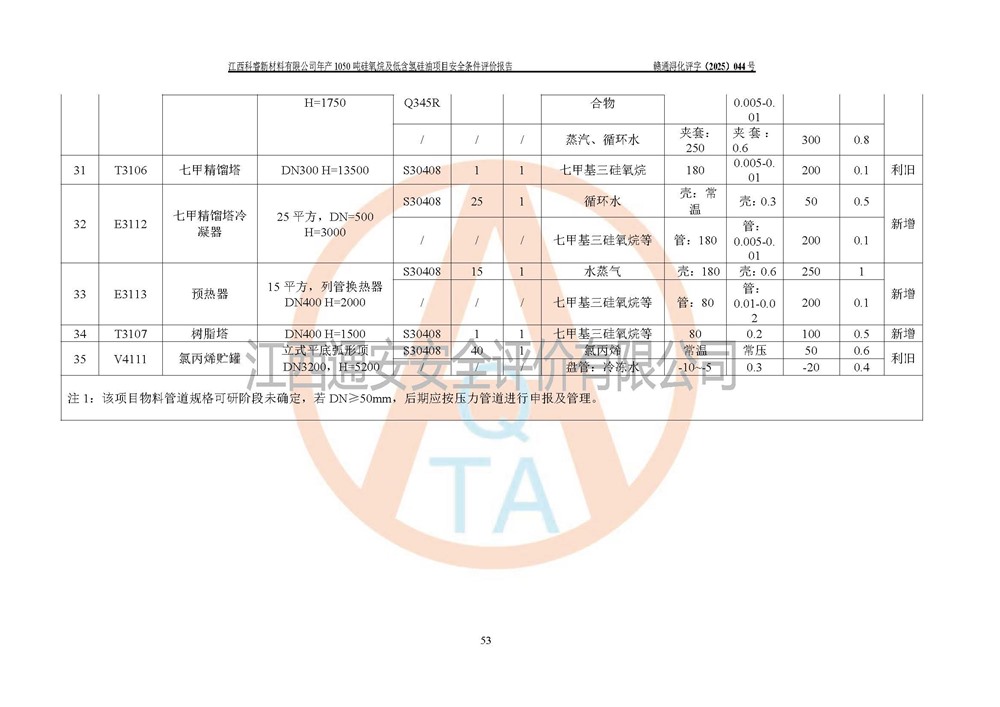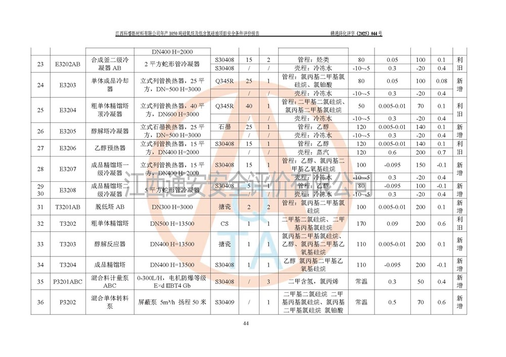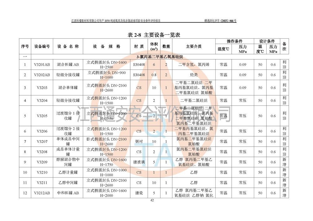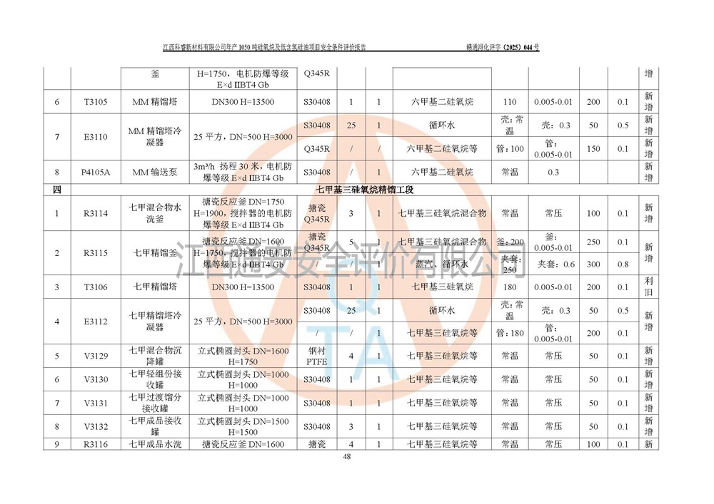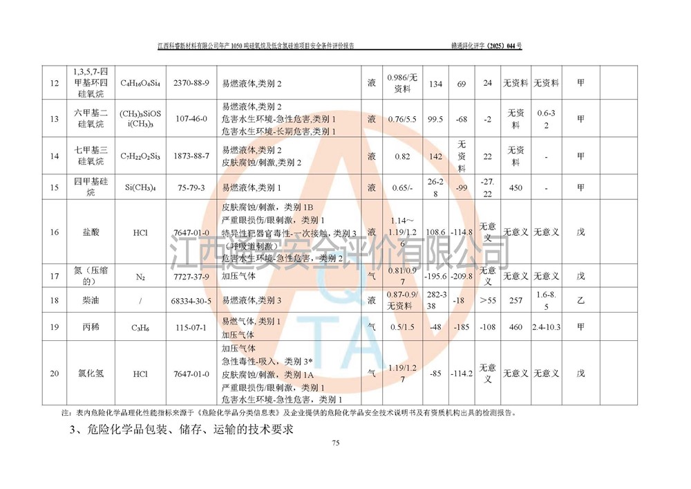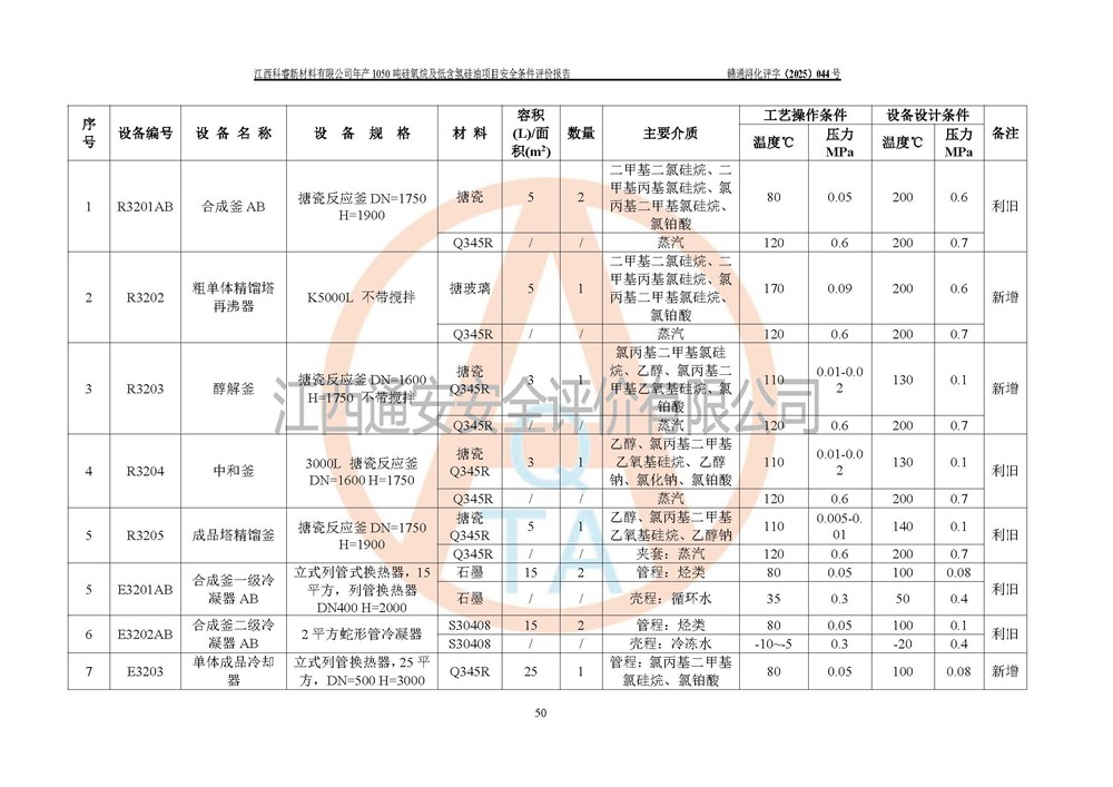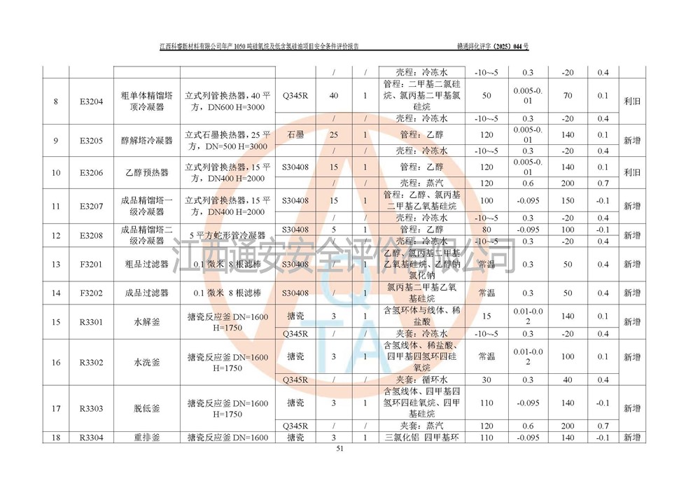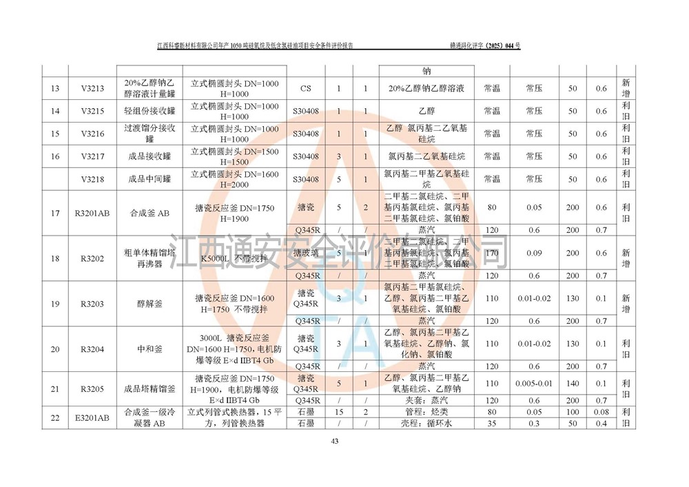 評價結論 | 江西科睿新材料有限公司年產(chǎn)1050噸硅氧烷及低含氫硅油項目的周邊環(huán)境、總體布局、自然環(huán)境能滿足建設安全條件;項目選擇的工藝過程及設備設施的安全可靠性能達到**法規(guī)、標準規(guī)定要求;項目存在的危險有害因素可控,在落實本評價報告提出的有關安全對策措施后,其危險有害程度能達到可以接受的程度,項目建設能夠實現(xiàn)安全運行的目標。 | |||||