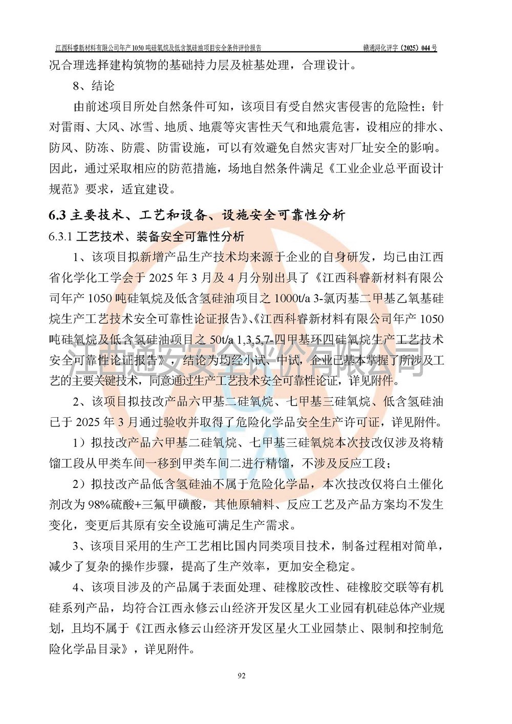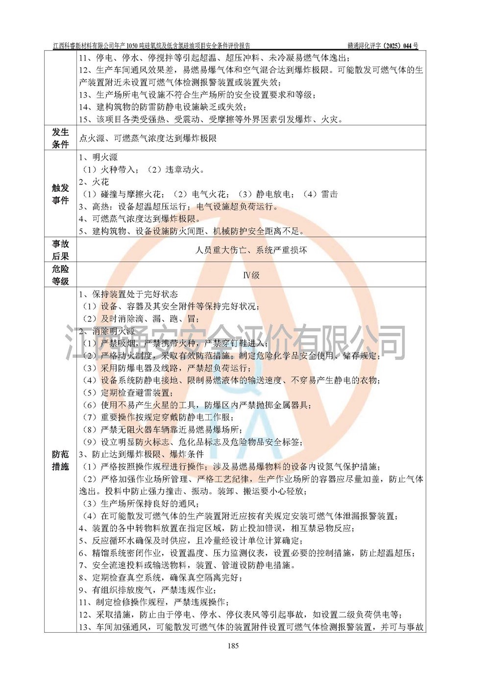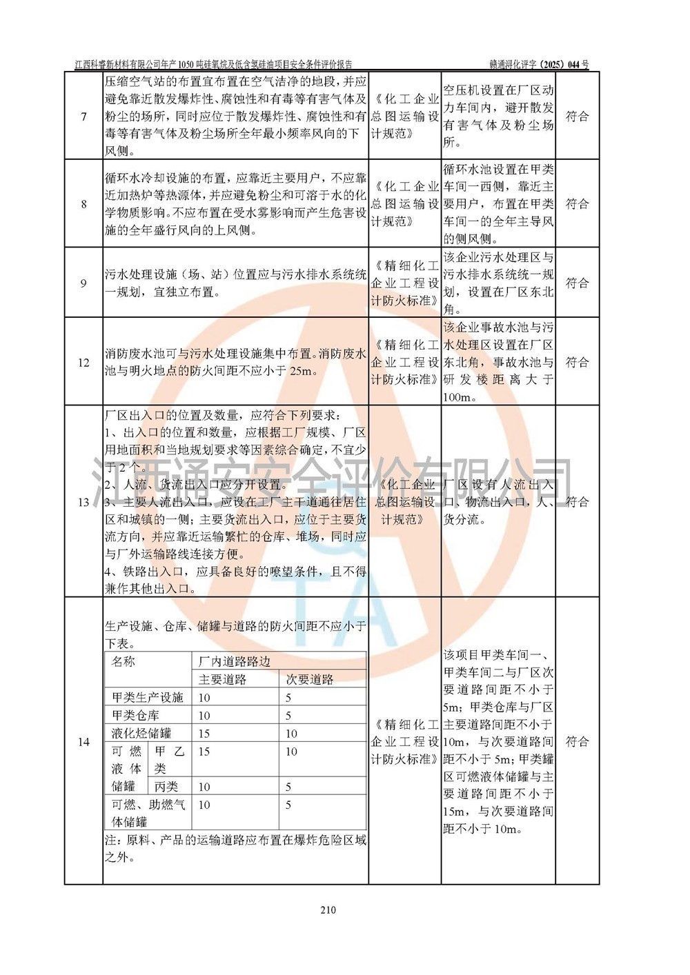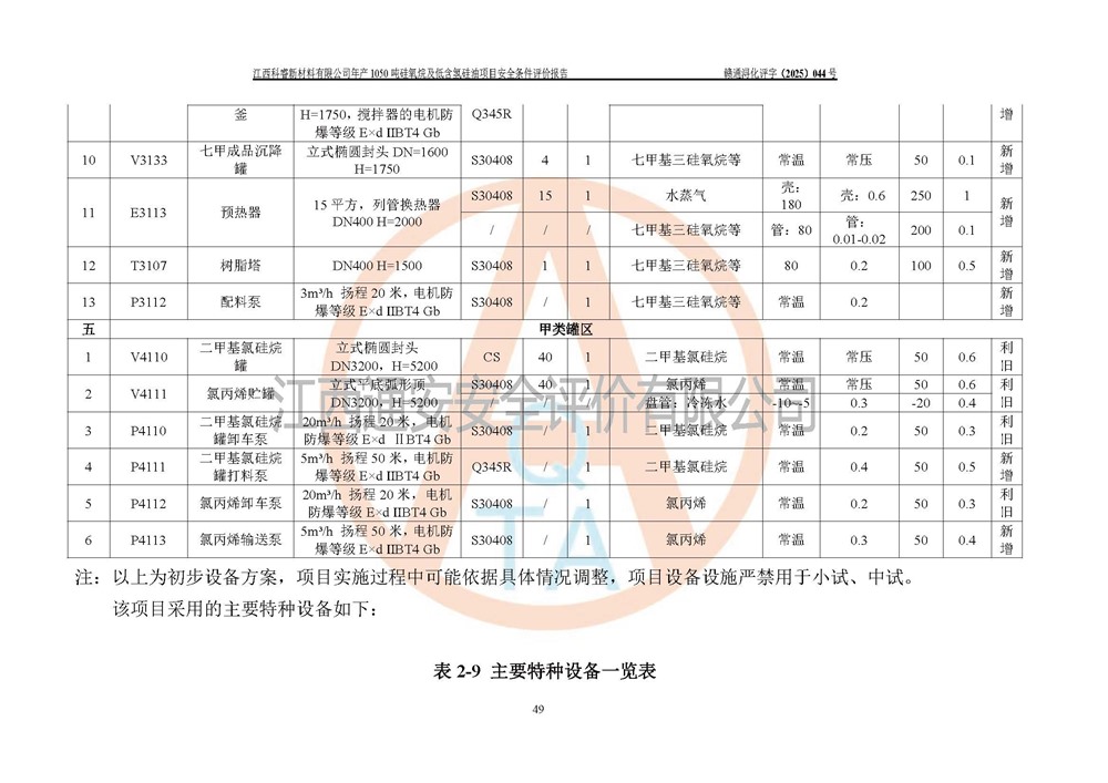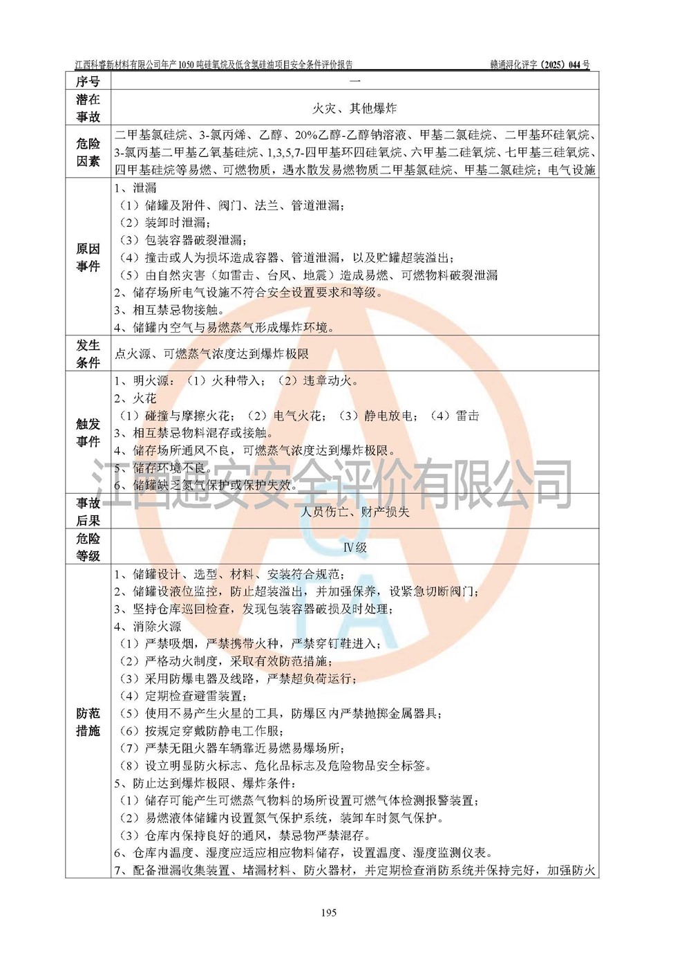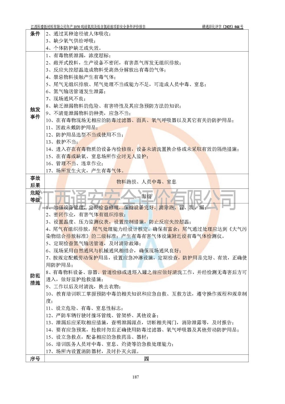 評價結論 | 江西科睿新材料有限公司年產(chǎn)1050噸硅氧烷及低含氫硅油項目的周邊環(huán)境、總體布局、自然環(huán)境能滿足建設安全條件;項目選擇的工藝過程及設備設施的安全可靠性能達到**法規(guī)、標準規(guī)定要求;項目存在的危險有害因素可控,在落實本評價報告提出的有關安全對策措施后,其危險有害程度能達到可以接受的程度,項目建設能夠實現(xiàn)安全運行的目標。 | |||||