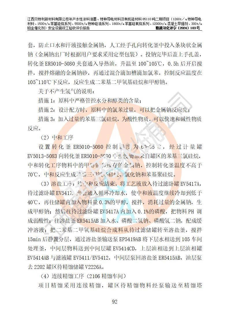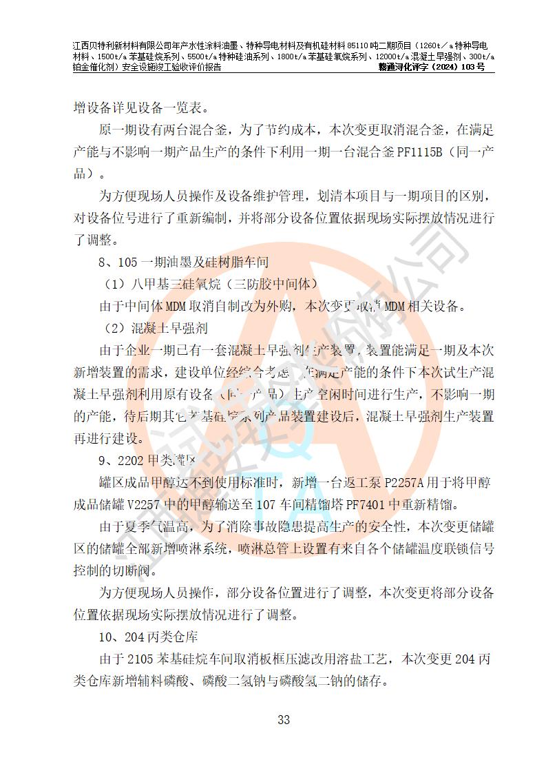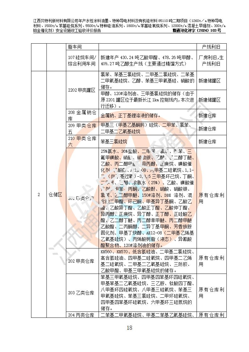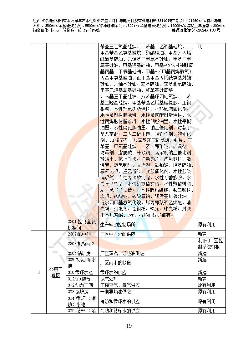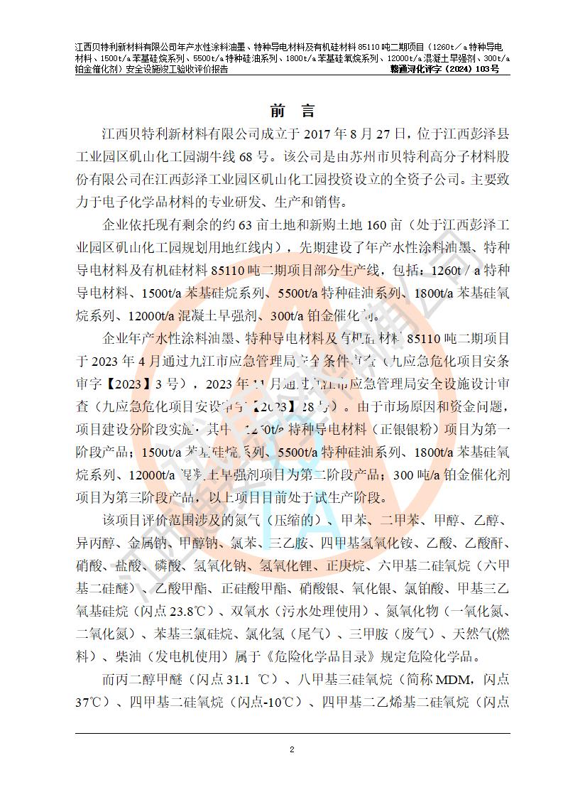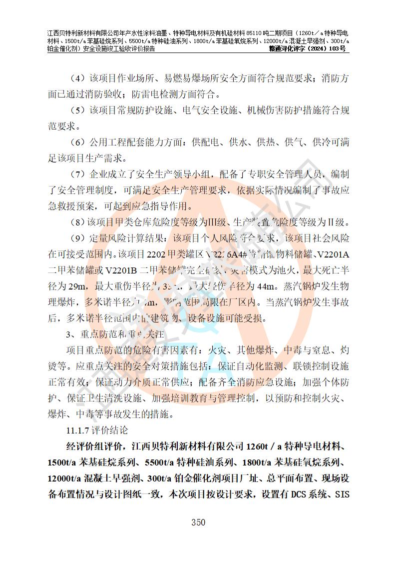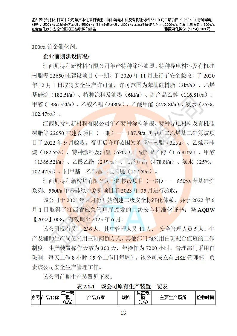 評價報告名稱 | 江西貝特利新材料有限公司年產(chǎn)水性涂料油墨、特種導電材料及有 機硅材料85110噸二期項目(1260t/a特種導電材料、1500t/a苯基硅烷系列、5500t/a特種硅油系列、1800t/a苯基硅氧烷系列、12000t/a混凝土早強劑、300t/a鉑金催化劑)安全設施竣工驗收評價報告 | |||||
