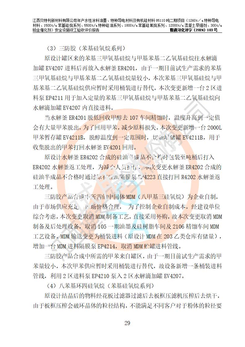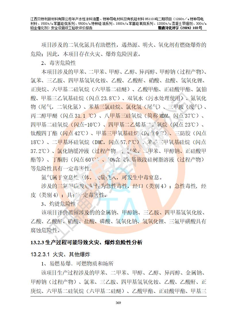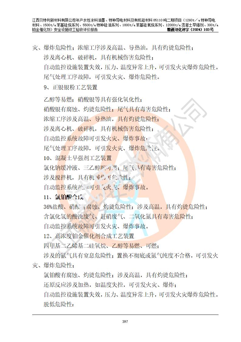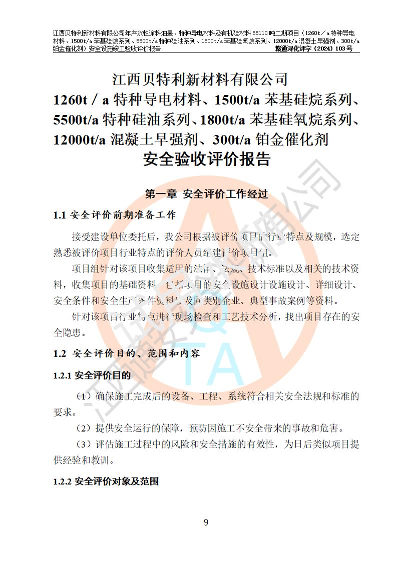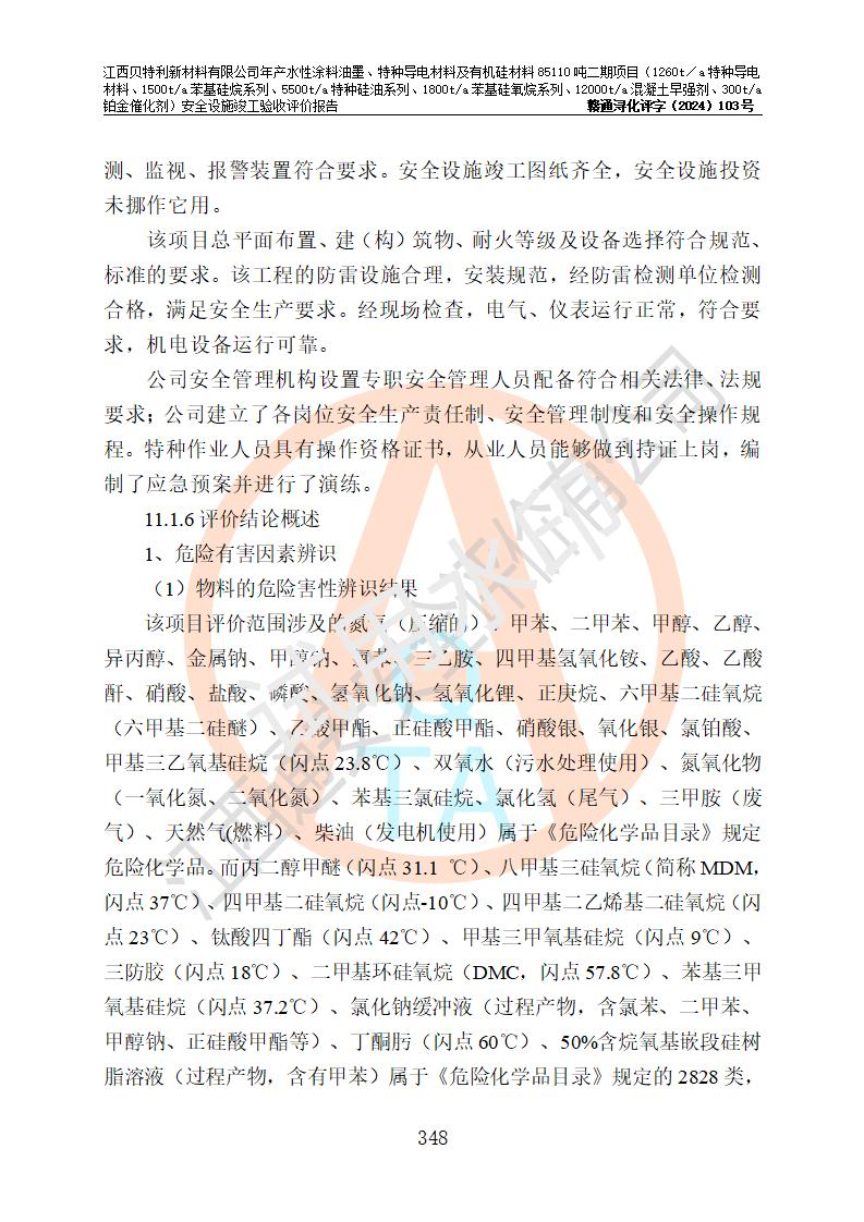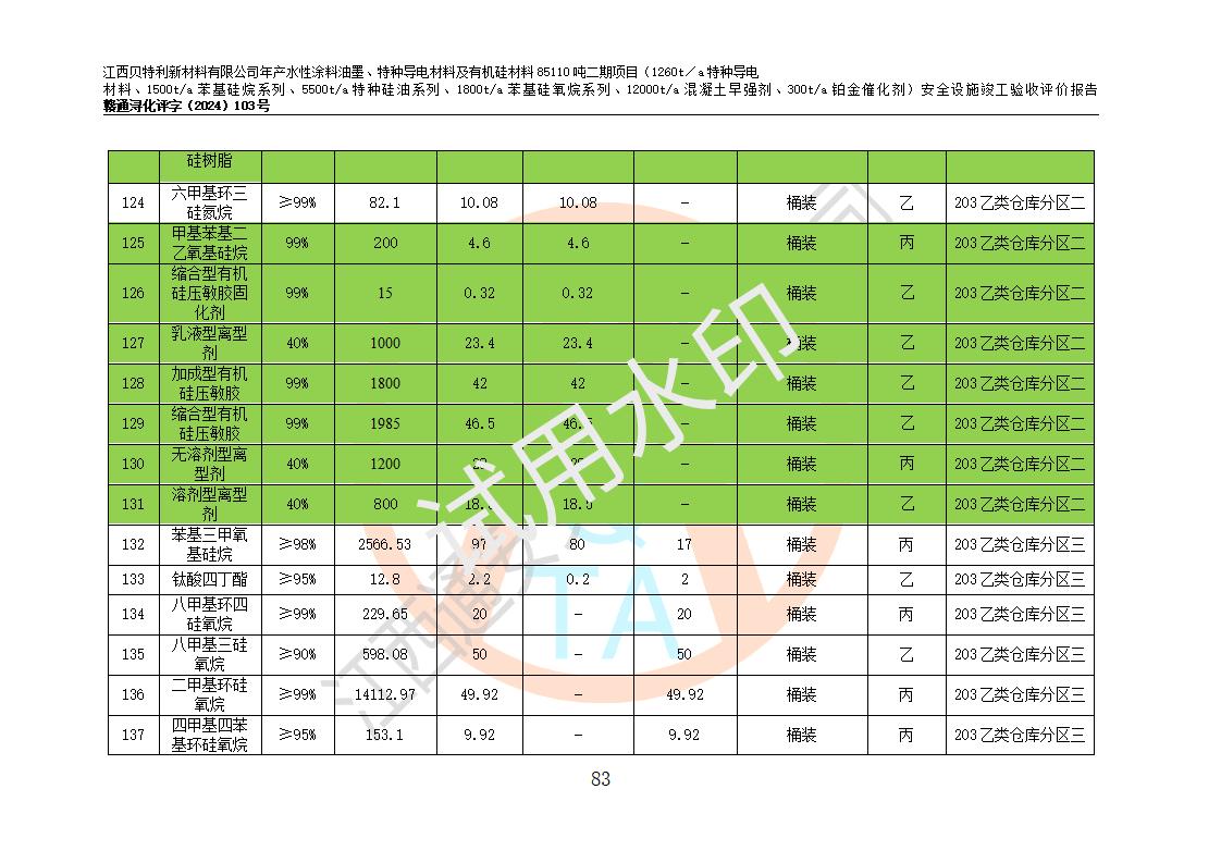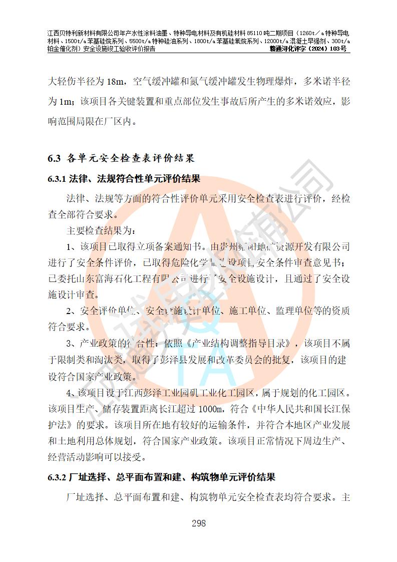 評價報告名稱 | 江西貝特利新材料有限公司年產(chǎn)水性涂料油墨、特種導電材料及有 機硅材料85110噸二期項目(1260t/a特種導電材料、1500t/a苯基硅烷系列、5500t/a特種硅油系列、1800t/a苯基硅氧烷系列、12000t/a混凝土早強劑、300t/a鉑金催化劑)安全設施竣工驗收評價報告 | |||||