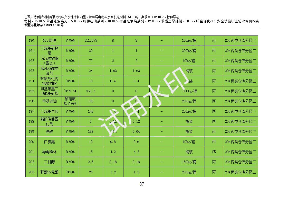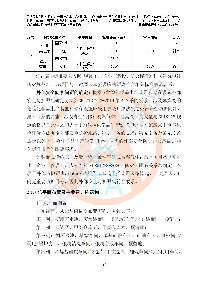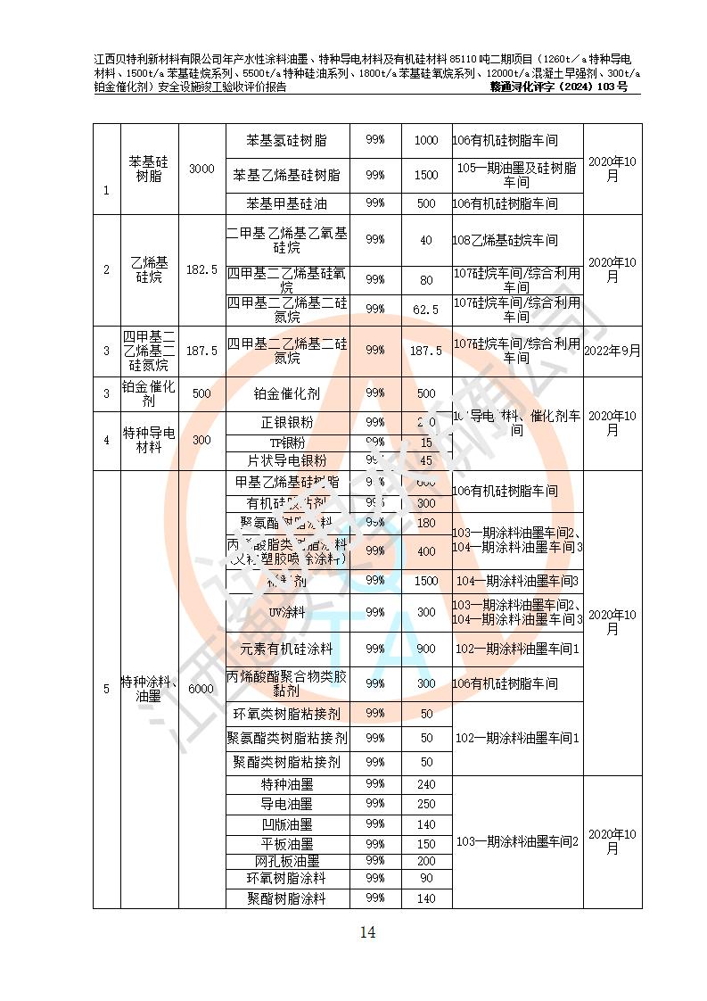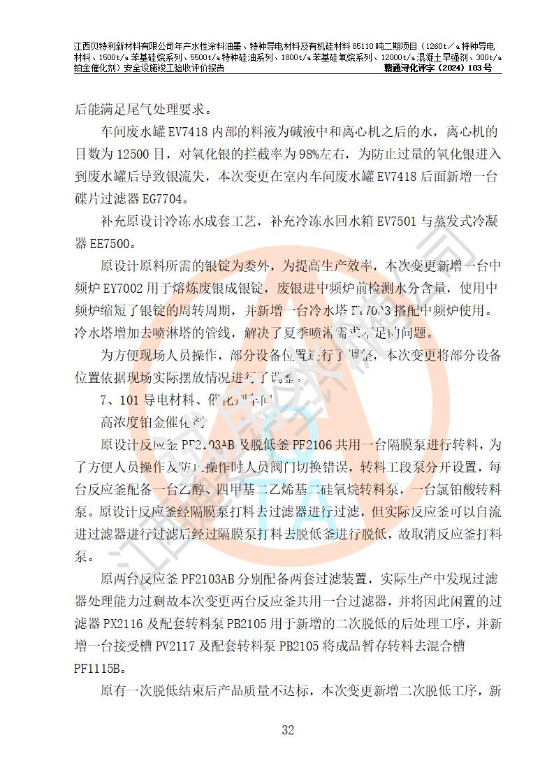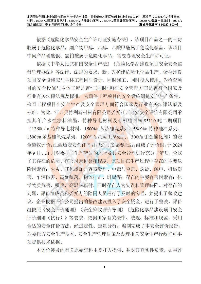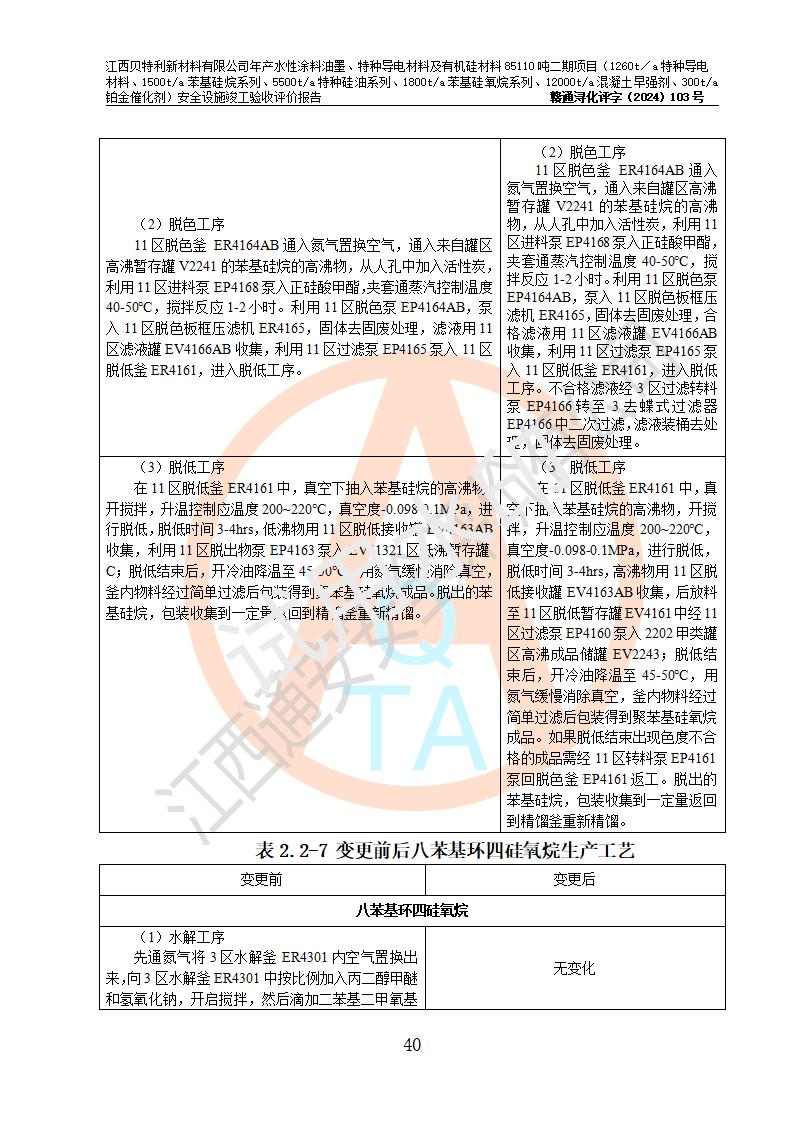 評價報告名稱 | 江西貝特利新材料有限公司年產(chǎn)水性涂料油墨、特種導電材料及有 機硅材料85110噸二期項目(1260t/a特種導電材料、1500t/a苯基硅烷系列、5500t/a特種硅油系列、1800t/a苯基硅氧烷系列、12000t/a混凝土早強劑、300t/a鉑金催化劑)安全設施竣工驗收評價報告 | |||||