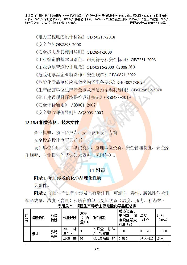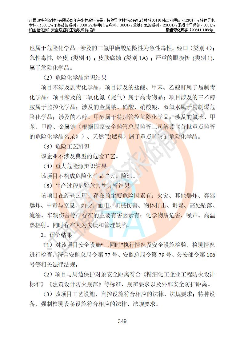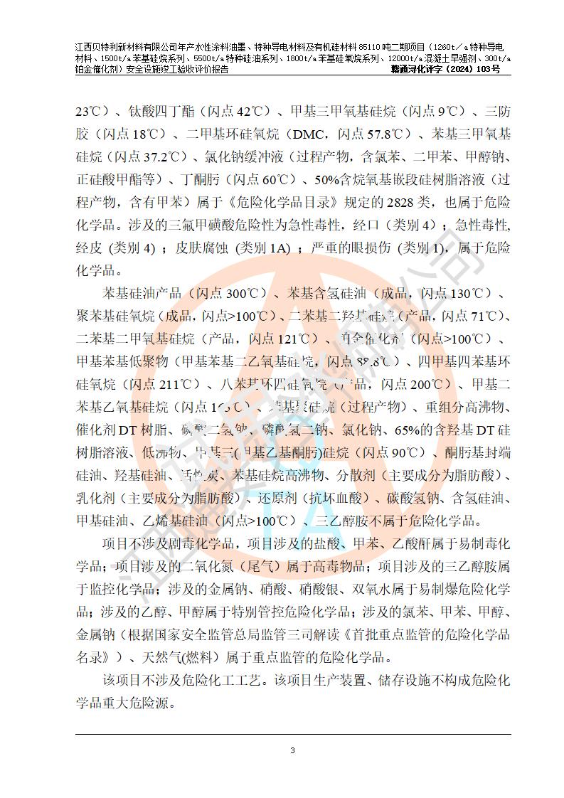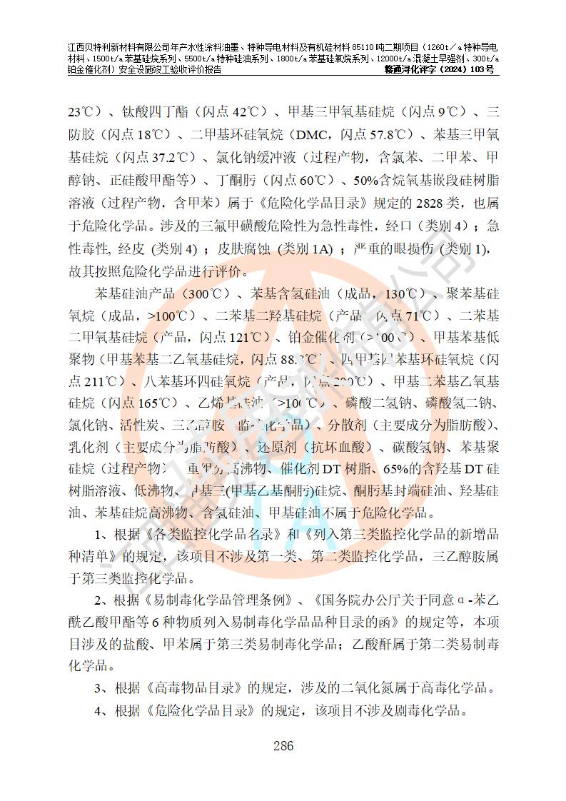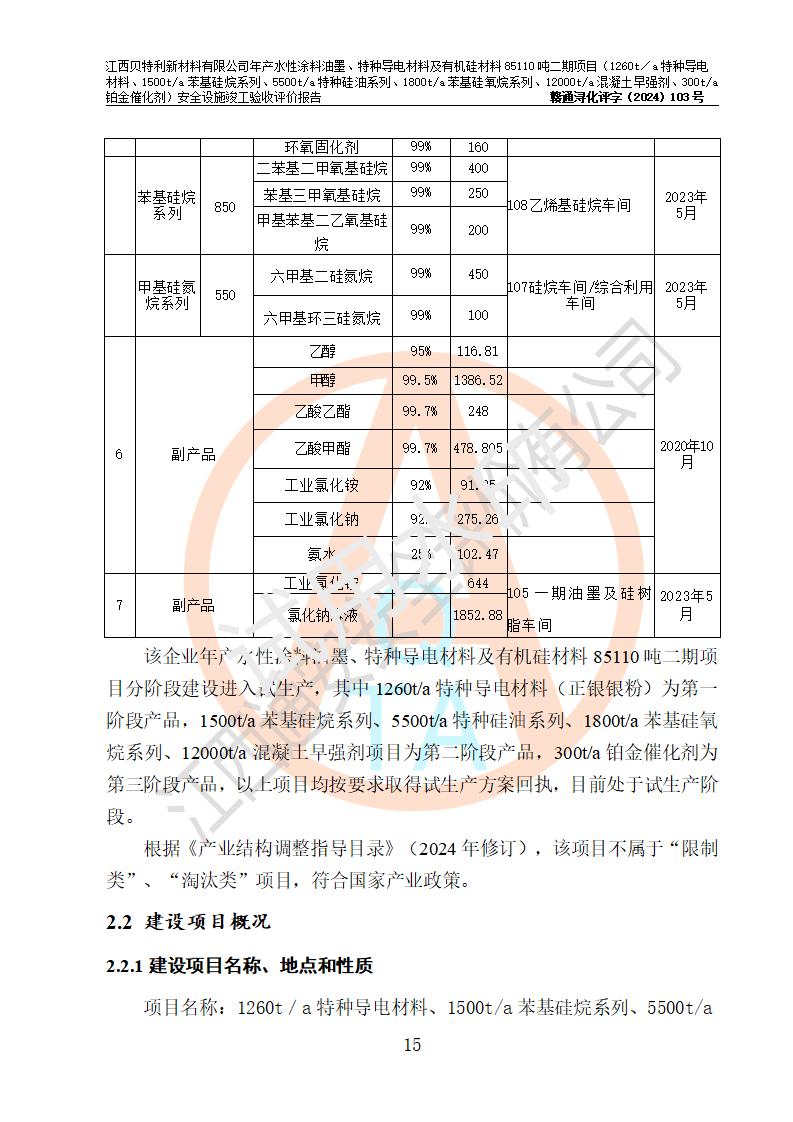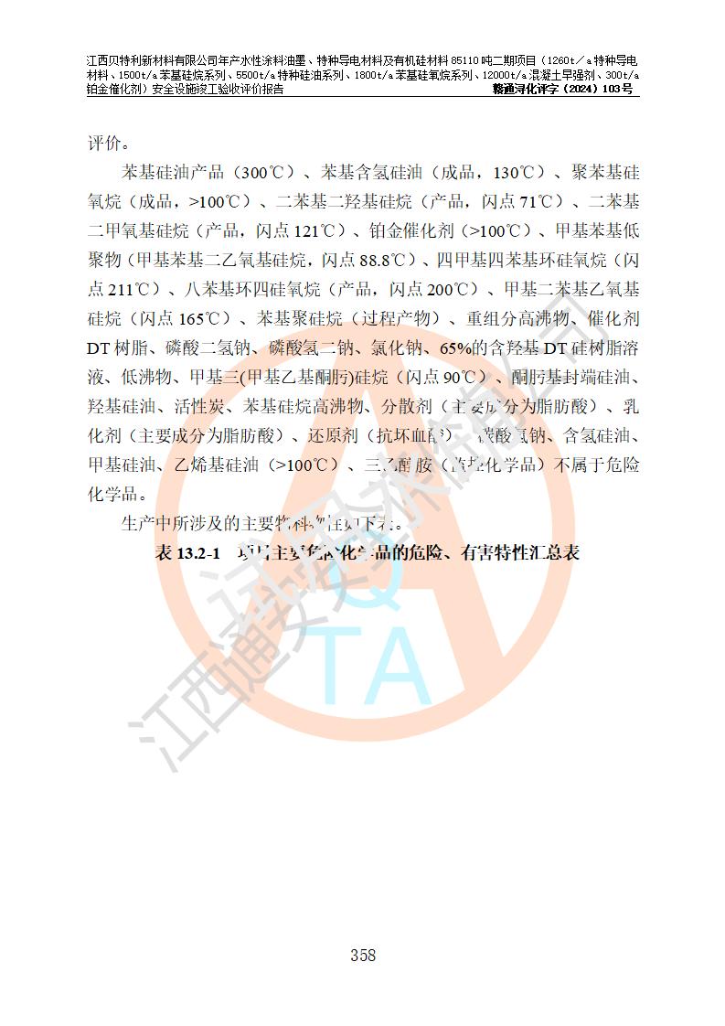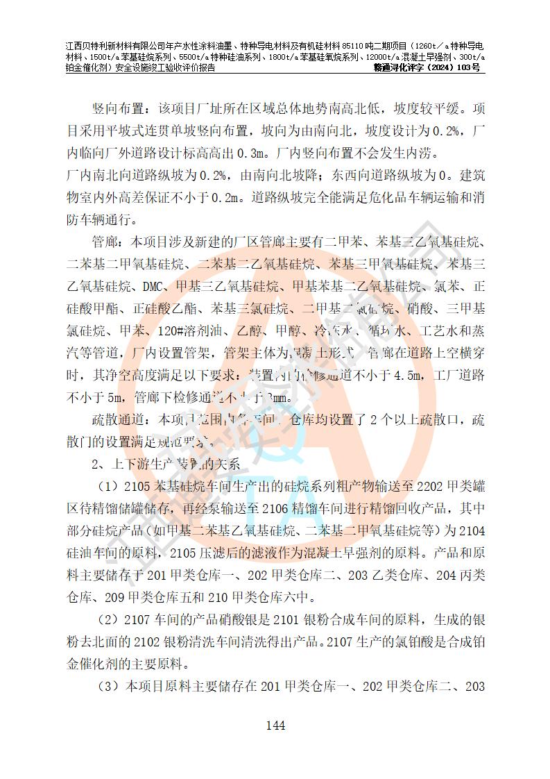 評價報告名稱 | 江西貝特利新材料有限公司年產(chǎn)水性涂料油墨、特種導電材料及有 機硅材料85110噸二期項目(1260t/a特種導電材料、1500t/a苯基硅烷系列、5500t/a特種硅油系列、1800t/a苯基硅氧烷系列、12000t/a混凝土早強劑、300t/a鉑金催化劑)安全設施竣工驗收評價報告 | |||||