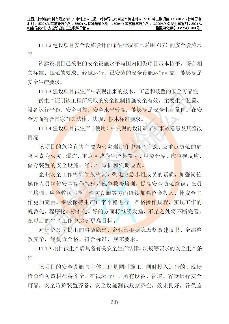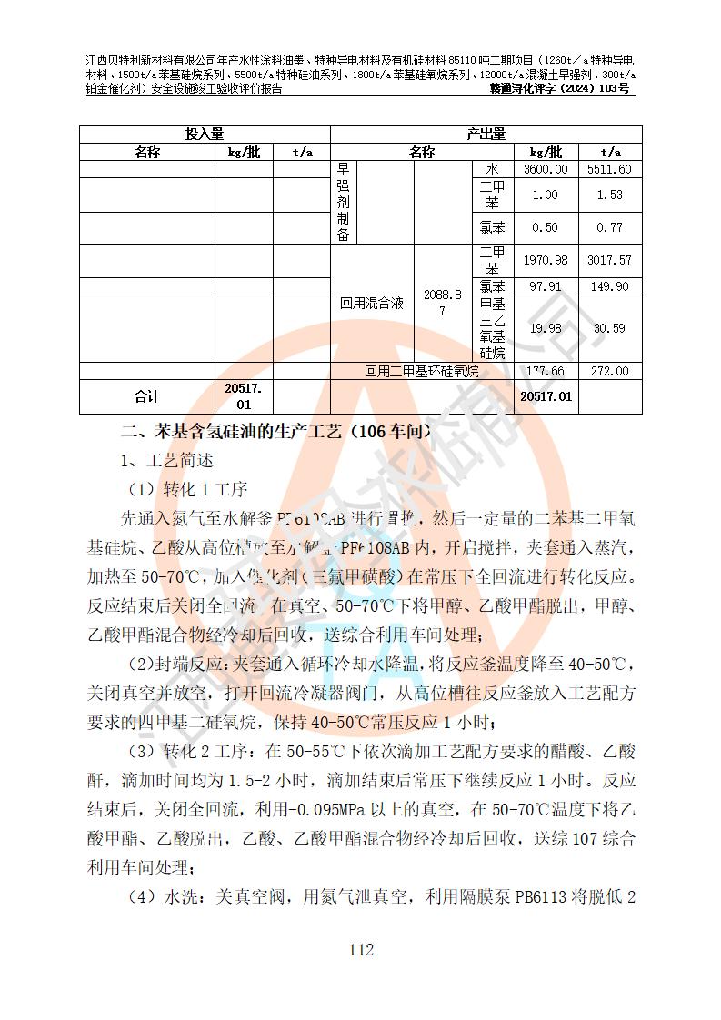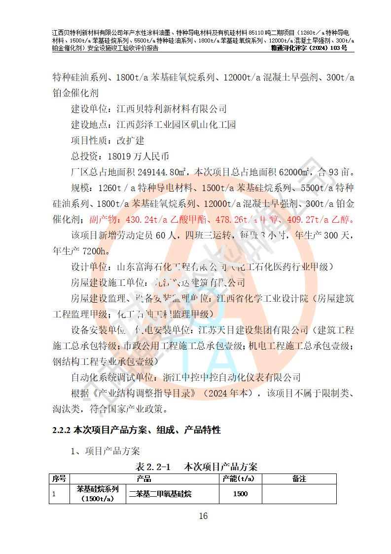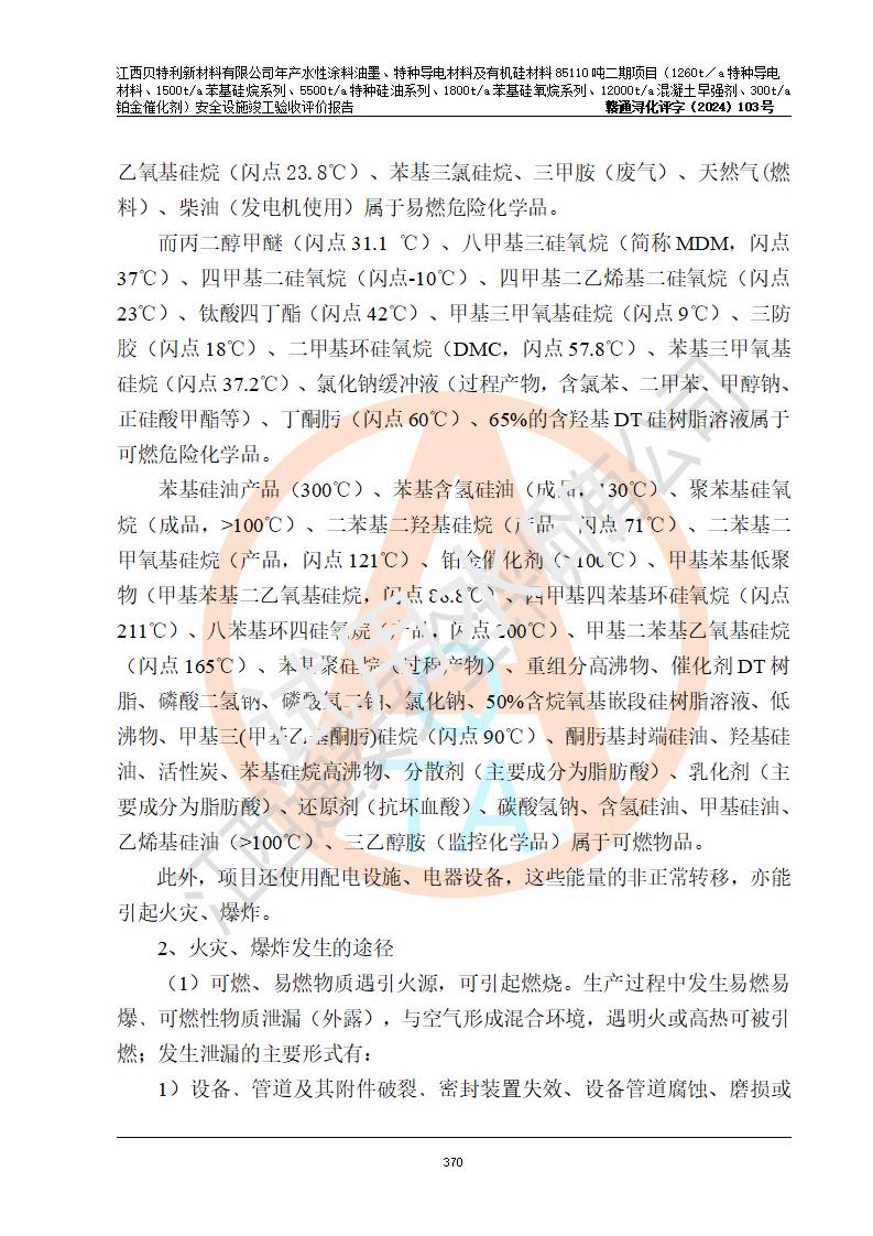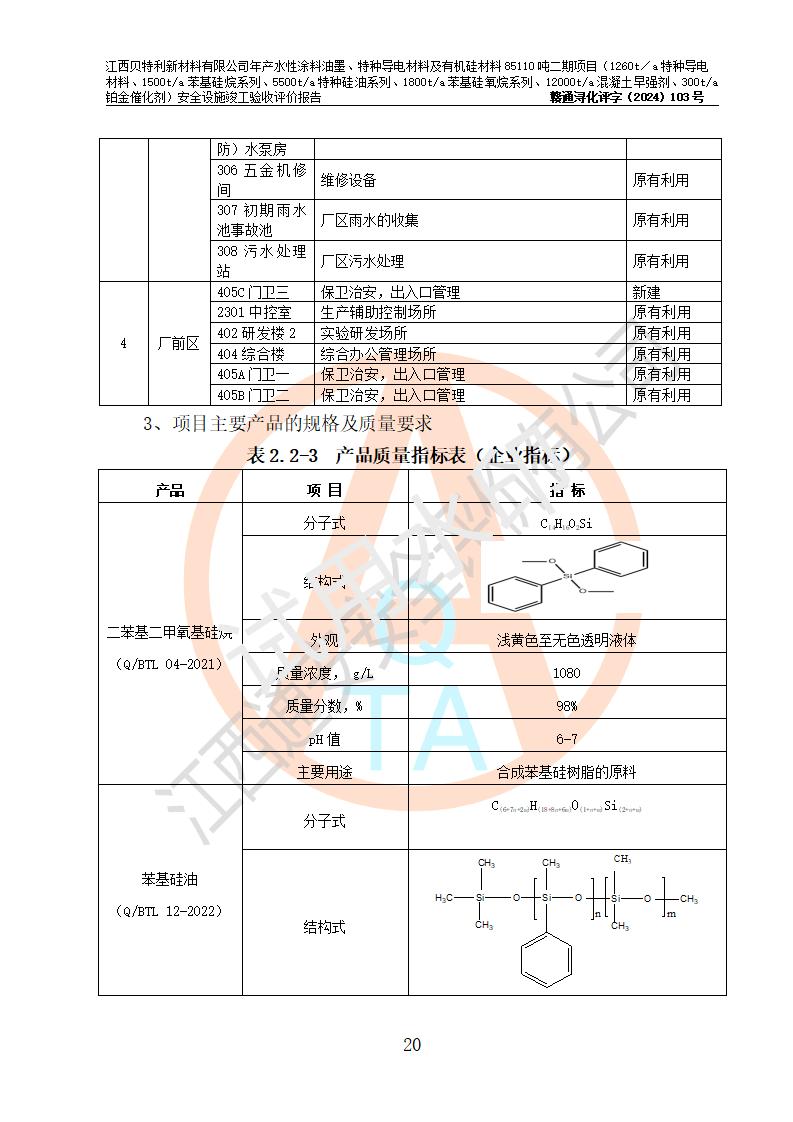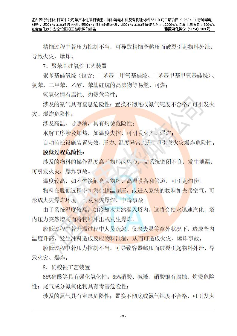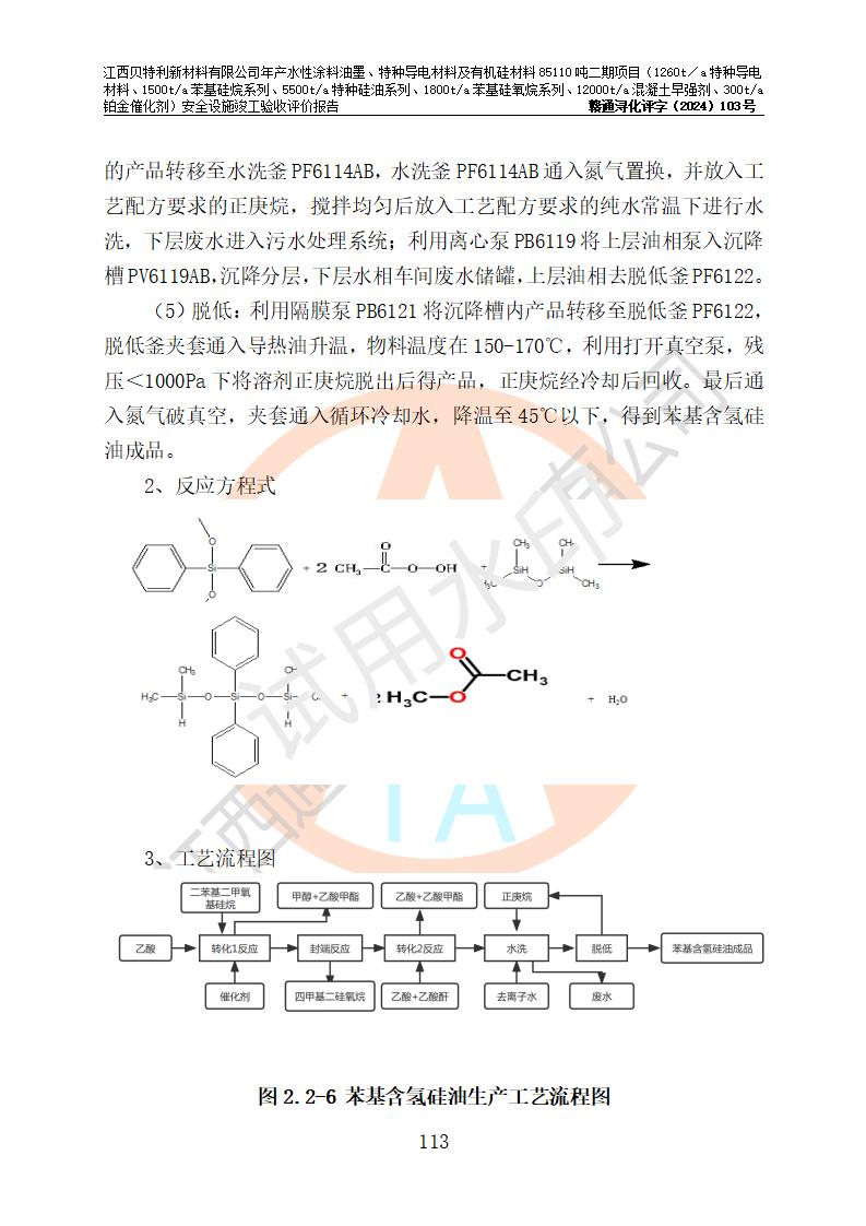 評價報告名稱 | 江西貝特利新材料有限公司年產(chǎn)水性涂料油墨、特種導電材料及有 機硅材料85110噸二期項目(1260t/a特種導電材料、1500t/a苯基硅烷系列、5500t/a特種硅油系列、1800t/a苯基硅氧烷系列、12000t/a混凝土早強劑、300t/a鉑金催化劑)安全設施竣工驗收評價報告 | |||||