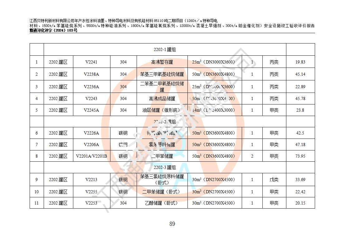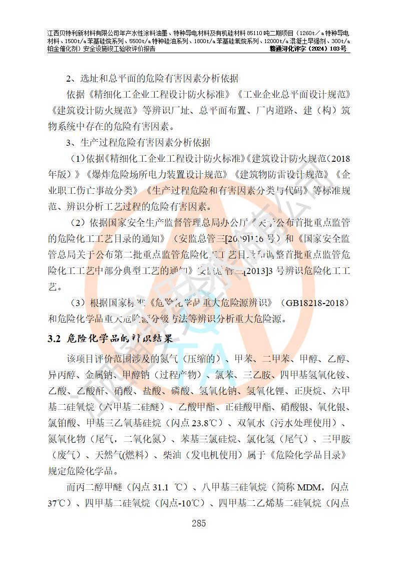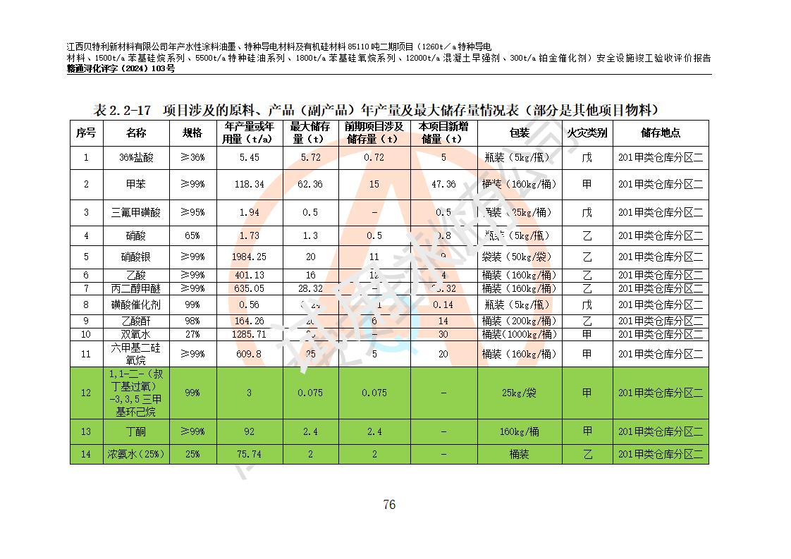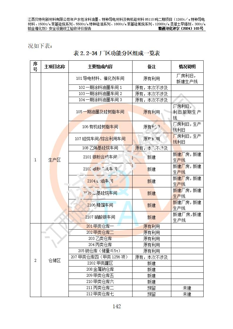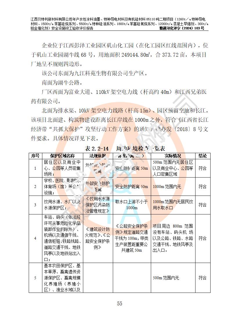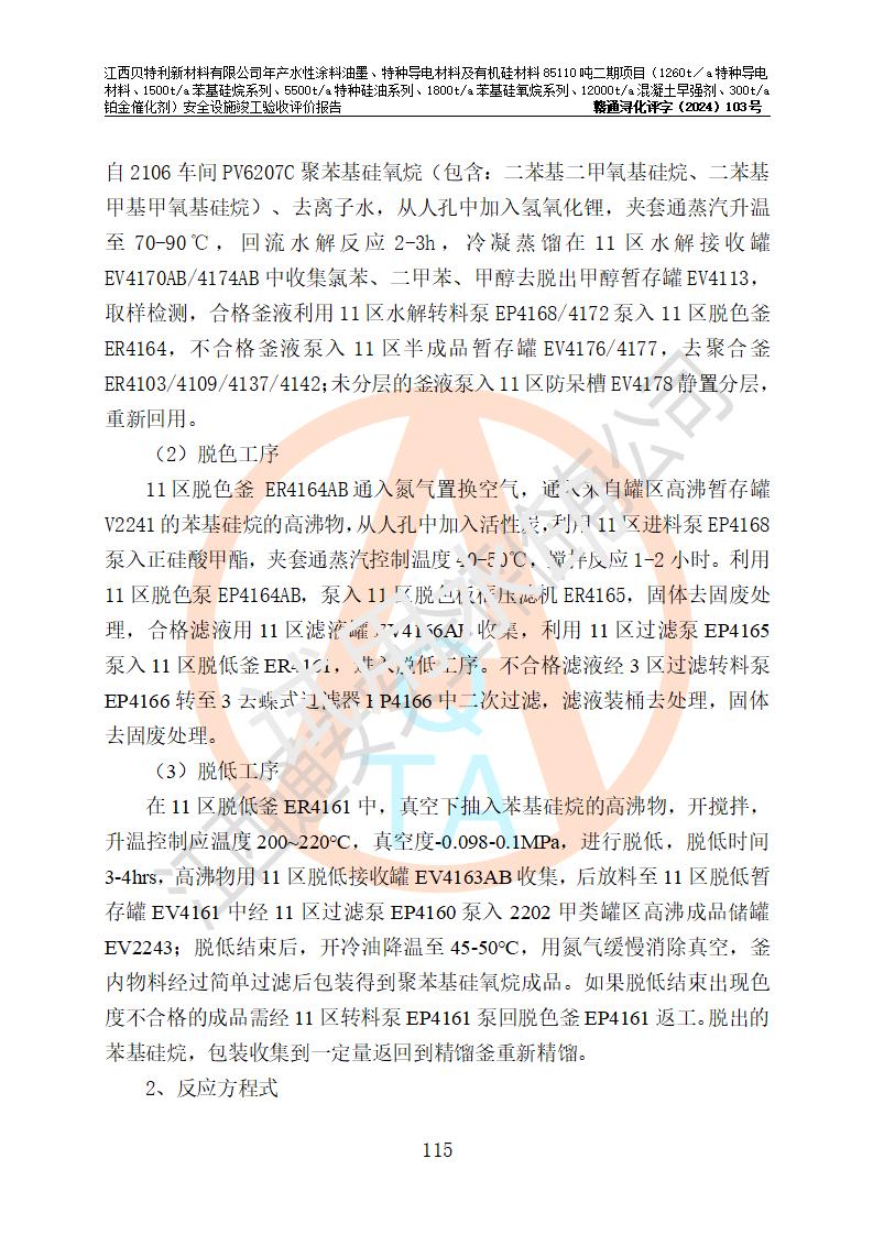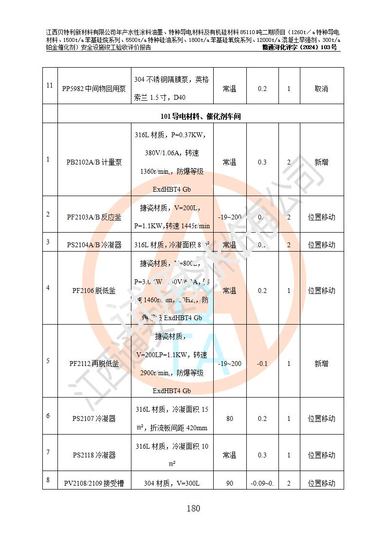 評價報告名稱 | 江西貝特利新材料有限公司年產(chǎn)水性涂料油墨、特種導電材料及有 機硅材料85110噸二期項目(1260t/a特種導電材料、1500t/a苯基硅烷系列、5500t/a特種硅油系列、1800t/a苯基硅氧烷系列、12000t/a混凝土早強劑、300t/a鉑金催化劑)安全設施竣工驗收評價報告 | |||||