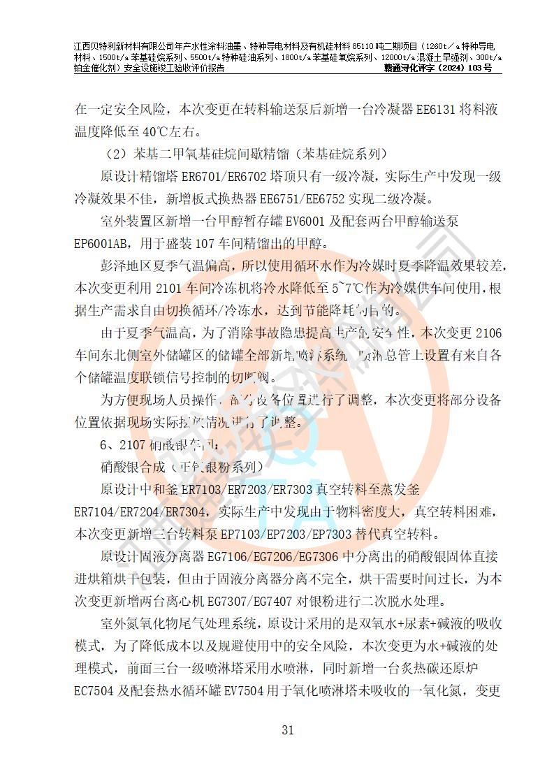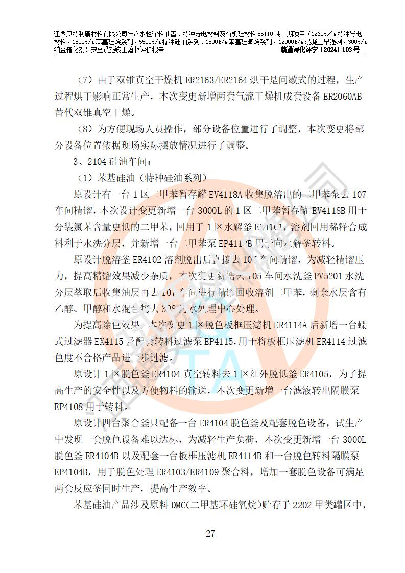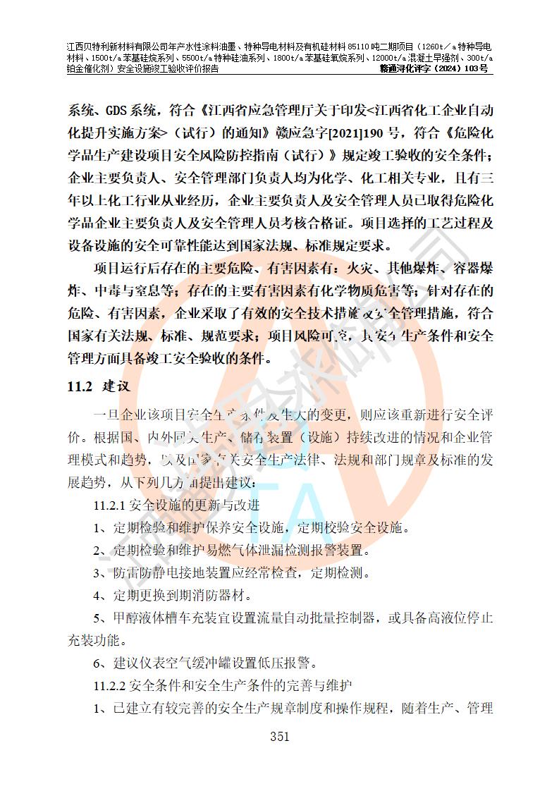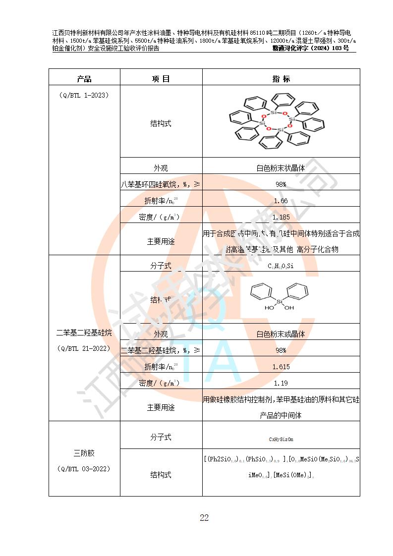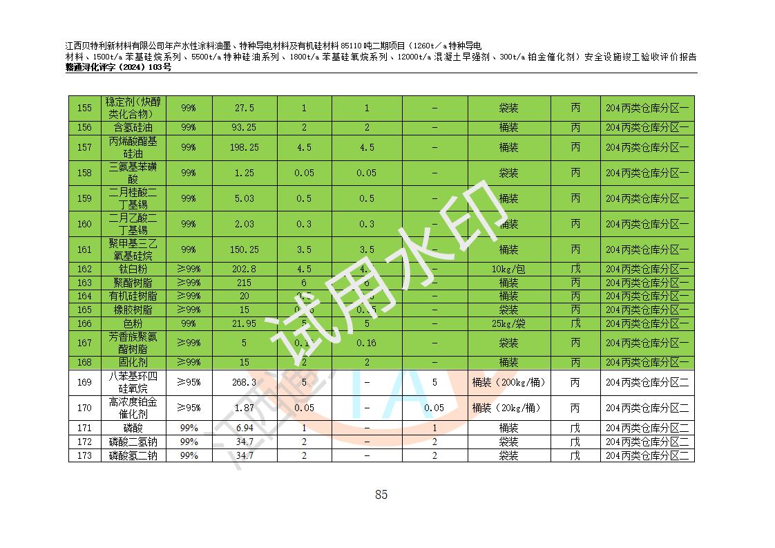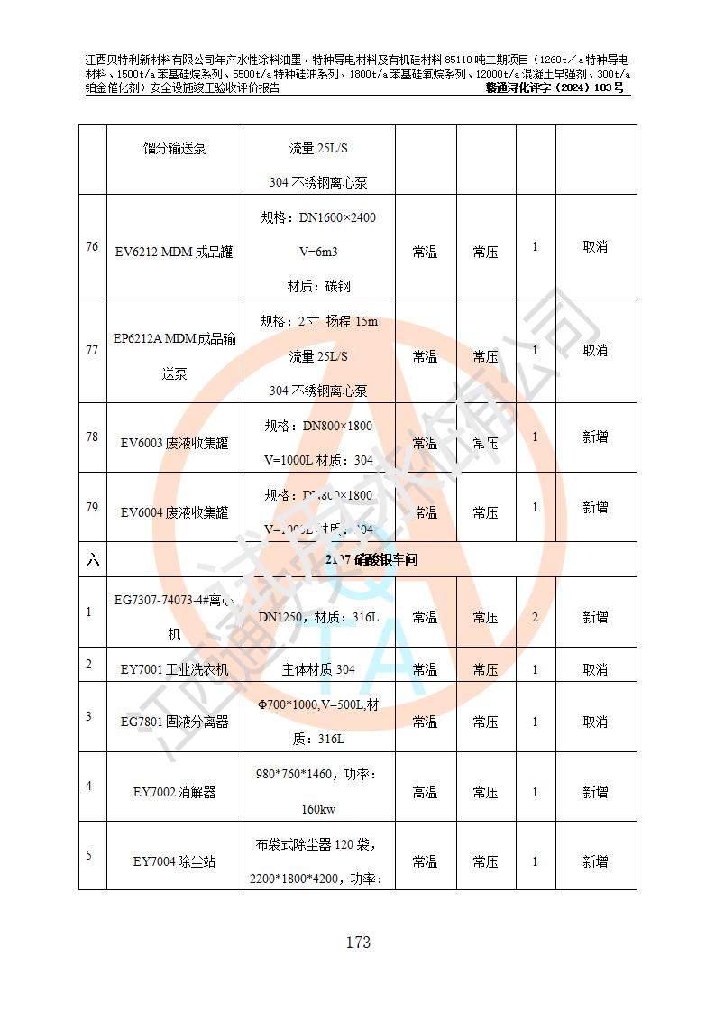 評價報告名稱 | 江西貝特利新材料有限公司年產(chǎn)水性涂料油墨、特種導電材料及有 機硅材料85110噸二期項目(1260t/a特種導電材料、1500t/a苯基硅烷系列、5500t/a特種硅油系列、1800t/a苯基硅氧烷系列、12000t/a混凝土早強劑、300t/a鉑金催化劑)安全設施竣工驗收評價報告 | |||||