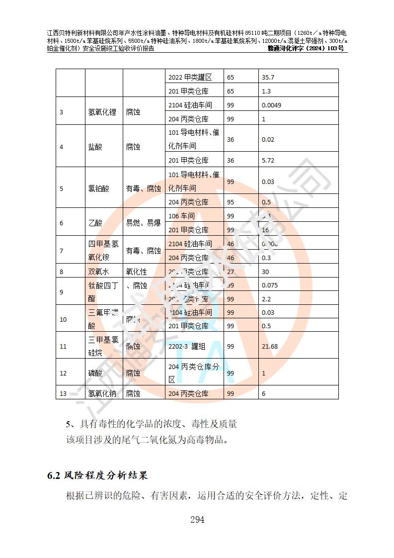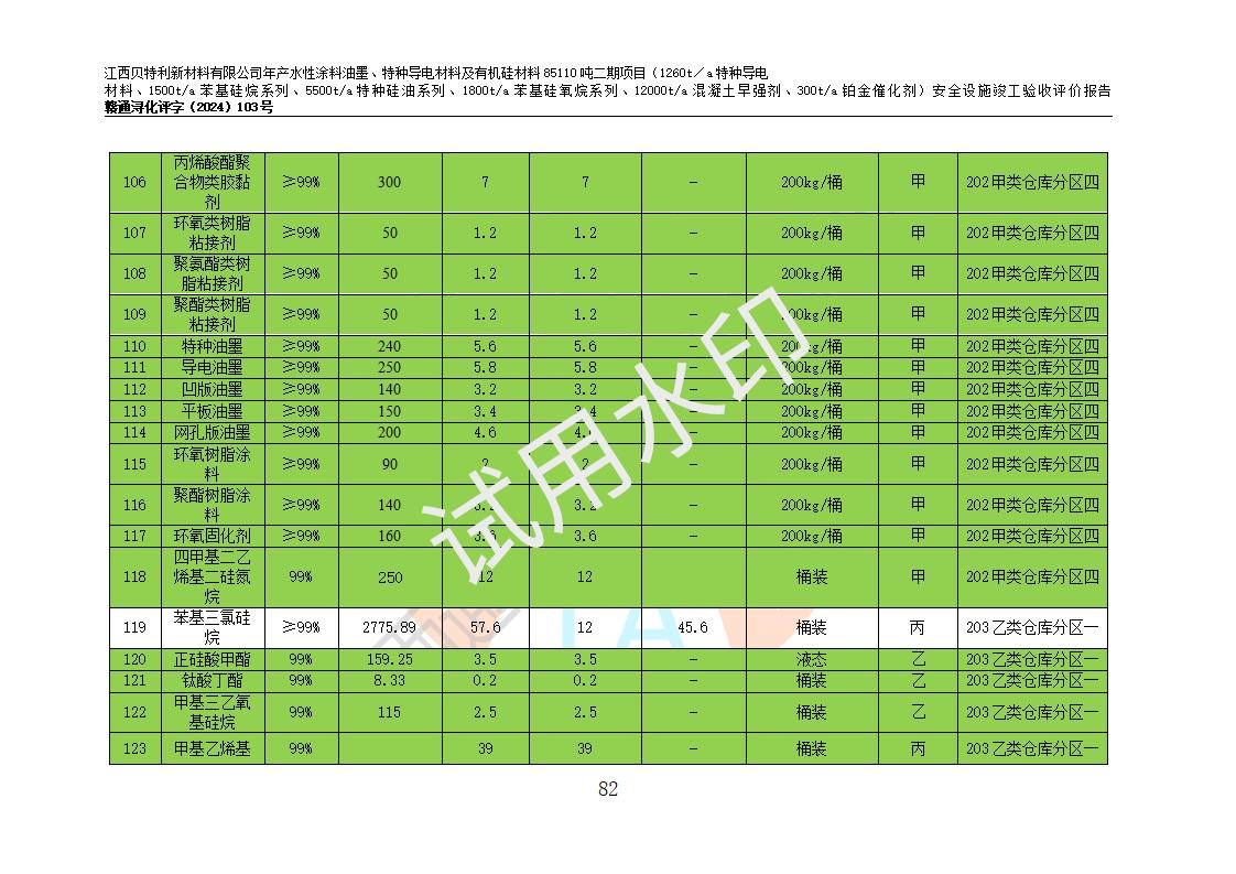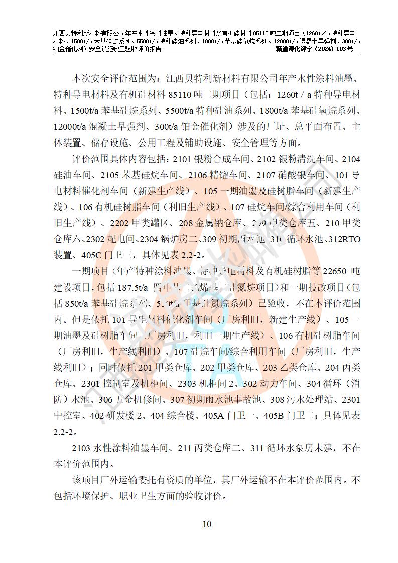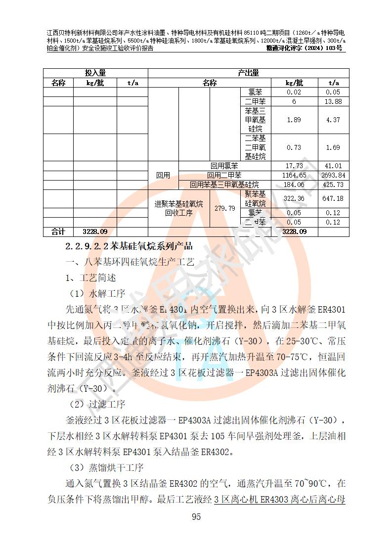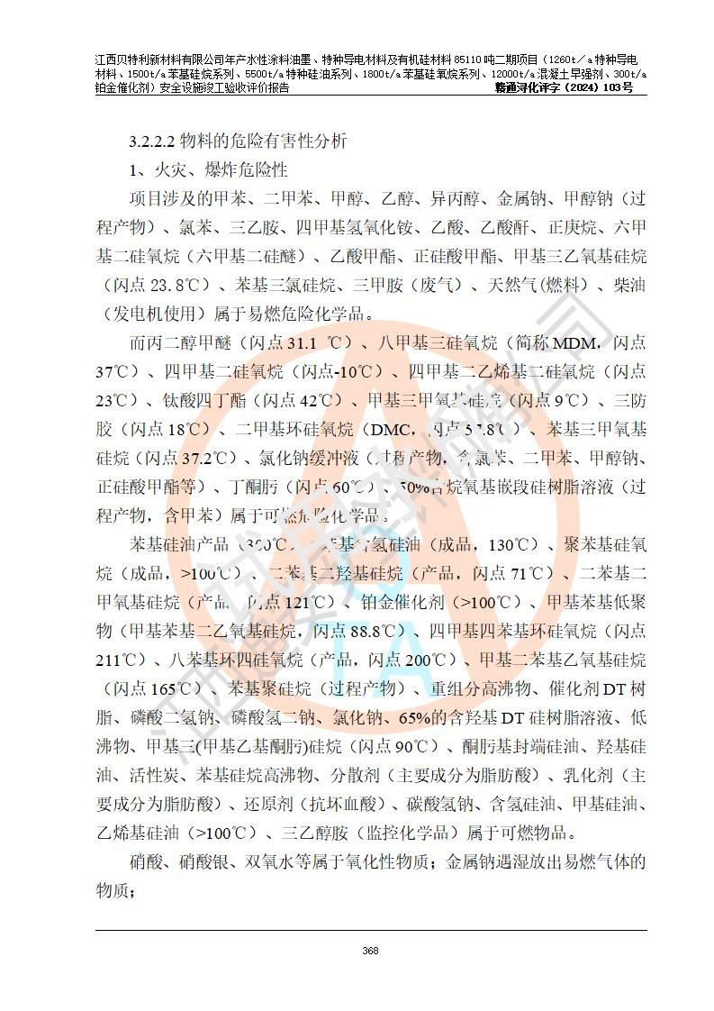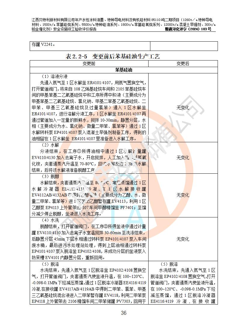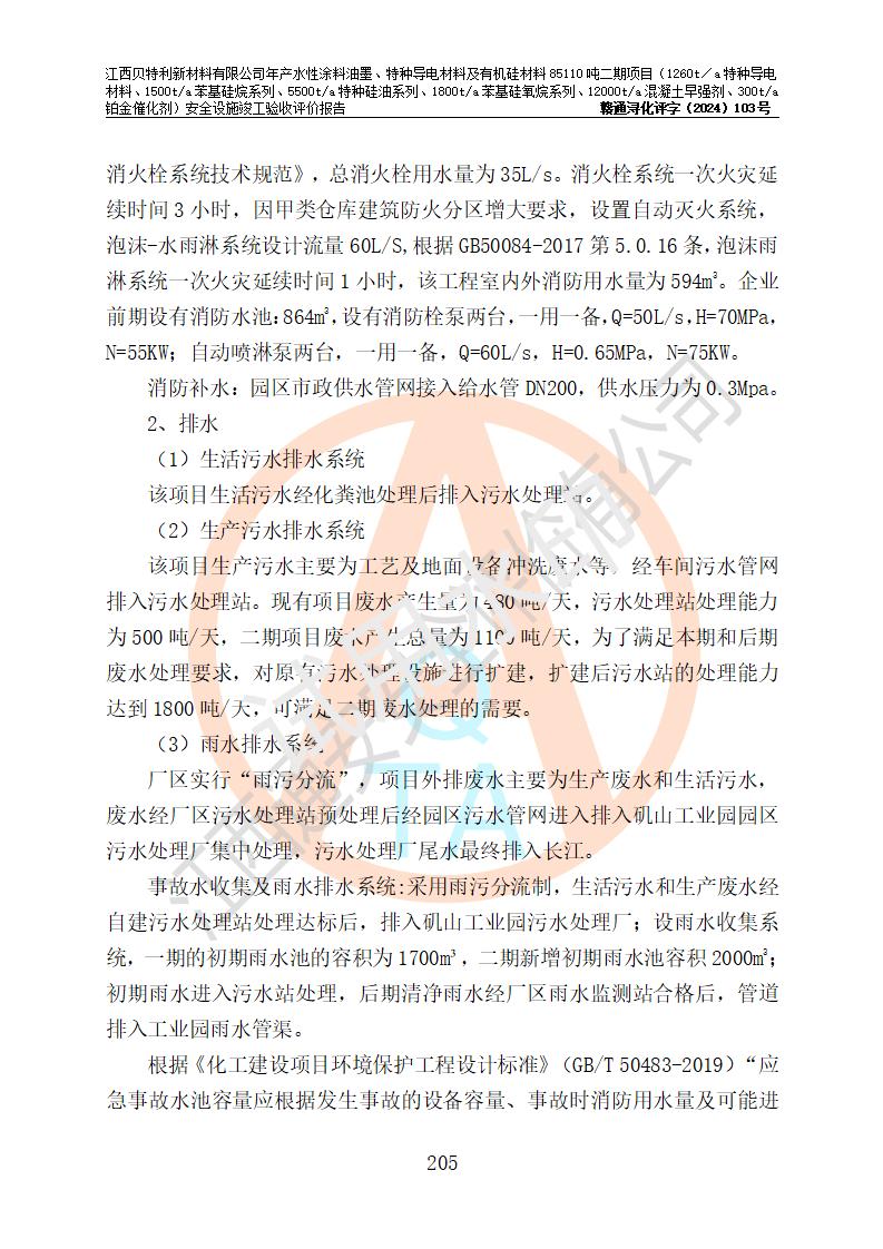 評價報告名稱 | 江西貝特利新材料有限公司年產(chǎn)水性涂料油墨、特種導電材料及有 機硅材料85110噸二期項目(1260t/a特種導電材料、1500t/a苯基硅烷系列、5500t/a特種硅油系列、1800t/a苯基硅氧烷系列、12000t/a混凝土早強劑、300t/a鉑金催化劑)安全設施竣工驗收評價報告 | |||||