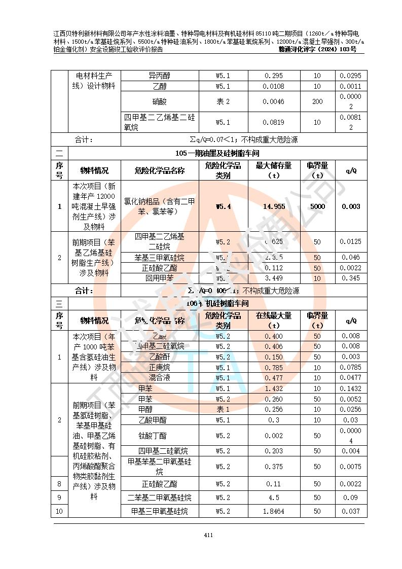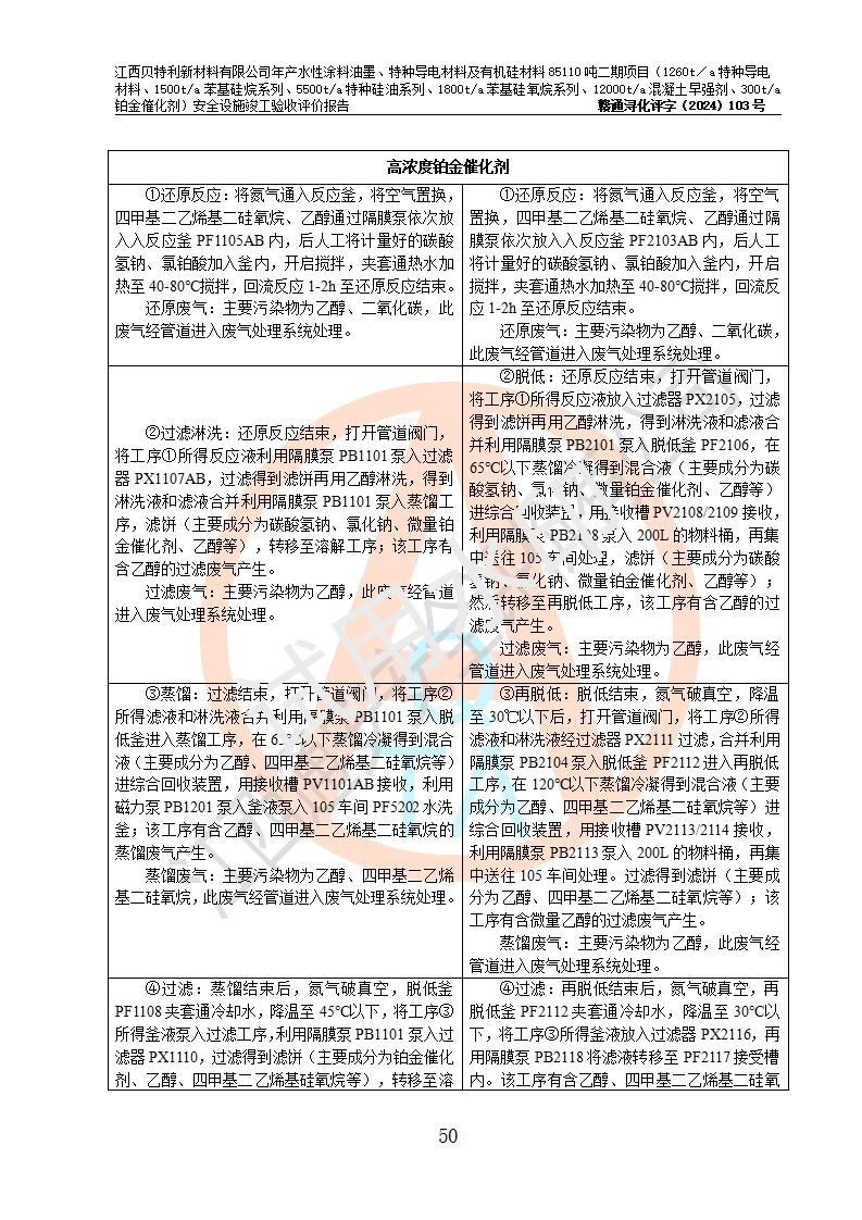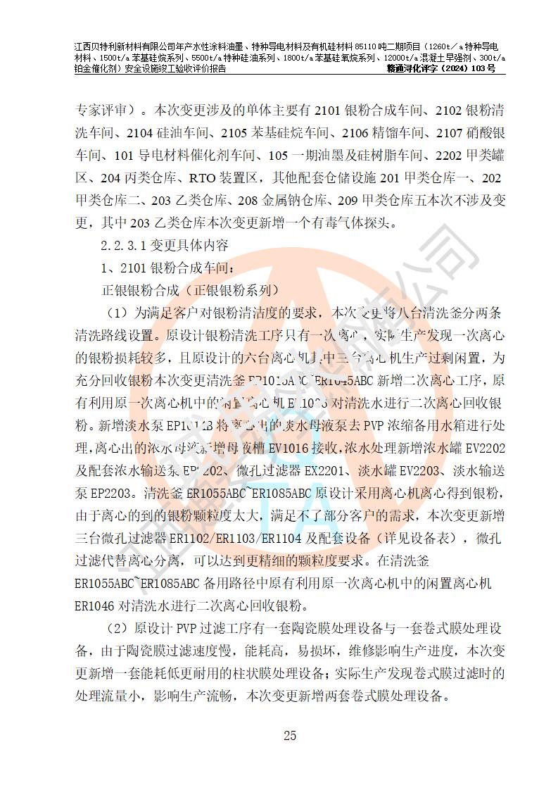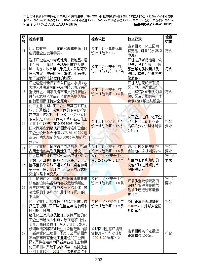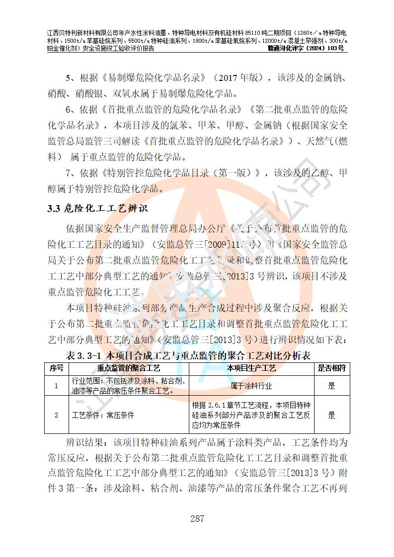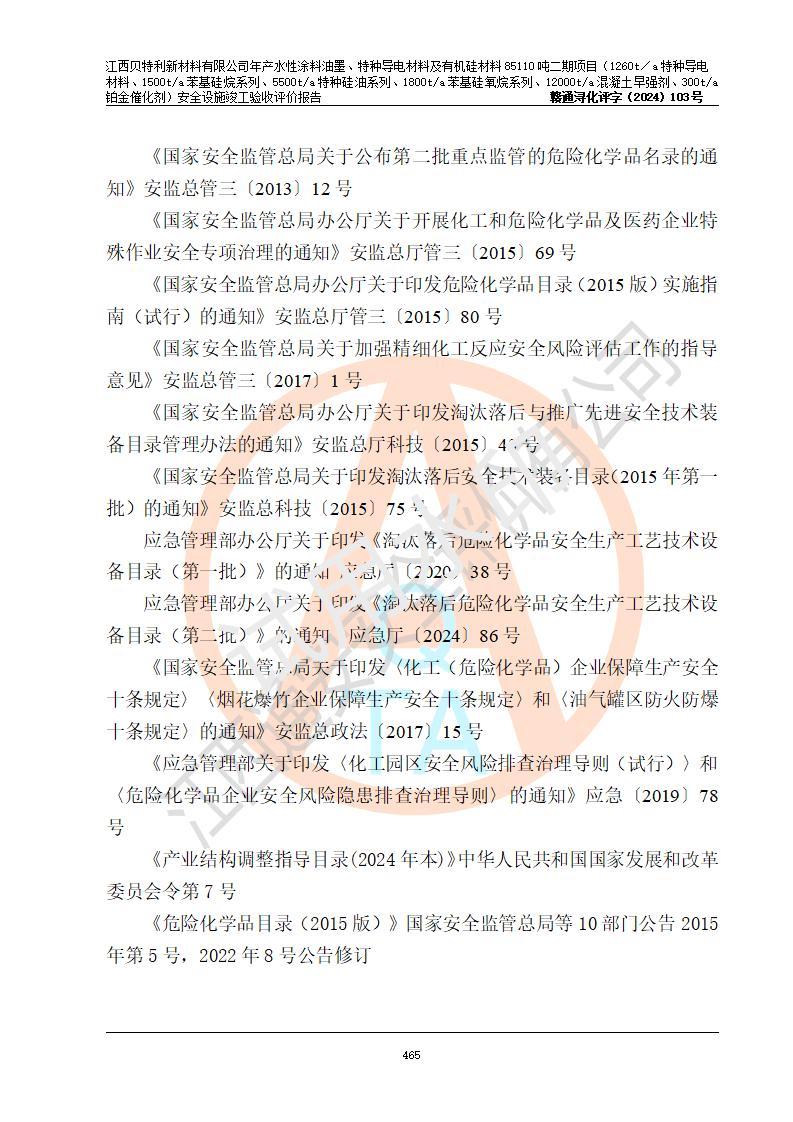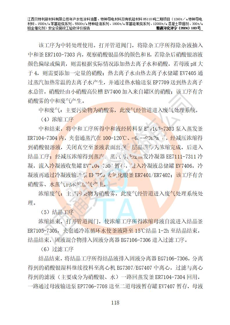 評價報告名稱 | 江西貝特利新材料有限公司年產(chǎn)水性涂料油墨、特種導電材料及有 機硅材料85110噸二期項目(1260t/a特種導電材料、1500t/a苯基硅烷系列、5500t/a特種硅油系列、1800t/a苯基硅氧烷系列、12000t/a混凝土早強劑、300t/a鉑金催化劑)安全設施竣工驗收評價報告 | |||||