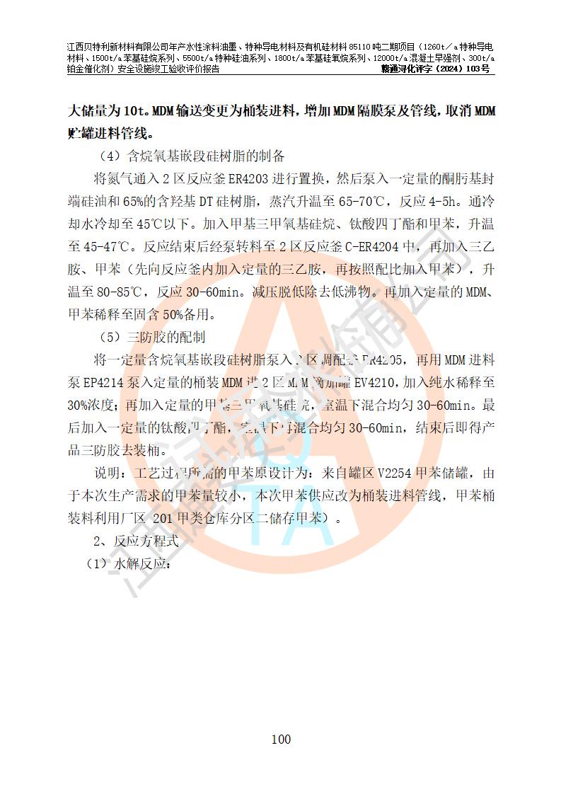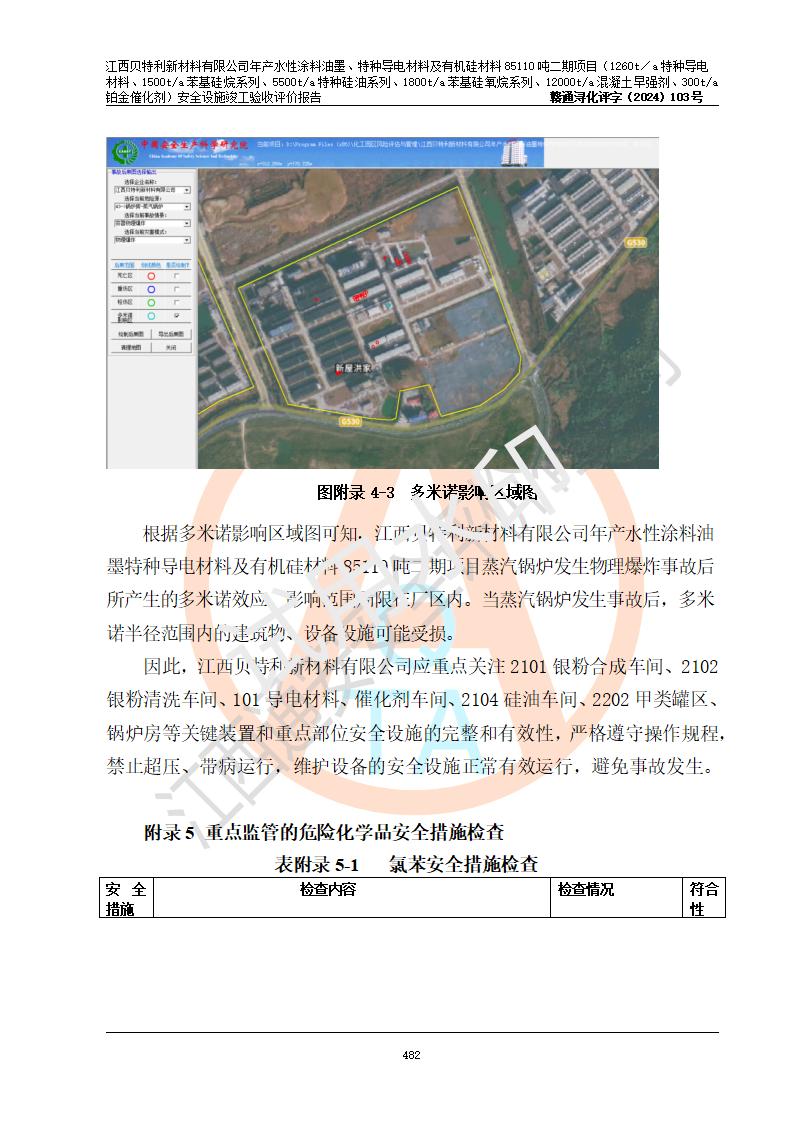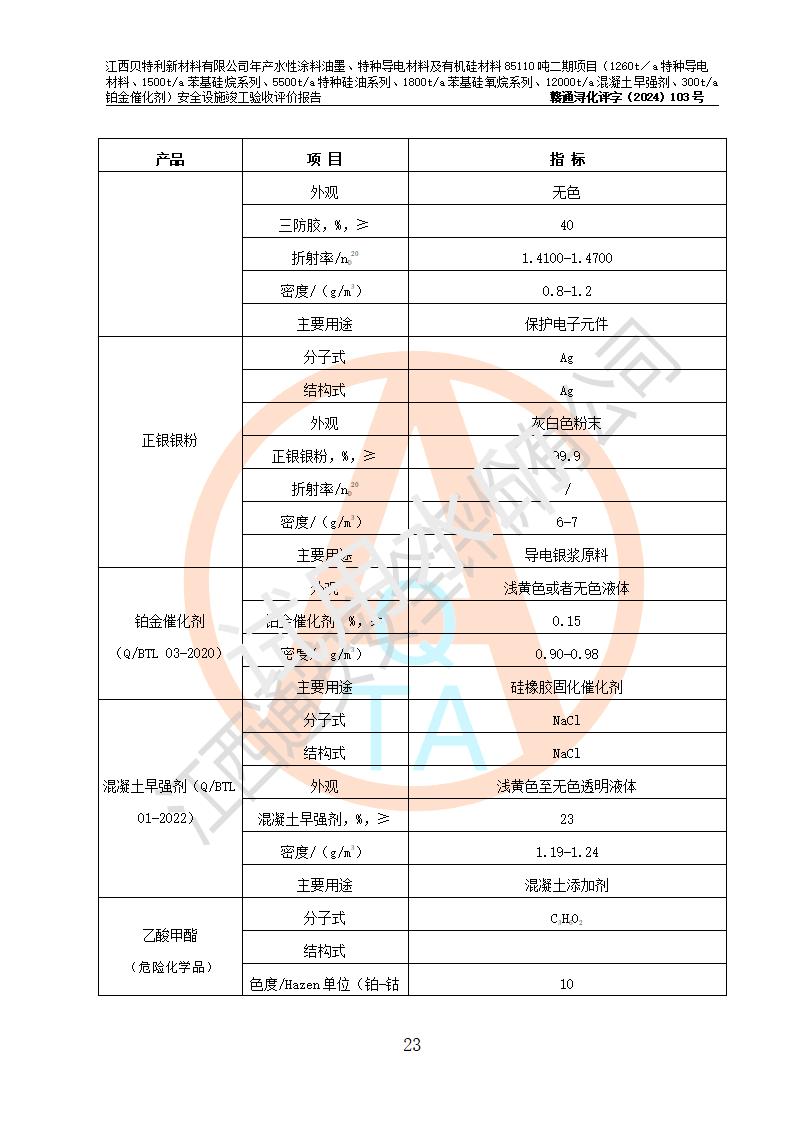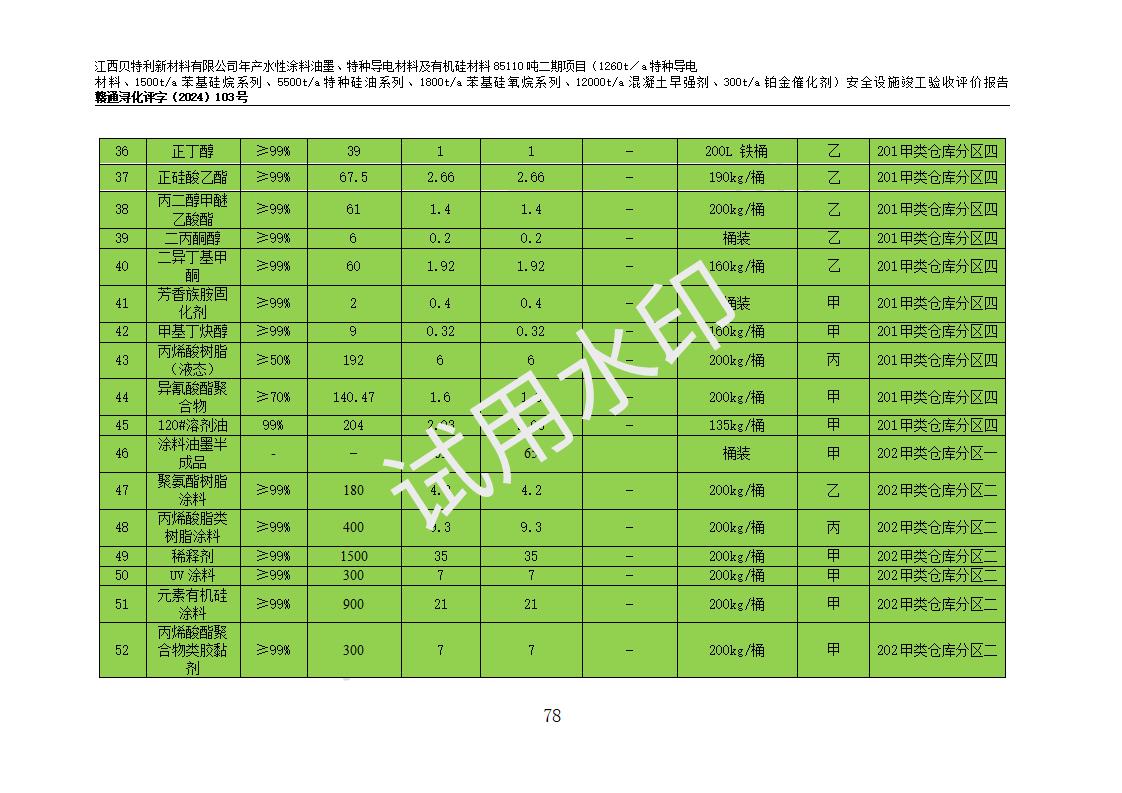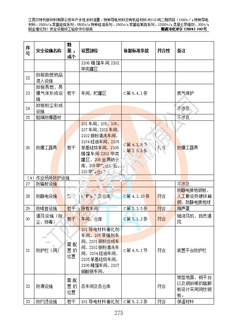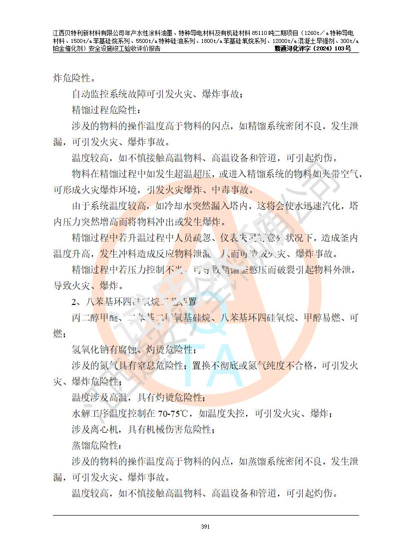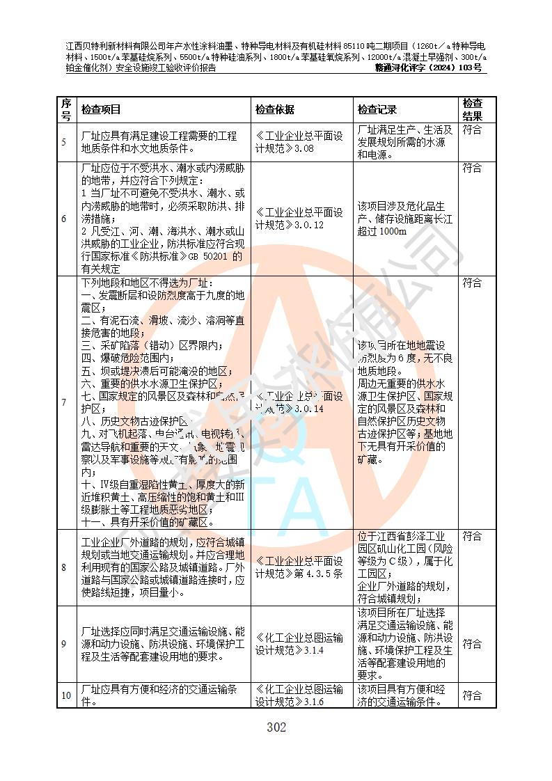 評價報告名稱 | 江西貝特利新材料有限公司年產(chǎn)水性涂料油墨、特種導電材料及有 機硅材料85110噸二期項目(1260t/a特種導電材料、1500t/a苯基硅烷系列、5500t/a特種硅油系列、1800t/a苯基硅氧烷系列、12000t/a混凝土早強劑、300t/a鉑金催化劑)安全設施竣工驗收評價報告 | |||||