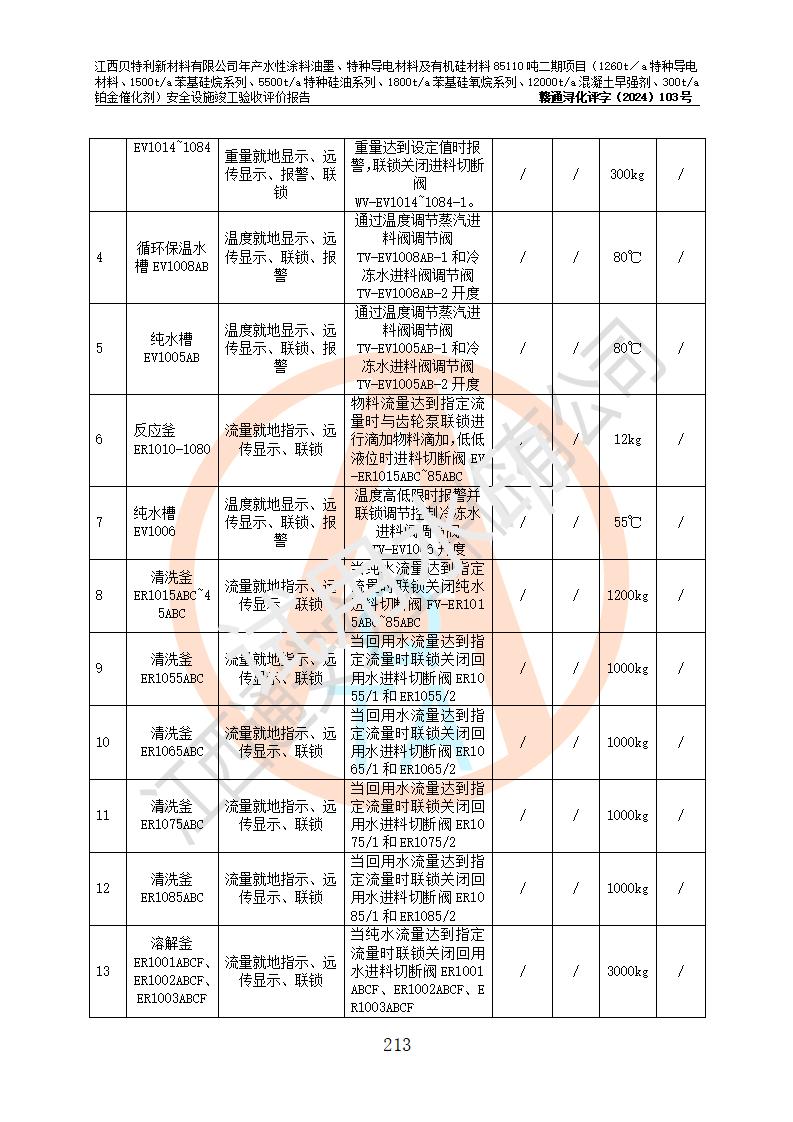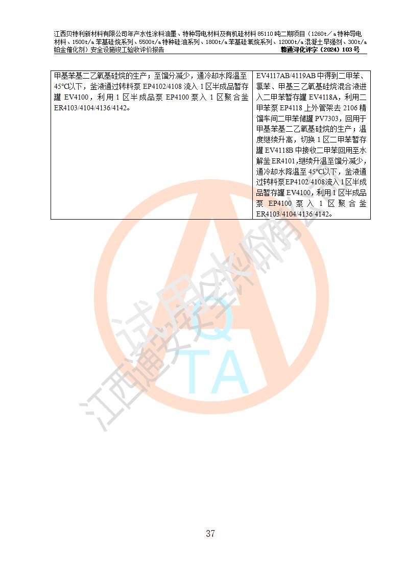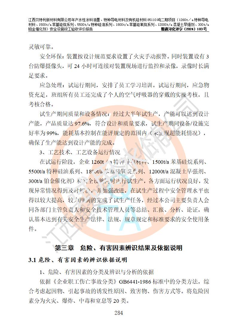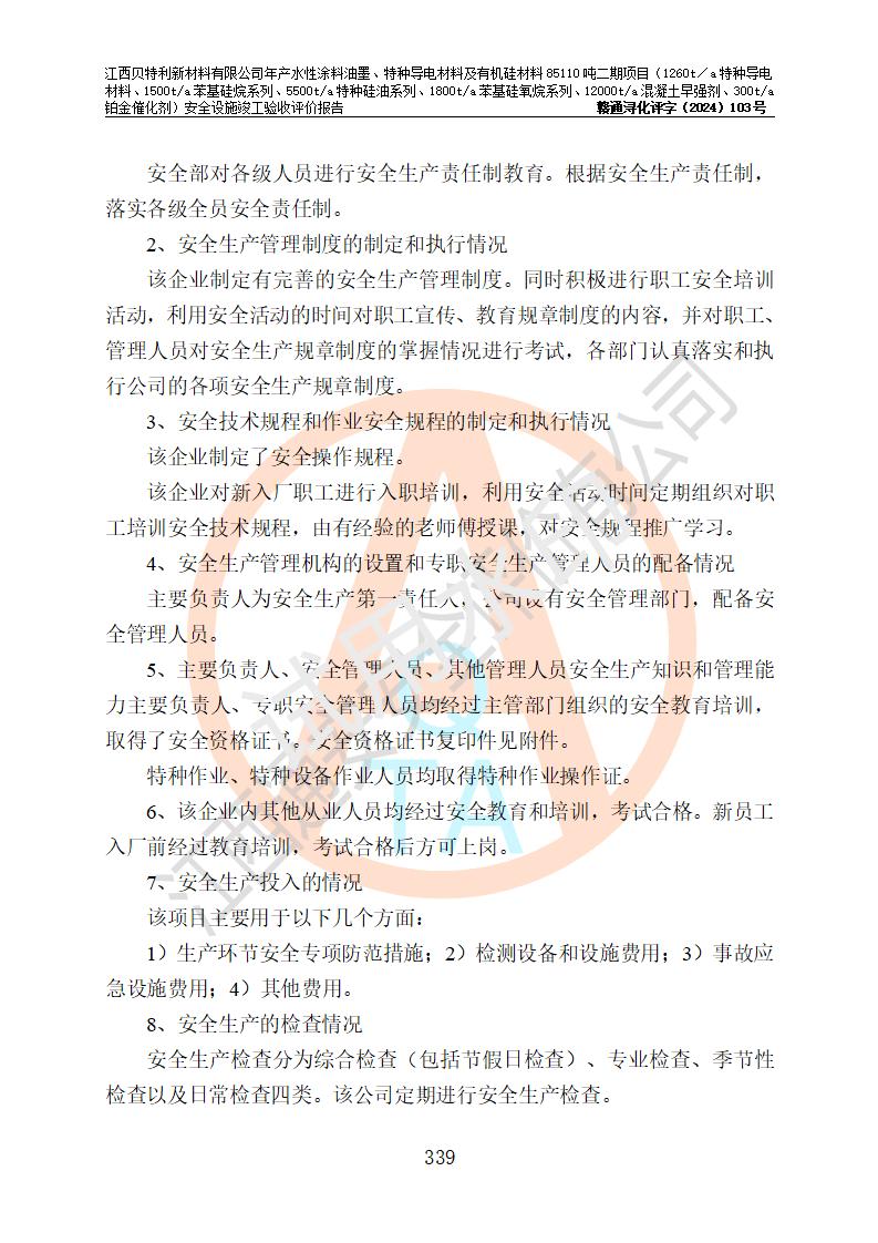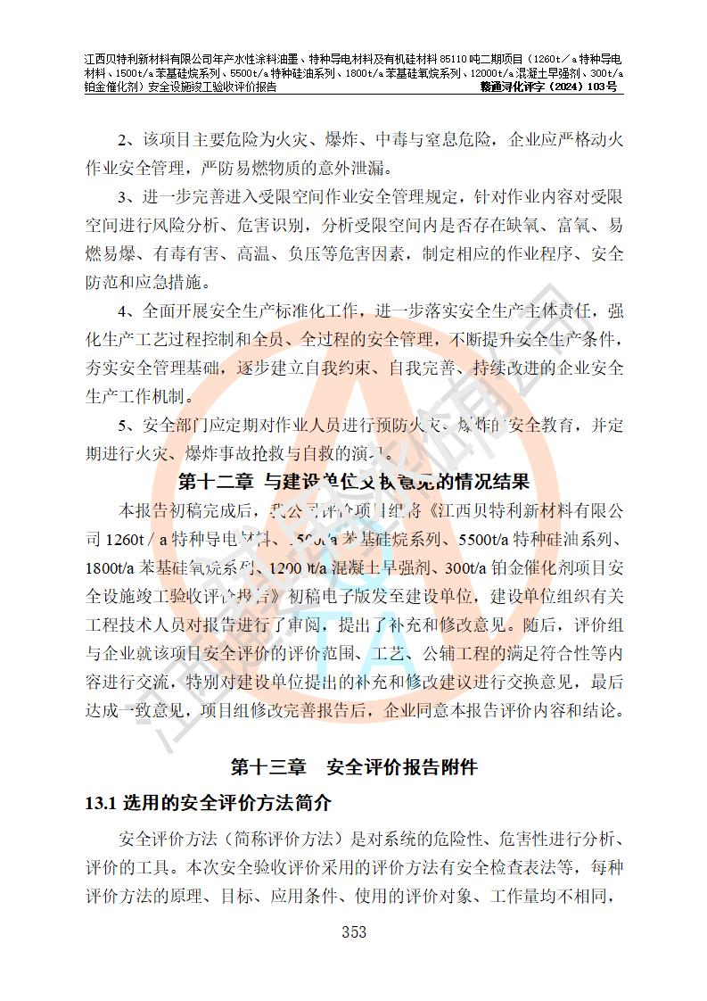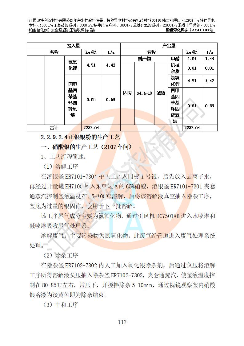 評價報告名稱 | 江西貝特利新材料有限公司年產(chǎn)水性涂料油墨、特種導電材料及有 機硅材料85110噸二期項目(1260t/a特種導電材料、1500t/a苯基硅烷系列、5500t/a特種硅油系列、1800t/a苯基硅氧烷系列、12000t/a混凝土早強劑、300t/a鉑金催化劑)安全設施竣工驗收評價報告 | |||||