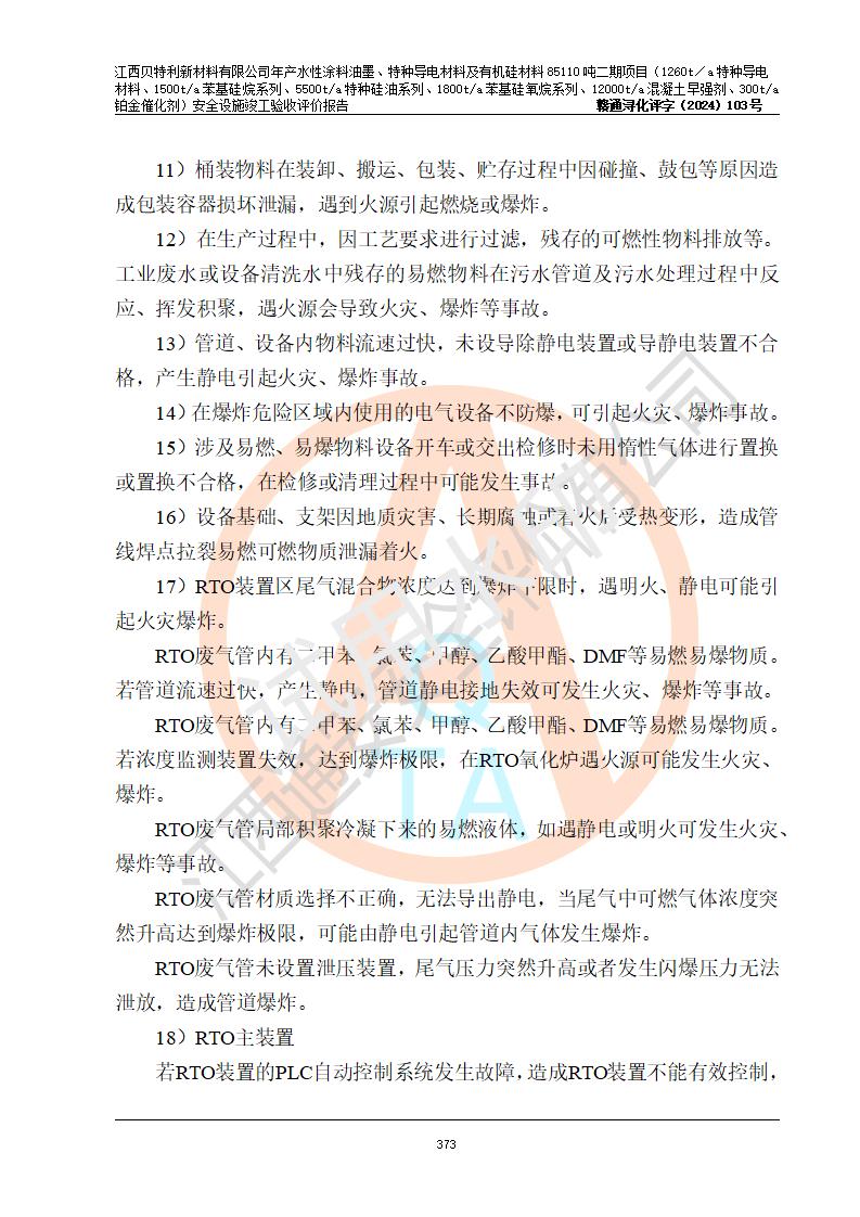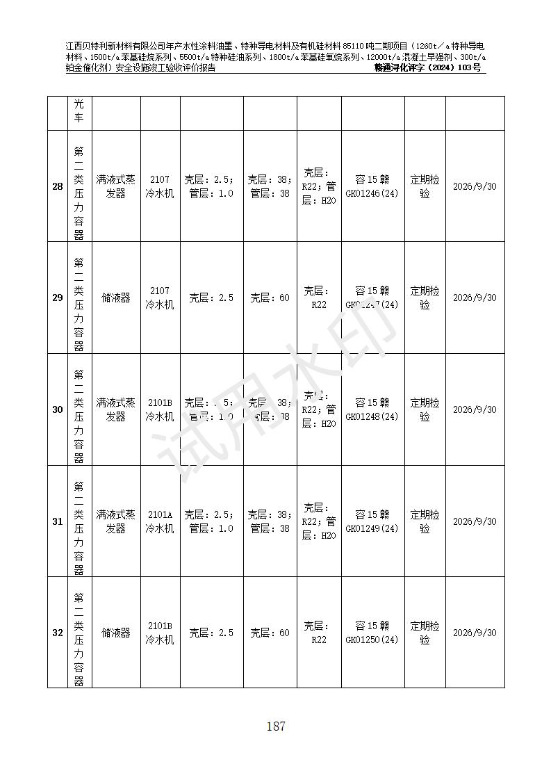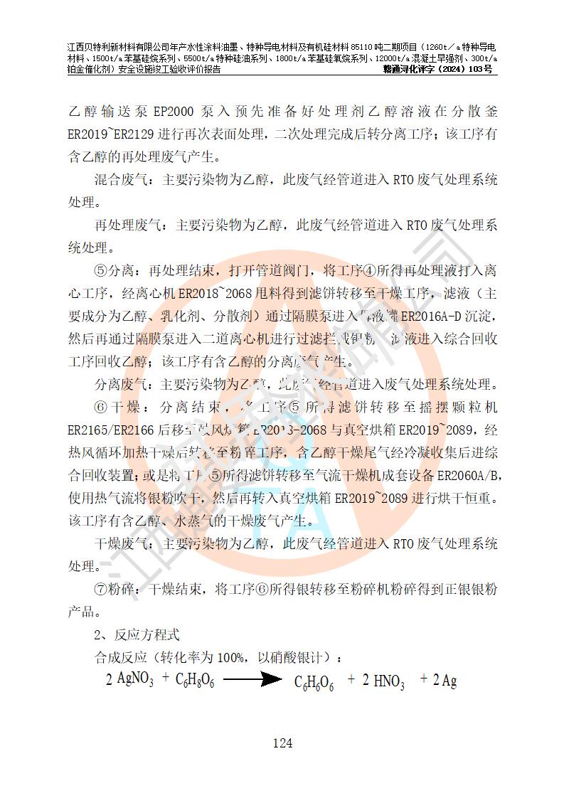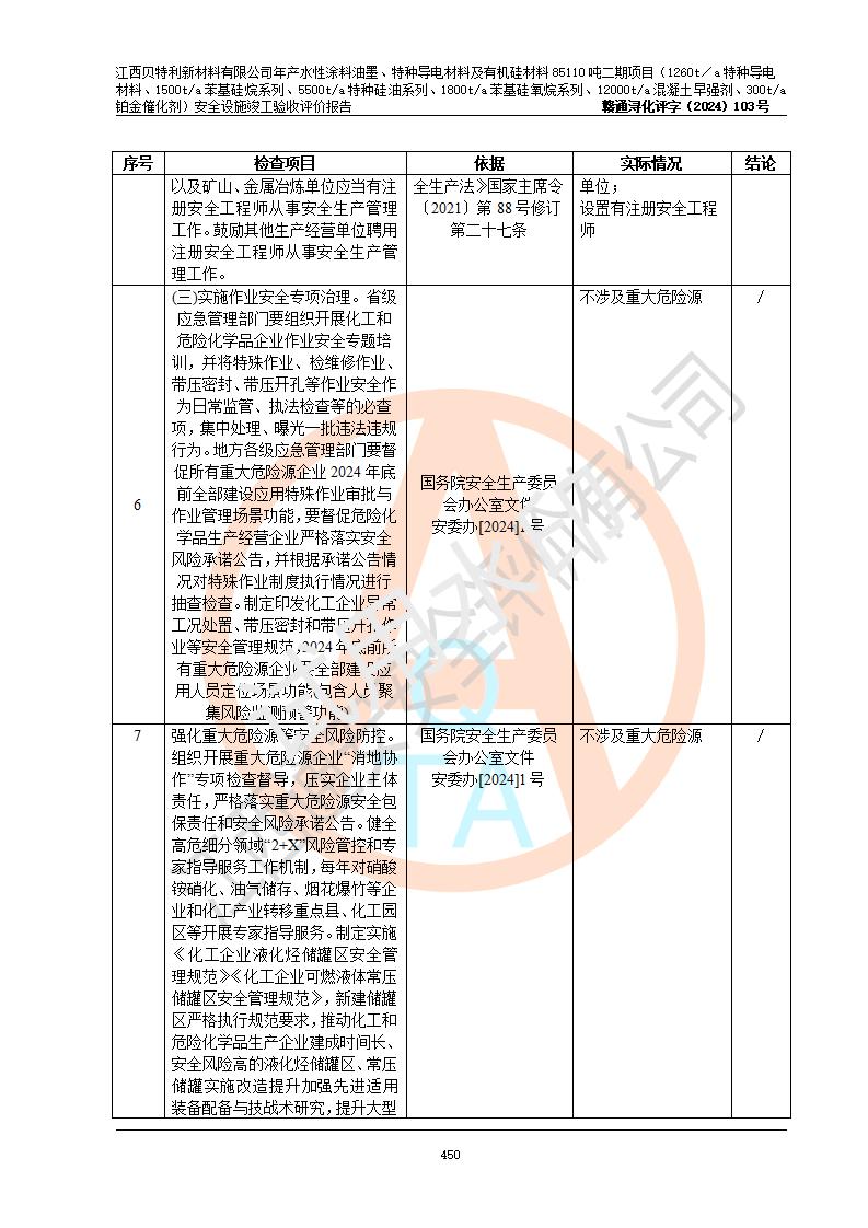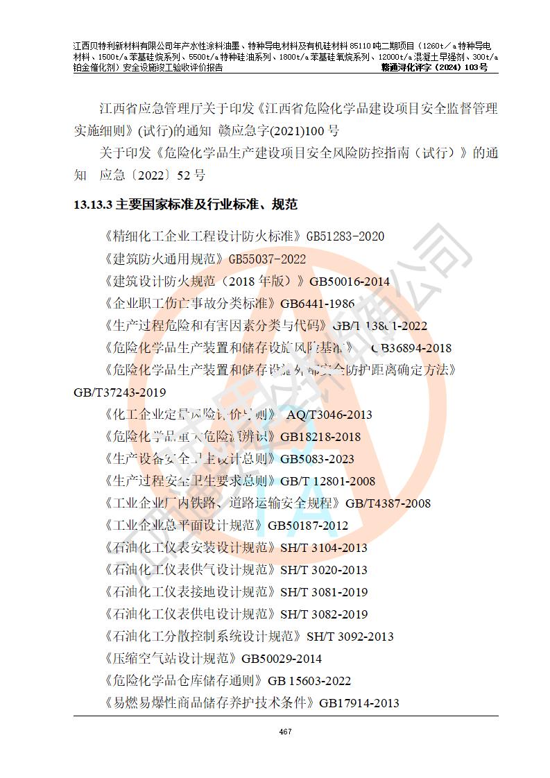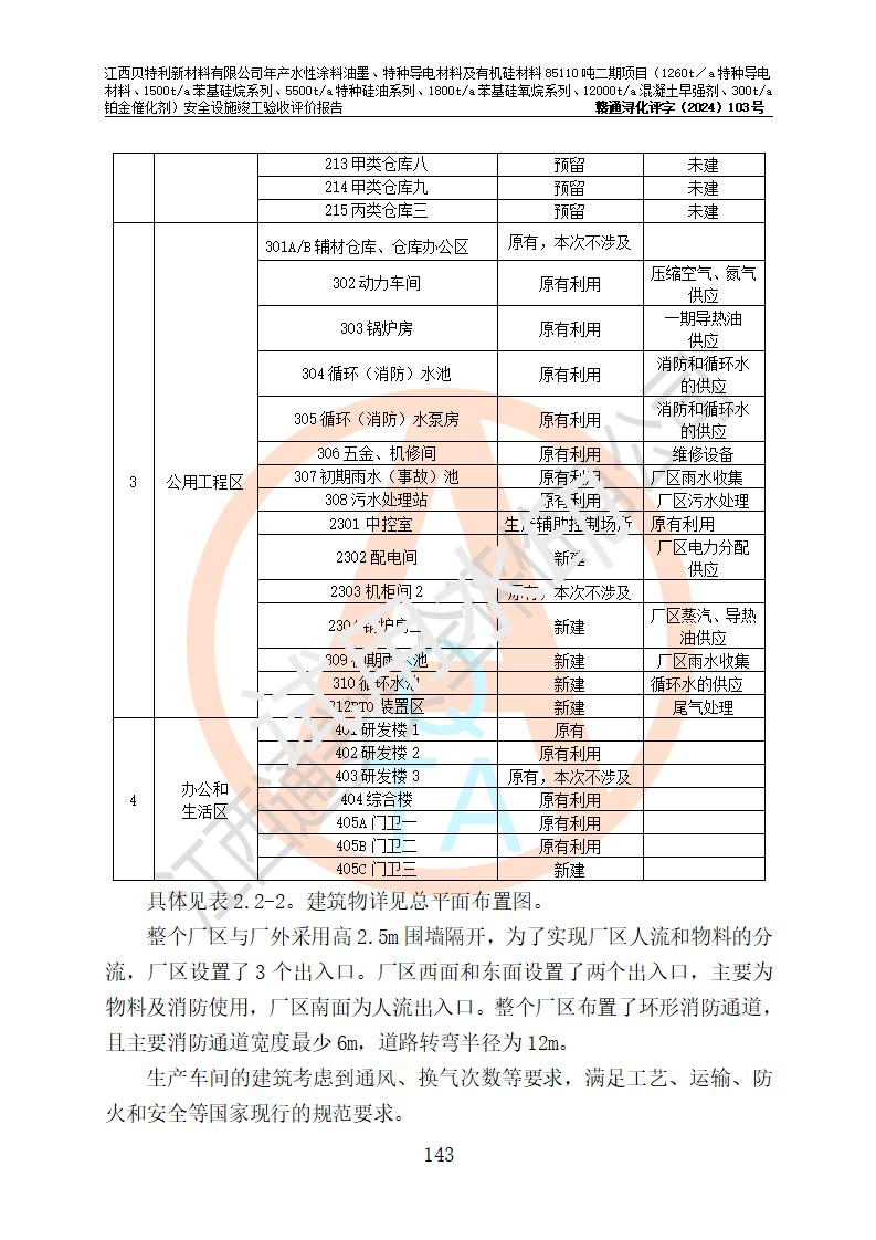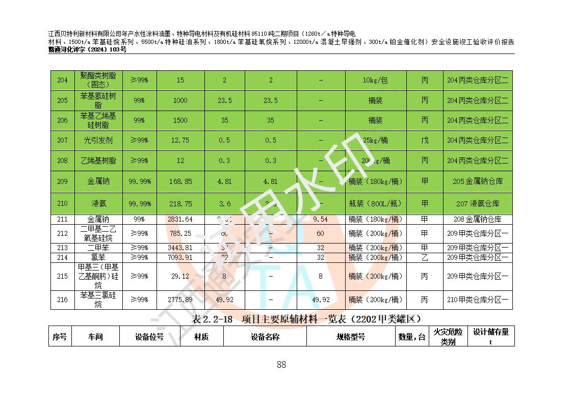 評價報告名稱 | 江西貝特利新材料有限公司年產(chǎn)水性涂料油墨、特種導電材料及有 機硅材料85110噸二期項目(1260t/a特種導電材料、1500t/a苯基硅烷系列、5500t/a特種硅油系列、1800t/a苯基硅氧烷系列、12000t/a混凝土早強劑、300t/a鉑金催化劑)安全設施竣工驗收評價報告 | |||||