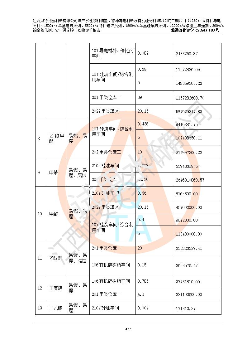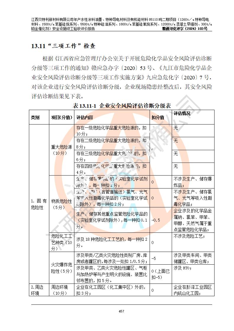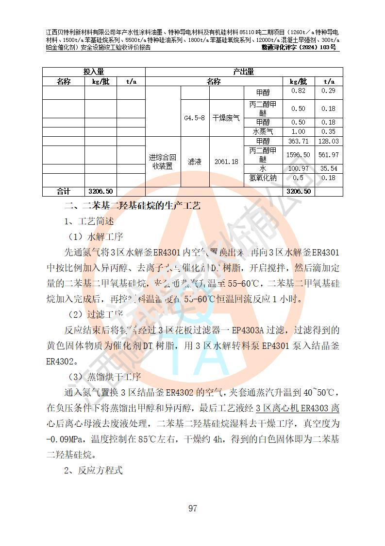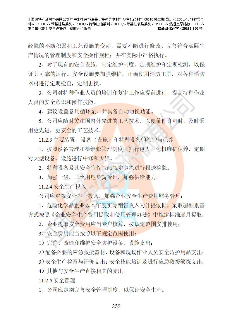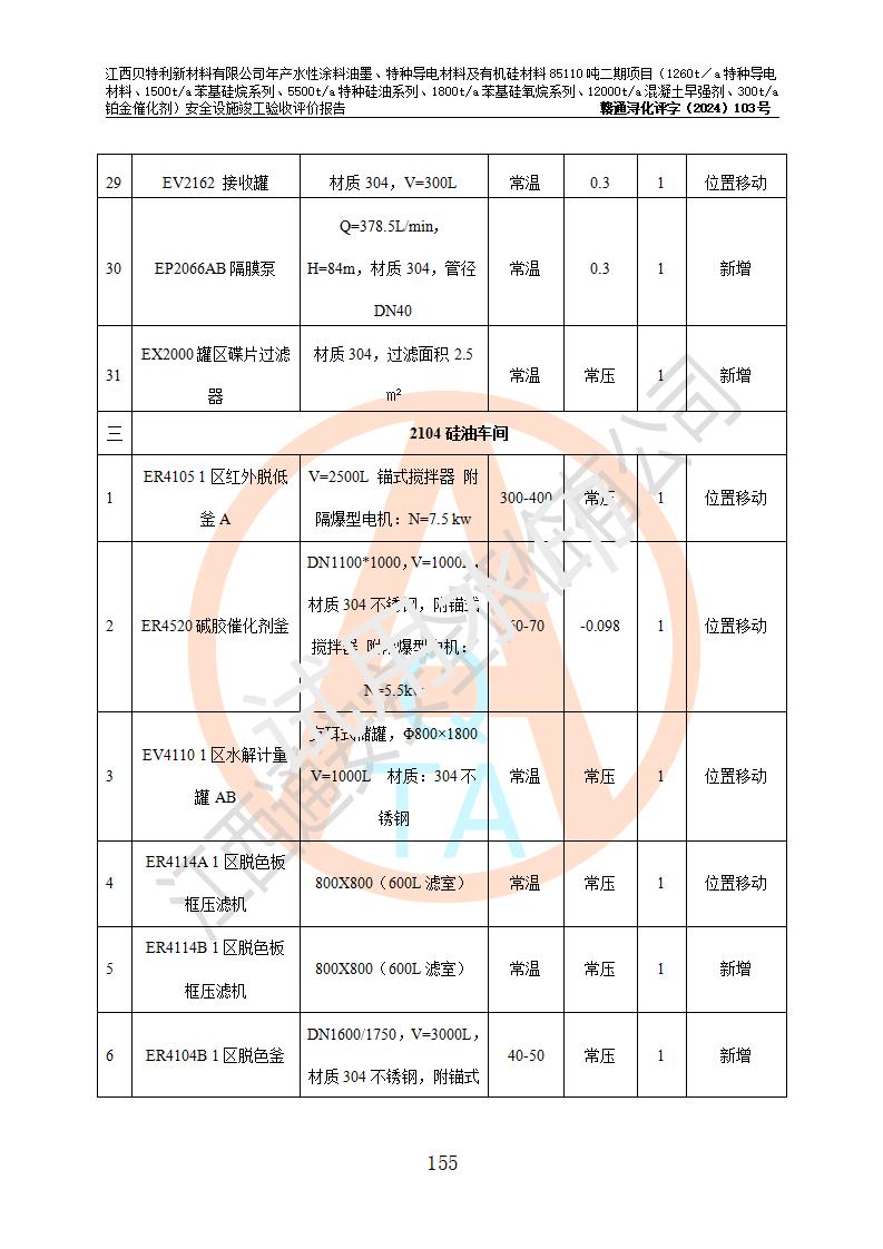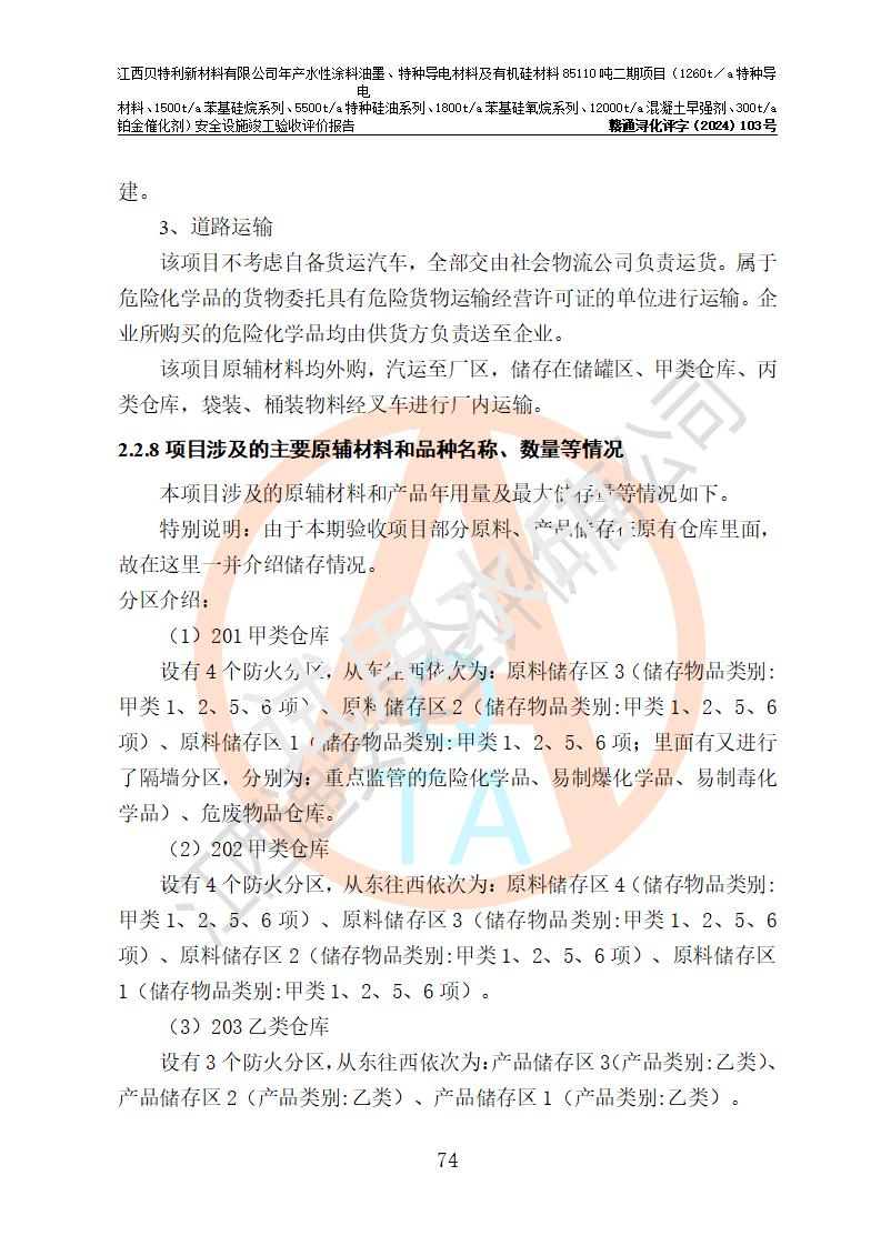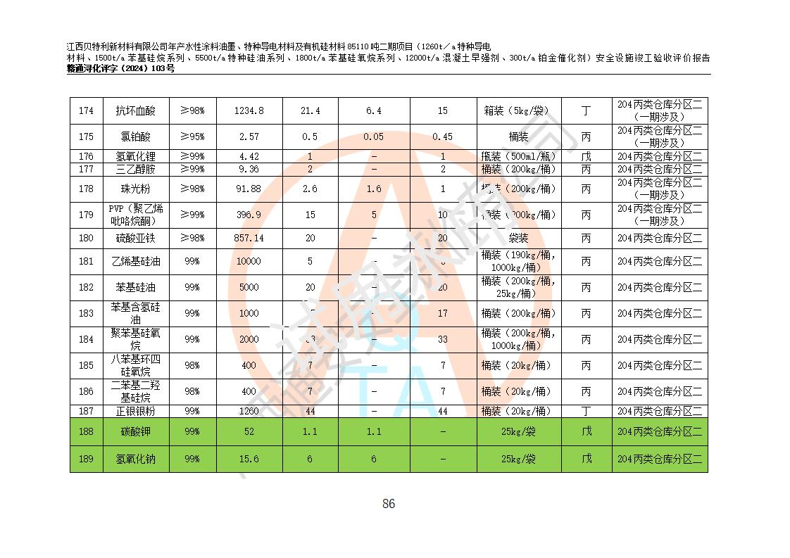 評價報告名稱 | 江西貝特利新材料有限公司年產(chǎn)水性涂料油墨、特種導電材料及有 機硅材料85110噸二期項目(1260t/a特種導電材料、1500t/a苯基硅烷系列、5500t/a特種硅油系列、1800t/a苯基硅氧烷系列、12000t/a混凝土早強劑、300t/a鉑金催化劑)安全設施竣工驗收評價報告 | |||||