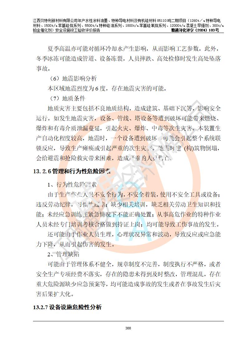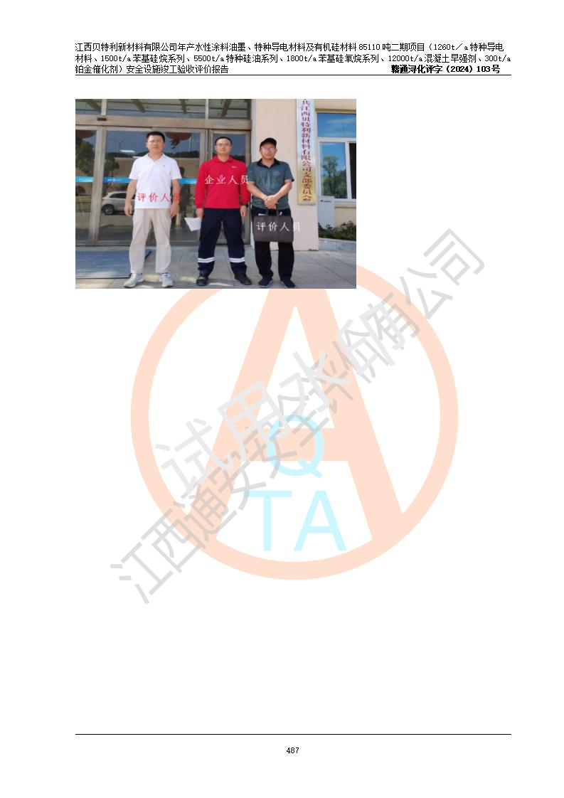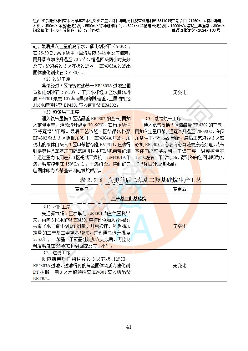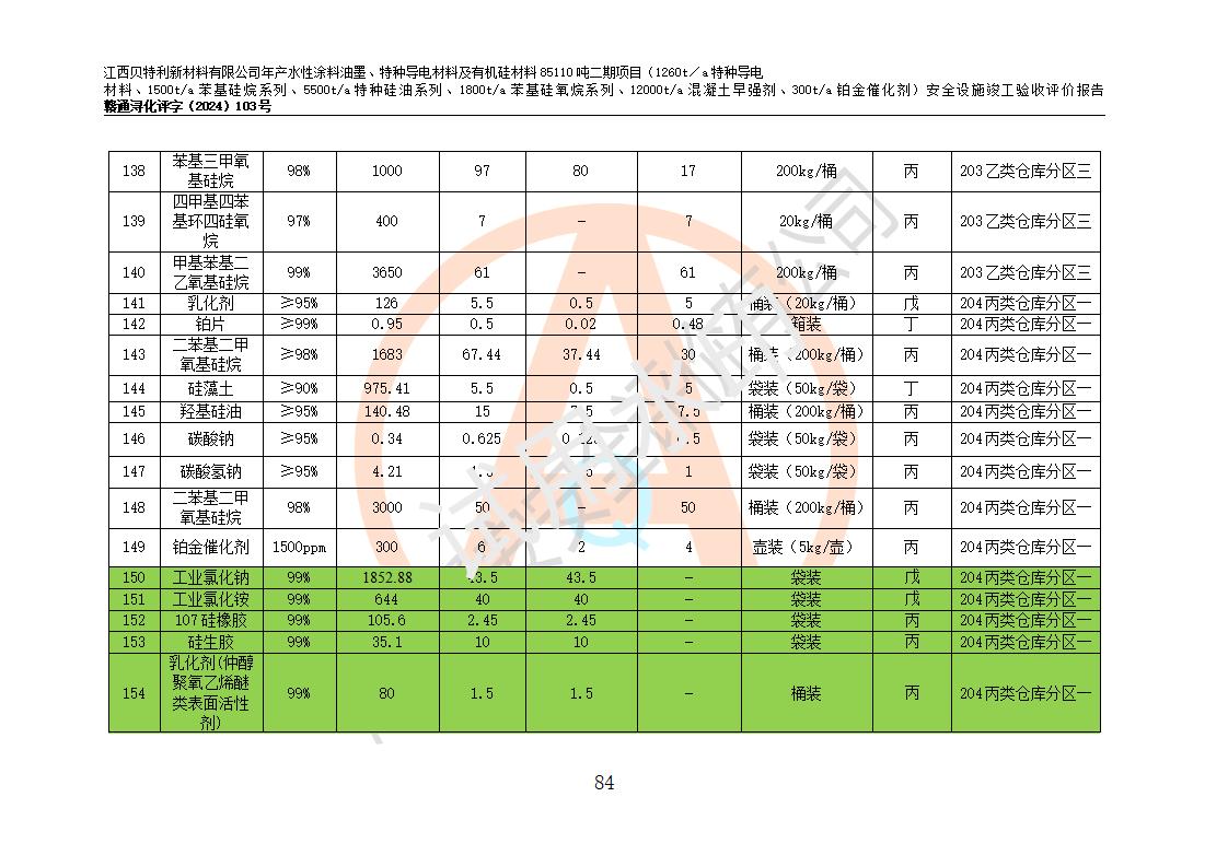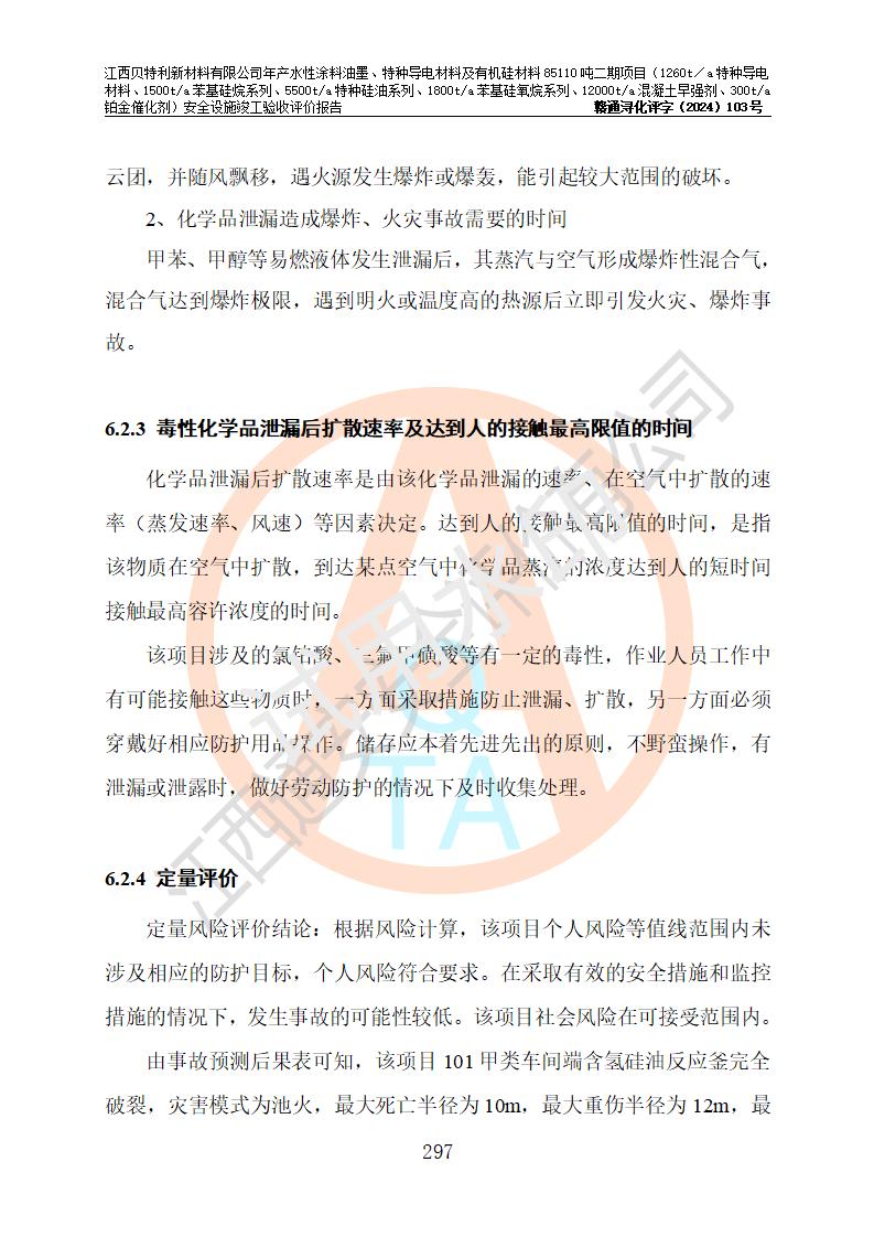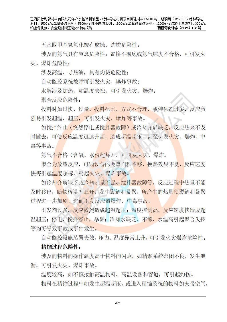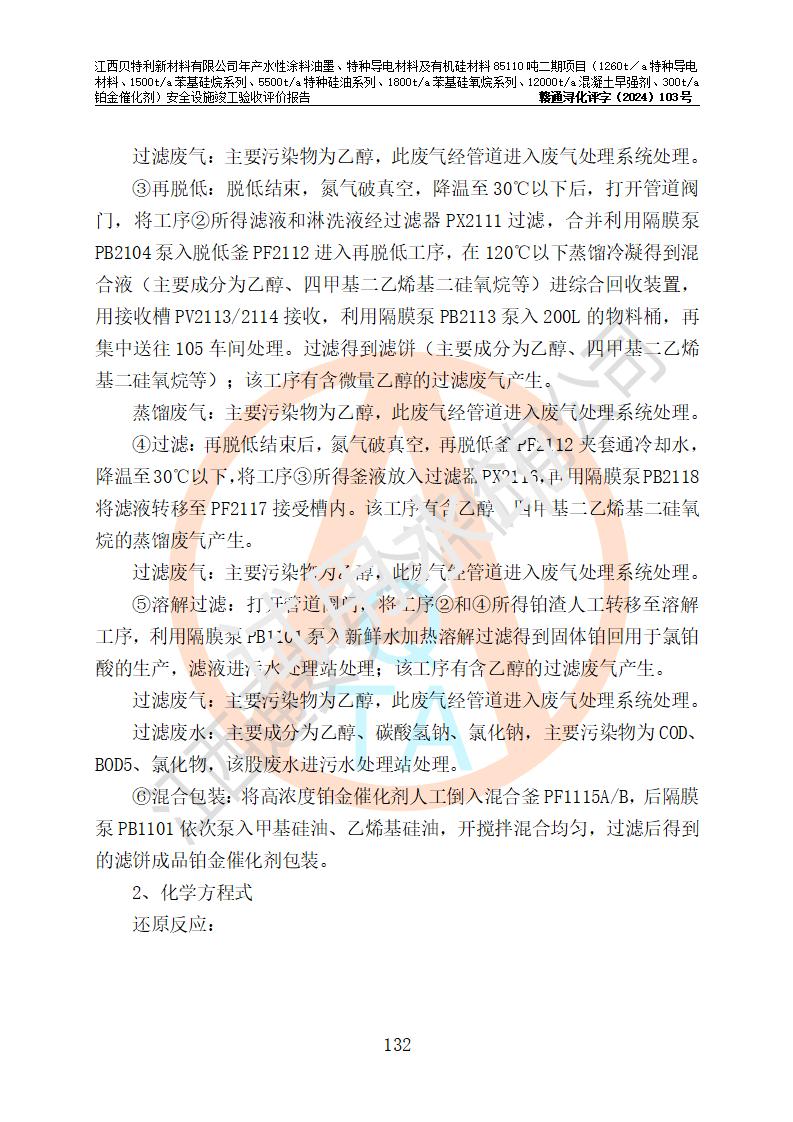 評價報告名稱 | 江西貝特利新材料有限公司年產(chǎn)水性涂料油墨、特種導電材料及有 機硅材料85110噸二期項目(1260t/a特種導電材料、1500t/a苯基硅烷系列、5500t/a特種硅油系列、1800t/a苯基硅氧烷系列、12000t/a混凝土早強劑、300t/a鉑金催化劑)安全設施竣工驗收評價報告 | |||||