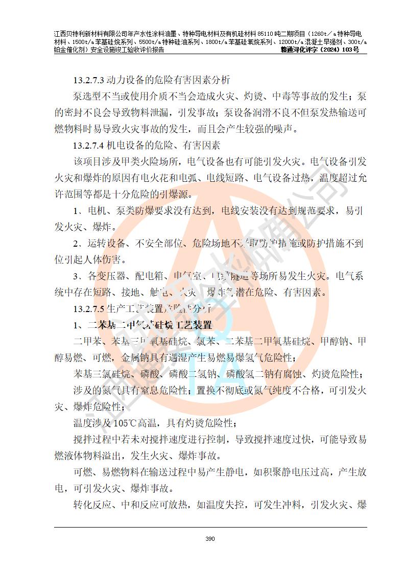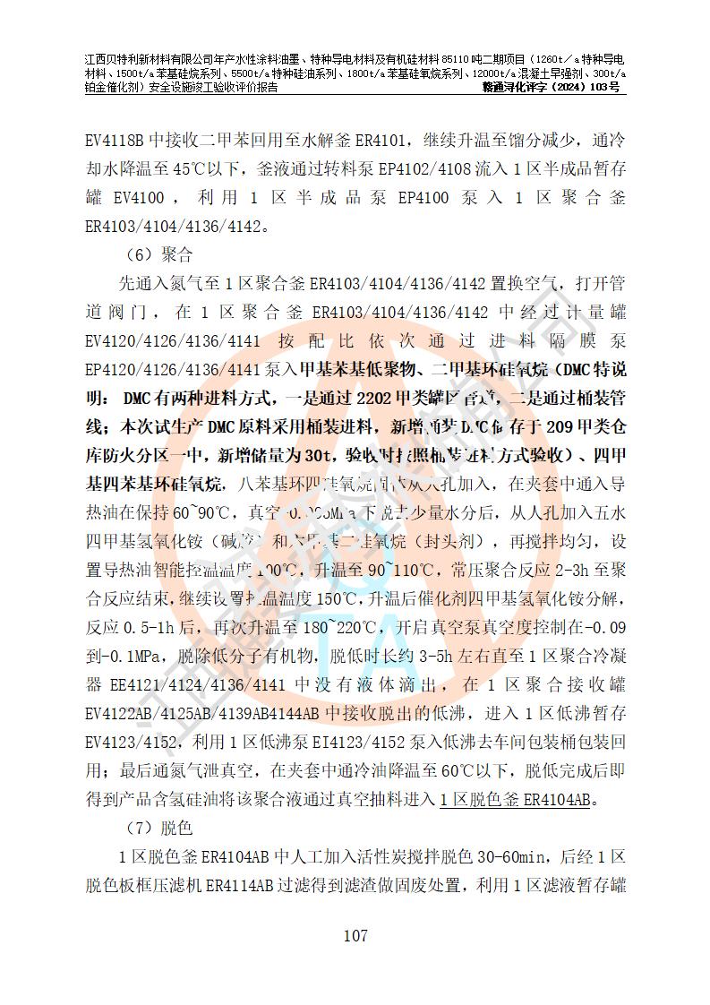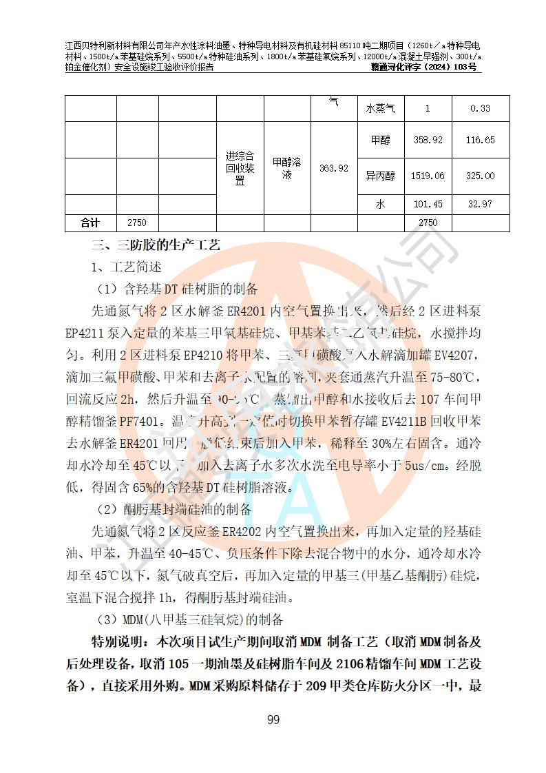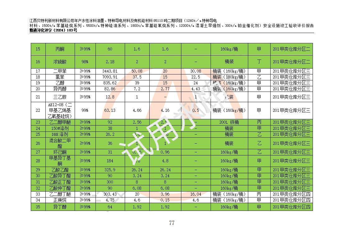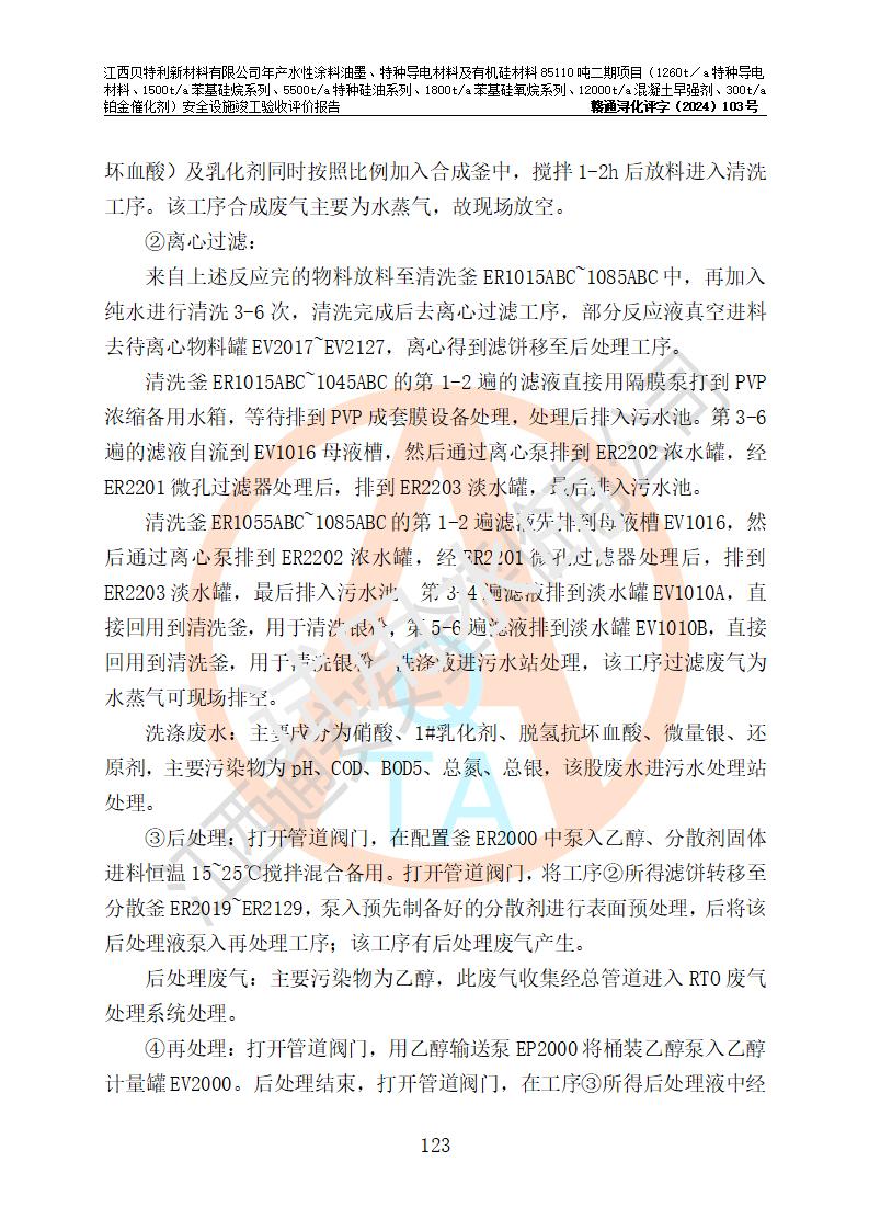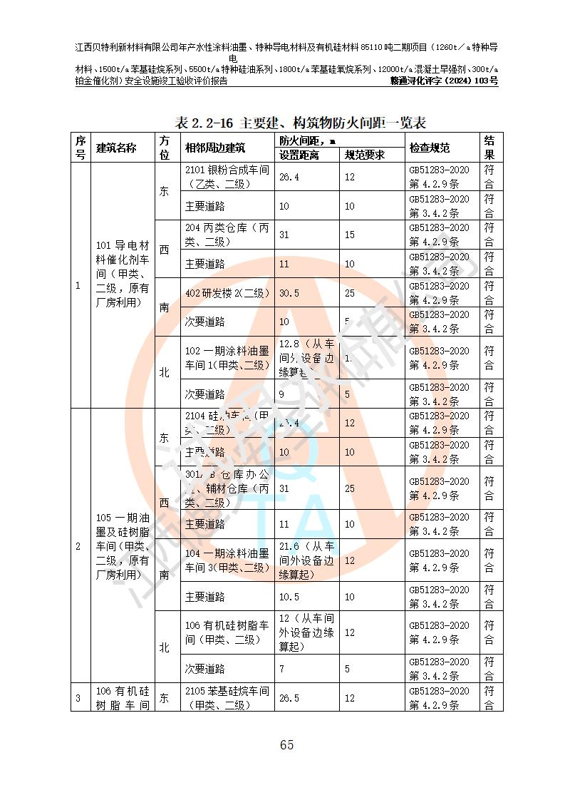 評價報告名稱 | 江西貝特利新材料有限公司年產(chǎn)水性涂料油墨、特種導電材料及有 機硅材料85110噸二期項目(1260t/a特種導電材料、1500t/a苯基硅烷系列、5500t/a特種硅油系列、1800t/a苯基硅氧烷系列、12000t/a混凝土早強劑、300t/a鉑金催化劑)安全設施竣工驗收評價報告 | |||||