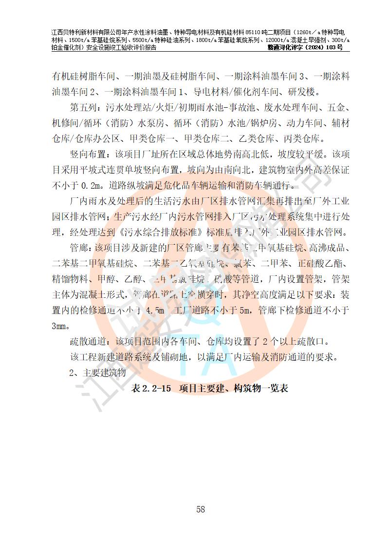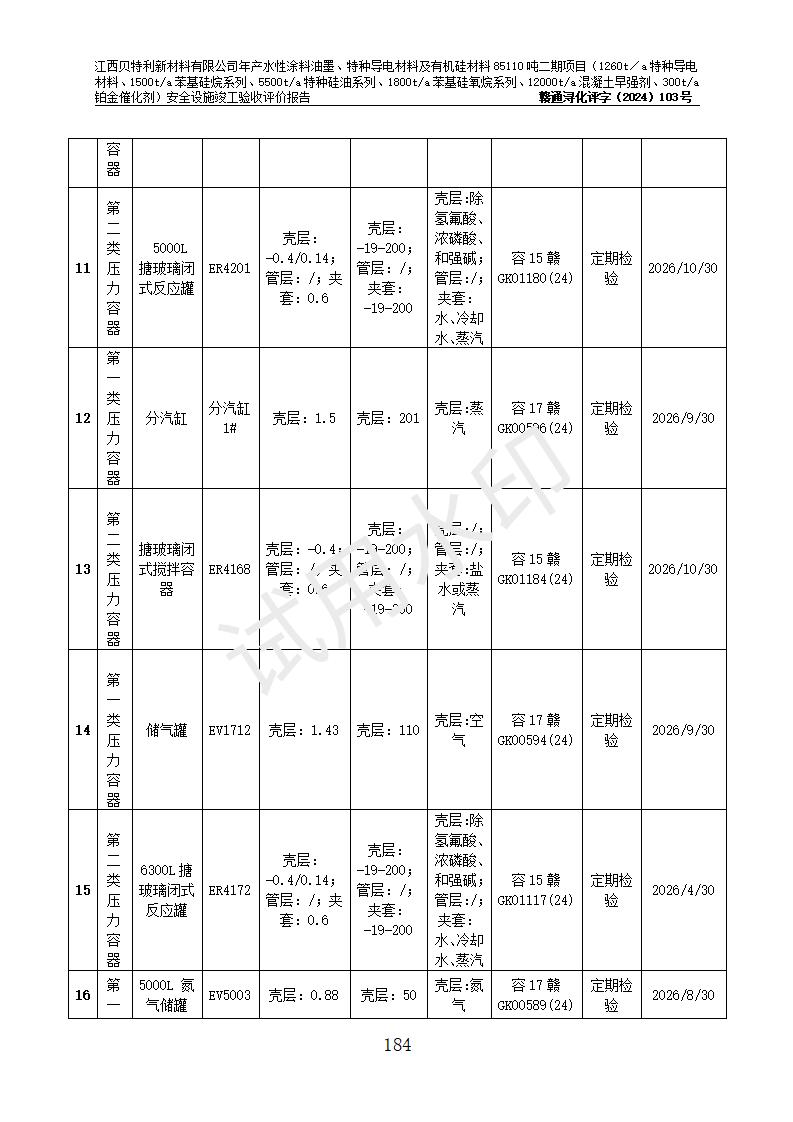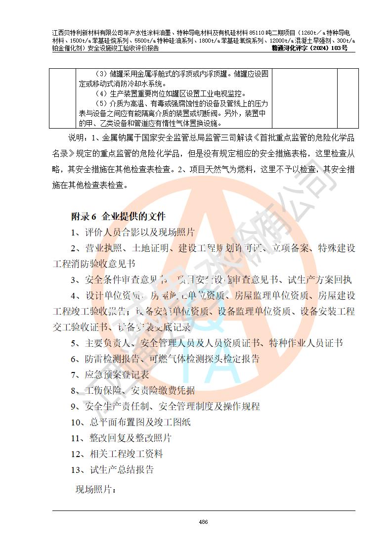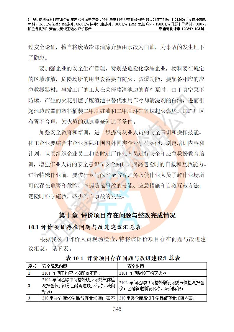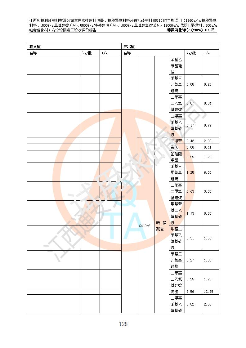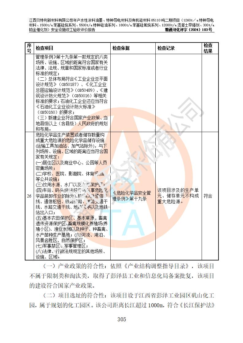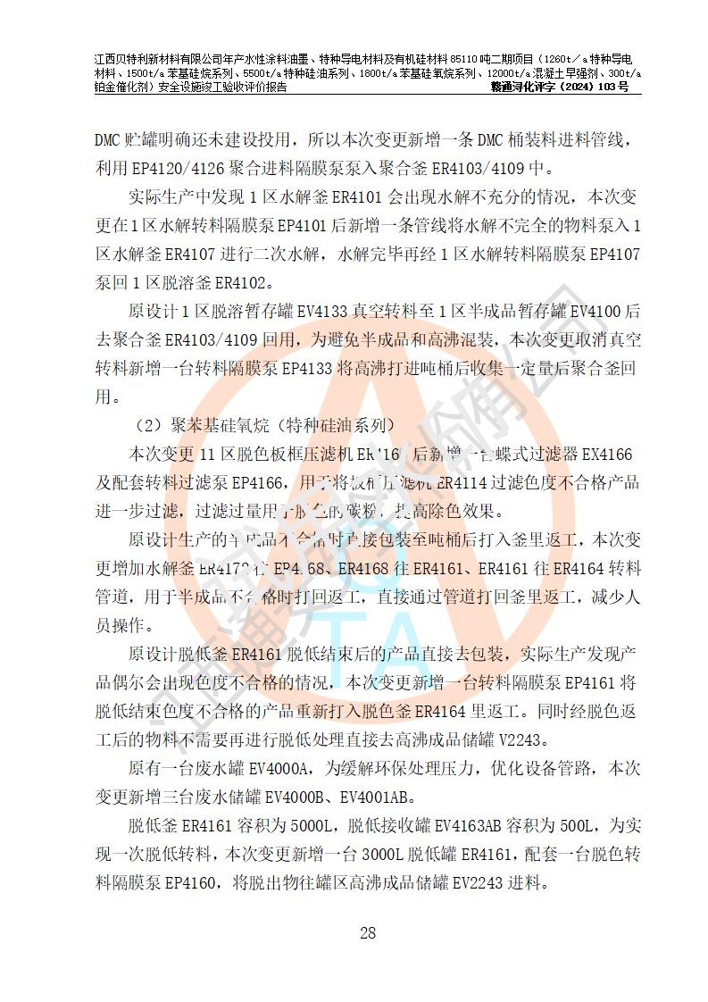 評價報告名稱 | 江西貝特利新材料有限公司年產(chǎn)水性涂料油墨、特種導電材料及有 機硅材料85110噸二期項目(1260t/a特種導電材料、1500t/a苯基硅烷系列、5500t/a特種硅油系列、1800t/a苯基硅氧烷系列、12000t/a混凝土早強劑、300t/a鉑金催化劑)安全設施竣工驗收評價報告 | |||||
