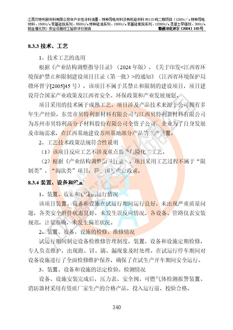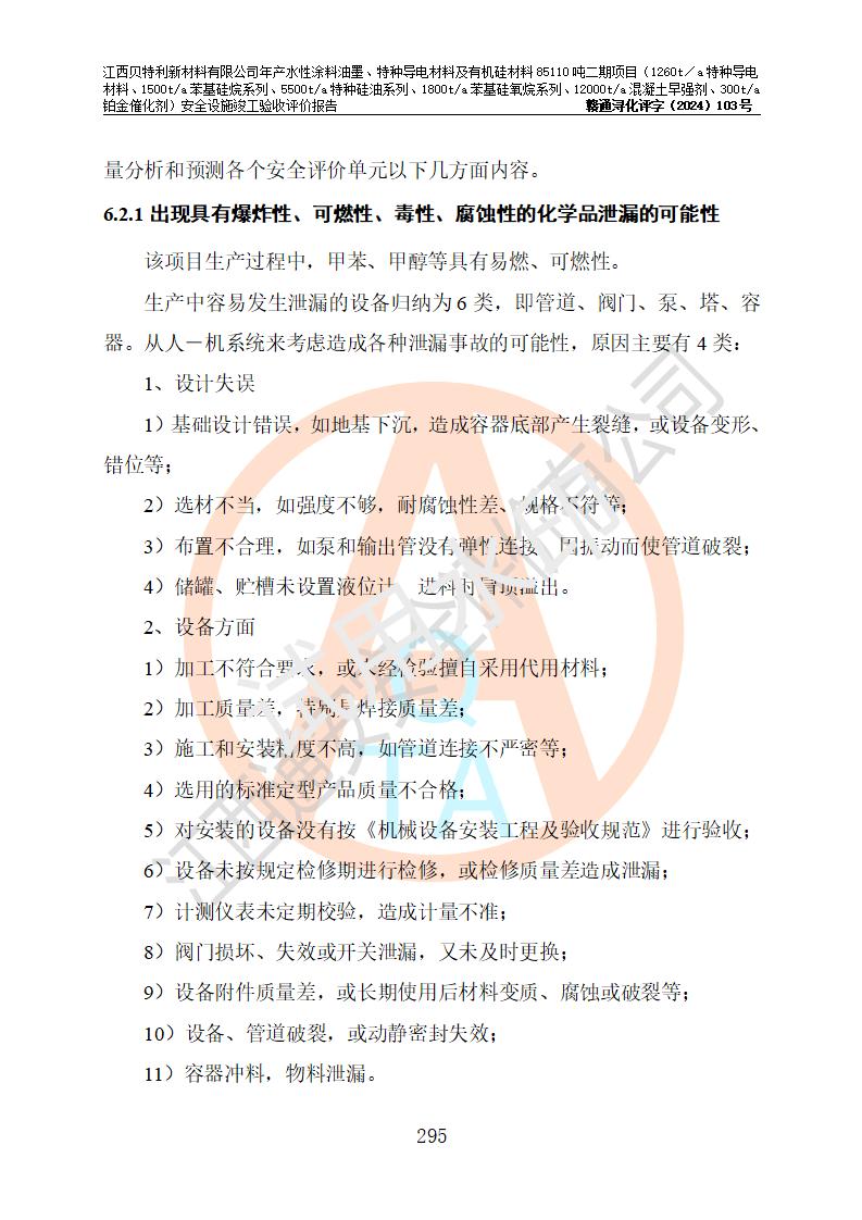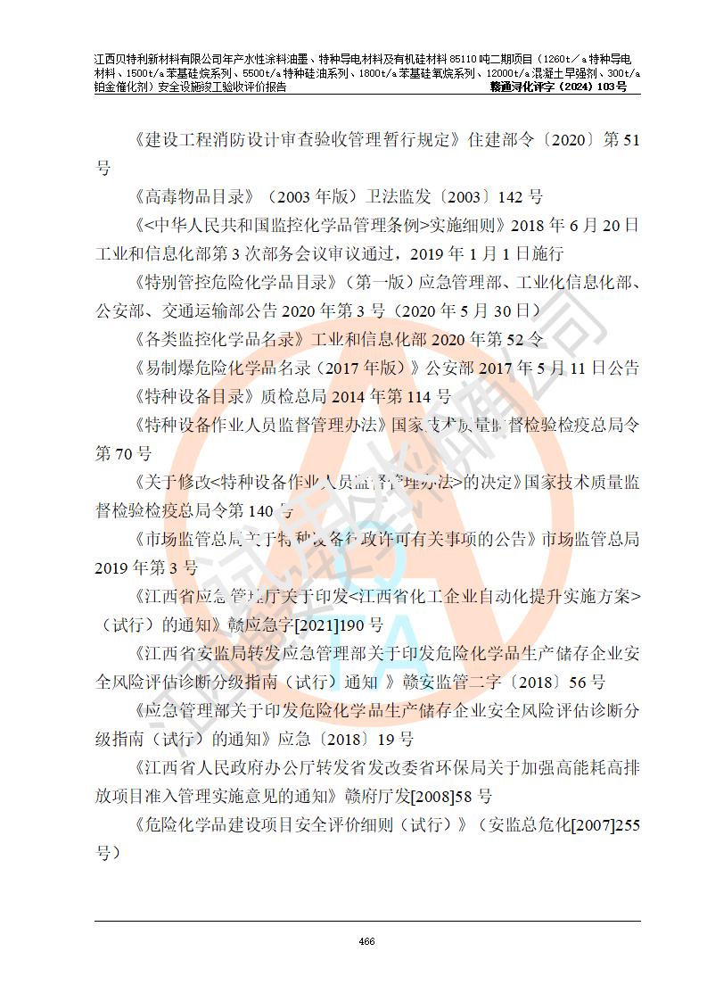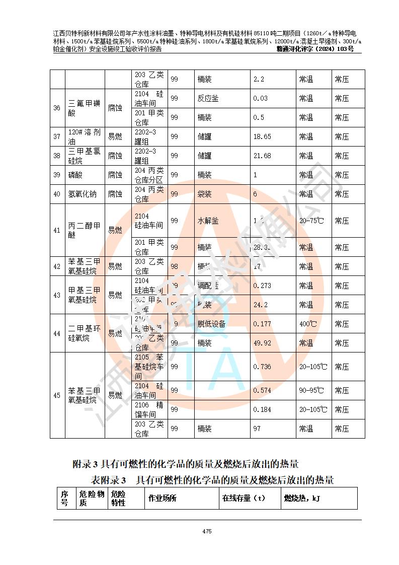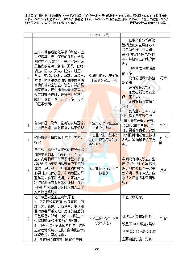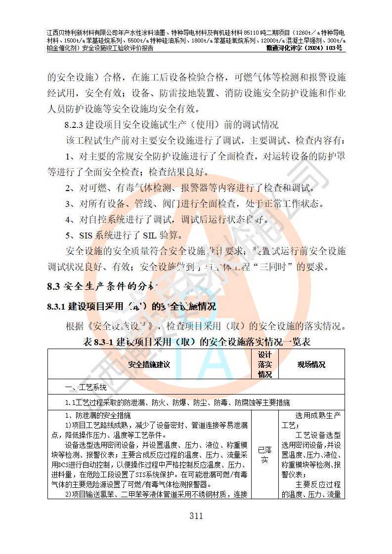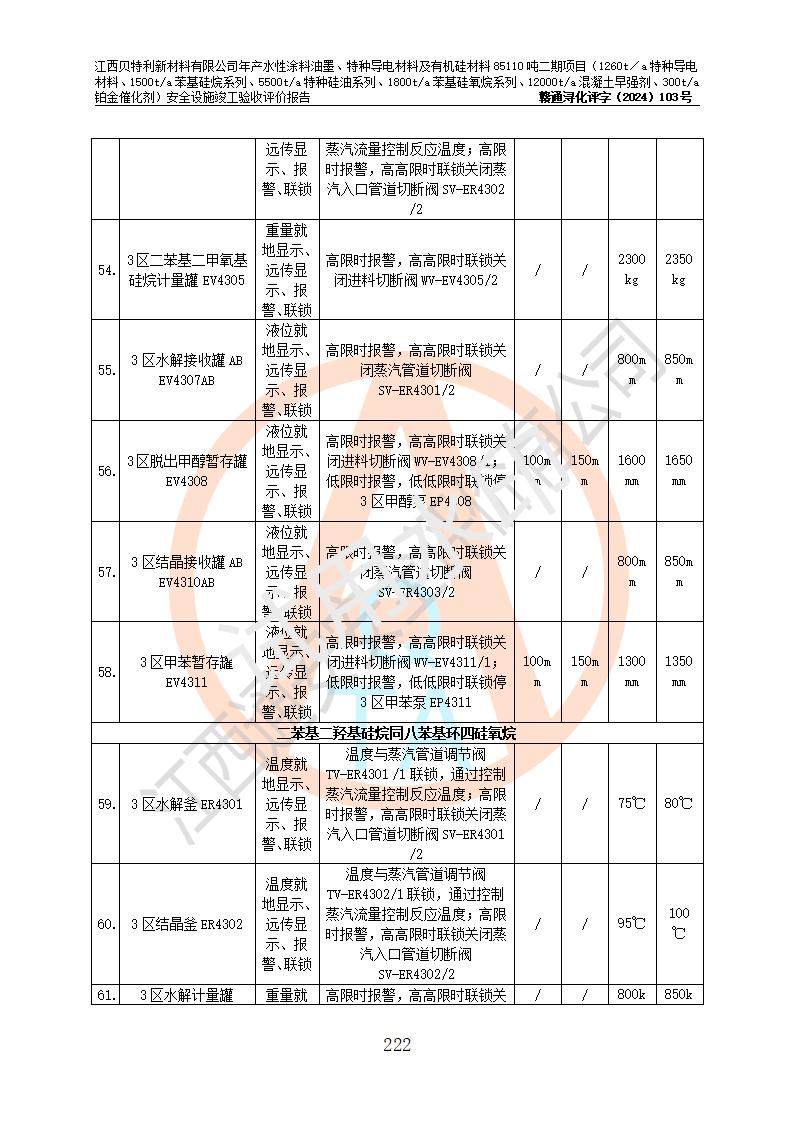 評價報告名稱 | 江西貝特利新材料有限公司年產(chǎn)水性涂料油墨、特種導電材料及有 機硅材料85110噸二期項目(1260t/a特種導電材料、1500t/a苯基硅烷系列、5500t/a特種硅油系列、1800t/a苯基硅氧烷系列、12000t/a混凝土早強劑、300t/a鉑金催化劑)安全設施竣工驗收評價報告 | |||||