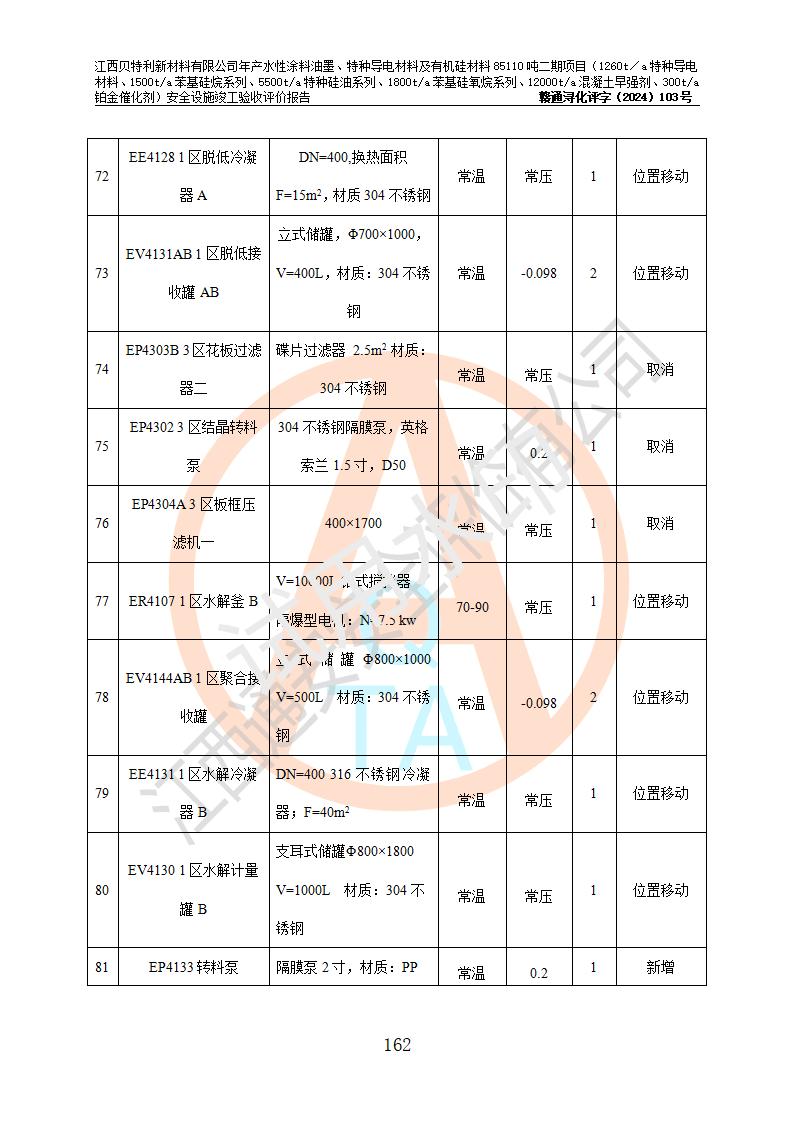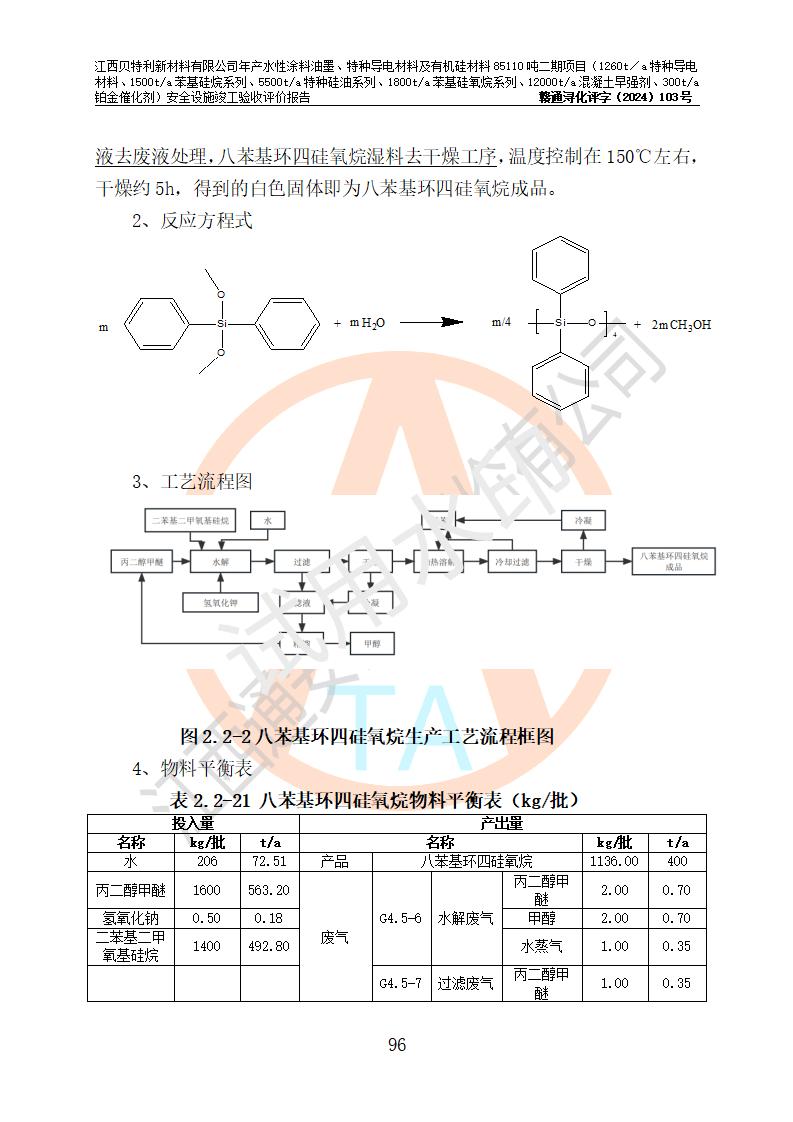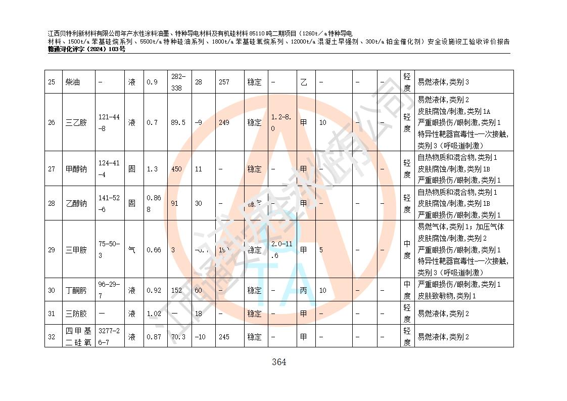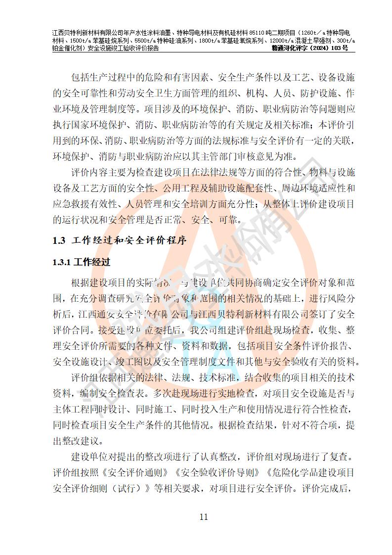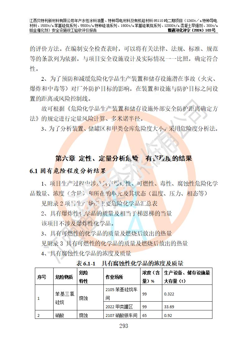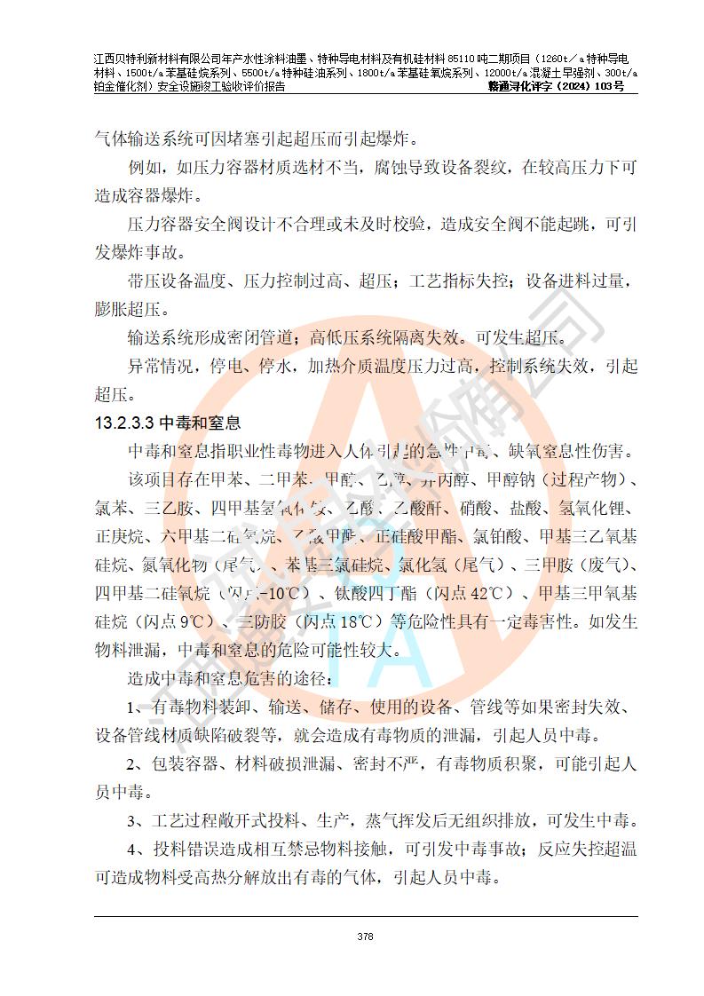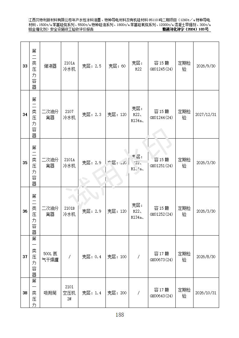 評價報告名稱 | 江西貝特利新材料有限公司年產(chǎn)水性涂料油墨、特種導電材料及有 機硅材料85110噸二期項目(1260t/a特種導電材料、1500t/a苯基硅烷系列、5500t/a特種硅油系列、1800t/a苯基硅氧烷系列、12000t/a混凝土早強劑、300t/a鉑金催化劑)安全設施竣工驗收評價報告 | |||||