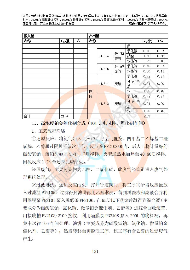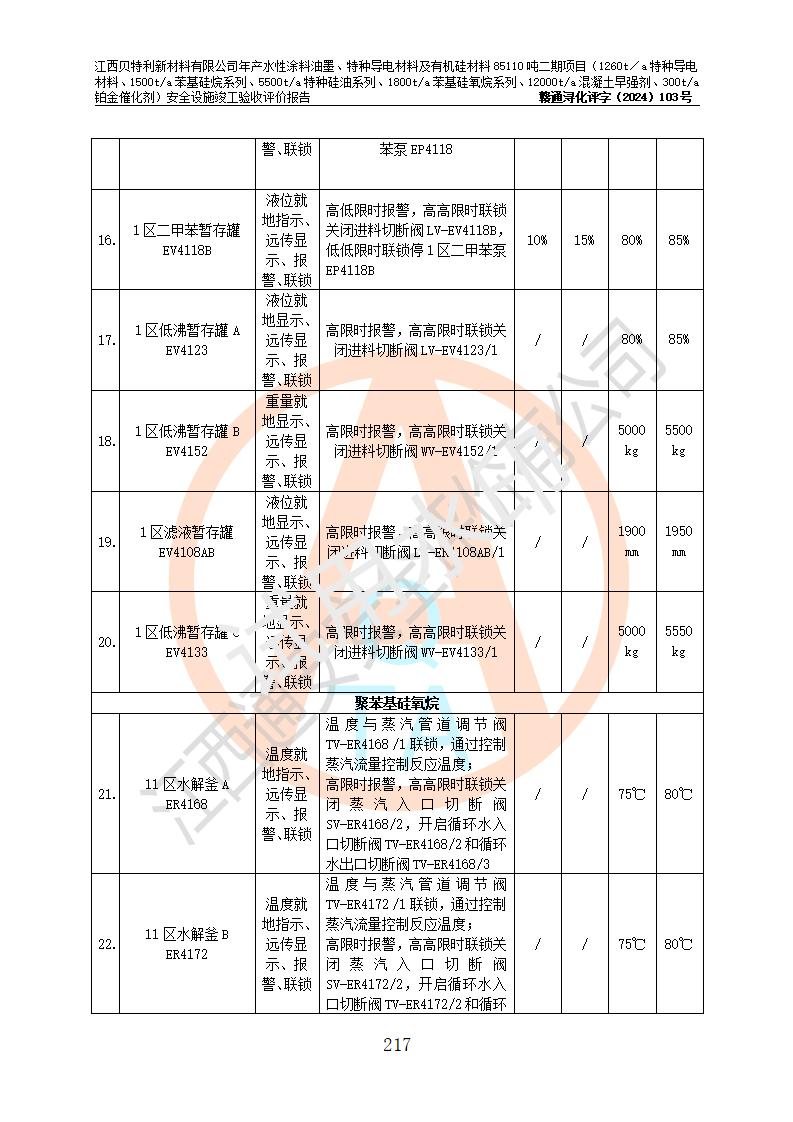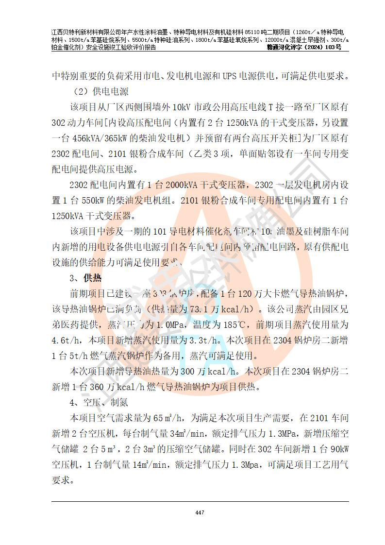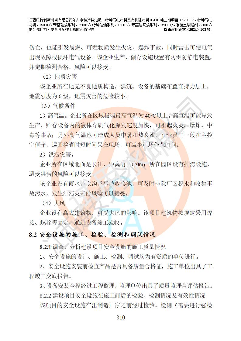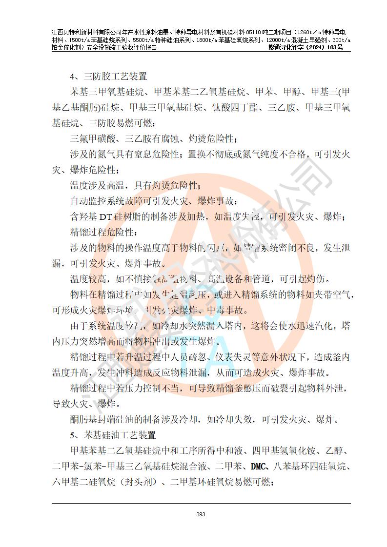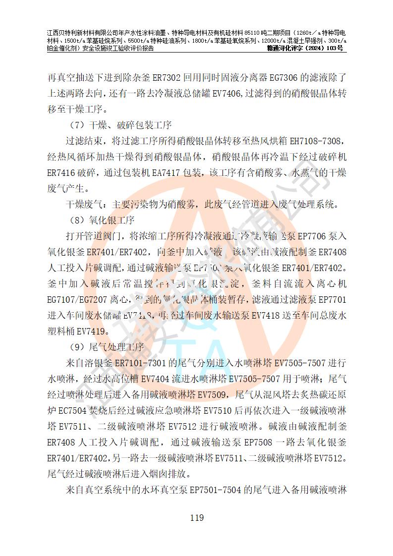 評價報告名稱 | 江西貝特利新材料有限公司年產(chǎn)水性涂料油墨、特種導電材料及有 機硅材料85110噸二期項目(1260t/a特種導電材料、1500t/a苯基硅烷系列、5500t/a特種硅油系列、1800t/a苯基硅氧烷系列、12000t/a混凝土早強劑、300t/a鉑金催化劑)安全設施竣工驗收評價報告 | |||||