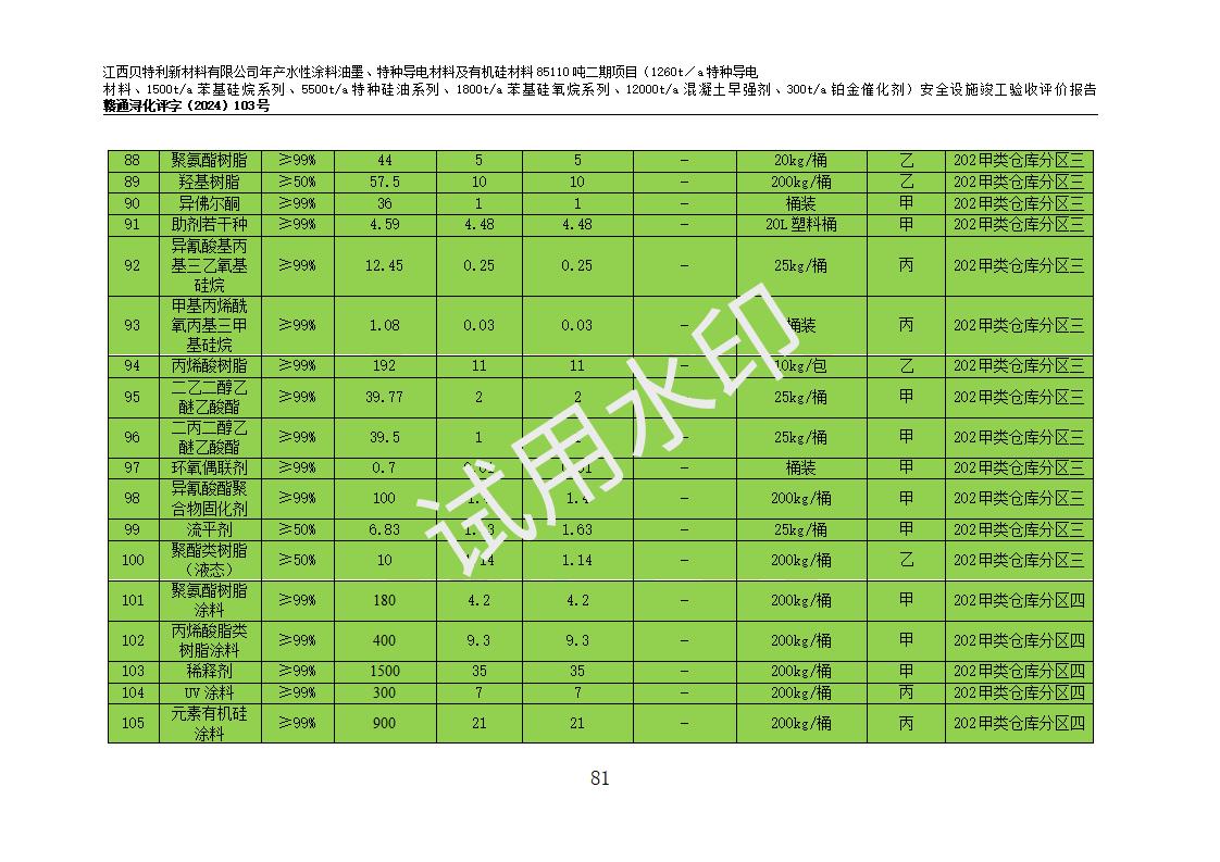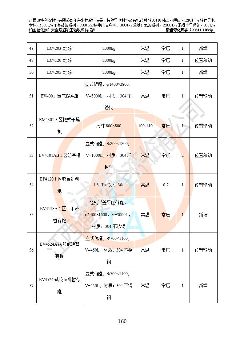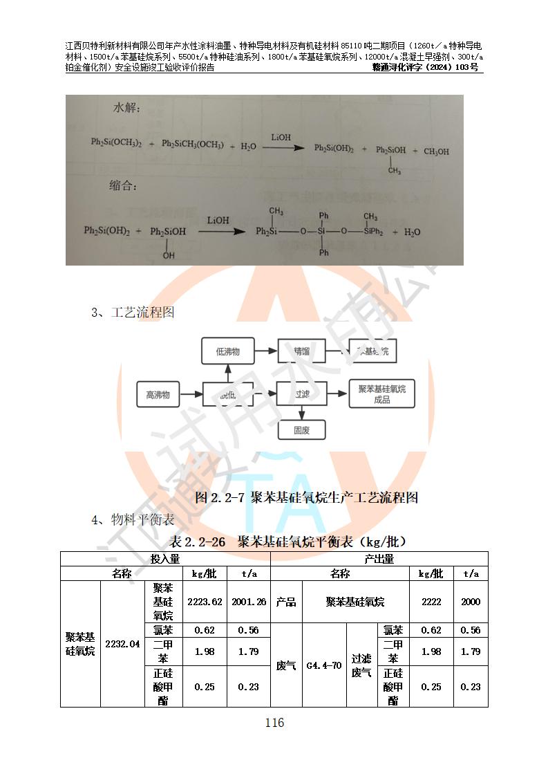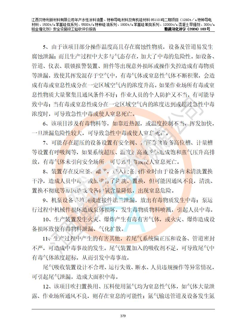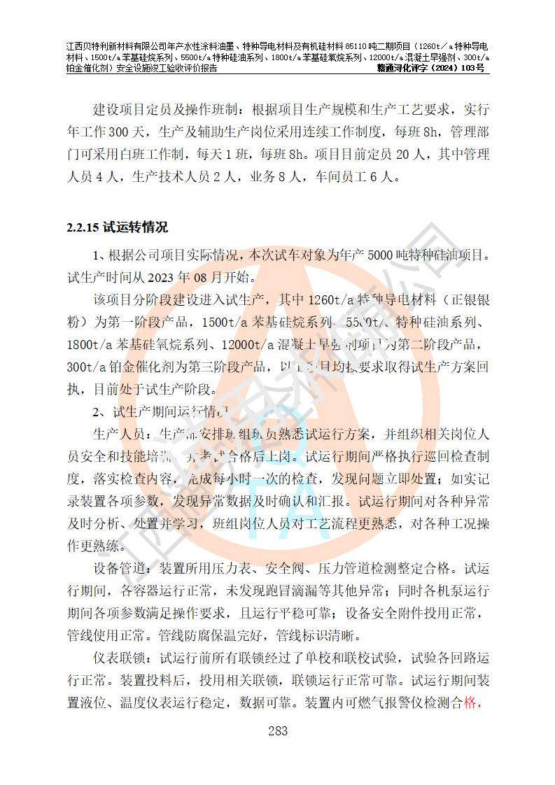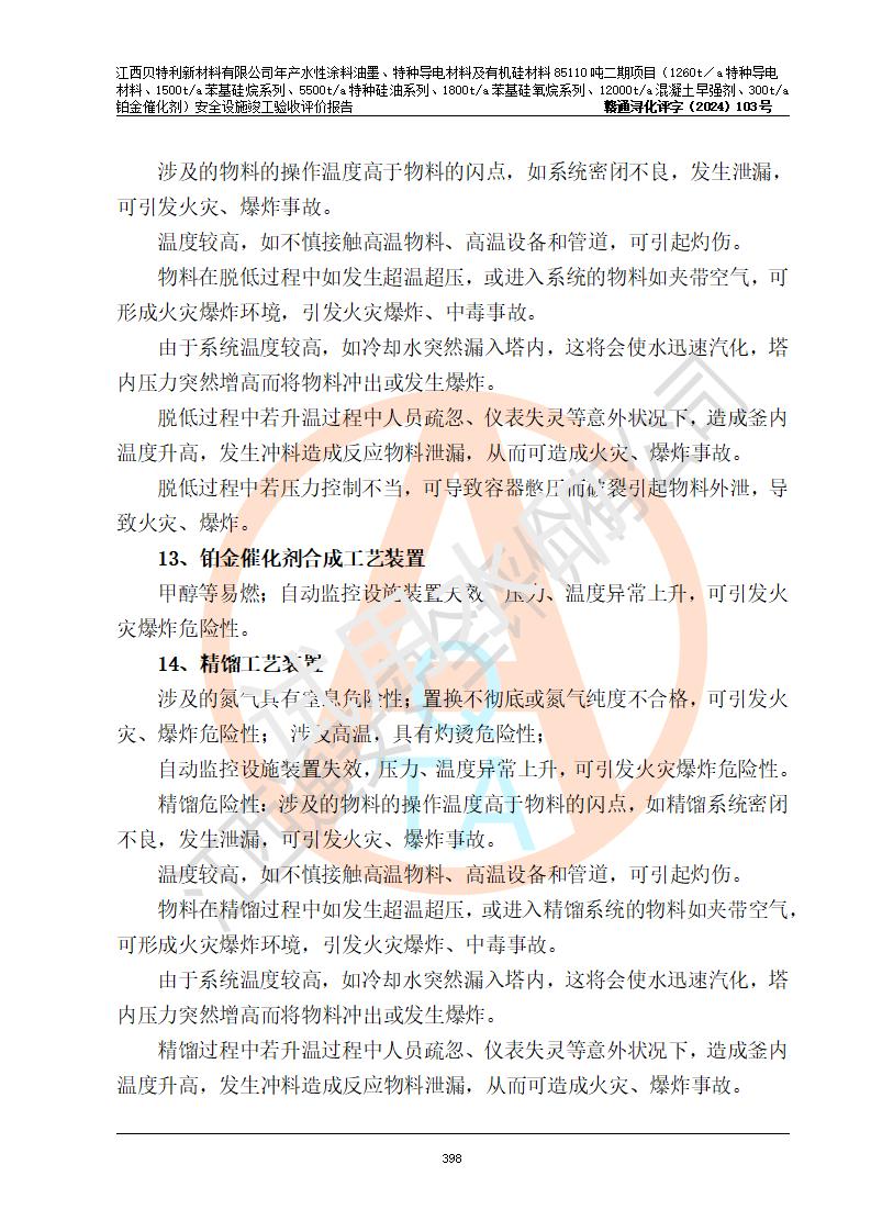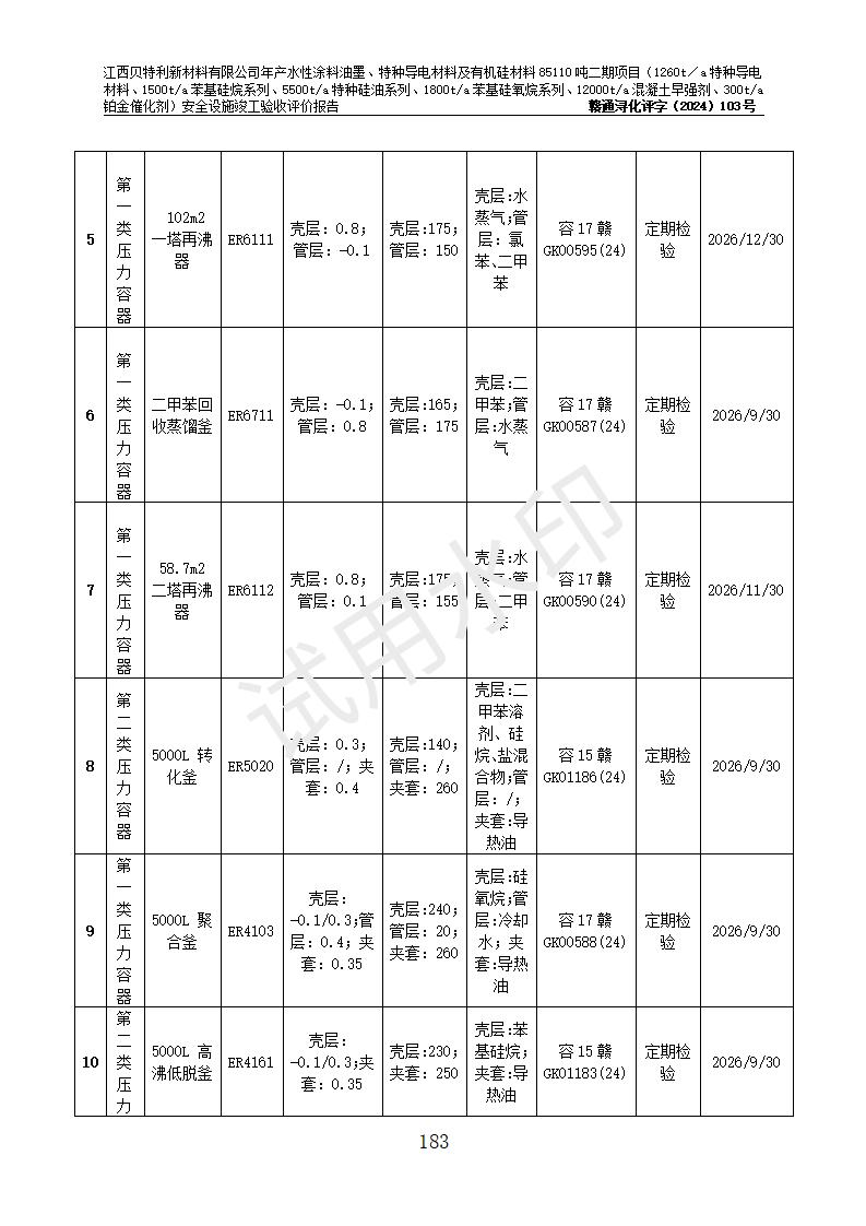 評價報告名稱 | 江西貝特利新材料有限公司年產(chǎn)水性涂料油墨、特種導電材料及有 機硅材料85110噸二期項目(1260t/a特種導電材料、1500t/a苯基硅烷系列、5500t/a特種硅油系列、1800t/a苯基硅氧烷系列、12000t/a混凝土早強劑、300t/a鉑金催化劑)安全設施竣工驗收評價報告 | |||||