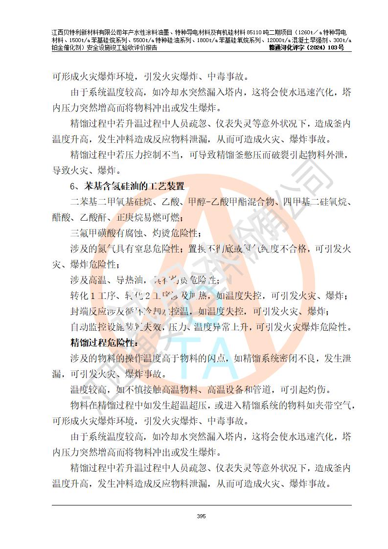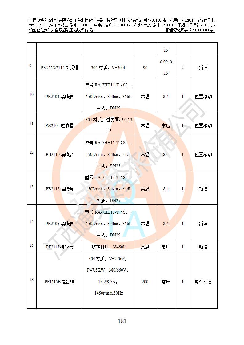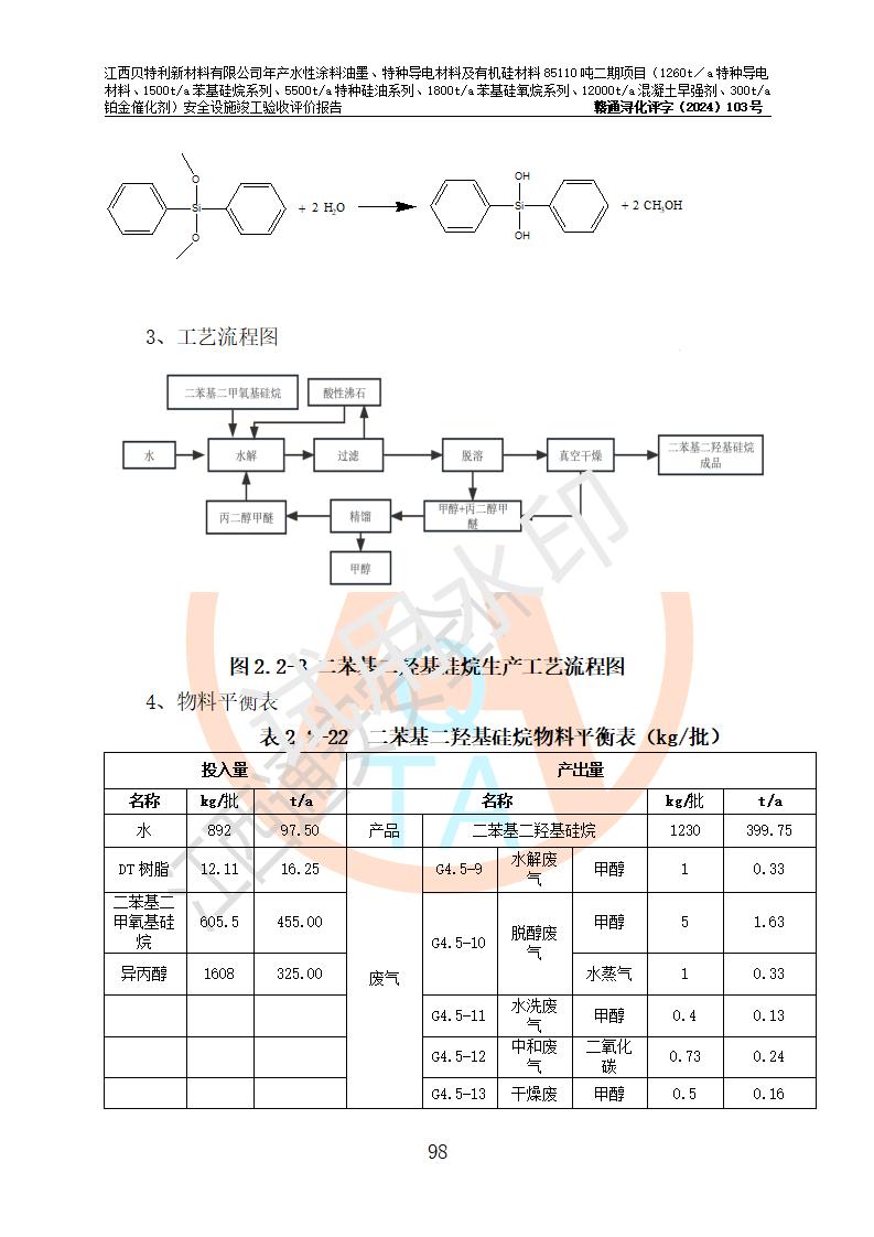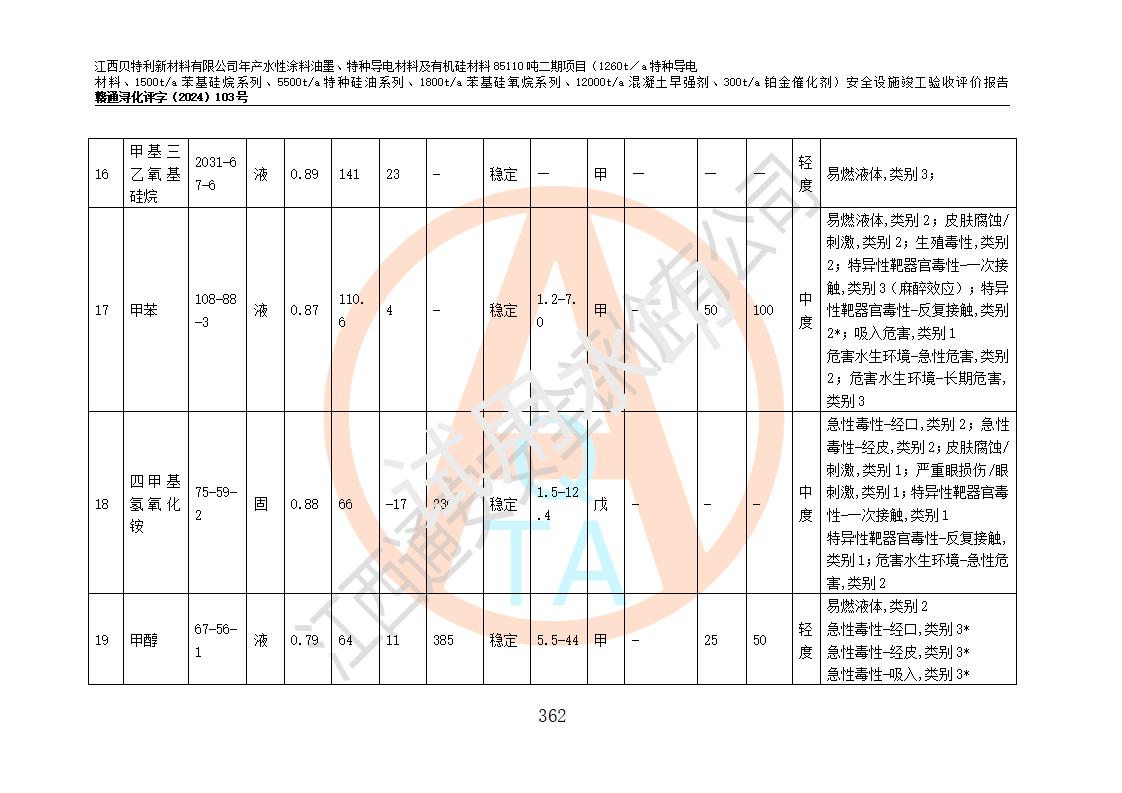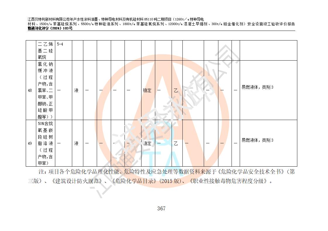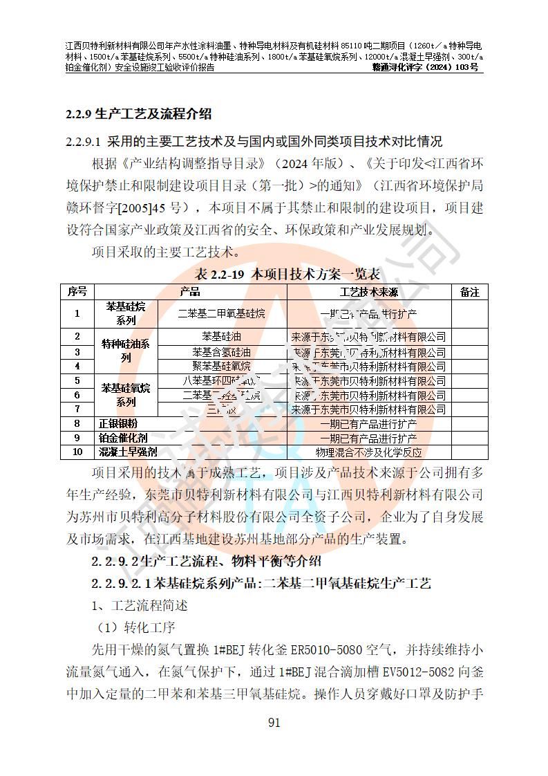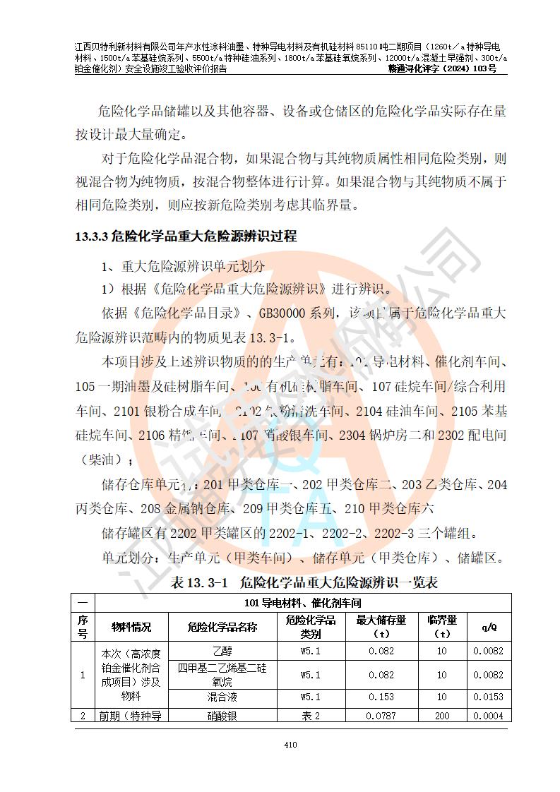 評價報告名稱 | 江西貝特利新材料有限公司年產(chǎn)水性涂料油墨、特種導電材料及有 機硅材料85110噸二期項目(1260t/a特種導電材料、1500t/a苯基硅烷系列、5500t/a特種硅油系列、1800t/a苯基硅氧烷系列、12000t/a混凝土早強劑、300t/a鉑金催化劑)安全設施竣工驗收評價報告 | |||||