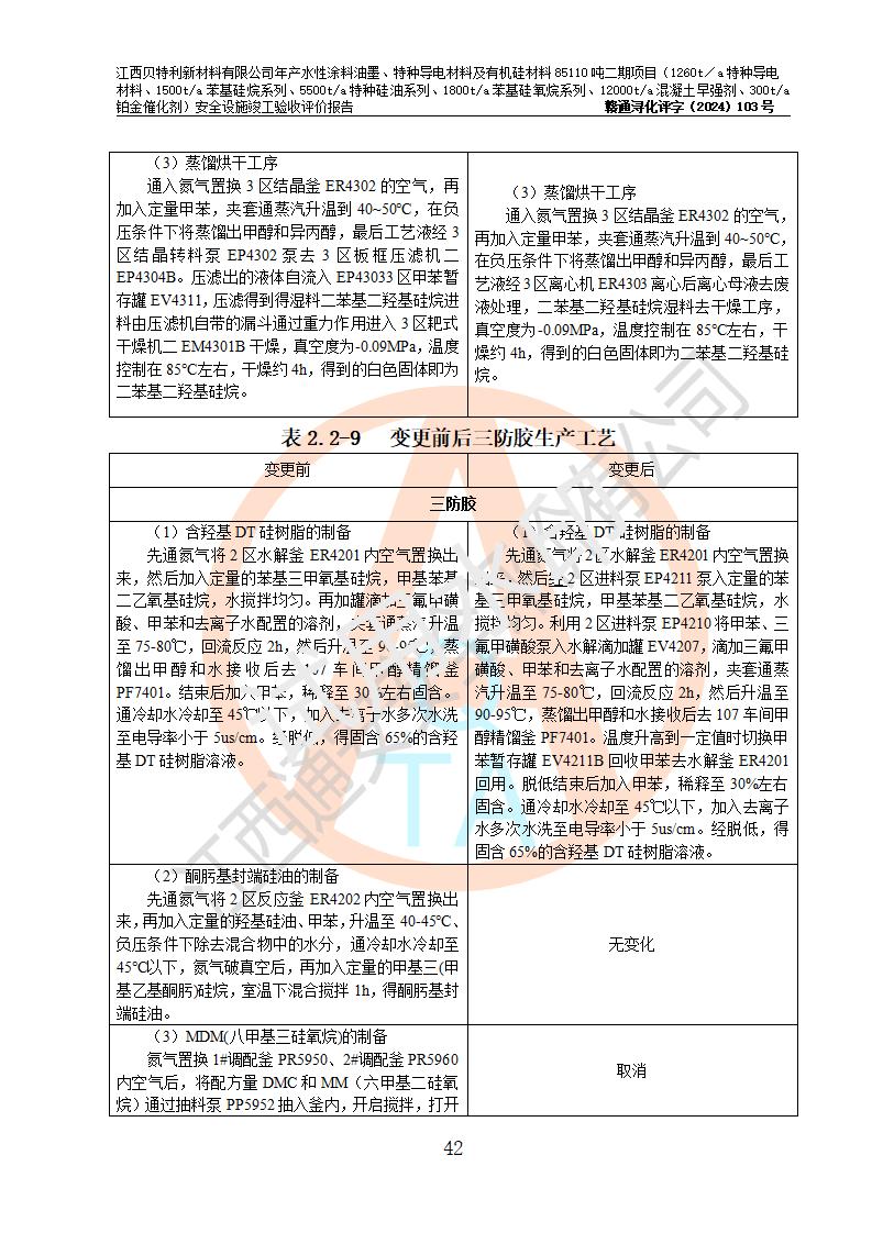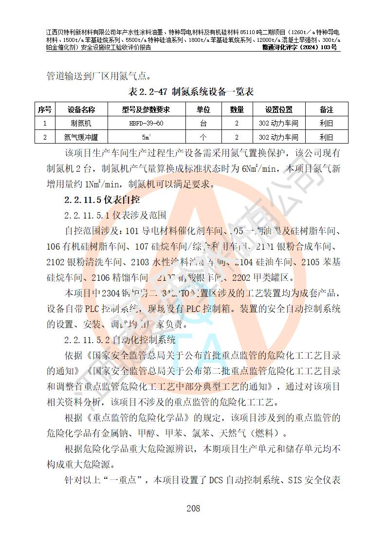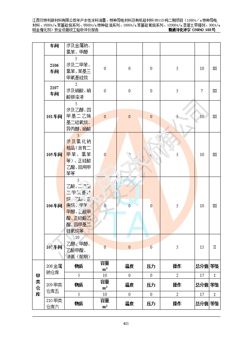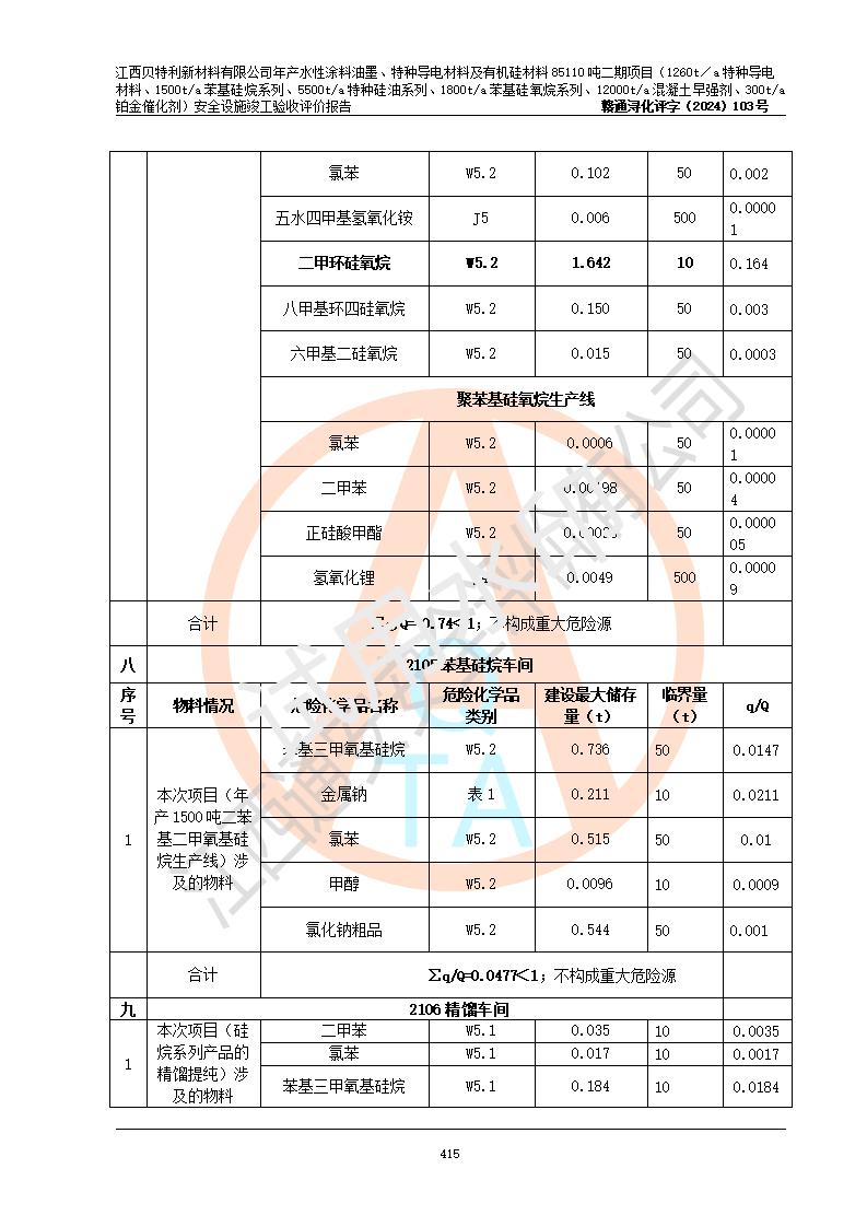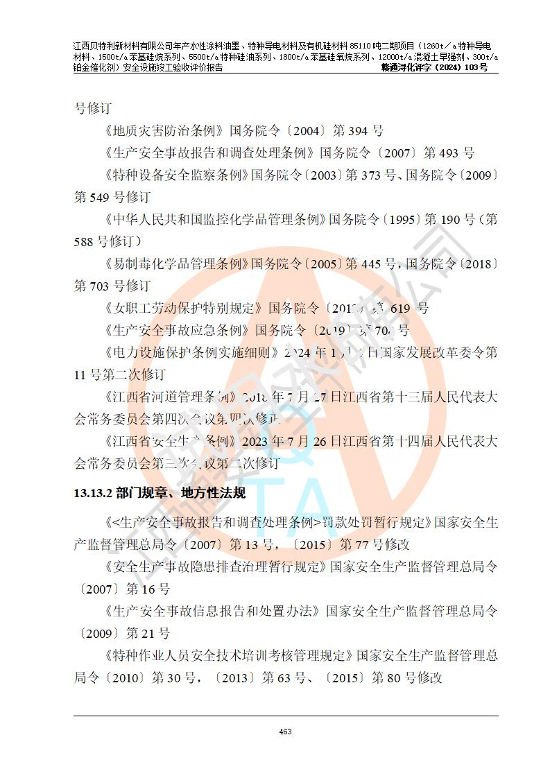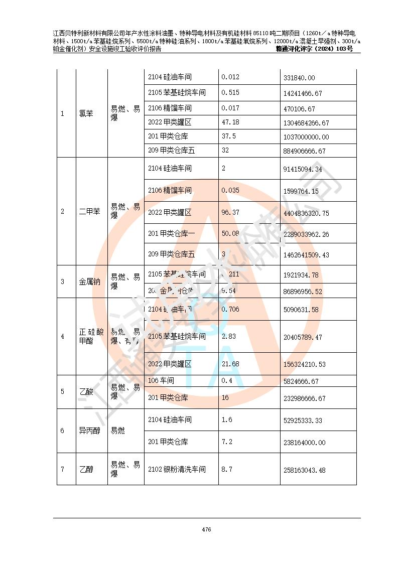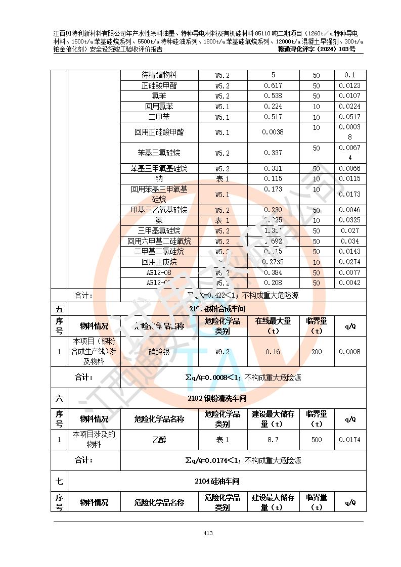 評價報告名稱 | 江西貝特利新材料有限公司年產(chǎn)水性涂料油墨、特種導電材料及有 機硅材料85110噸二期項目(1260t/a特種導電材料、1500t/a苯基硅烷系列、5500t/a特種硅油系列、1800t/a苯基硅氧烷系列、12000t/a混凝土早強劑、300t/a鉑金催化劑)安全設施竣工驗收評價報告 | |||||