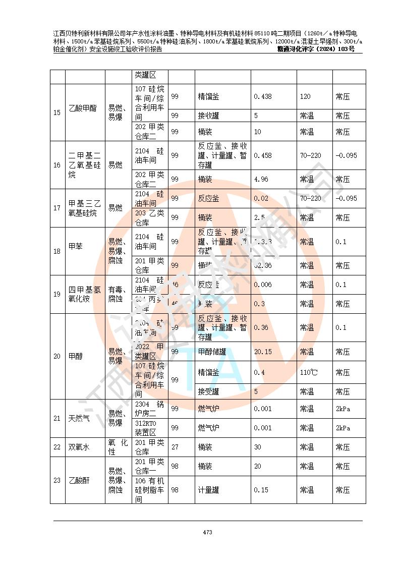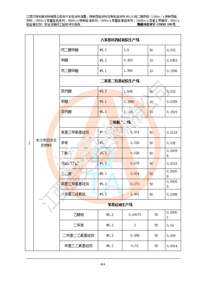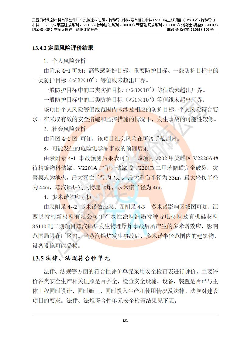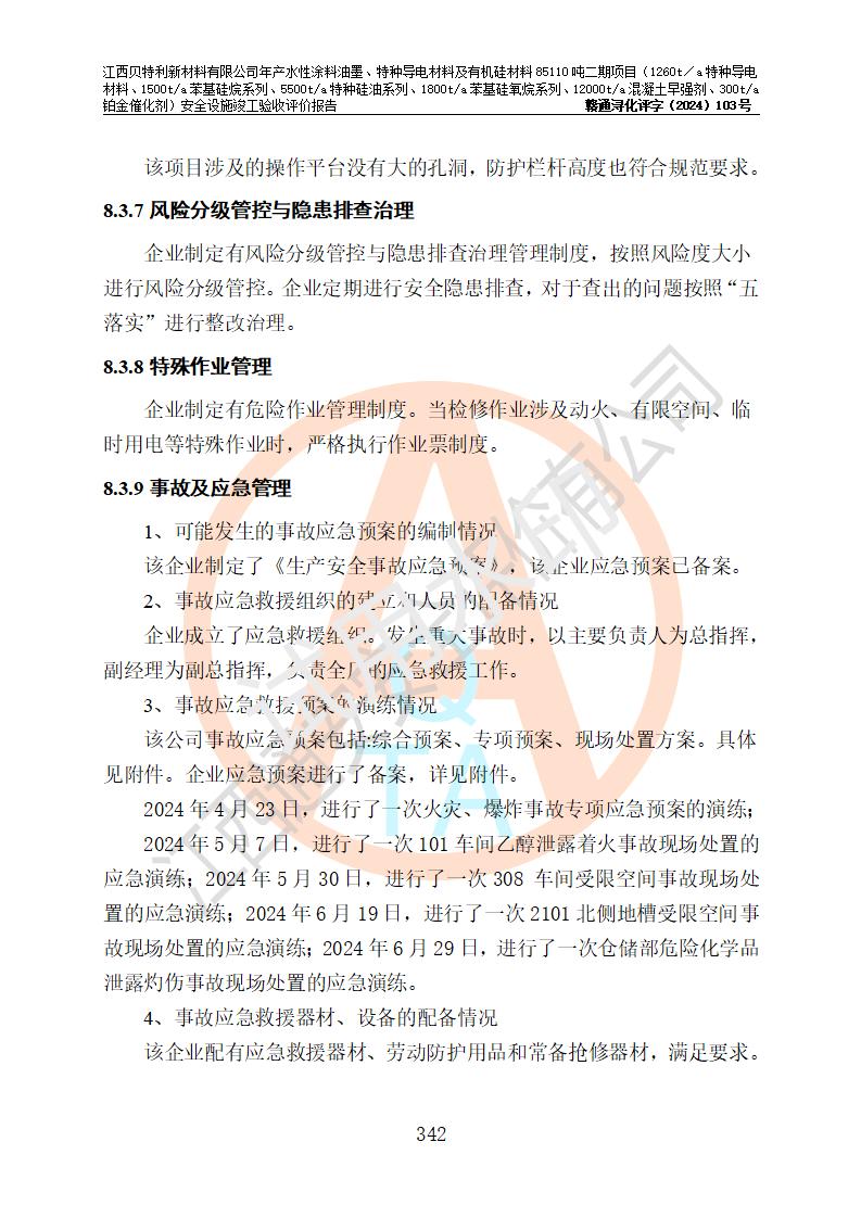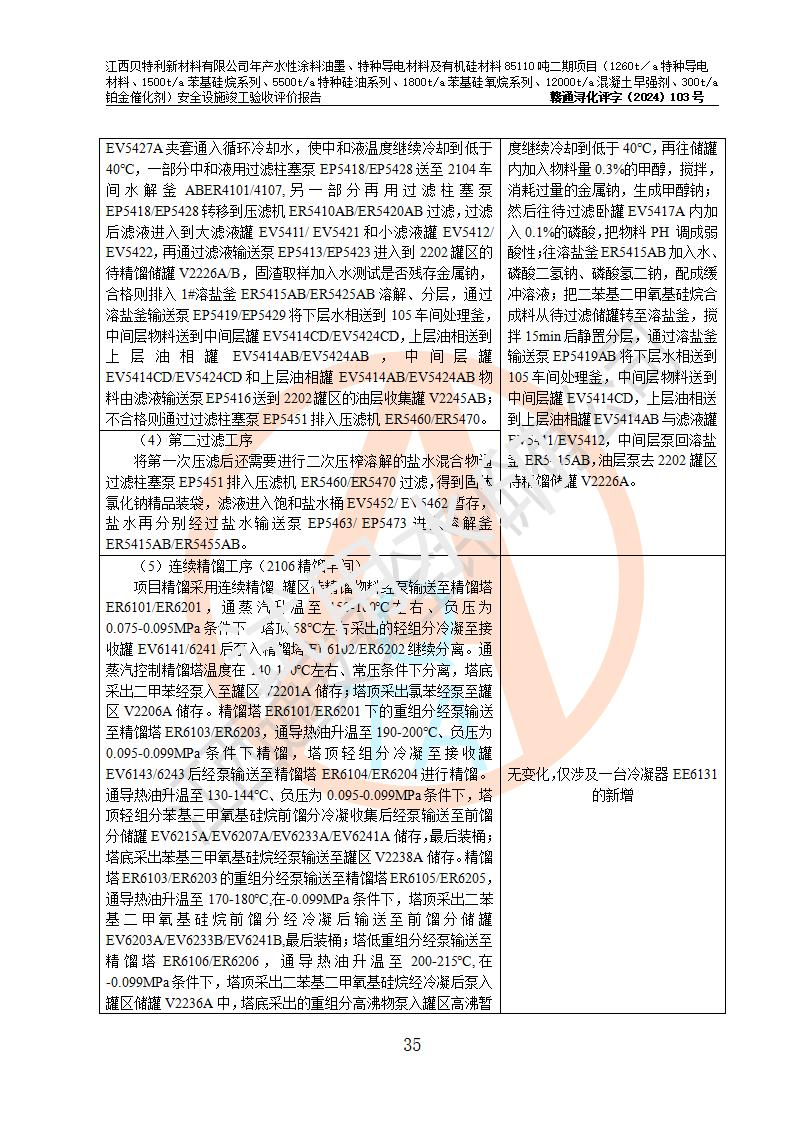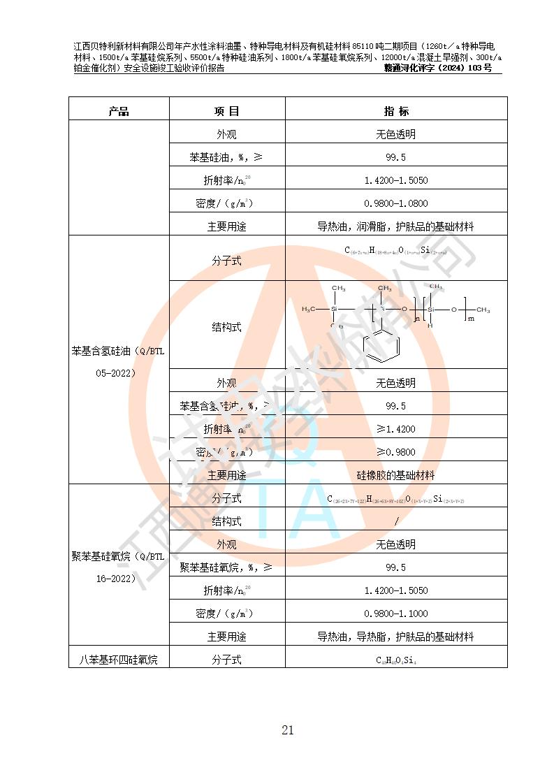 評價報告名稱 | 江西貝特利新材料有限公司年產(chǎn)水性涂料油墨、特種導電材料及有 機硅材料85110噸二期項目(1260t/a特種導電材料、1500t/a苯基硅烷系列、5500t/a特種硅油系列、1800t/a苯基硅氧烷系列、12000t/a混凝土早強劑、300t/a鉑金催化劑)安全設施竣工驗收評價報告 | |||||