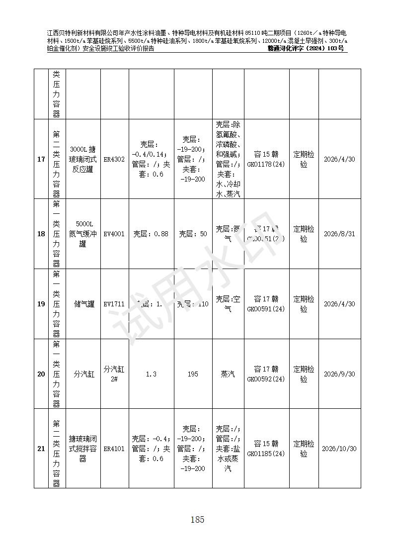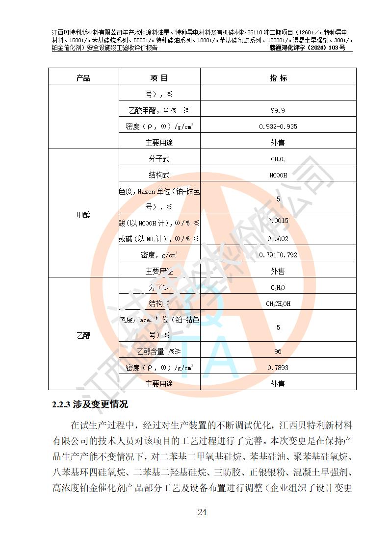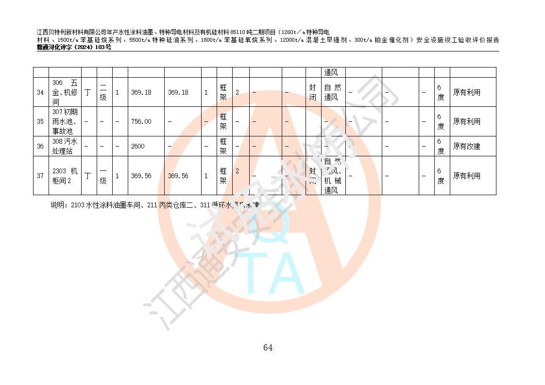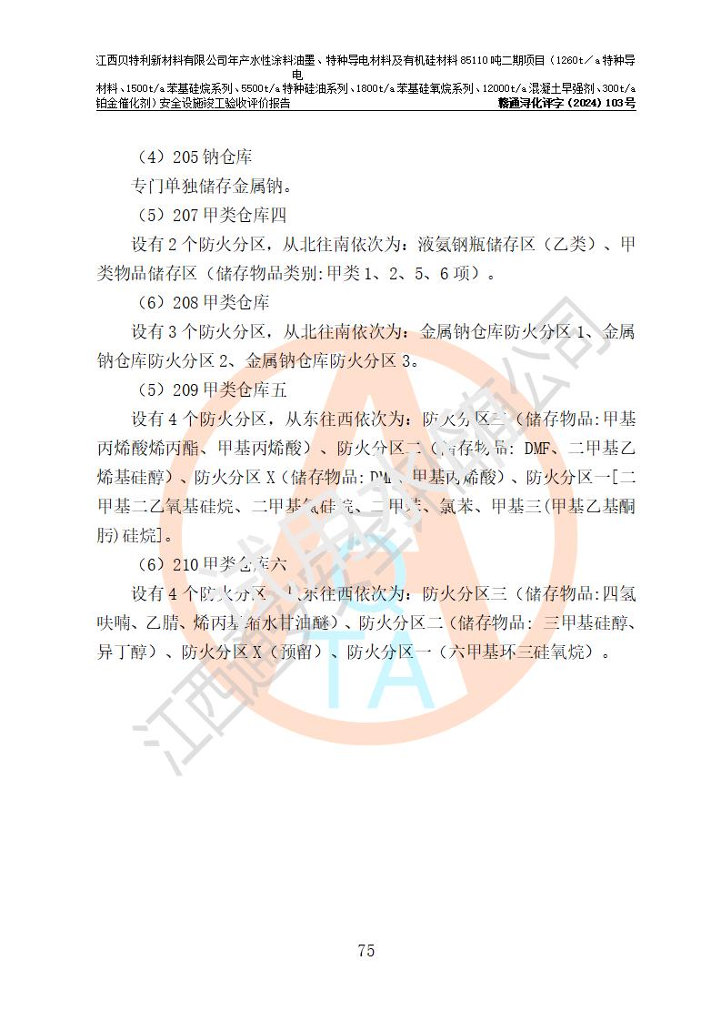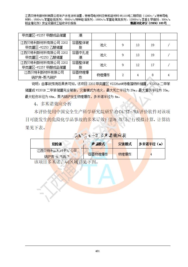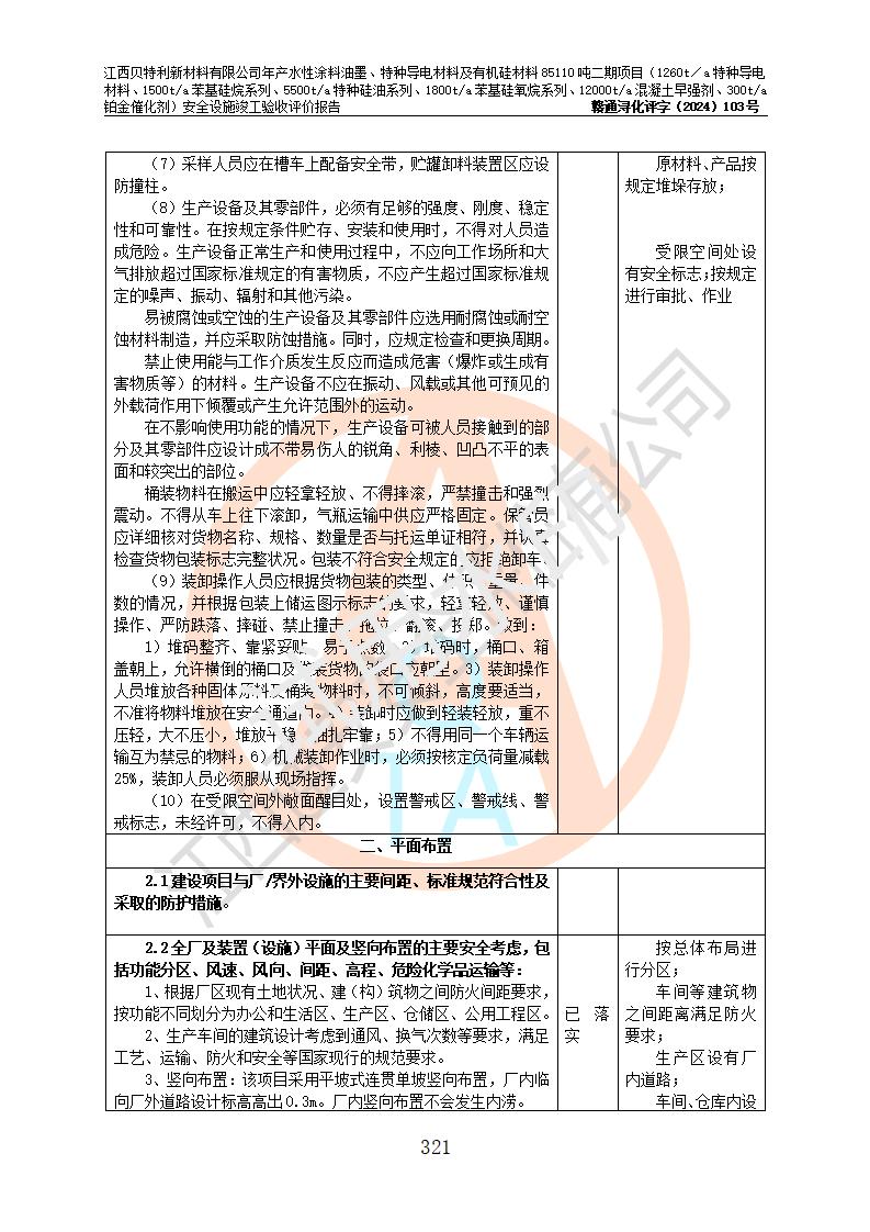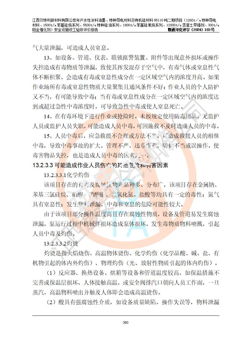 評價報告名稱 | 江西貝特利新材料有限公司年產(chǎn)水性涂料油墨、特種導電材料及有 機硅材料85110噸二期項目(1260t/a特種導電材料、1500t/a苯基硅烷系列、5500t/a特種硅油系列、1800t/a苯基硅氧烷系列、12000t/a混凝土早強劑、300t/a鉑金催化劑)安全設施竣工驗收評價報告 | |||||