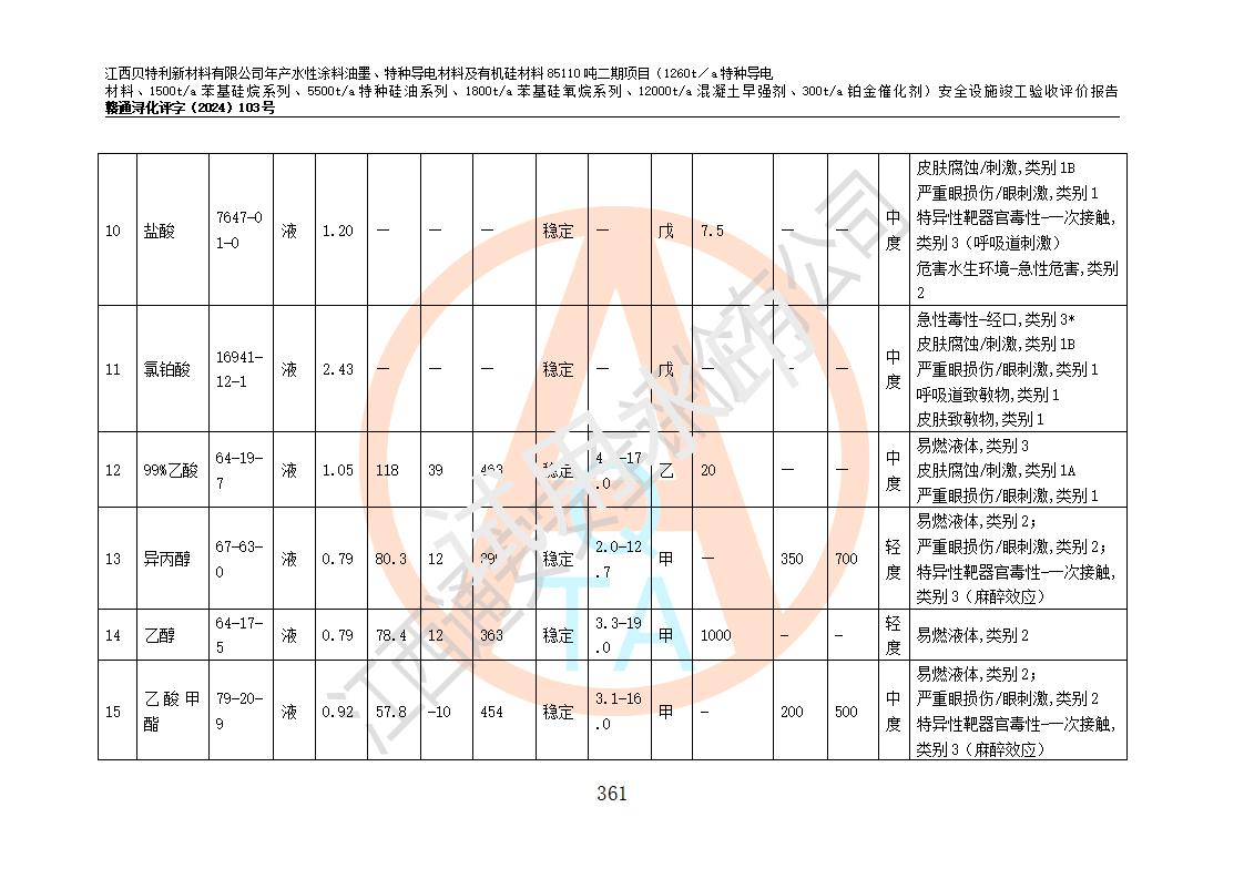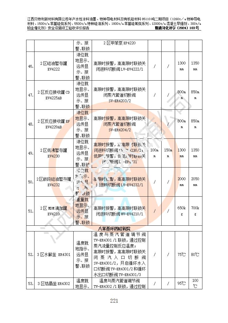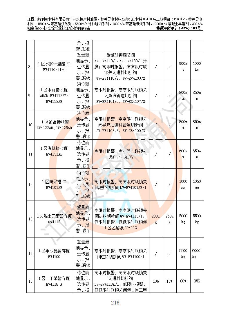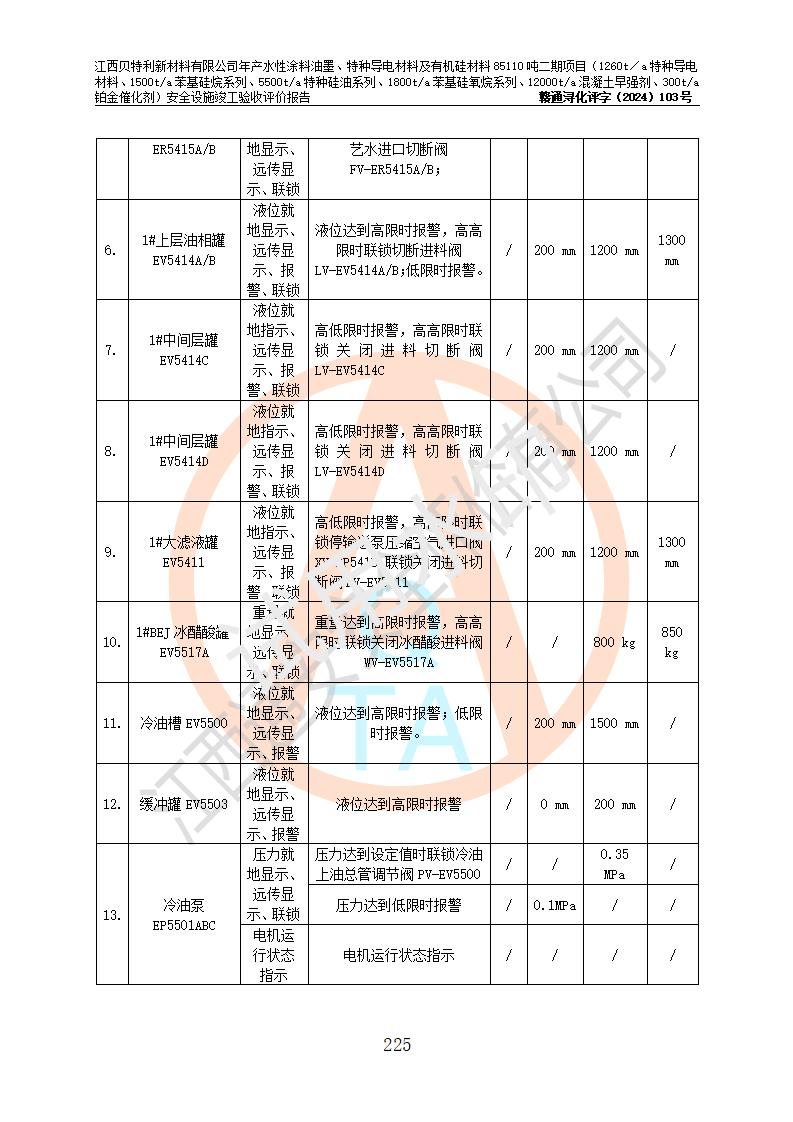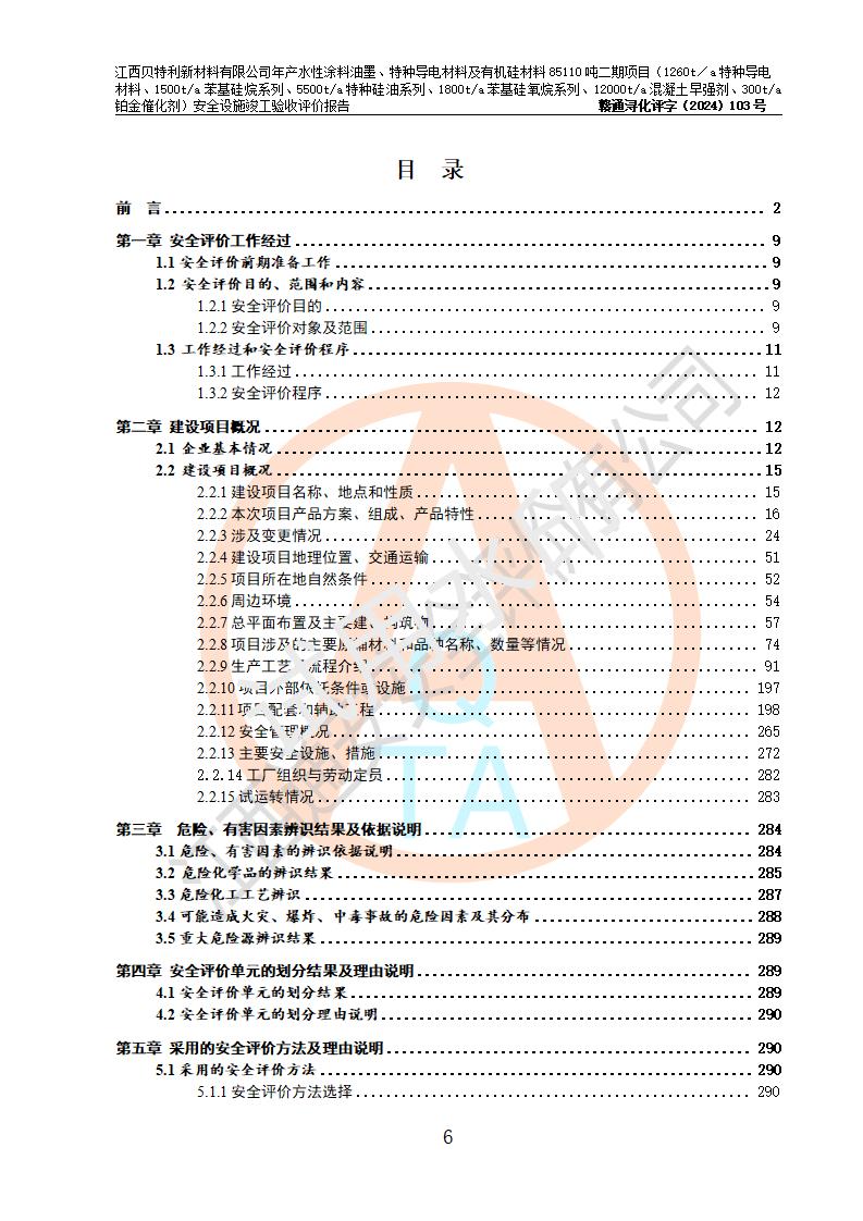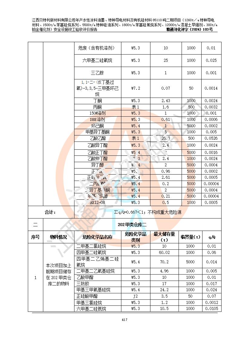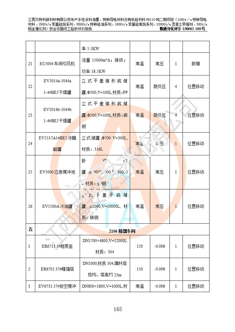 評價報告名稱 | 江西貝特利新材料有限公司年產(chǎn)水性涂料油墨、特種導電材料及有 機硅材料85110噸二期項目(1260t/a特種導電材料、1500t/a苯基硅烷系列、5500t/a特種硅油系列、1800t/a苯基硅氧烷系列、12000t/a混凝土早強劑、300t/a鉑金催化劑)安全設施竣工驗收評價報告 | |||||