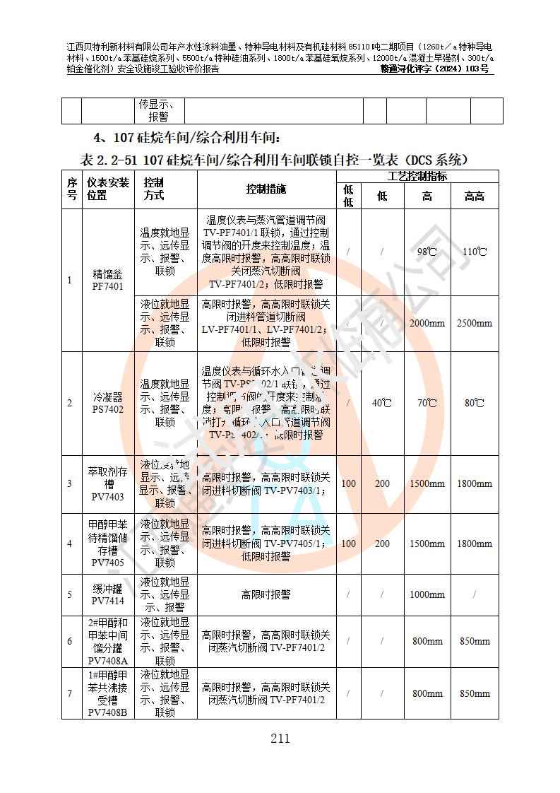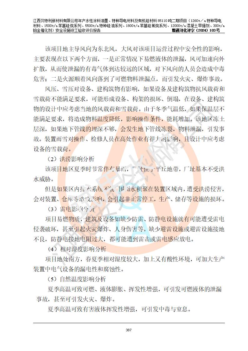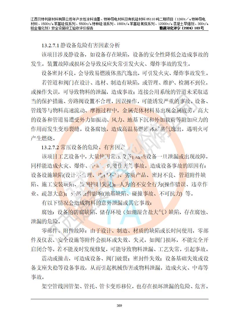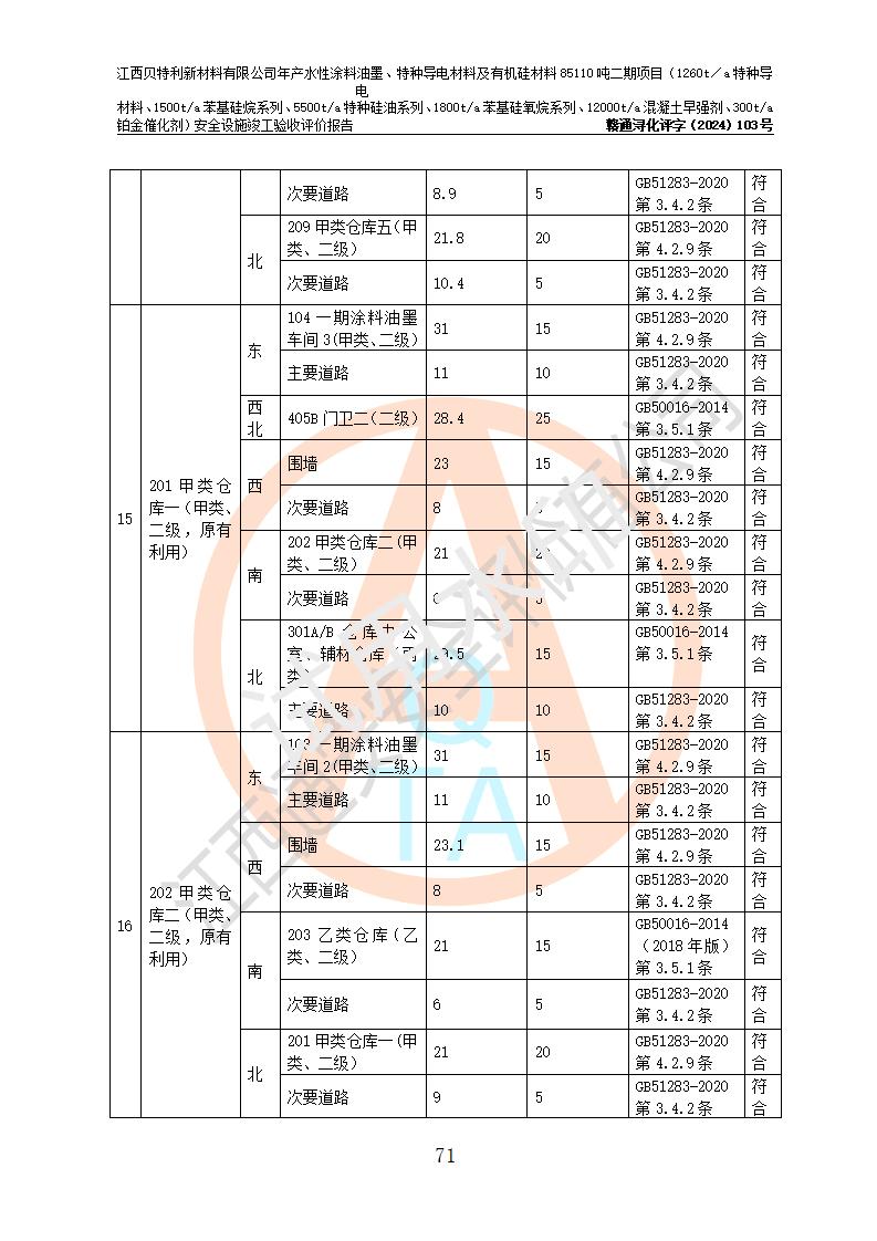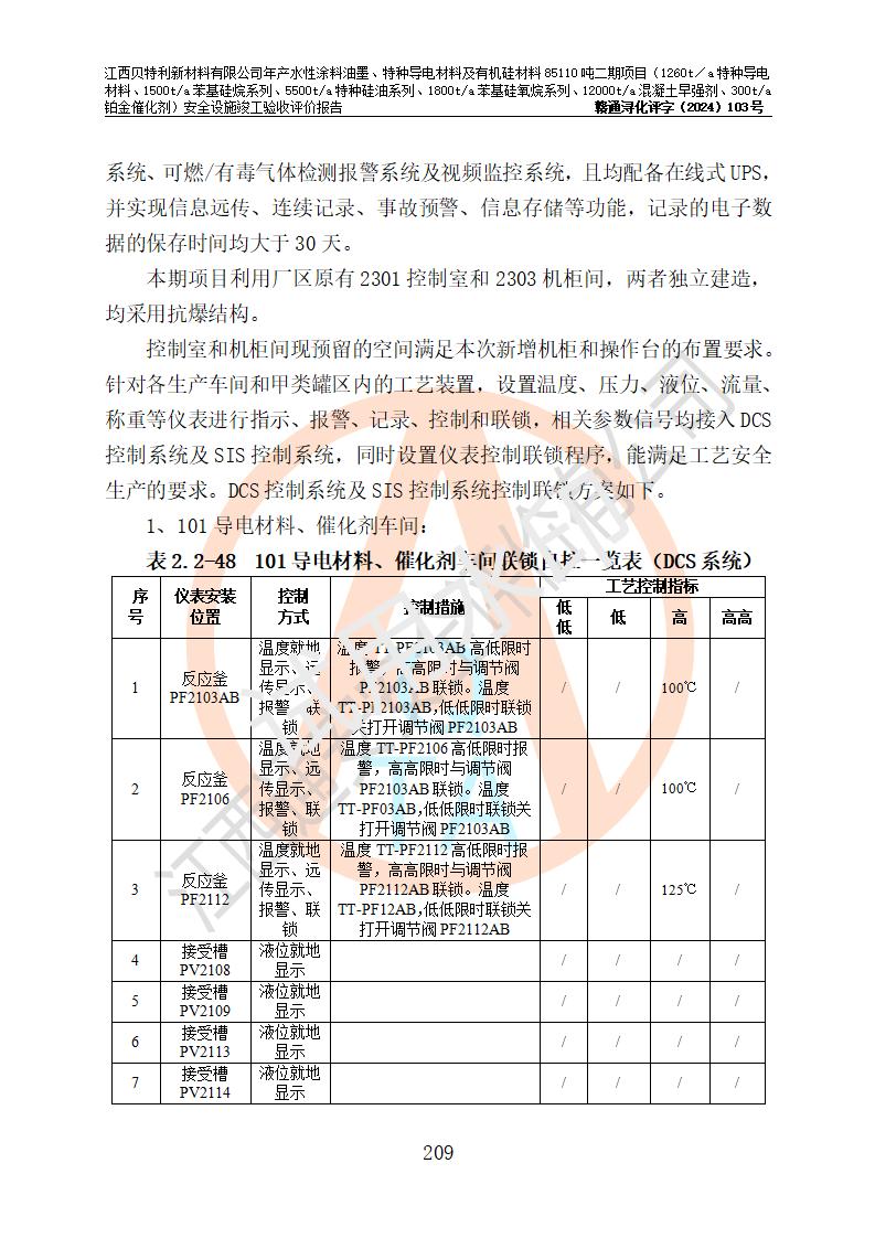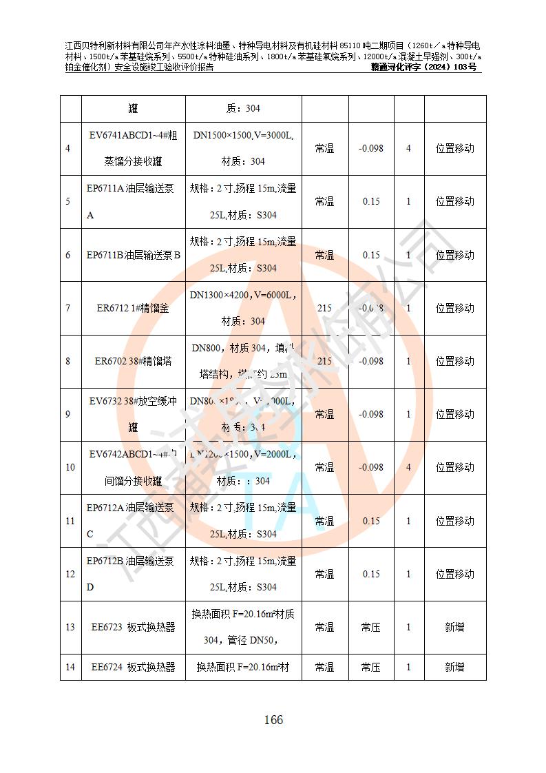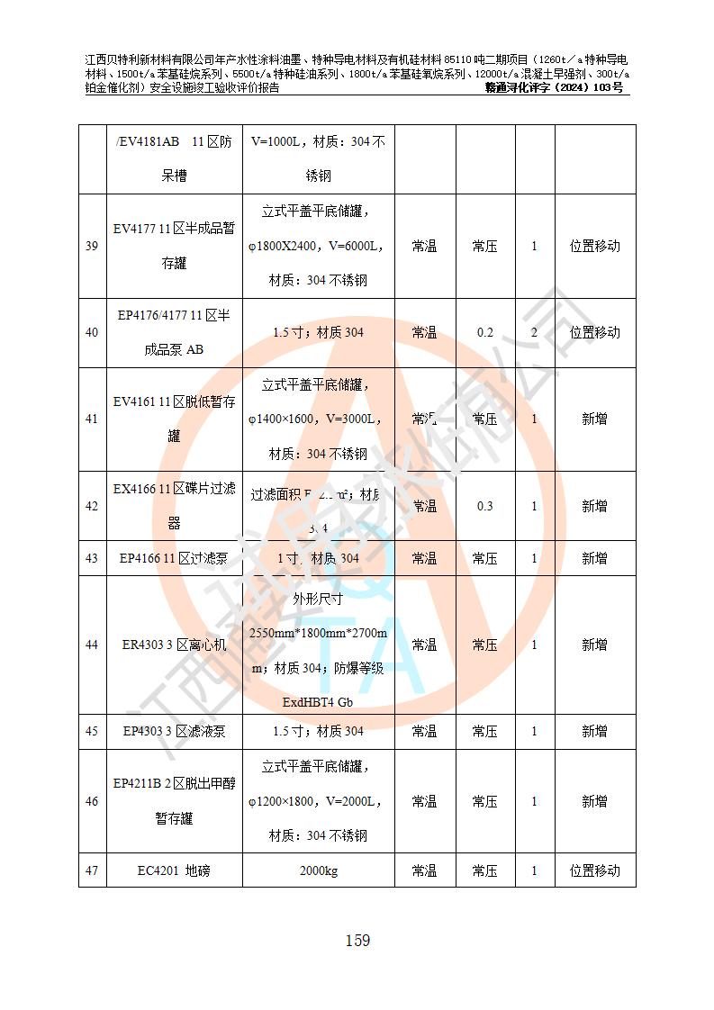 評價報告名稱 | 江西貝特利新材料有限公司年產(chǎn)水性涂料油墨、特種導電材料及有 機硅材料85110噸二期項目(1260t/a特種導電材料、1500t/a苯基硅烷系列、5500t/a特種硅油系列、1800t/a苯基硅氧烷系列、12000t/a混凝土早強劑、300t/a鉑金催化劑)安全設施竣工驗收評價報告 | |||||