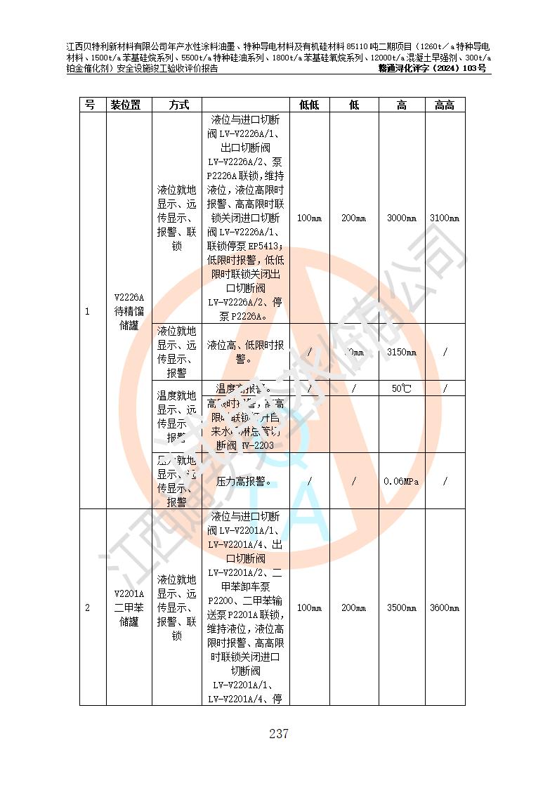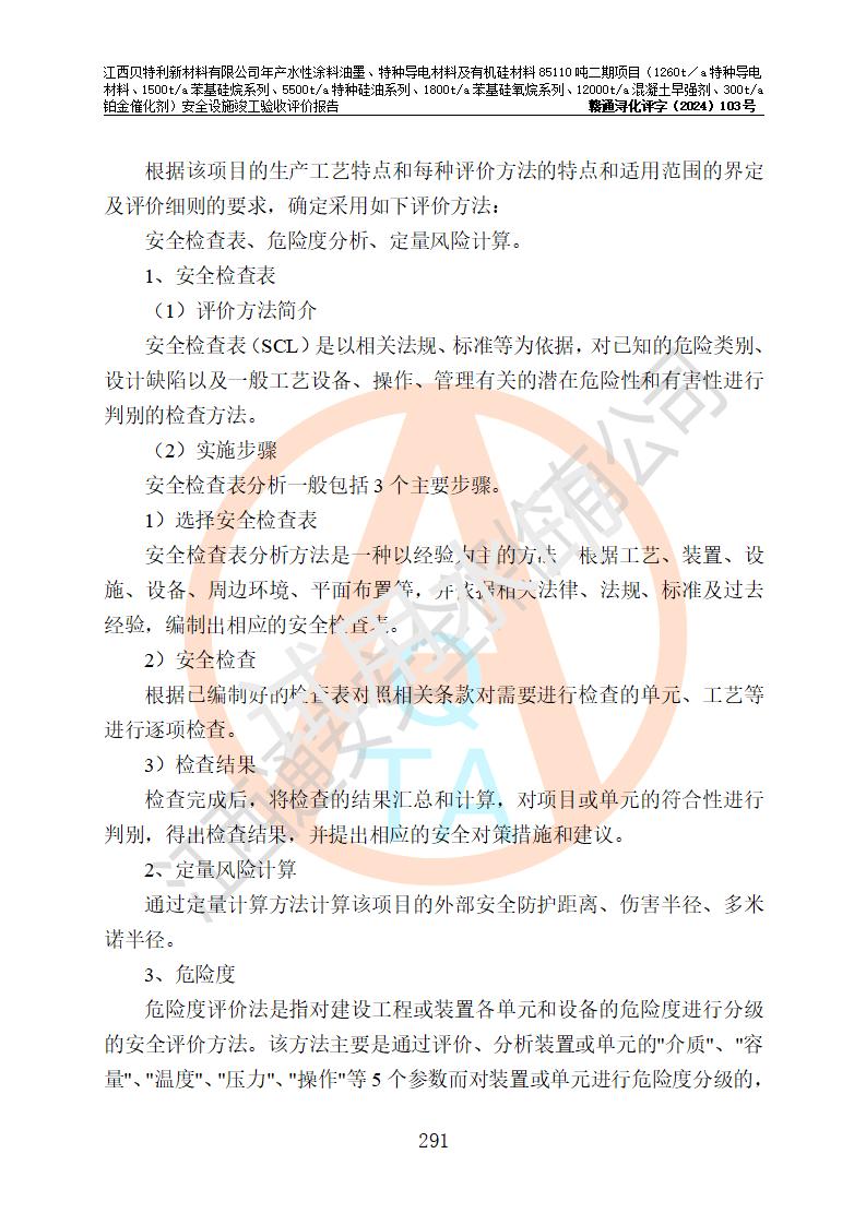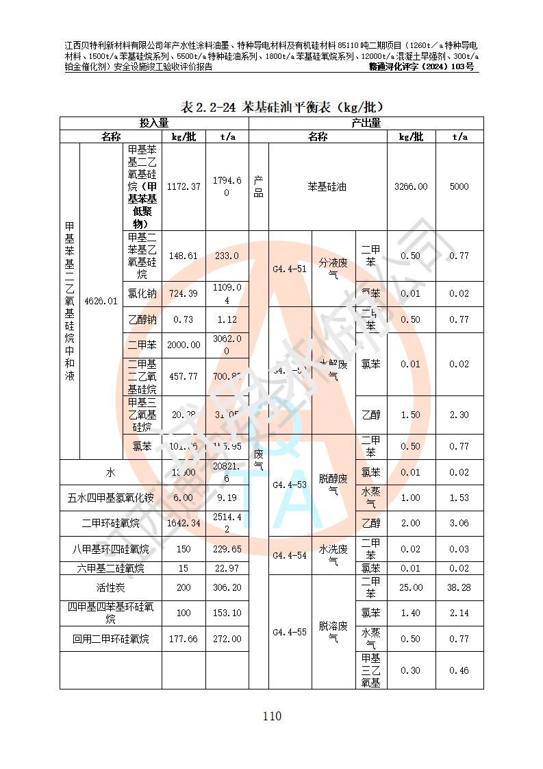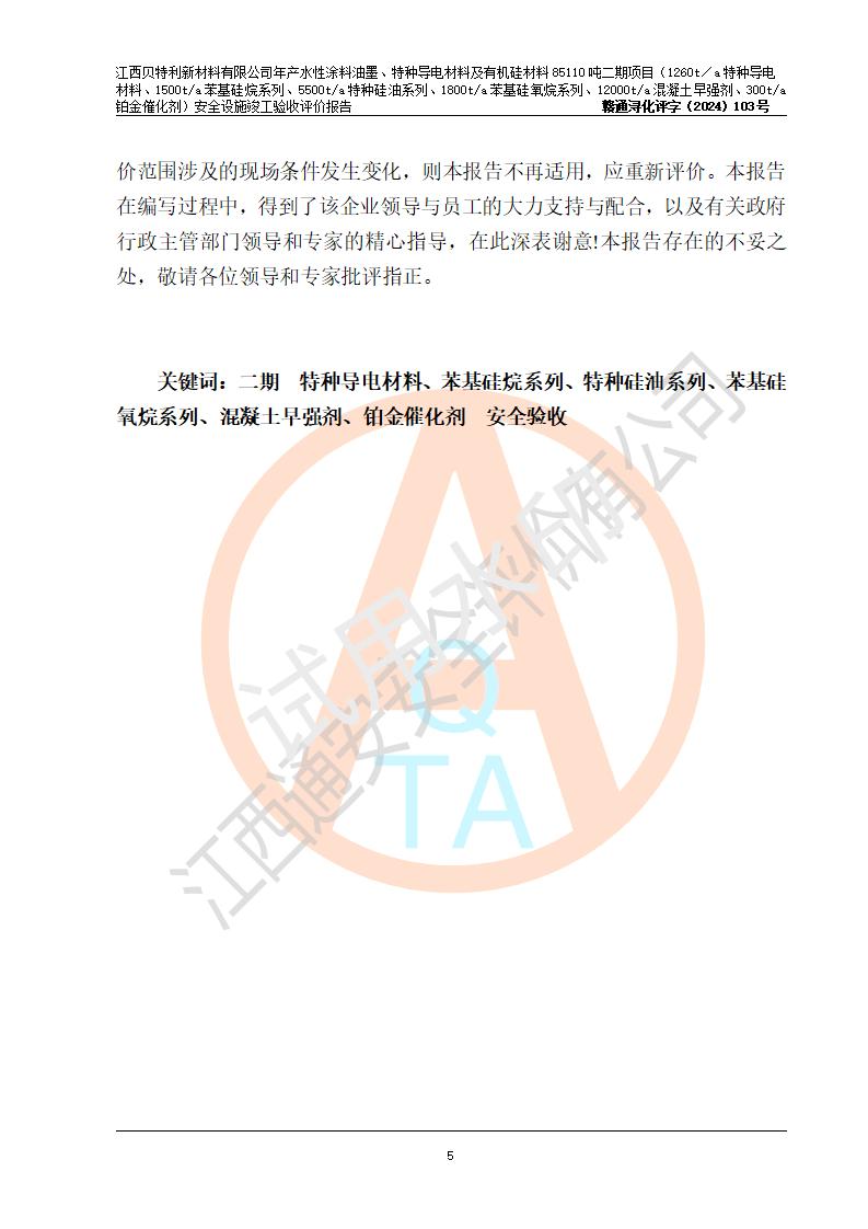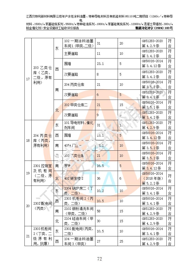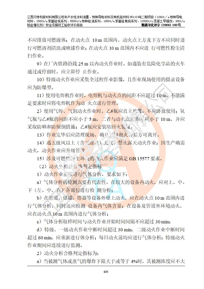評價報告名稱 | 江西貝特利新材料有限公司年產(chǎn)水性涂料油墨、特種導電材料及有 機硅材料85110噸二期項目(1260t/a特種導電材料、1500t/a苯基硅烷系列、5500t/a特種硅油系列、1800t/a苯基硅氧烷系列、12000t/a混凝土早強劑、300t/a鉑金催化劑)安全設施竣工驗收評價報告 | |||||