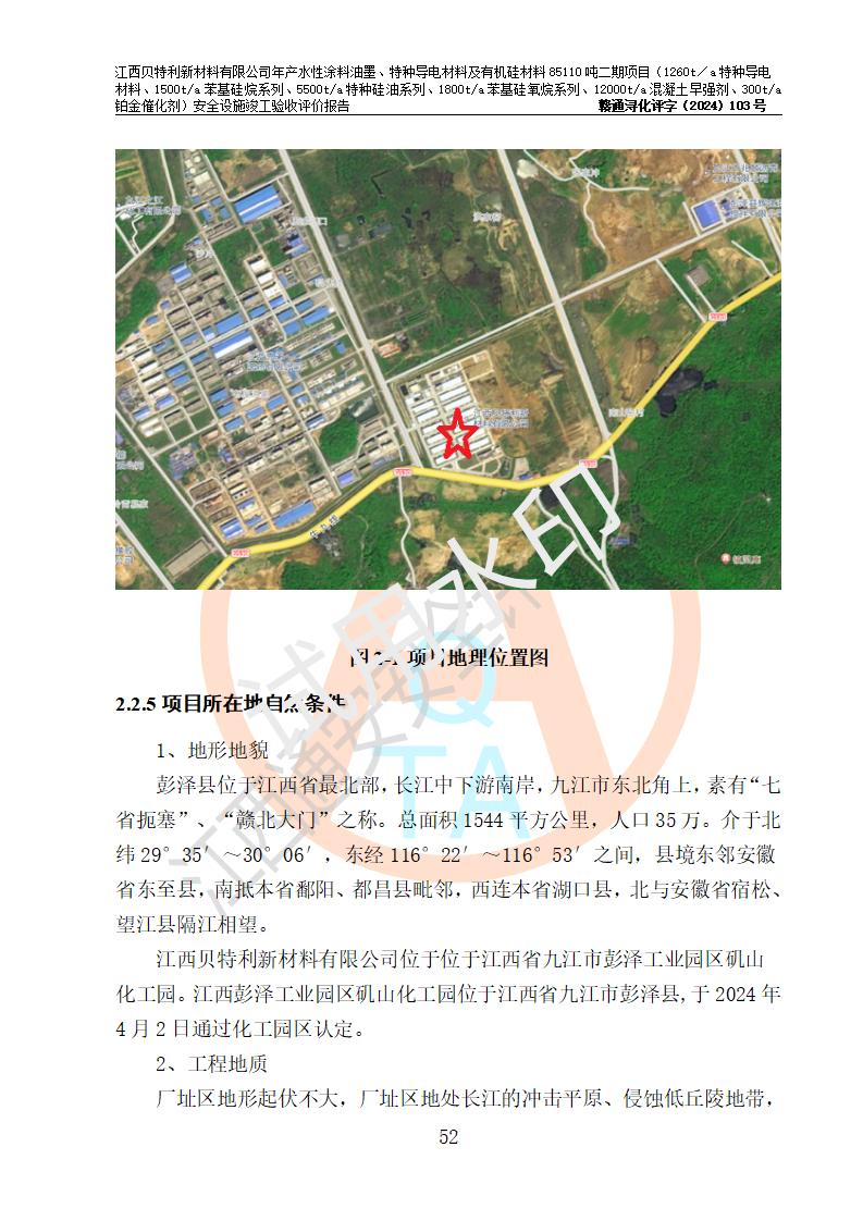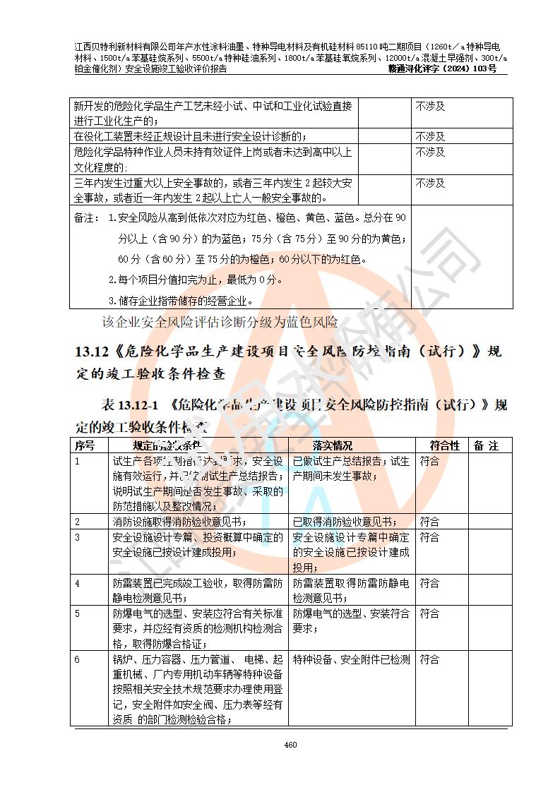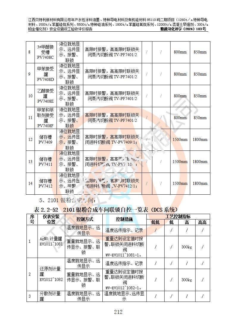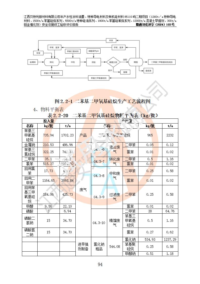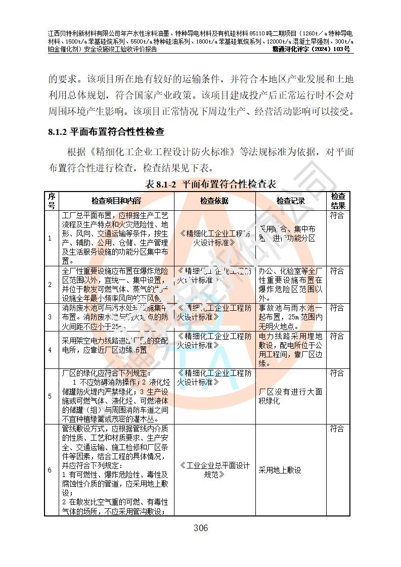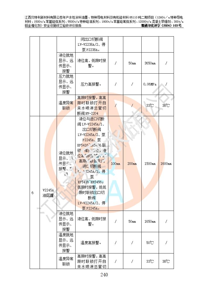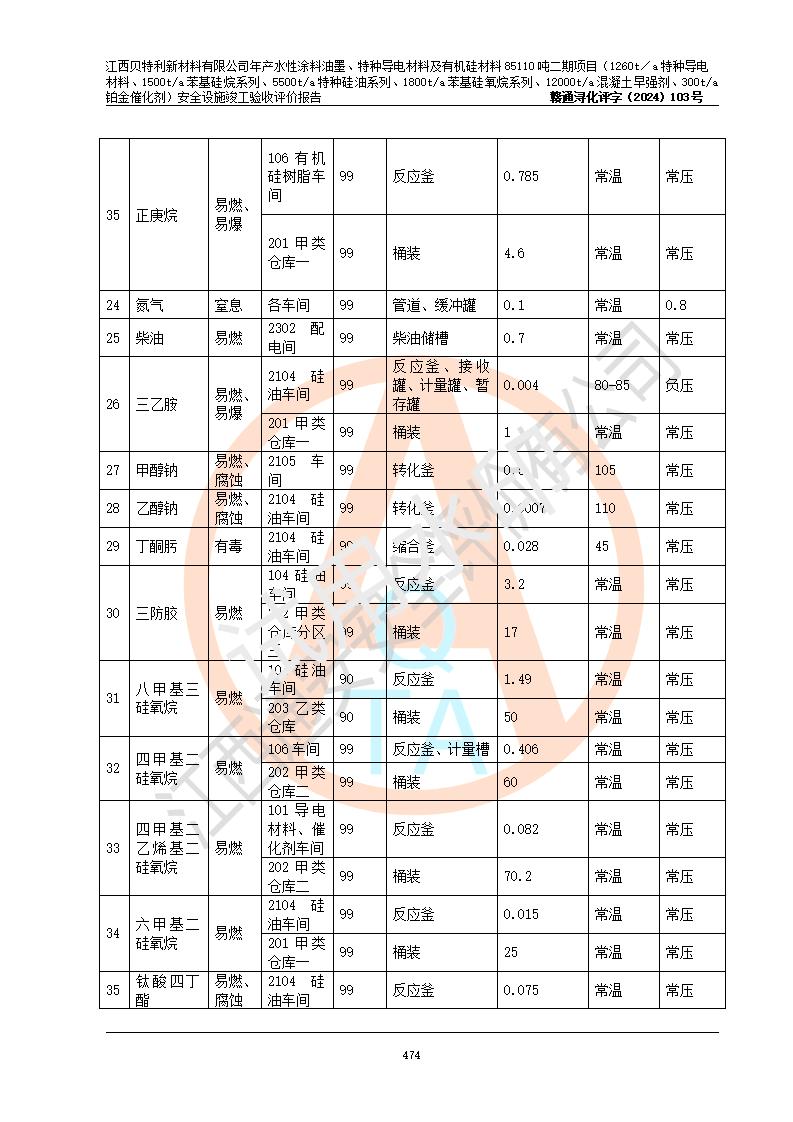 評價報告名稱 | 江西貝特利新材料有限公司年產(chǎn)水性涂料油墨、特種導電材料及有 機硅材料85110噸二期項目(1260t/a特種導電材料、1500t/a苯基硅烷系列、5500t/a特種硅油系列、1800t/a苯基硅氧烷系列、12000t/a混凝土早強劑、300t/a鉑金催化劑)安全設施竣工驗收評價報告 | |||||