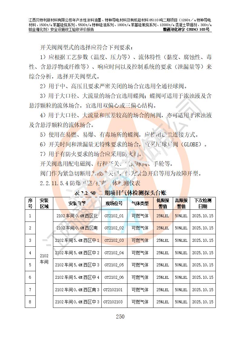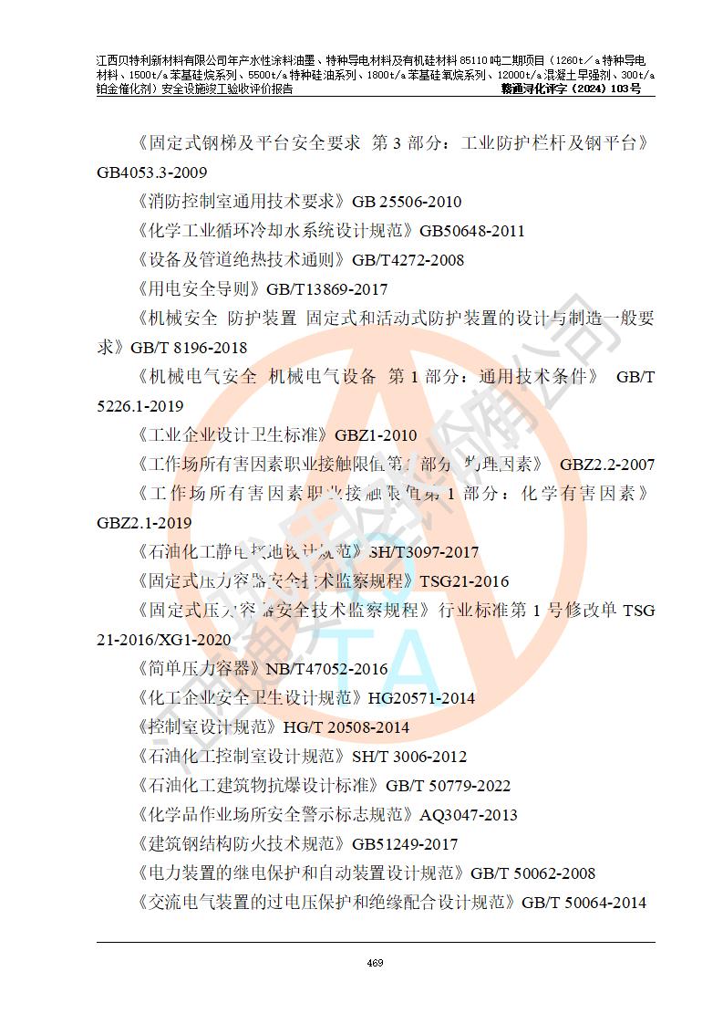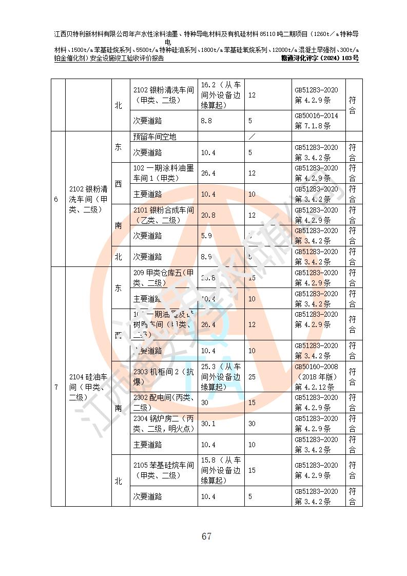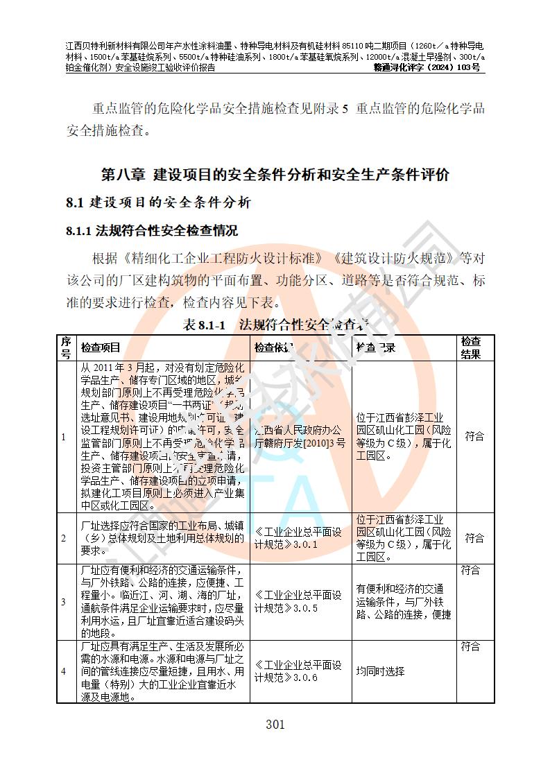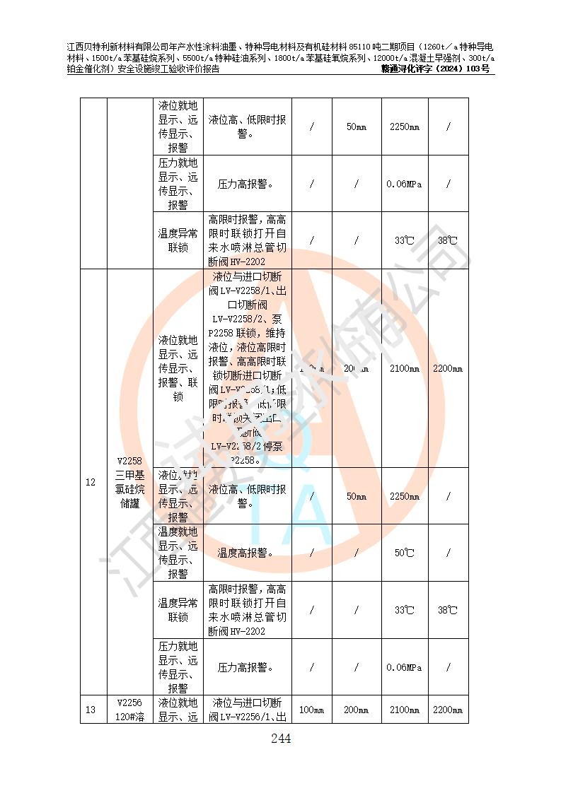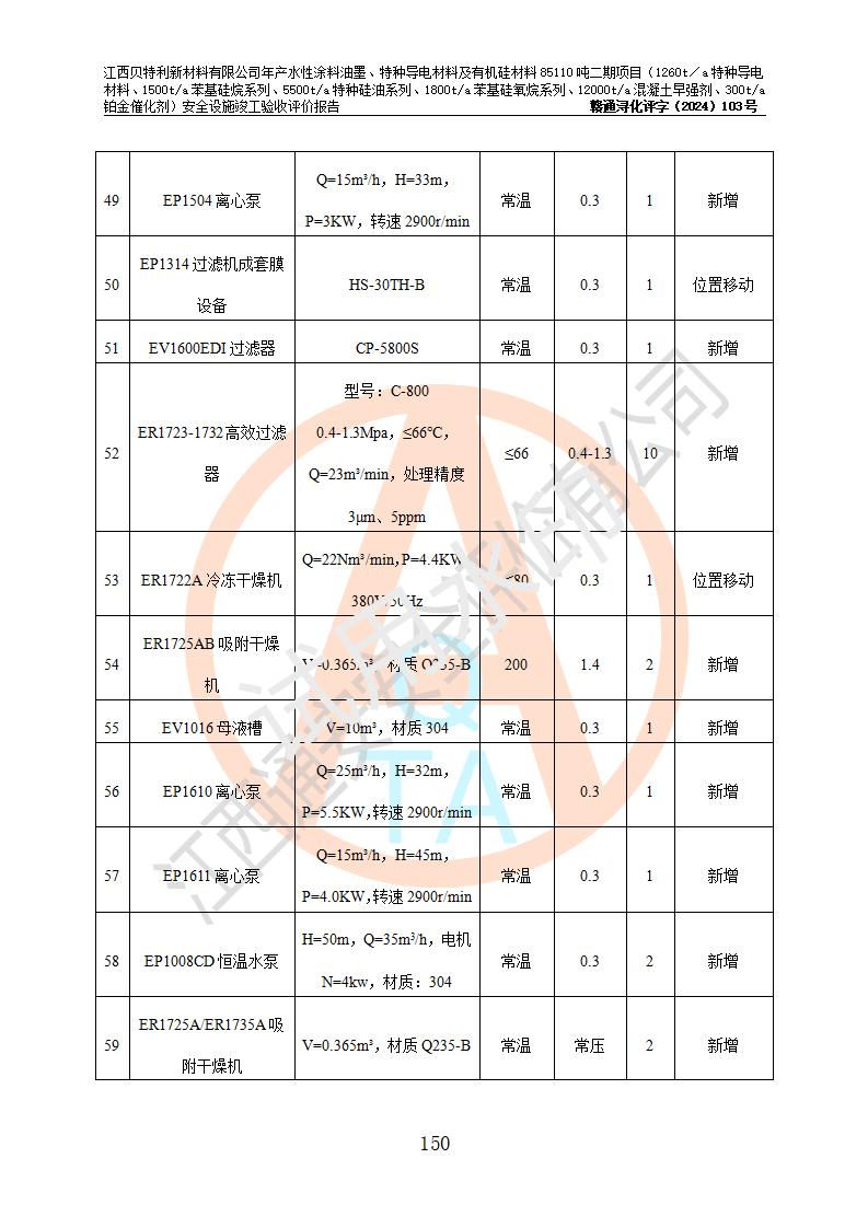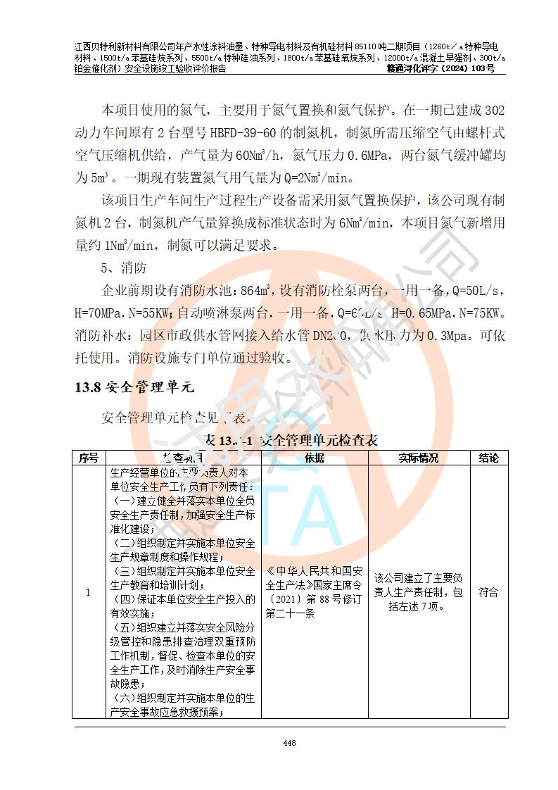 評價報告名稱 | 江西貝特利新材料有限公司年產(chǎn)水性涂料油墨、特種導電材料及有 機硅材料85110噸二期項目(1260t/a特種導電材料、1500t/a苯基硅烷系列、5500t/a特種硅油系列、1800t/a苯基硅氧烷系列、12000t/a混凝土早強劑、300t/a鉑金催化劑)安全設施竣工驗收評價報告 | |||||
