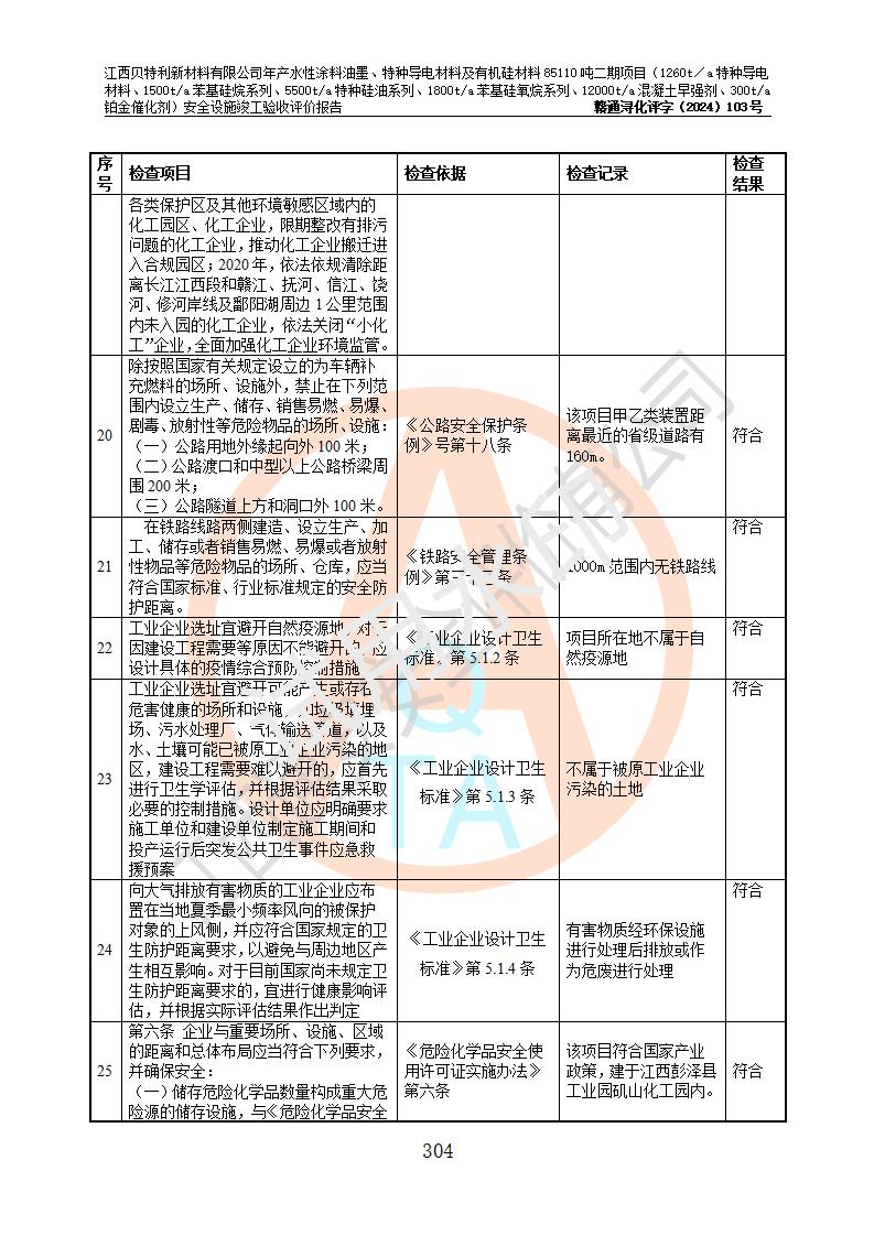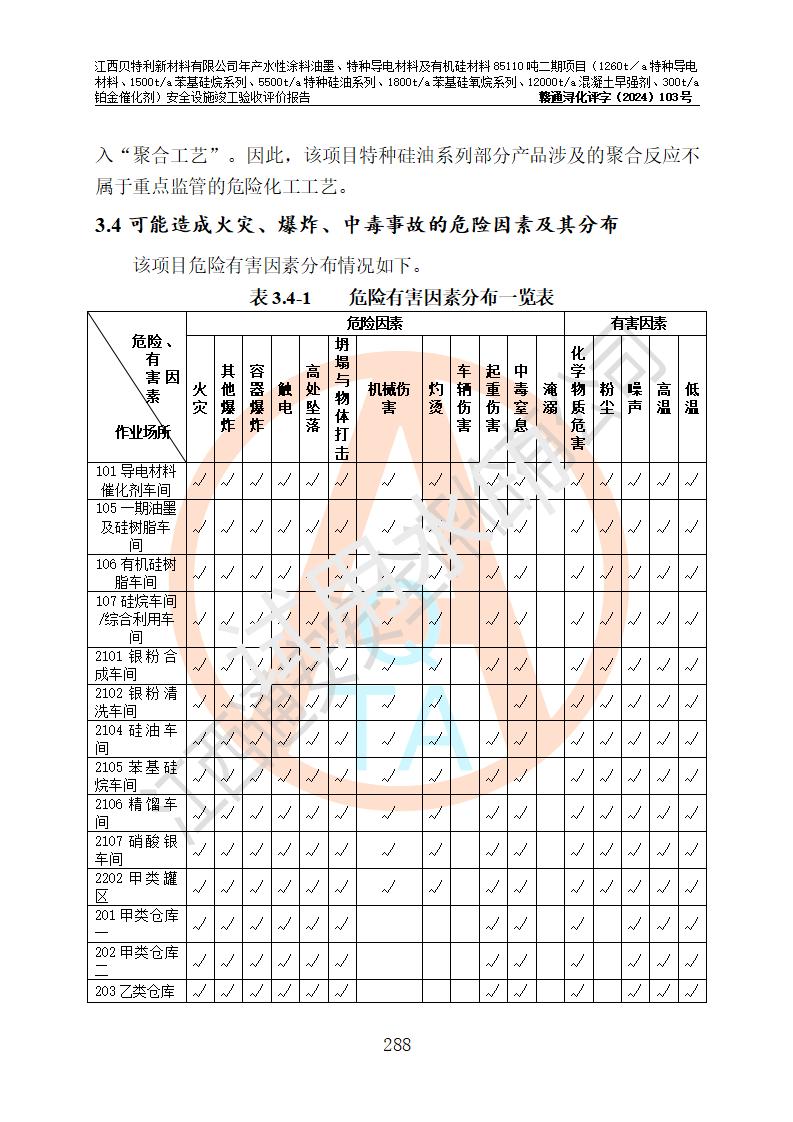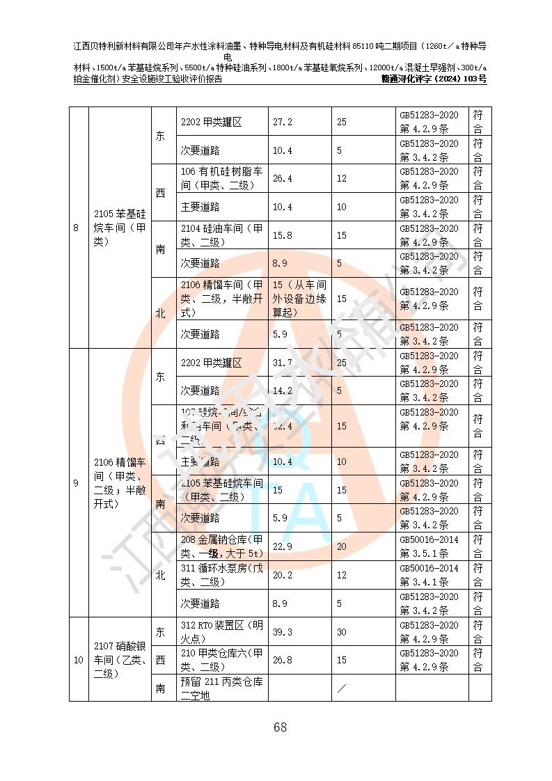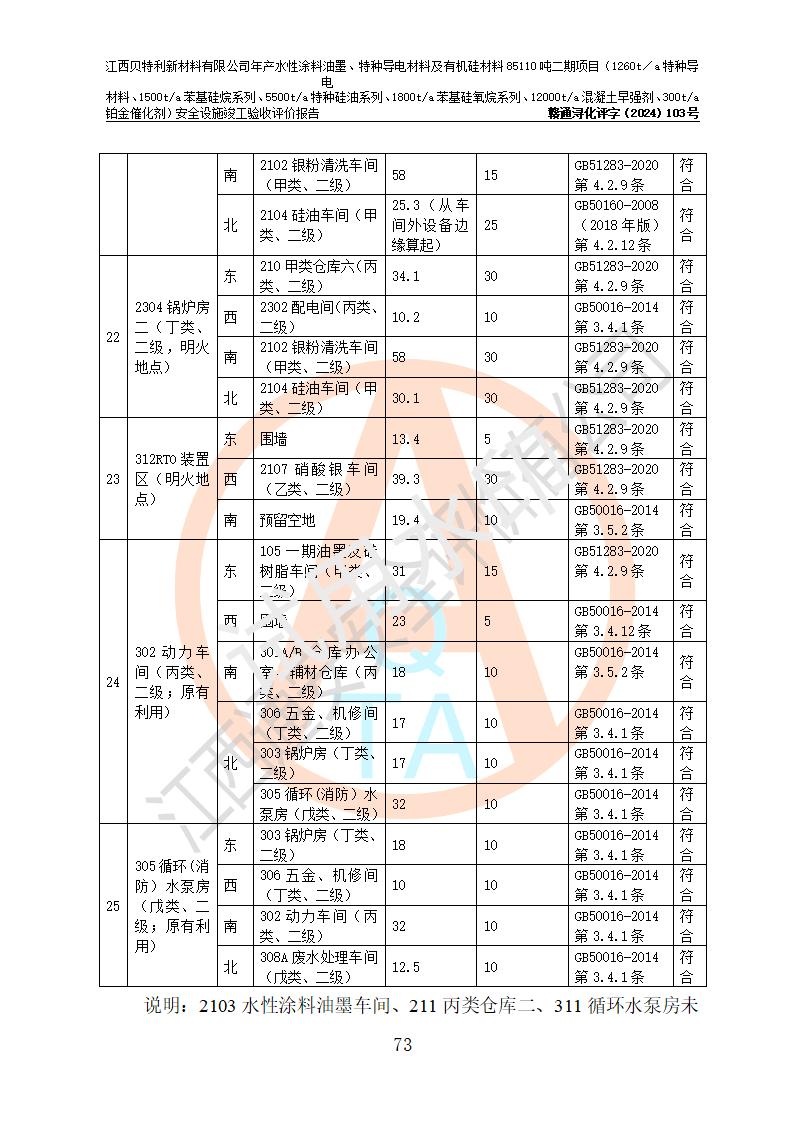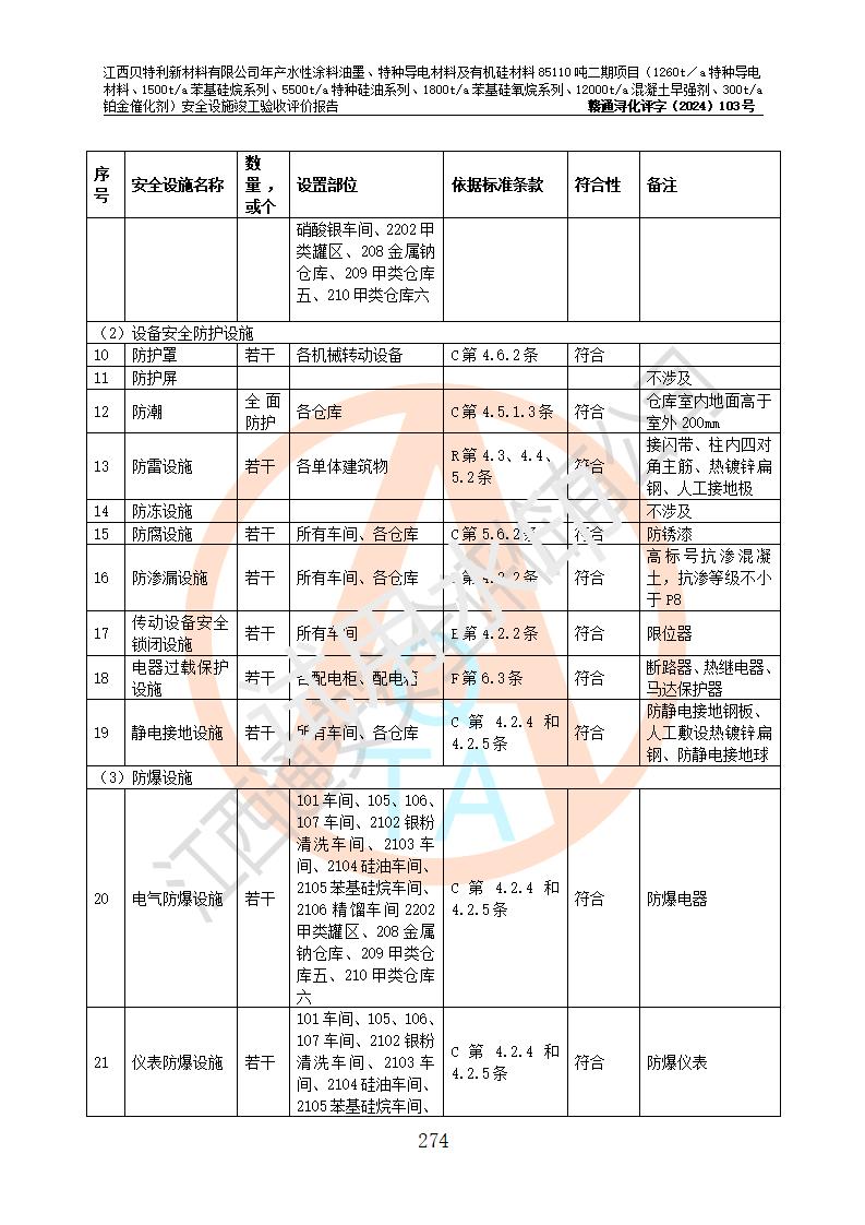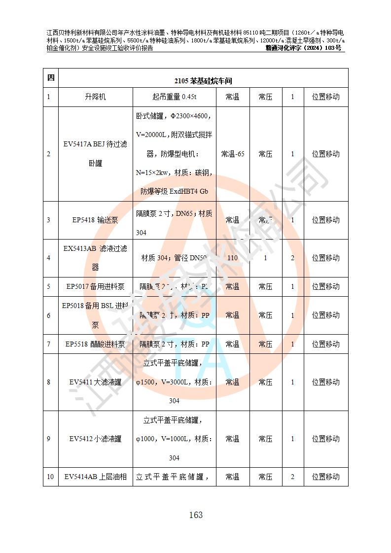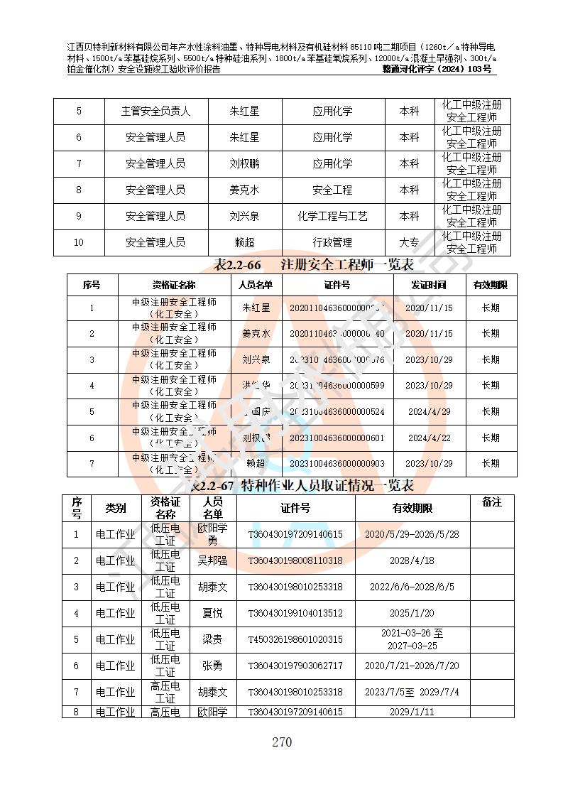 評價報告名稱 | 江西貝特利新材料有限公司年產(chǎn)水性涂料油墨、特種導電材料及有 機硅材料85110噸二期項目(1260t/a特種導電材料、1500t/a苯基硅烷系列、5500t/a特種硅油系列、1800t/a苯基硅氧烷系列、12000t/a混凝土早強劑、300t/a鉑金催化劑)安全設施竣工驗收評價報告 | |||||