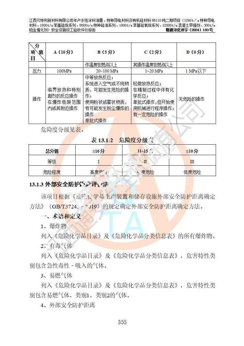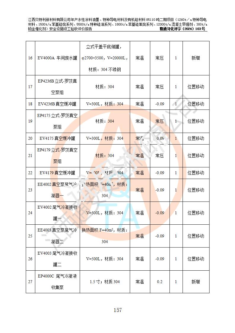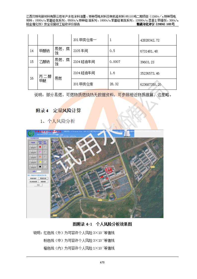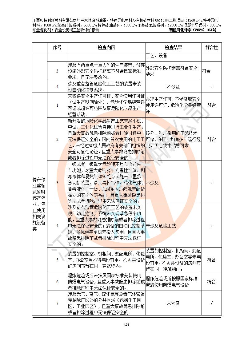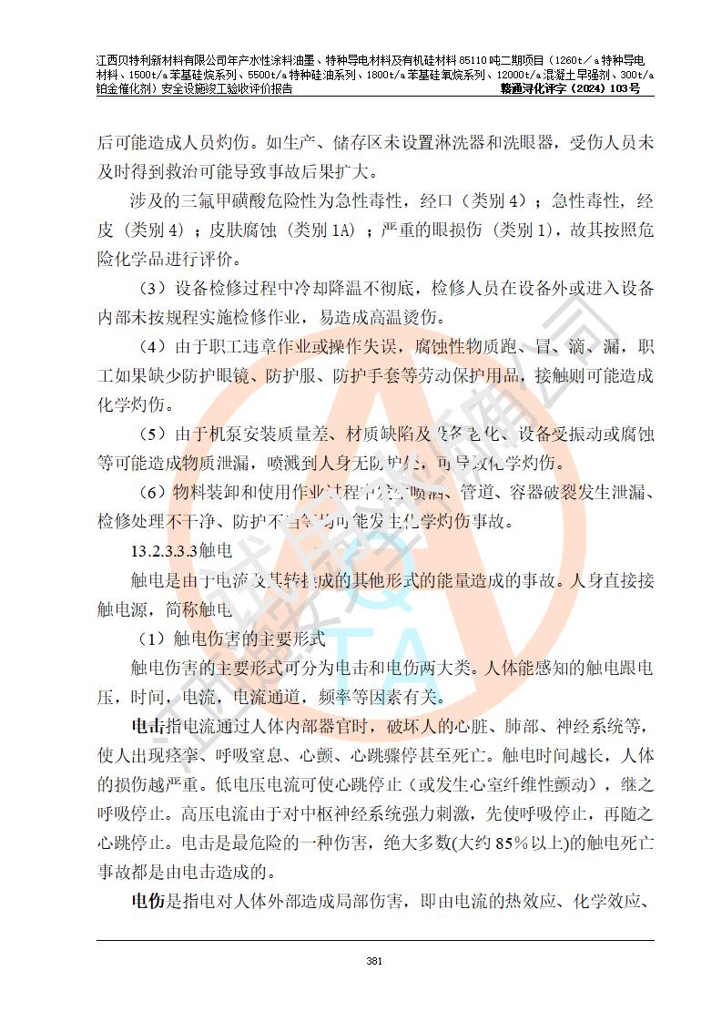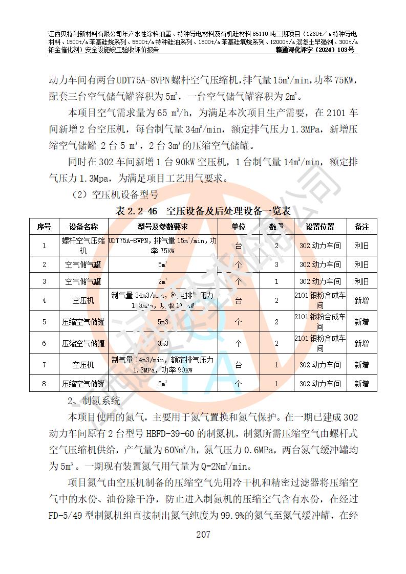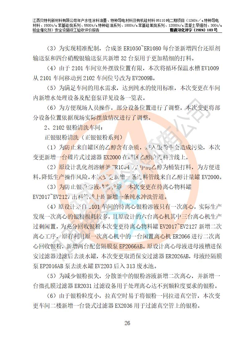 評價報告名稱 | 江西貝特利新材料有限公司年產(chǎn)水性涂料油墨、特種導電材料及有 機硅材料85110噸二期項目(1260t/a特種導電材料、1500t/a苯基硅烷系列、5500t/a特種硅油系列、1800t/a苯基硅氧烷系列、12000t/a混凝土早強劑、300t/a鉑金催化劑)安全設施竣工驗收評價報告 | |||||