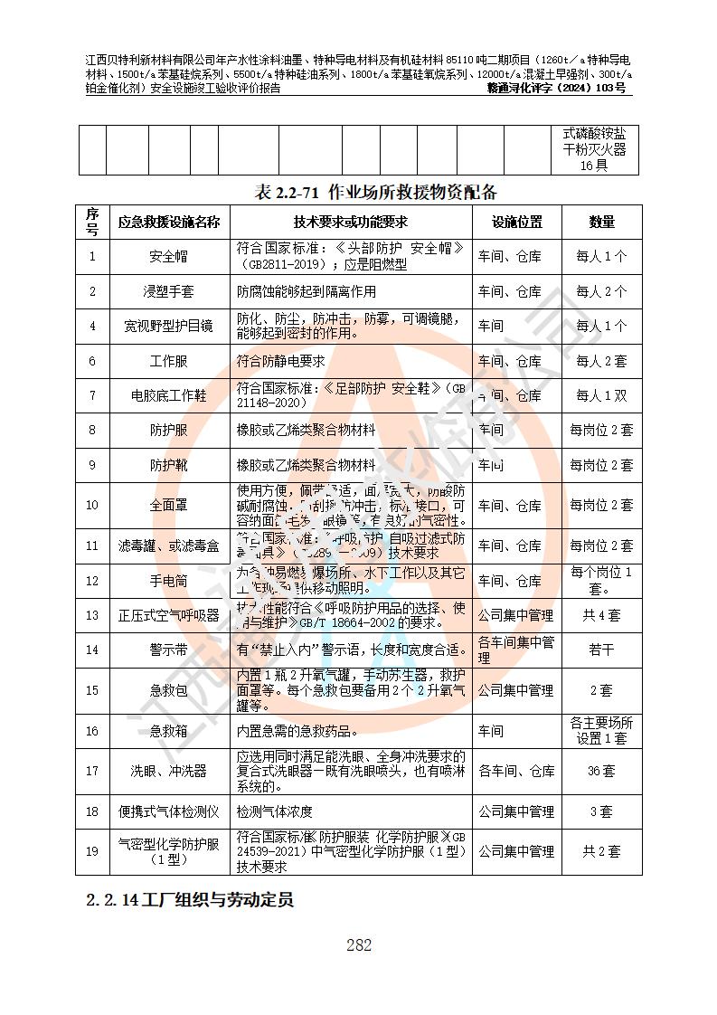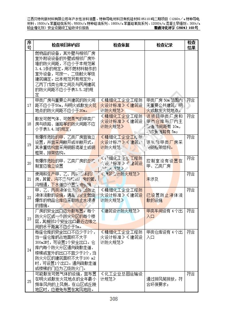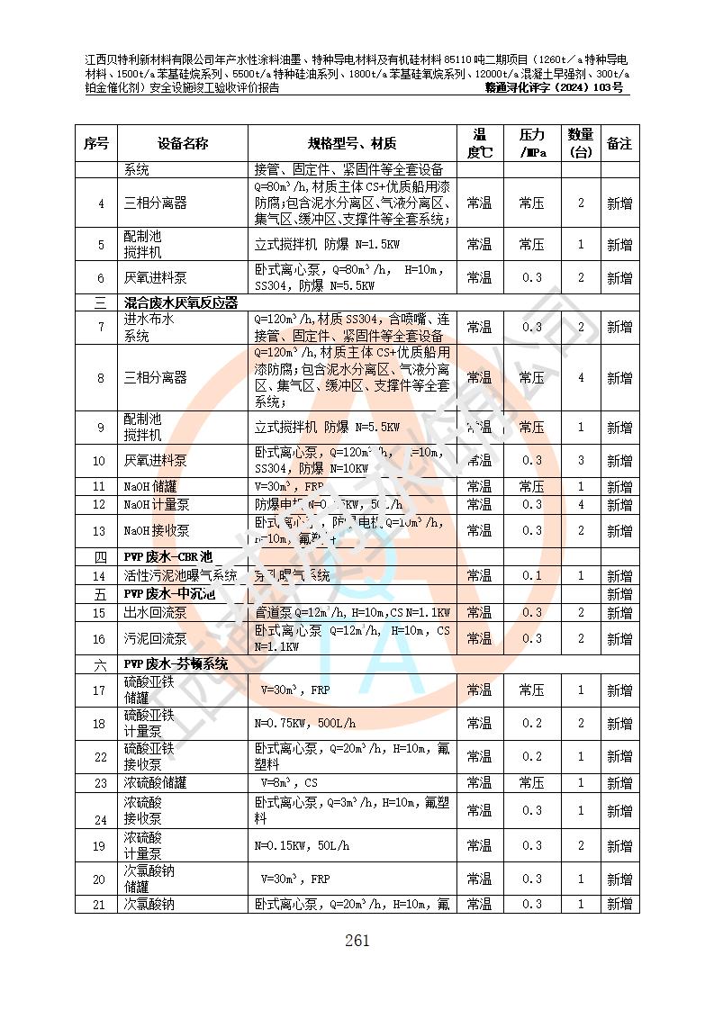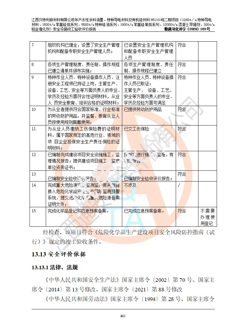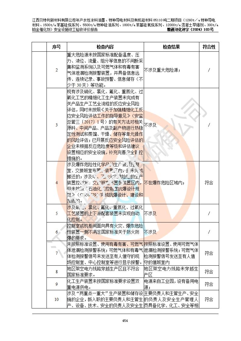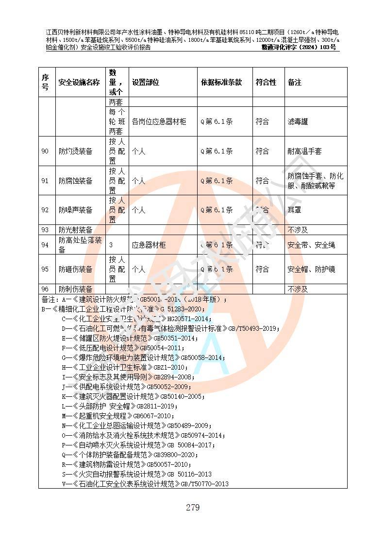 評價報告名稱 | 江西貝特利新材料有限公司年產(chǎn)水性涂料油墨、特種導電材料及有 機硅材料85110噸二期項目(1260t/a特種導電材料、1500t/a苯基硅烷系列、5500t/a特種硅油系列、1800t/a苯基硅氧烷系列、12000t/a混凝土早強劑、300t/a鉑金催化劑)安全設施竣工驗收評價報告 | |||||