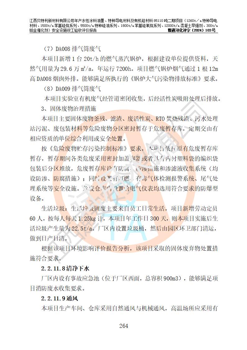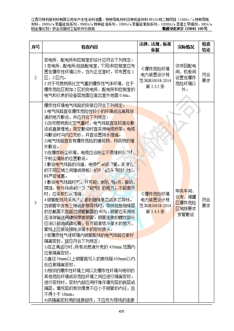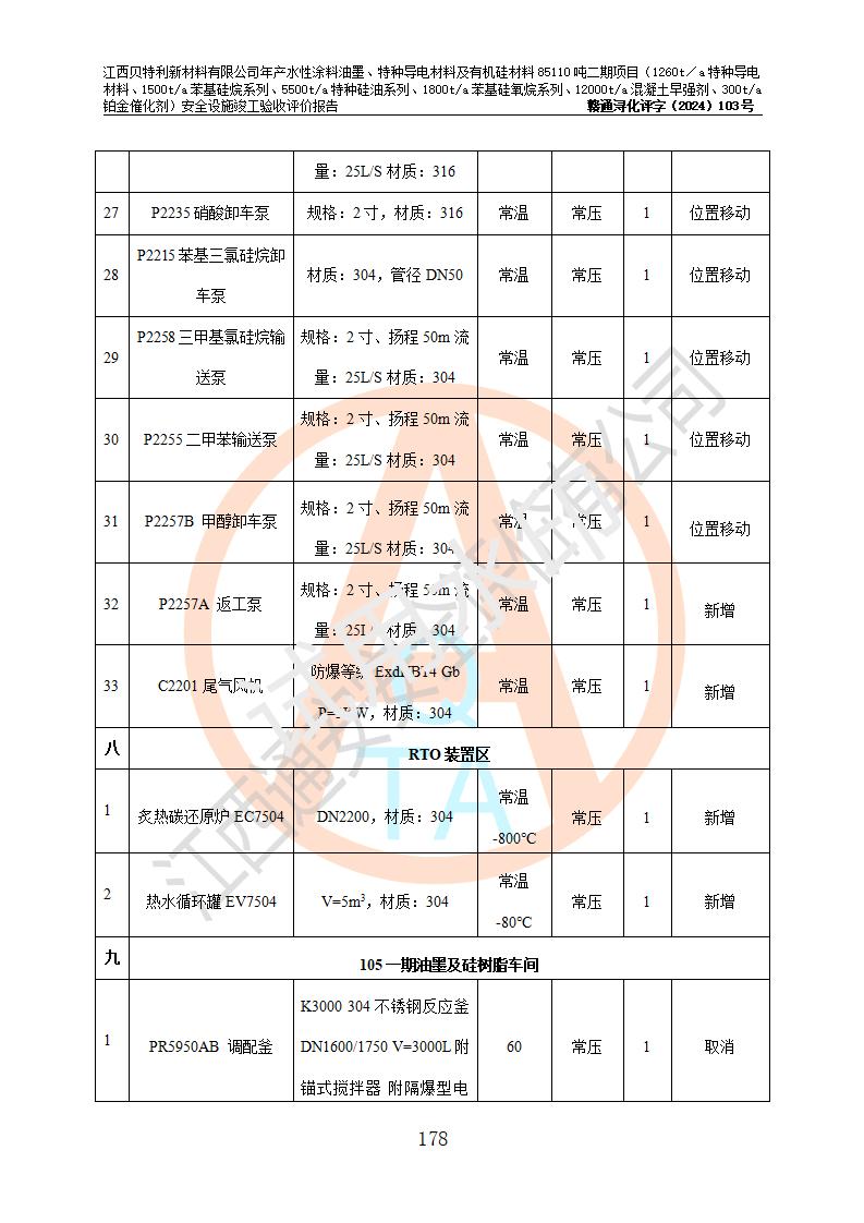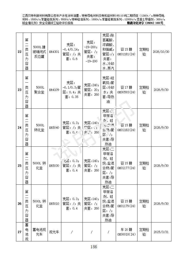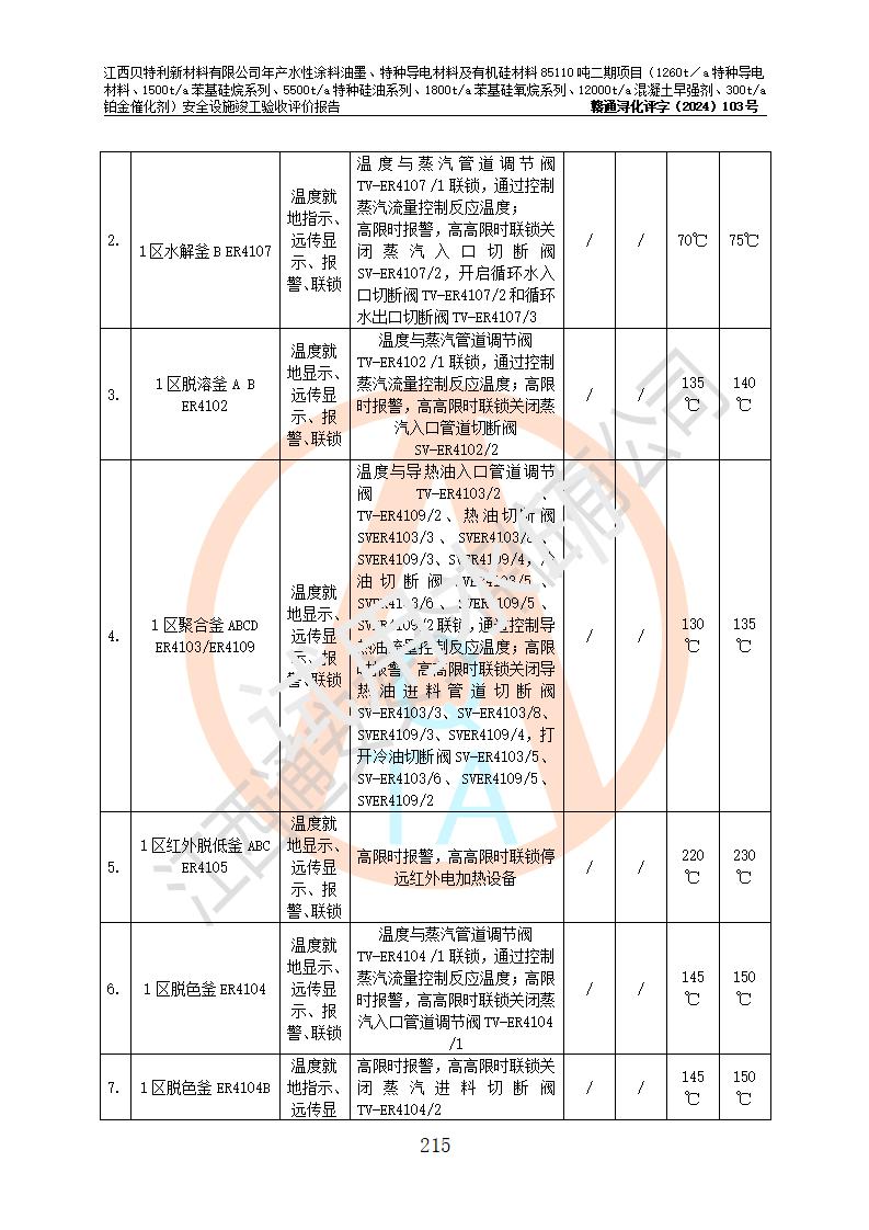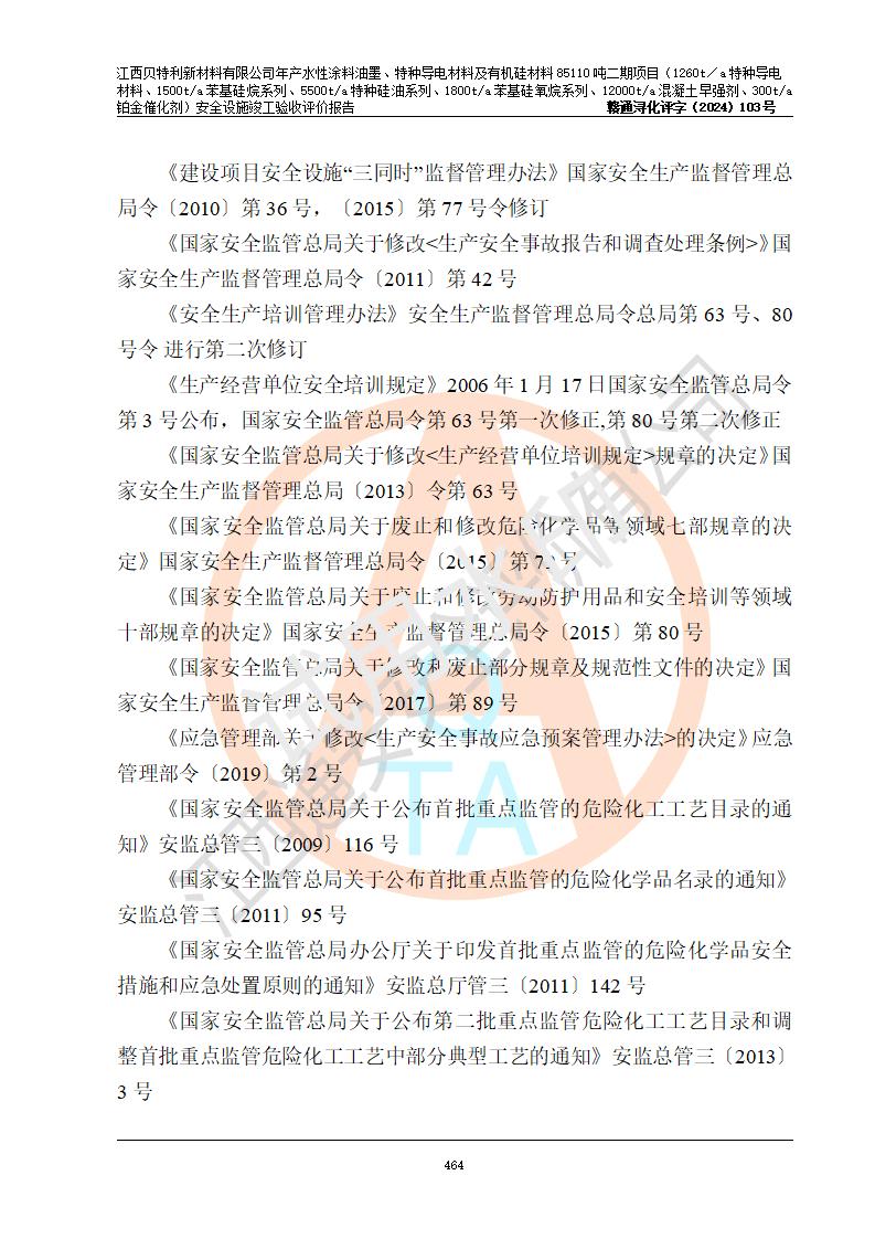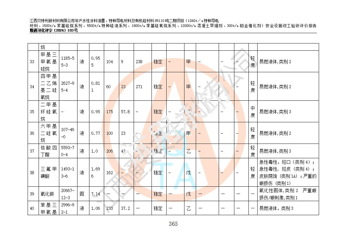 評價報告名稱 | 江西貝特利新材料有限公司年產(chǎn)水性涂料油墨、特種導電材料及有 機硅材料85110噸二期項目(1260t/a特種導電材料、1500t/a苯基硅烷系列、5500t/a特種硅油系列、1800t/a苯基硅氧烷系列、12000t/a混凝土早強劑、300t/a鉑金催化劑)安全設施竣工驗收評價報告 | |||||