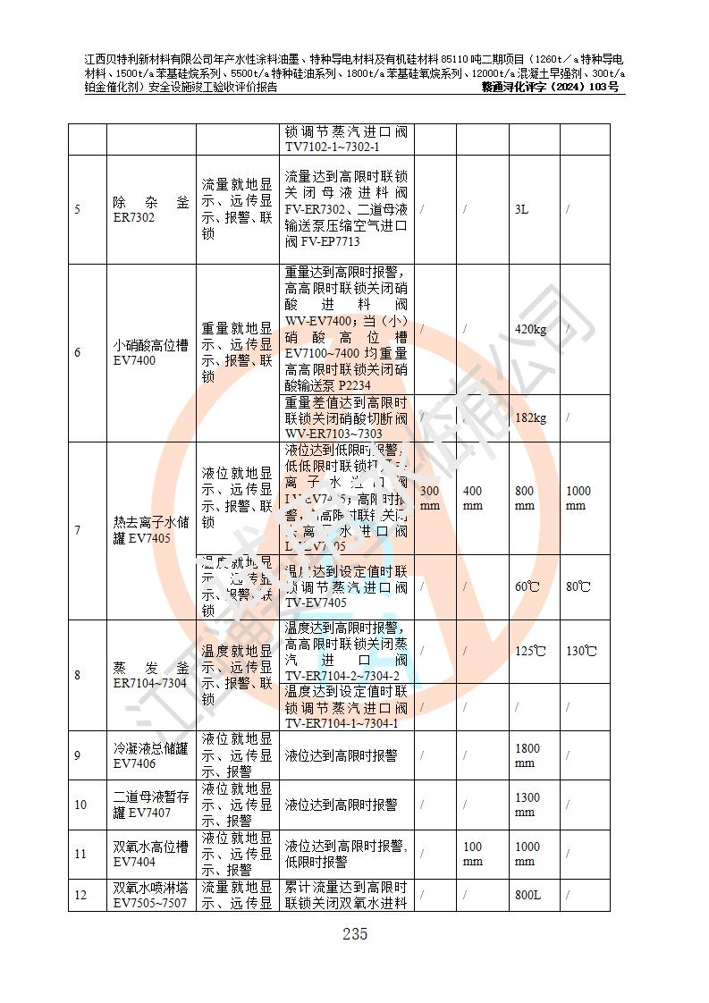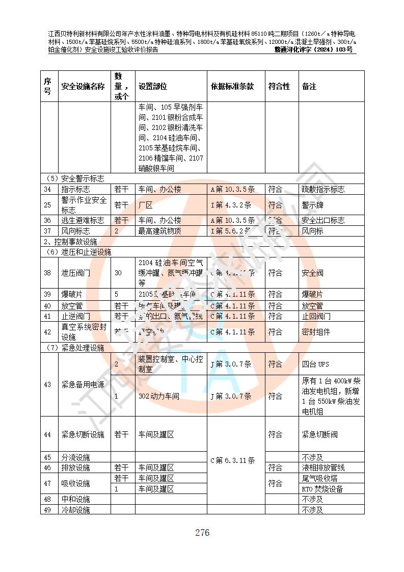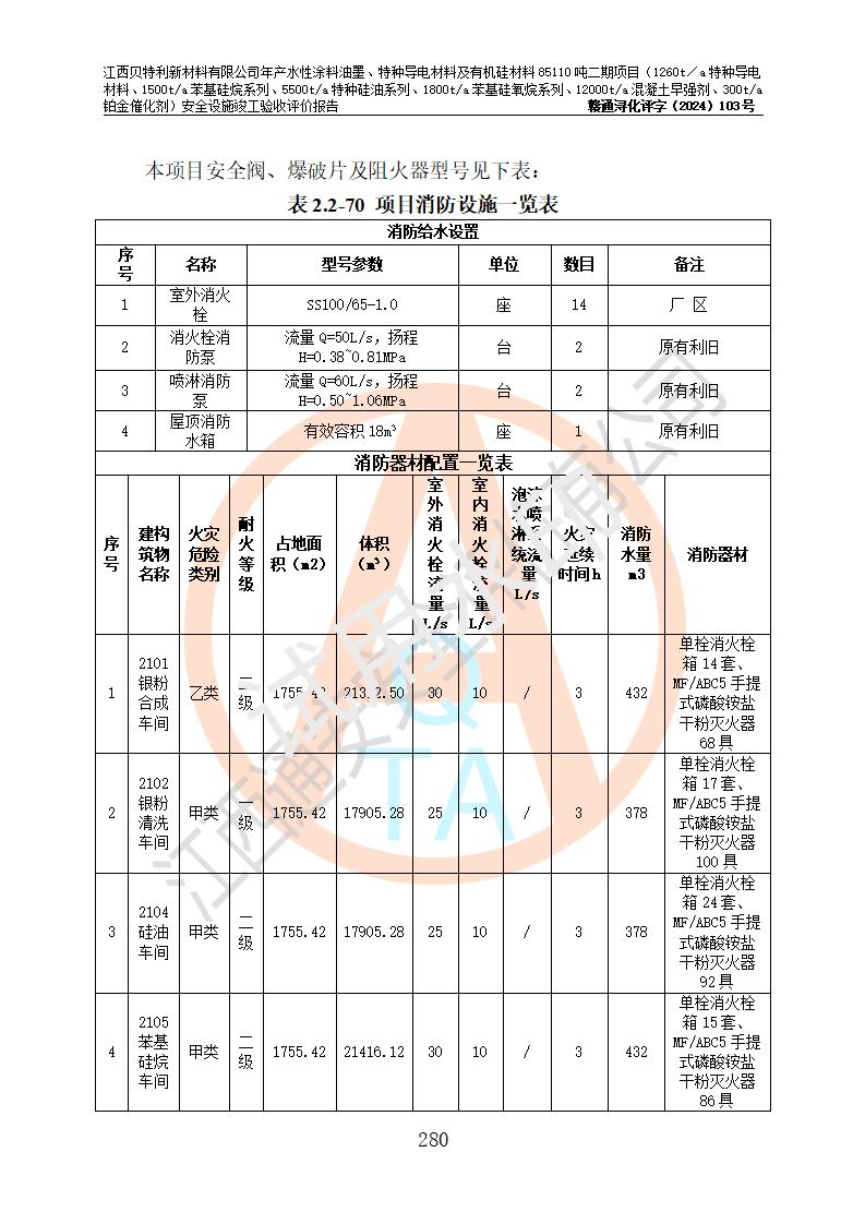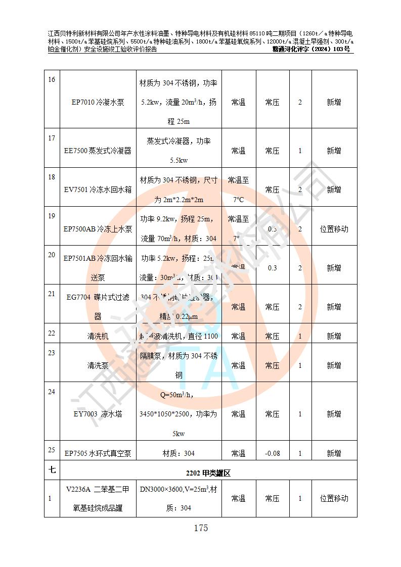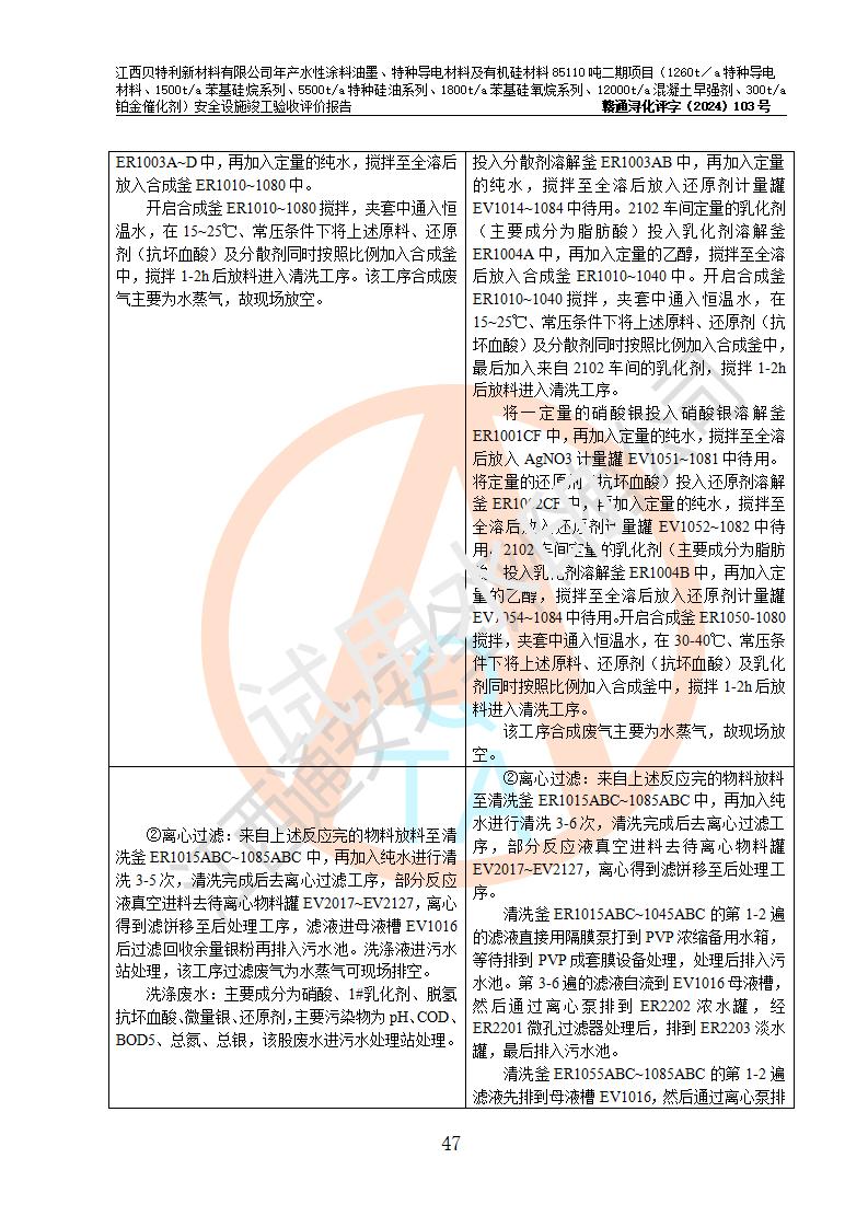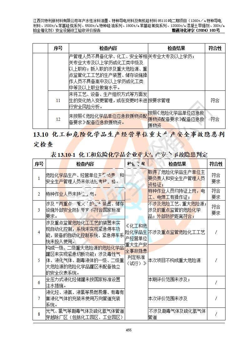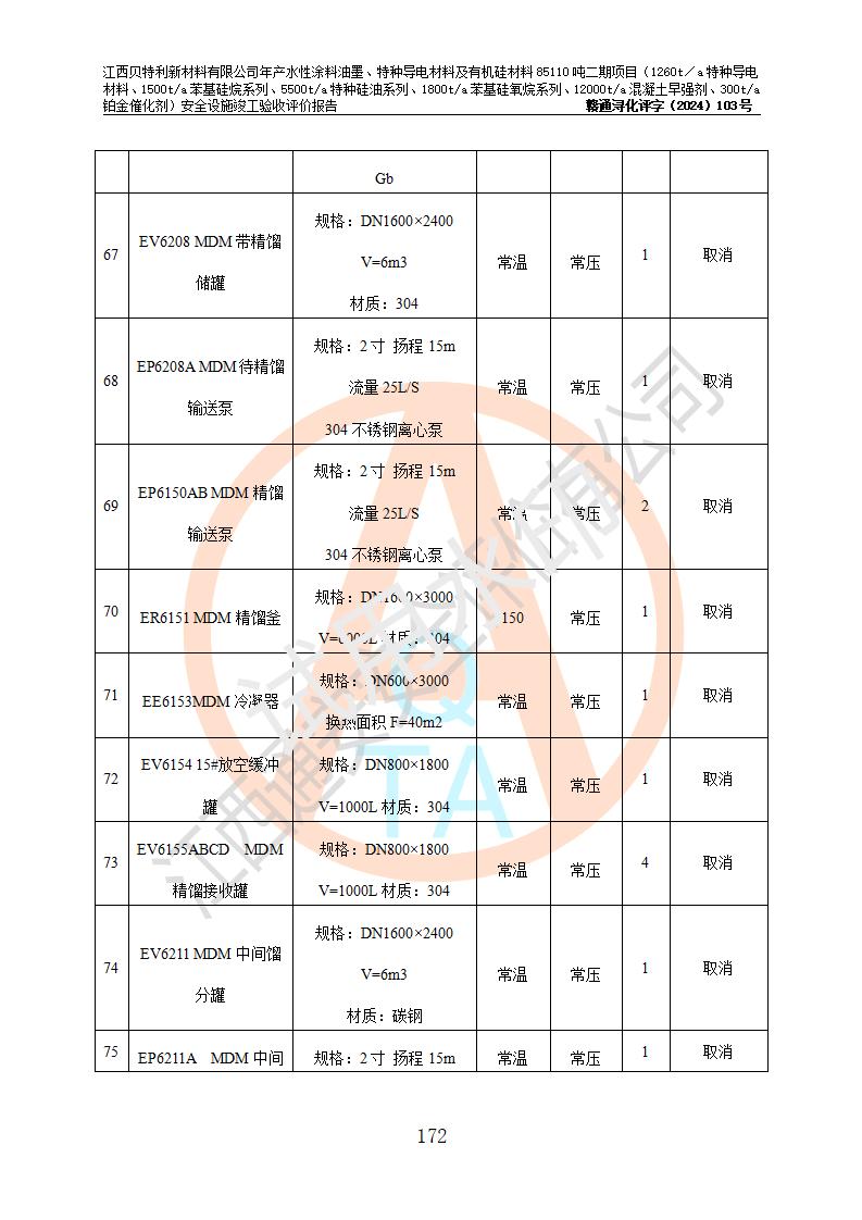評價報告名稱 | 江西貝特利新材料有限公司年產(chǎn)水性涂料油墨、特種導電材料及有 機硅材料85110噸二期項目(1260t/a特種導電材料、1500t/a苯基硅烷系列、5500t/a特種硅油系列、1800t/a苯基硅氧烷系列、12000t/a混凝土早強劑、300t/a鉑金催化劑)安全設施竣工驗收評價報告 | |||||