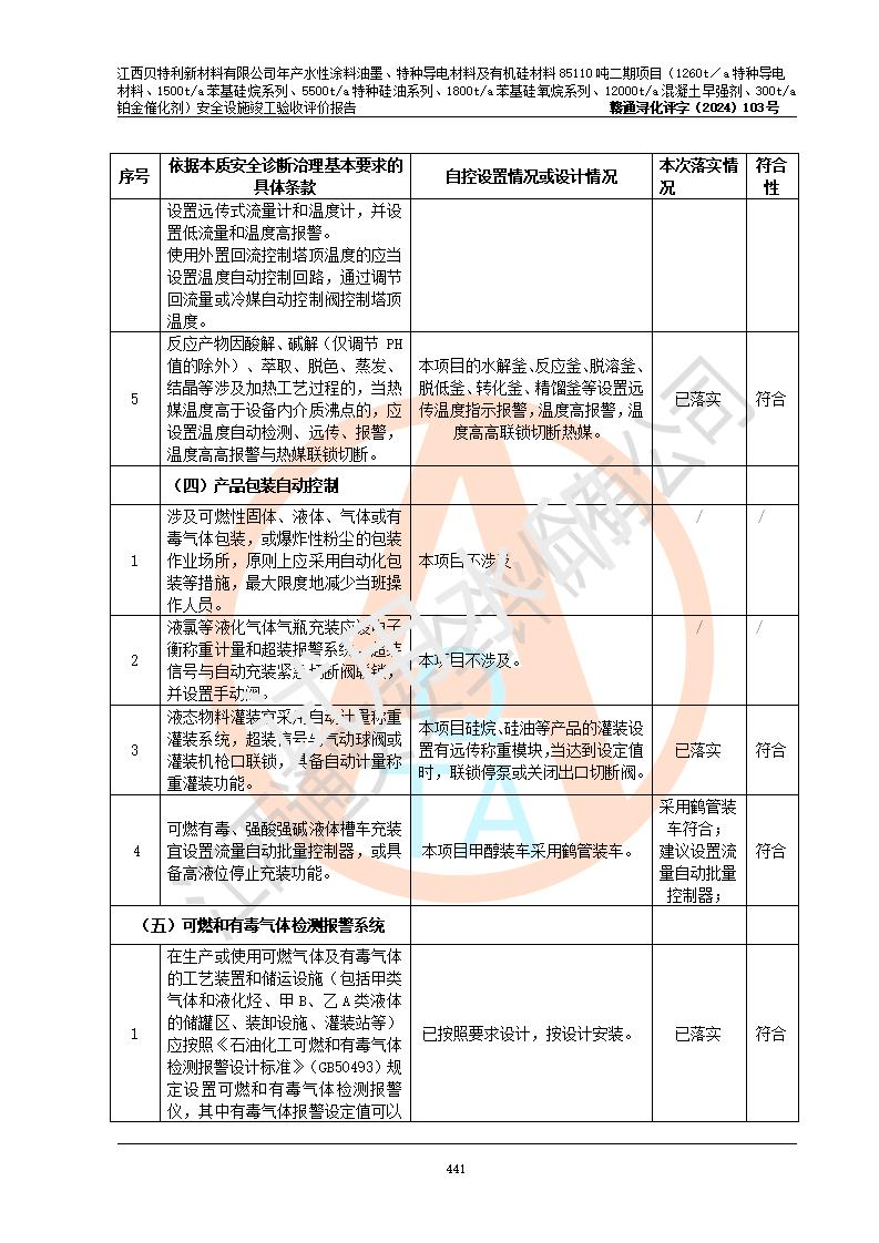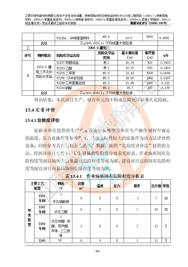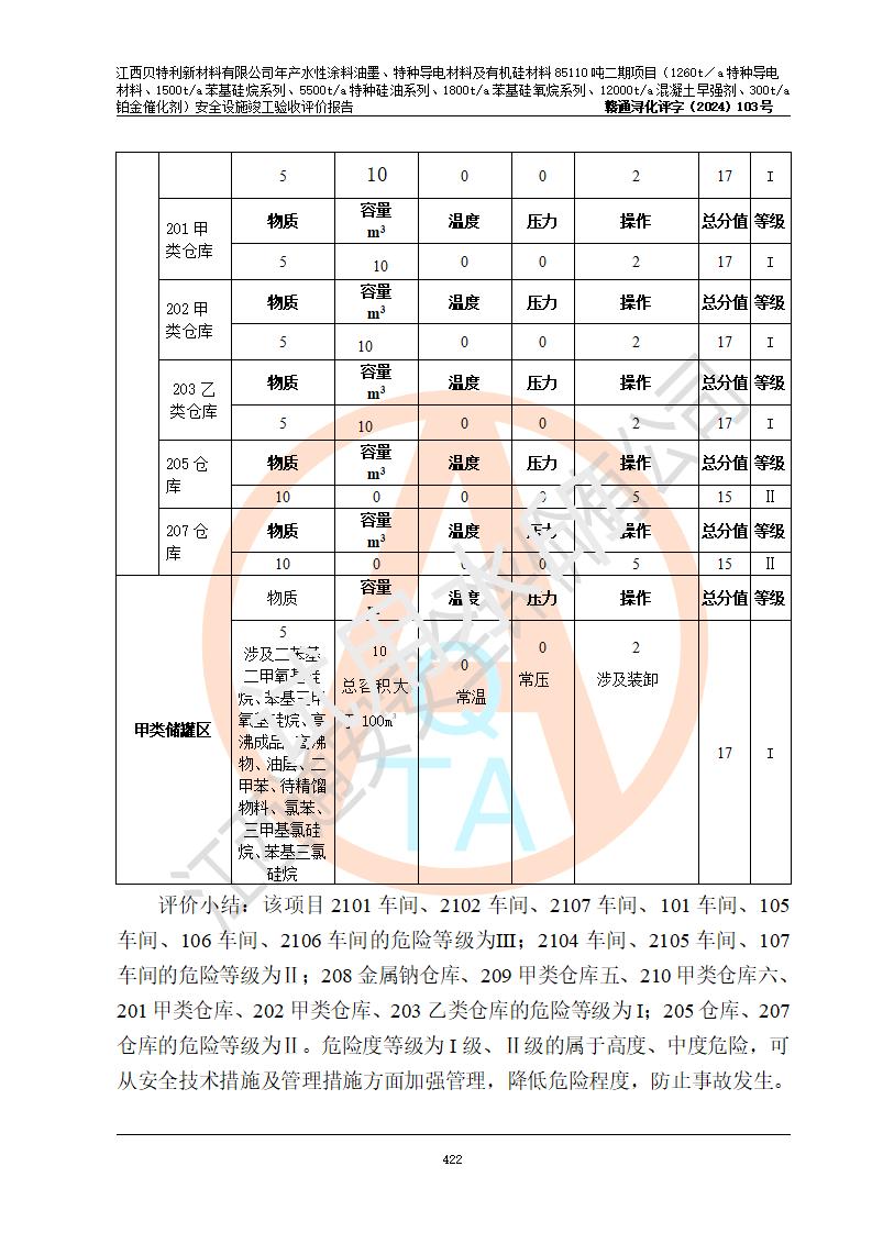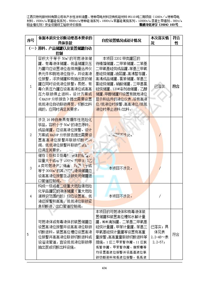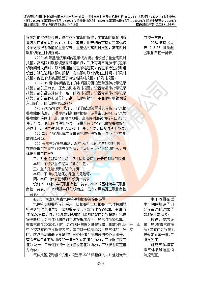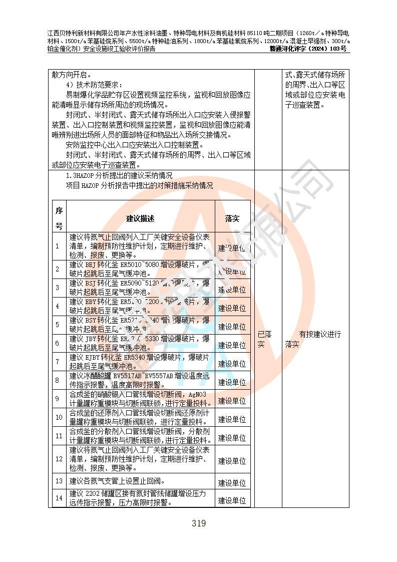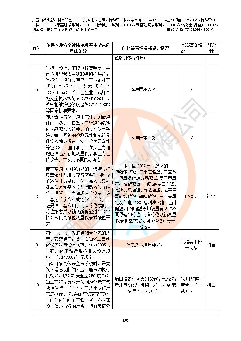 評價結論 | 經(jīng)評價組評價,江西貝特利新材料有限公司1260t/a特種導電材料、1500t/a苯基硅烷系列、5500t/a特種硅油系列、1800t/a苯基硅氧烷系列、12000t/a混凝土早強劑、300t/a鉑金催化劑項目廠址、總平面布置、現(xiàn)場設備布置情況與設計圖紙一致,本次項目按設計要求,設置有DCS系統(tǒng)、SIS系統(tǒng)、GDS系統(tǒng),符合《江西省應急管理廳關于印發(fā)<江西省化工企業(yè)自動化提升實施方案>(試行)的通知》贛應急字[2021]190號,符合《危險化學品生產(chǎn)建設項目安全風險防控指南(試行)》規(guī)定竣工驗收的安全條件;企業(yè)主要負責人、安全管理部門負責人均為化學、化工相關專業(yè),且有三年以上化工行業(yè)從業(yè)經(jīng)歷,企業(yè)主要負責人及安全管理人員已取得危險化學品企業(yè)主要負責人及安全管理人員考核合格證。項目選擇的工藝過程及設備設施的安全可靠性能達到**法規(guī)、標準規(guī)定要求。 項目運行后存在的主要危險、有害因素有:火災、其他爆炸、容器爆炸、中毒與窒息等;存在的主要有害因素有化學物質(zhì)危害等;針對存在的危險、有害因素,企業(yè)采取了**的安全技術措施及安全管理措施,符合**有關法規(guī)、標準、規(guī)范要求;項目風險可控,其安全生產(chǎn)條件和安全管理方面具備竣工安全驗收的條件。 | |||||