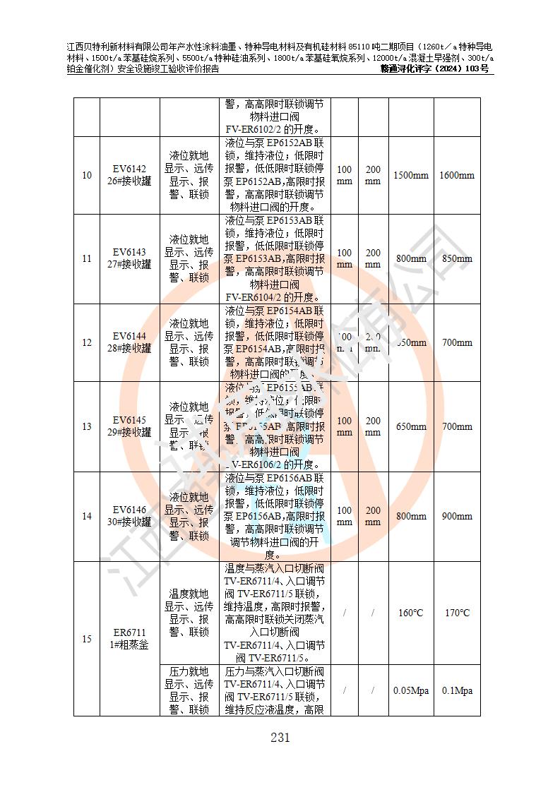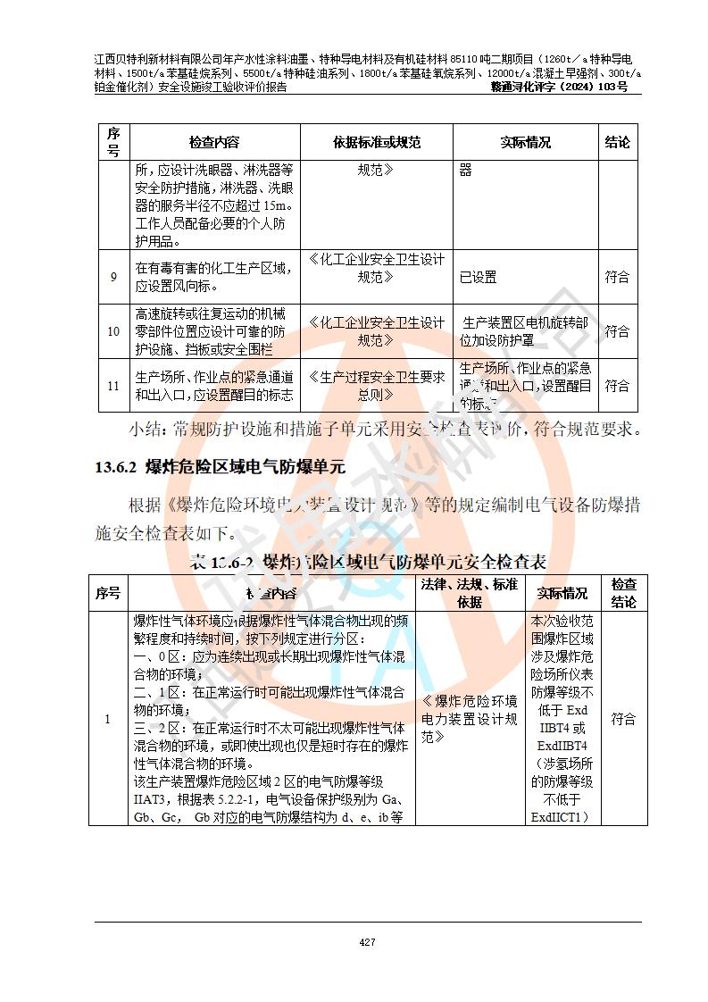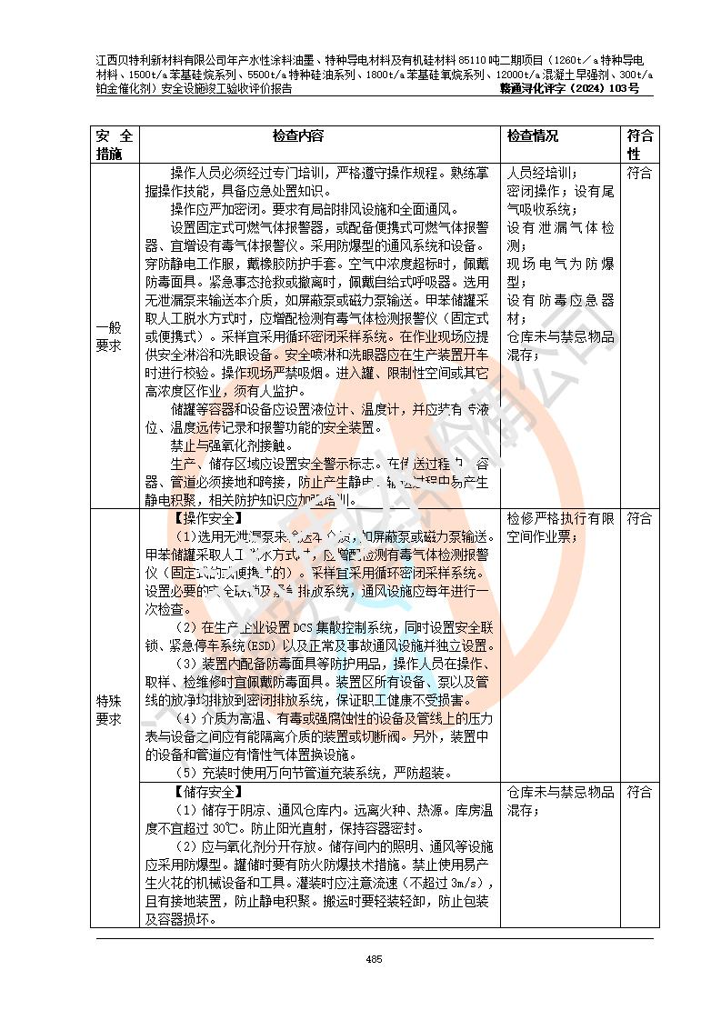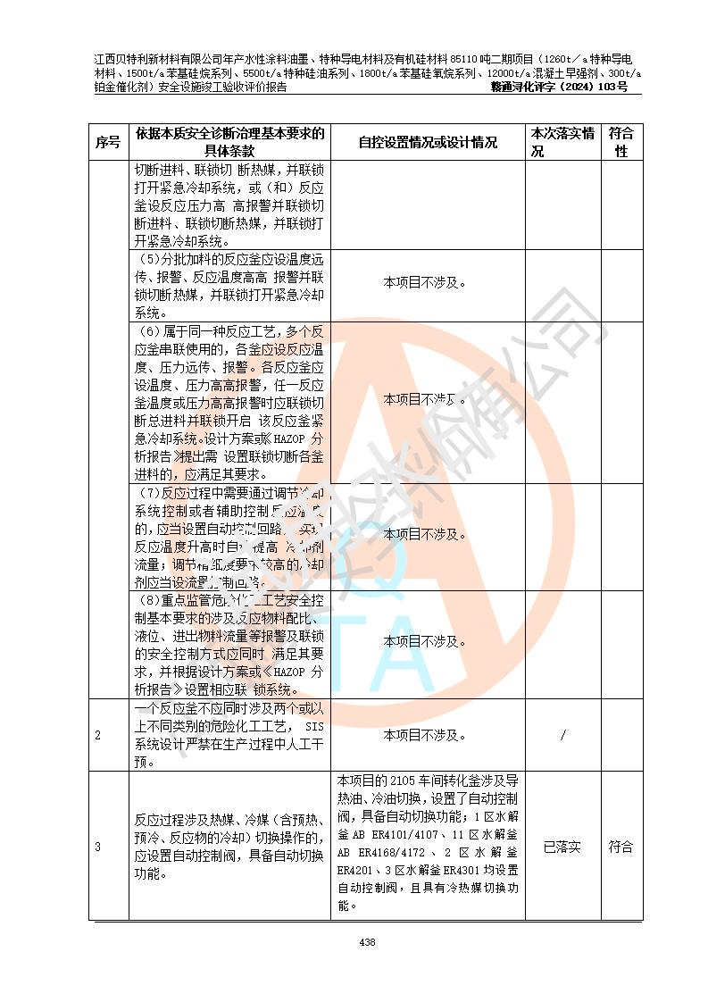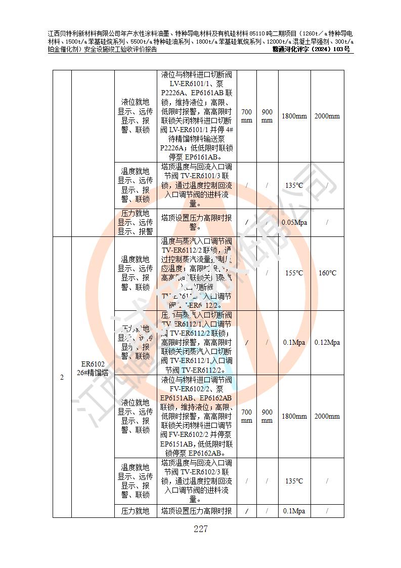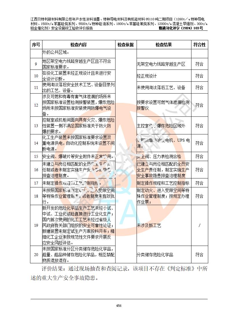 評價結論 | 經(jīng)評價組評價,江西貝特利新材料有限公司1260t/a特種導電材料、1500t/a苯基硅烷系列、5500t/a特種硅油系列、1800t/a苯基硅氧烷系列、12000t/a混凝土早強劑、300t/a鉑金催化劑項目廠址、總平面布置、現(xiàn)場設備布置情況與設計圖紙一致,本次項目按設計要求,設置有DCS系統(tǒng)、SIS系統(tǒng)、GDS系統(tǒng),符合《江西省應急管理廳關于印發(fā)<江西省化工企業(yè)自動化提升實施方案>(試行)的通知》贛應急字[2021]190號,符合《危險化學品生產(chǎn)建設項目安全風險防控指南(試行)》規(guī)定竣工驗收的安全條件;企業(yè)主要負責人、安全管理部門負責人均為化學、化工相關專業(yè),且有三年以上化工行業(yè)從業(yè)經(jīng)歷,企業(yè)主要負責人及安全管理人員已取得危險化學品企業(yè)主要負責人及安全管理人員考核合格證。項目選擇的工藝過程及設備設施的安全可靠性能達到**法規(guī)、標準規(guī)定要求。 項目運行后存在的主要危險、有害因素有:火災、其他爆炸、容器爆炸、中毒與窒息等;存在的主要有害因素有化學物質(zhì)危害等;針對存在的危險、有害因素,企業(yè)采取了**的安全技術措施及安全管理措施,符合**有關法規(guī)、標準、規(guī)范要求;項目風險可控,其安全生產(chǎn)條件和安全管理方面具備竣工安全驗收的條件。 | |||||