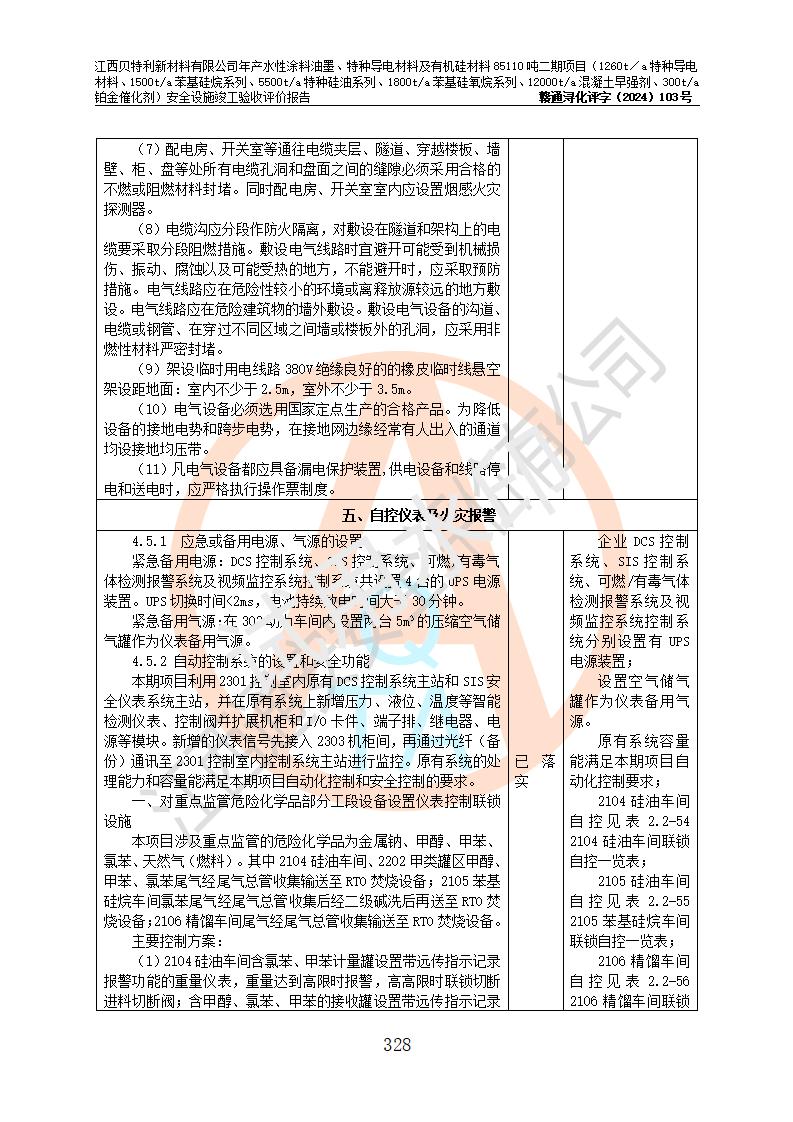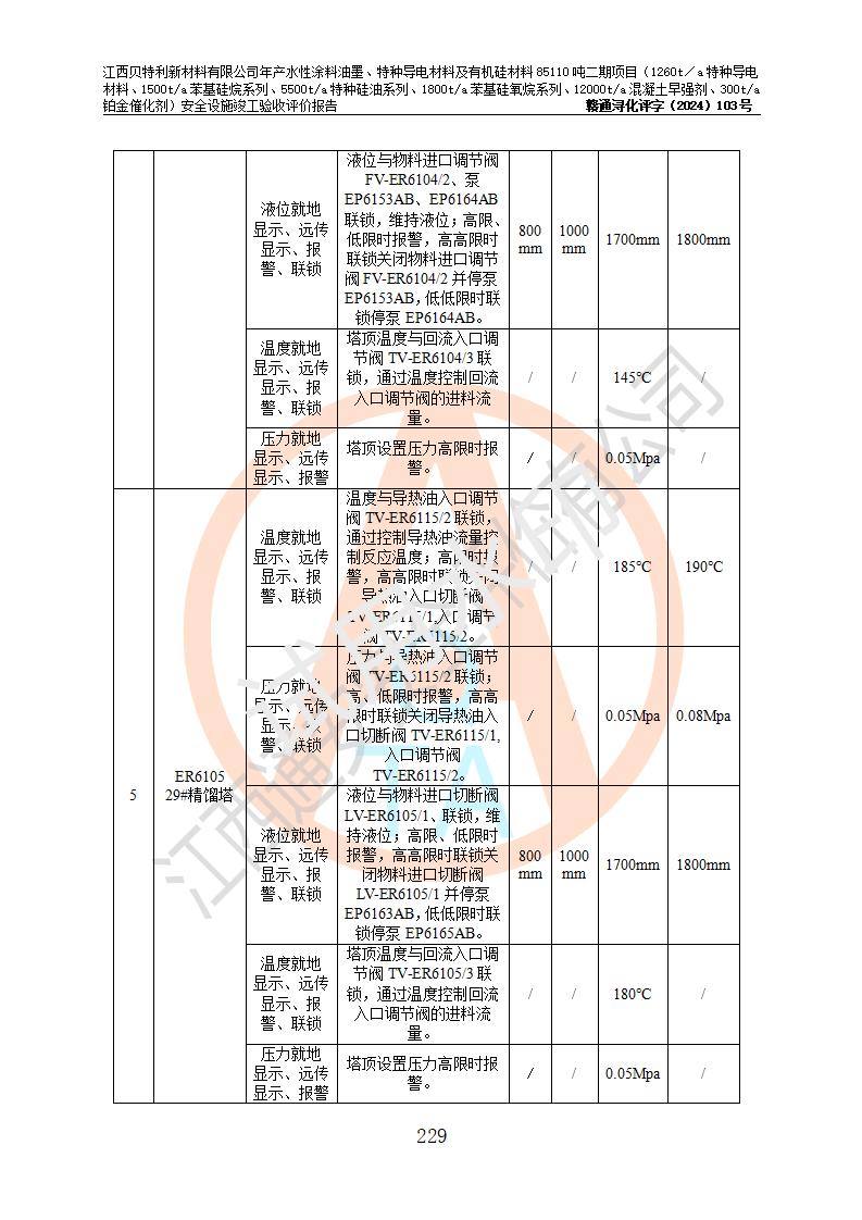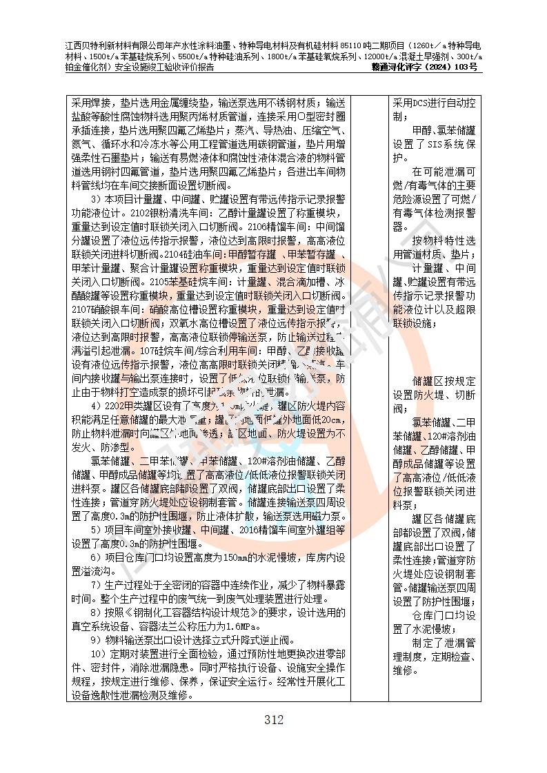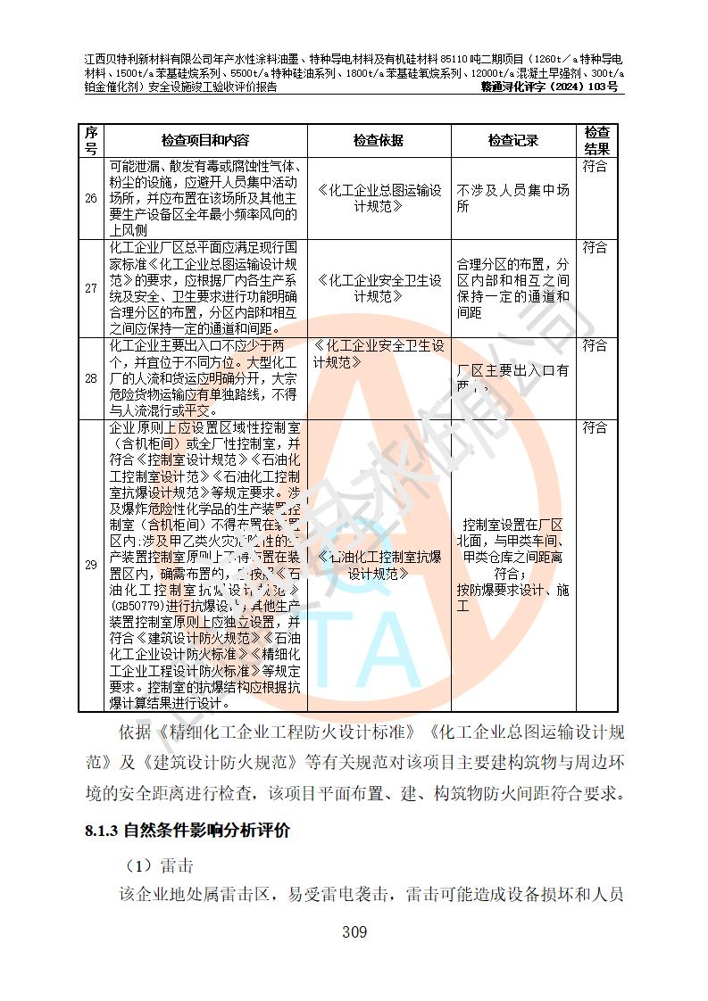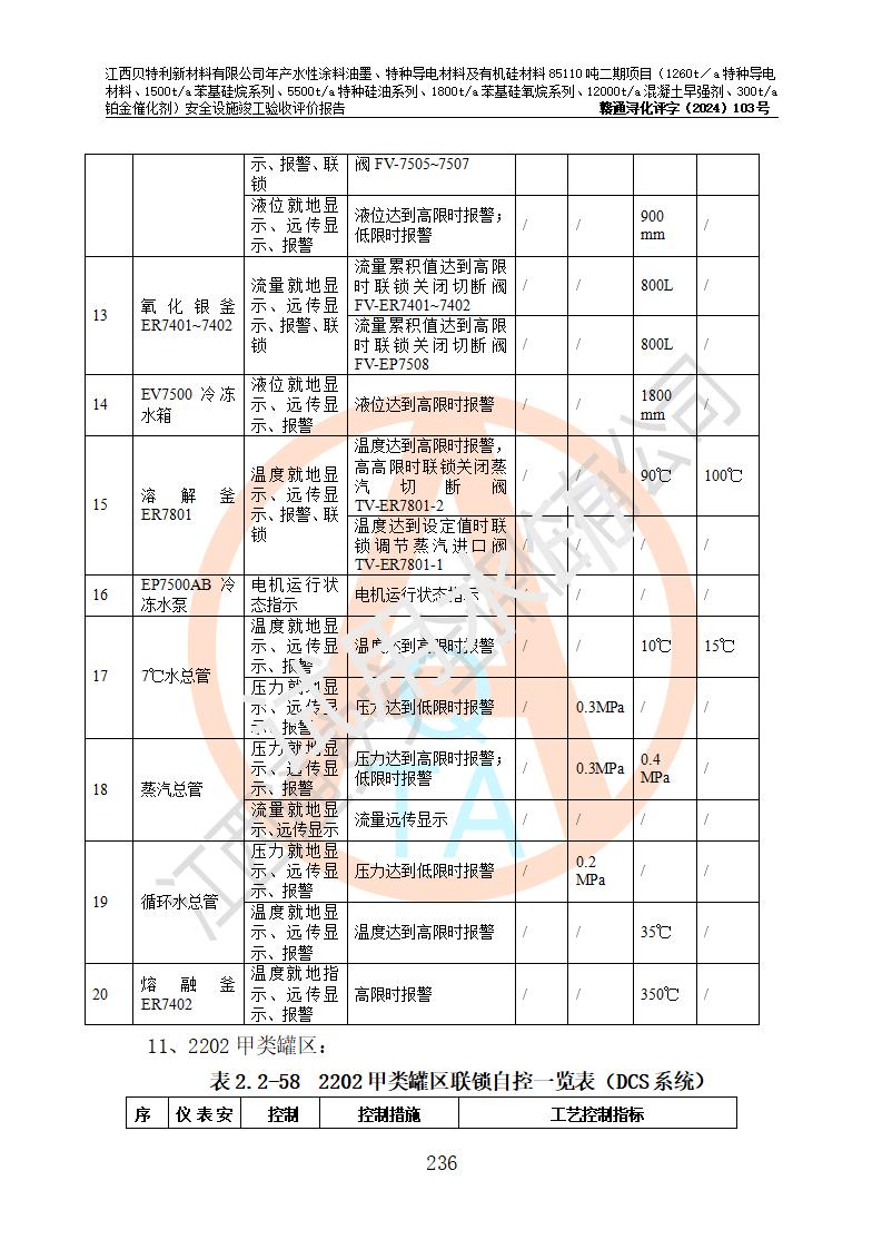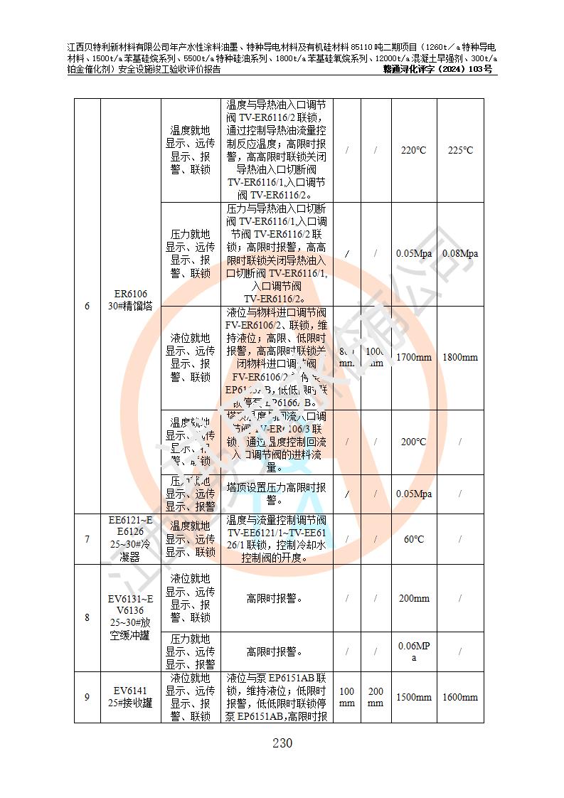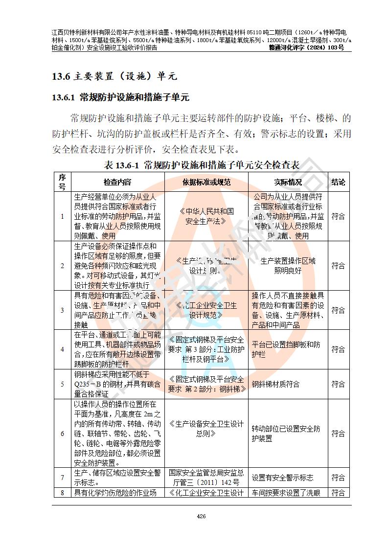 評價結論 | 經(jīng)評價組評價,江西貝特利新材料有限公司1260t/a特種導電材料、1500t/a苯基硅烷系列、5500t/a特種硅油系列、1800t/a苯基硅氧烷系列、12000t/a混凝土早強劑、300t/a鉑金催化劑項目廠址、總平面布置、現(xiàn)場設備布置情況與設計圖紙一致,本次項目按設計要求,設置有DCS系統(tǒng)、SIS系統(tǒng)、GDS系統(tǒng),符合《江西省應急管理廳關于印發(fā)<江西省化工企業(yè)自動化提升實施方案>(試行)的通知》贛應急字[2021]190號,符合《危險化學品生產(chǎn)建設項目安全風險防控指南(試行)》規(guī)定竣工驗收的安全條件;企業(yè)主要負責人、安全管理部門負責人均為化學、化工相關專業(yè),且有三年以上化工行業(yè)從業(yè)經(jīng)歷,企業(yè)主要負責人及安全管理人員已取得危險化學品企業(yè)主要負責人及安全管理人員考核合格證。項目選擇的工藝過程及設備設施的安全可靠性能達到**法規(guī)、標準規(guī)定要求。 項目運行后存在的主要危險、有害因素有:火災、其他爆炸、容器爆炸、中毒與窒息等;存在的主要有害因素有化學物質(zhì)危害等;針對存在的危險、有害因素,企業(yè)采取了**的安全技術措施及安全管理措施,符合**有關法規(guī)、標準、規(guī)范要求;項目風險可控,其安全生產(chǎn)條件和安全管理方面具備竣工安全驗收的條件。 | |||||