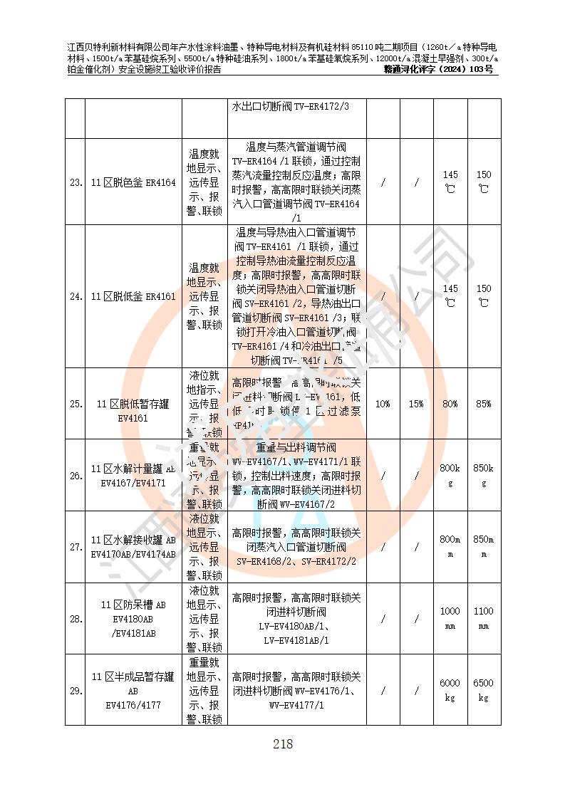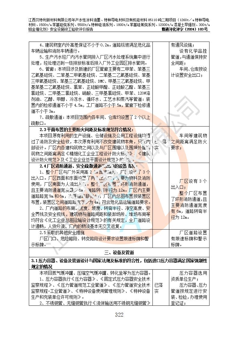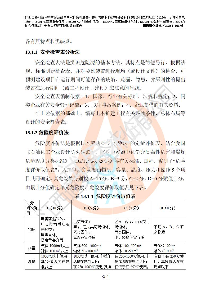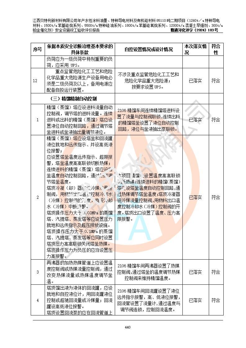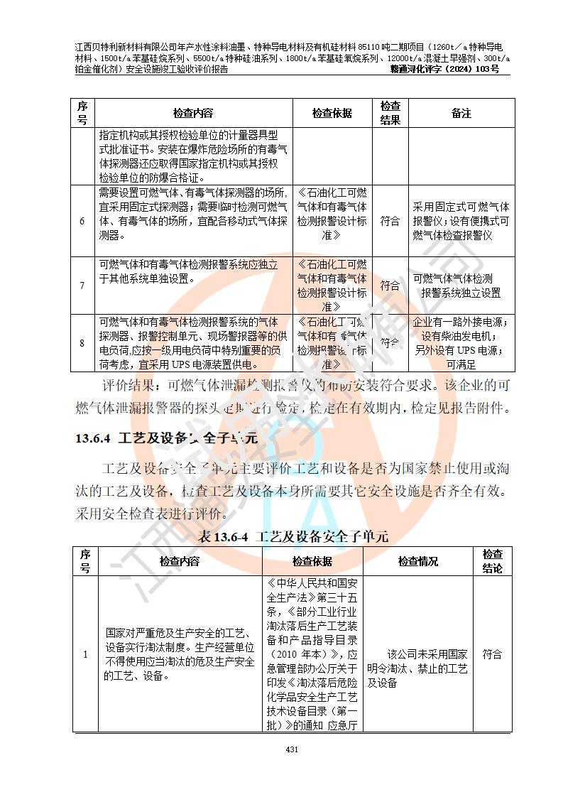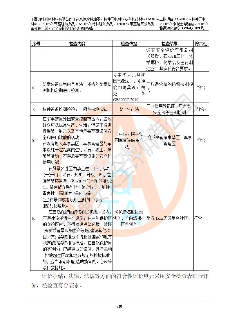 評價結論 | 經(jīng)評價組評價,江西貝特利新材料有限公司1260t/a特種導電材料、1500t/a苯基硅烷系列、5500t/a特種硅油系列、1800t/a苯基硅氧烷系列、12000t/a混凝土早強劑、300t/a鉑金催化劑項目廠址、總平面布置、現(xiàn)場設備布置情況與設計圖紙一致,本次項目按設計要求,設置有DCS系統(tǒng)、SIS系統(tǒng)、GDS系統(tǒng),符合《江西省應急管理廳關于印發(fā)<江西省化工企業(yè)自動化提升實施方案>(試行)的通知》贛應急字[2021]190號,符合《危險化學品生產(chǎn)建設項目安全風險防控指南(試行)》規(guī)定竣工驗收的安全條件;企業(yè)主要負責人、安全管理部門負責人均為化學、化工相關專業(yè),且有三年以上化工行業(yè)從業(yè)經(jīng)歷,企業(yè)主要負責人及安全管理人員已取得危險化學品企業(yè)主要負責人及安全管理人員考核合格證。項目選擇的工藝過程及設備設施的安全可靠性能達到**法規(guī)、標準規(guī)定要求。 項目運行后存在的主要危險、有害因素有:火災、其他爆炸、容器爆炸、中毒與窒息等;存在的主要有害因素有化學物質(zhì)危害等;針對存在的危險、有害因素,企業(yè)采取了**的安全技術措施及安全管理措施,符合**有關法規(guī)、標準、規(guī)范要求;項目風險可控,其安全生產(chǎn)條件和安全管理方面具備竣工安全驗收的條件。 | |||||