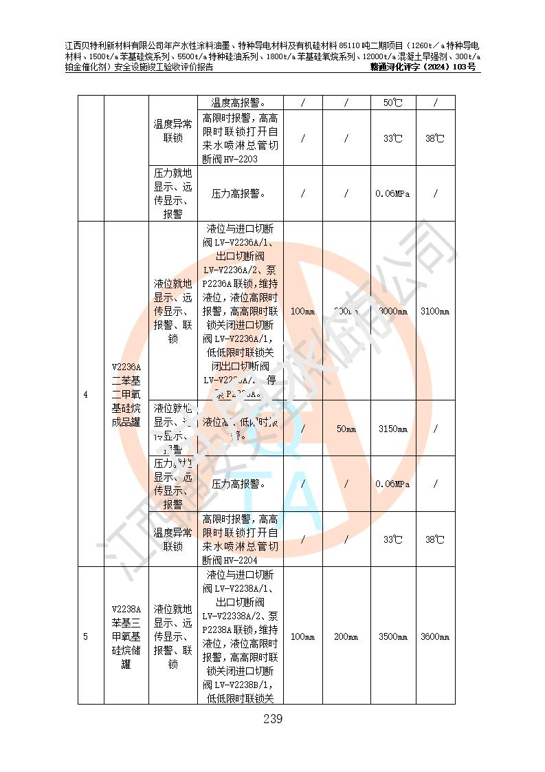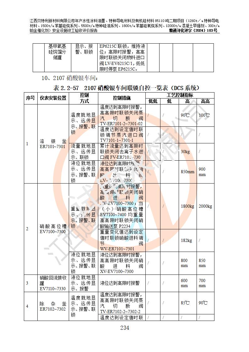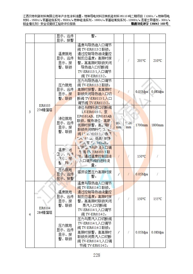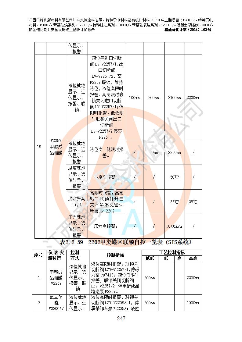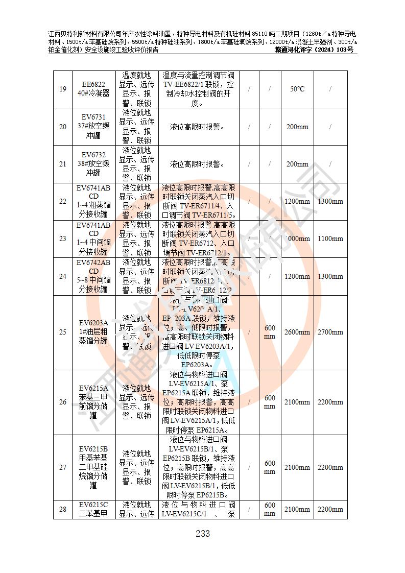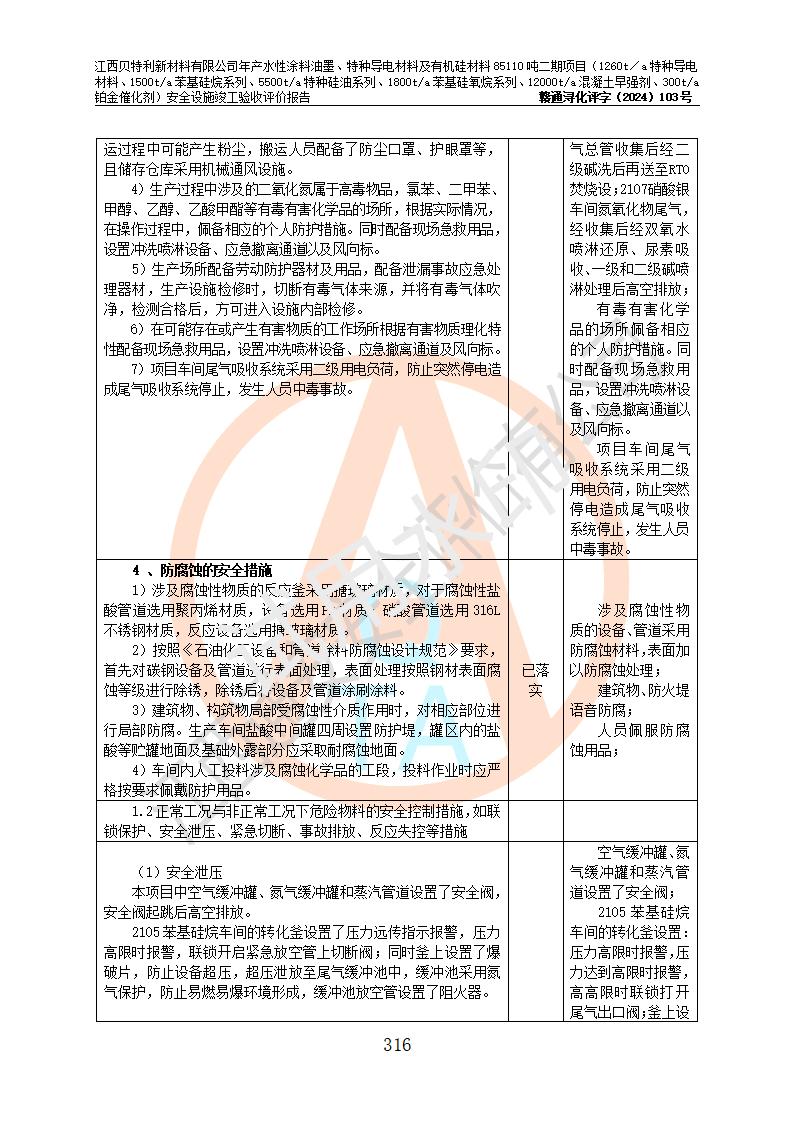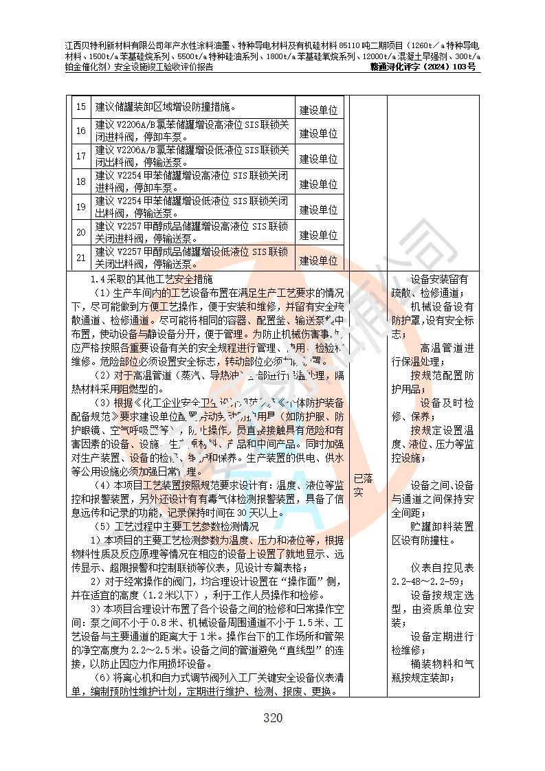 評價結論 | 經(jīng)評價組評價,江西貝特利新材料有限公司1260t/a特種導電材料、1500t/a苯基硅烷系列、5500t/a特種硅油系列、1800t/a苯基硅氧烷系列、12000t/a混凝土早強劑、300t/a鉑金催化劑項目廠址、總平面布置、現(xiàn)場設備布置情況與設計圖紙一致,本次項目按設計要求,設置有DCS系統(tǒng)、SIS系統(tǒng)、GDS系統(tǒng),符合《江西省應急管理廳關于印發(fā)<江西省化工企業(yè)自動化提升實施方案>(試行)的通知》贛應急字[2021]190號,符合《危險化學品生產(chǎn)建設項目安全風險防控指南(試行)》規(guī)定竣工驗收的安全條件;企業(yè)主要負責人、安全管理部門負責人均為化學、化工相關專業(yè),且有三年以上化工行業(yè)從業(yè)經(jīng)歷,企業(yè)主要負責人及安全管理人員已取得危險化學品企業(yè)主要負責人及安全管理人員考核合格證。項目選擇的工藝過程及設備設施的安全可靠性能達到**法規(guī)、標準規(guī)定要求。 項目運行后存在的主要危險、有害因素有:火災、其他爆炸、容器爆炸、中毒與窒息等;存在的主要有害因素有化學物質(zhì)危害等;針對存在的危險、有害因素,企業(yè)采取了**的安全技術措施及安全管理措施,符合**有關法規(guī)、標準、規(guī)范要求;項目風險可控,其安全生產(chǎn)條件和安全管理方面具備竣工安全驗收的條件。 | |||||