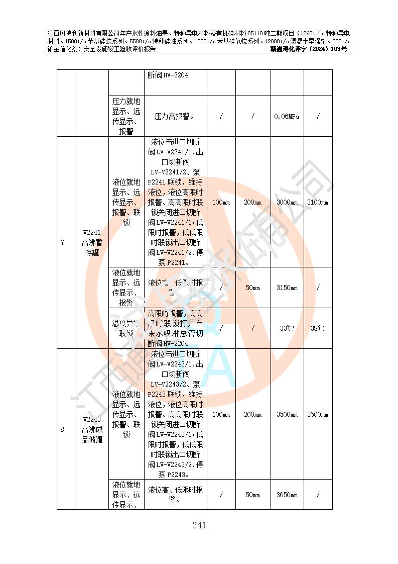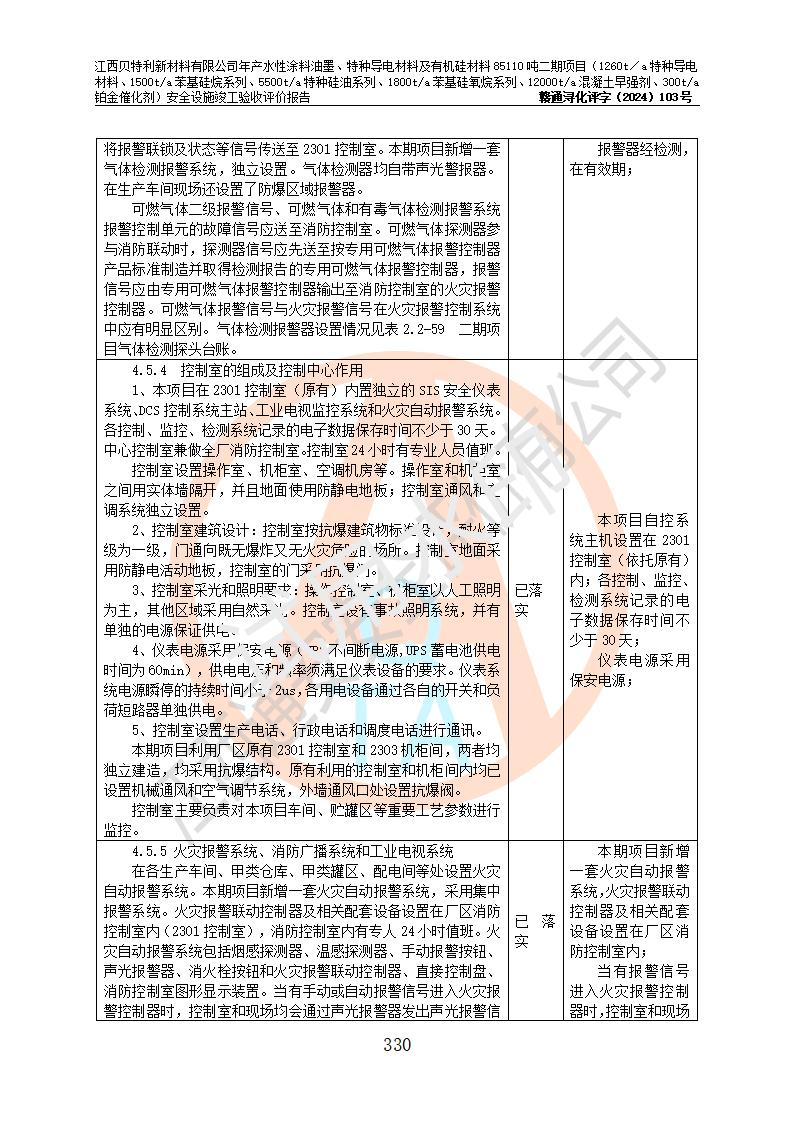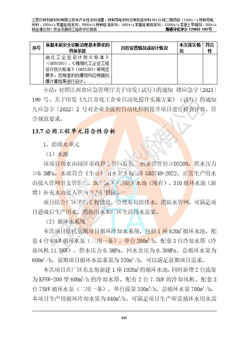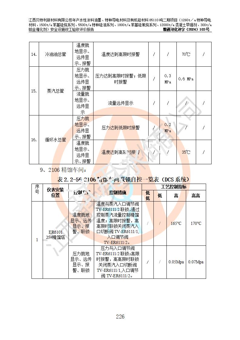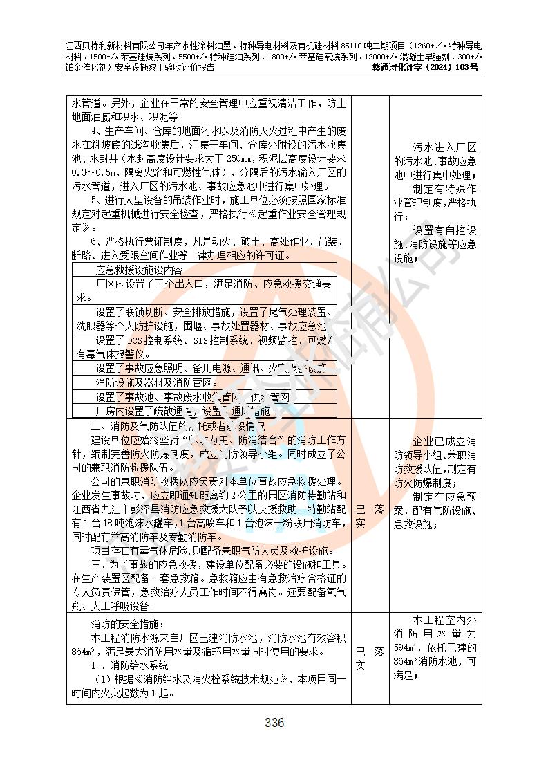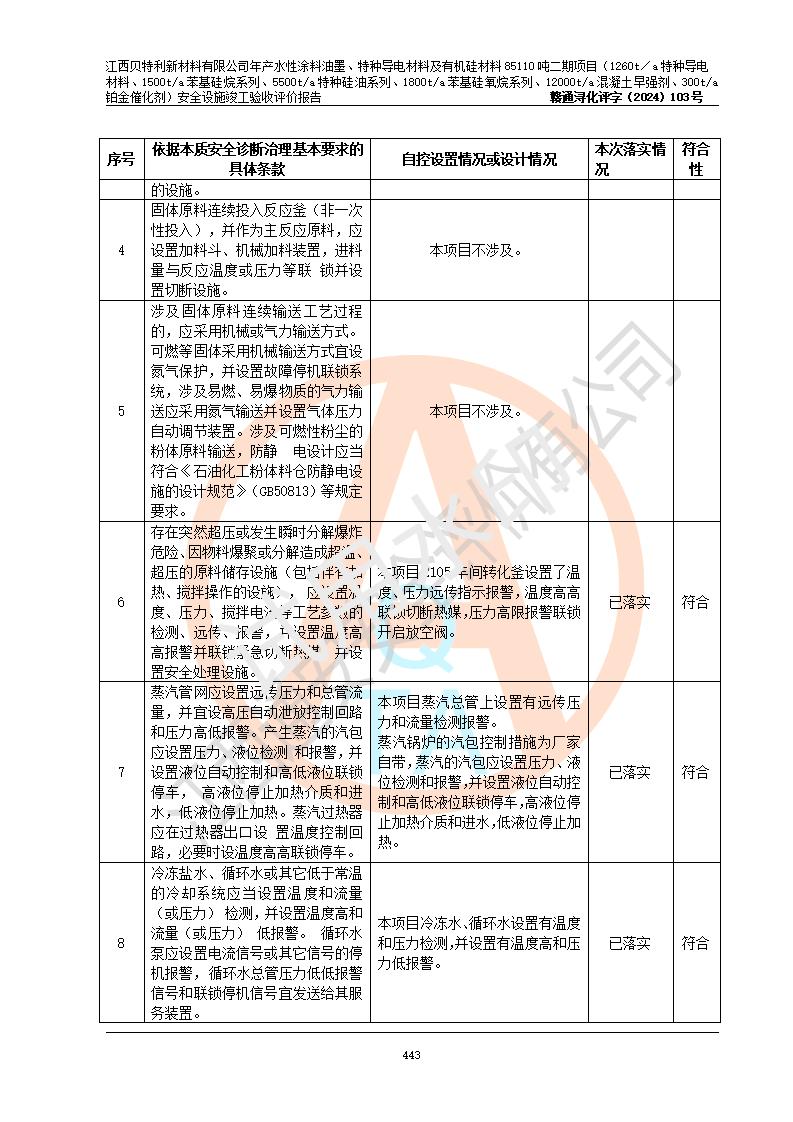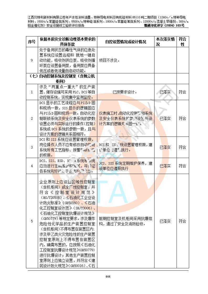 評價結論 | 經(jīng)評價組評價,江西貝特利新材料有限公司1260t/a特種導電材料、1500t/a苯基硅烷系列、5500t/a特種硅油系列、1800t/a苯基硅氧烷系列、12000t/a混凝土早強劑、300t/a鉑金催化劑項目廠址、總平面布置、現(xiàn)場設備布置情況與設計圖紙一致,本次項目按設計要求,設置有DCS系統(tǒng)、SIS系統(tǒng)、GDS系統(tǒng),符合《江西省應急管理廳關于印發(fā)<江西省化工企業(yè)自動化提升實施方案>(試行)的通知》贛應急字[2021]190號,符合《危險化學品生產(chǎn)建設項目安全風險防控指南(試行)》規(guī)定竣工驗收的安全條件;企業(yè)主要負責人、安全管理部門負責人均為化學、化工相關專業(yè),且有三年以上化工行業(yè)從業(yè)經(jīng)歷,企業(yè)主要負責人及安全管理人員已取得危險化學品企業(yè)主要負責人及安全管理人員考核合格證。項目選擇的工藝過程及設備設施的安全可靠性能達到**法規(guī)、標準規(guī)定要求。 項目運行后存在的主要危險、有害因素有:火災、其他爆炸、容器爆炸、中毒與窒息等;存在的主要有害因素有化學物質(zhì)危害等;針對存在的危險、有害因素,企業(yè)采取了**的安全技術措施及安全管理措施,符合**有關法規(guī)、標準、規(guī)范要求;項目風險可控,其安全生產(chǎn)條件和安全管理方面具備竣工安全驗收的條件。 | |||||