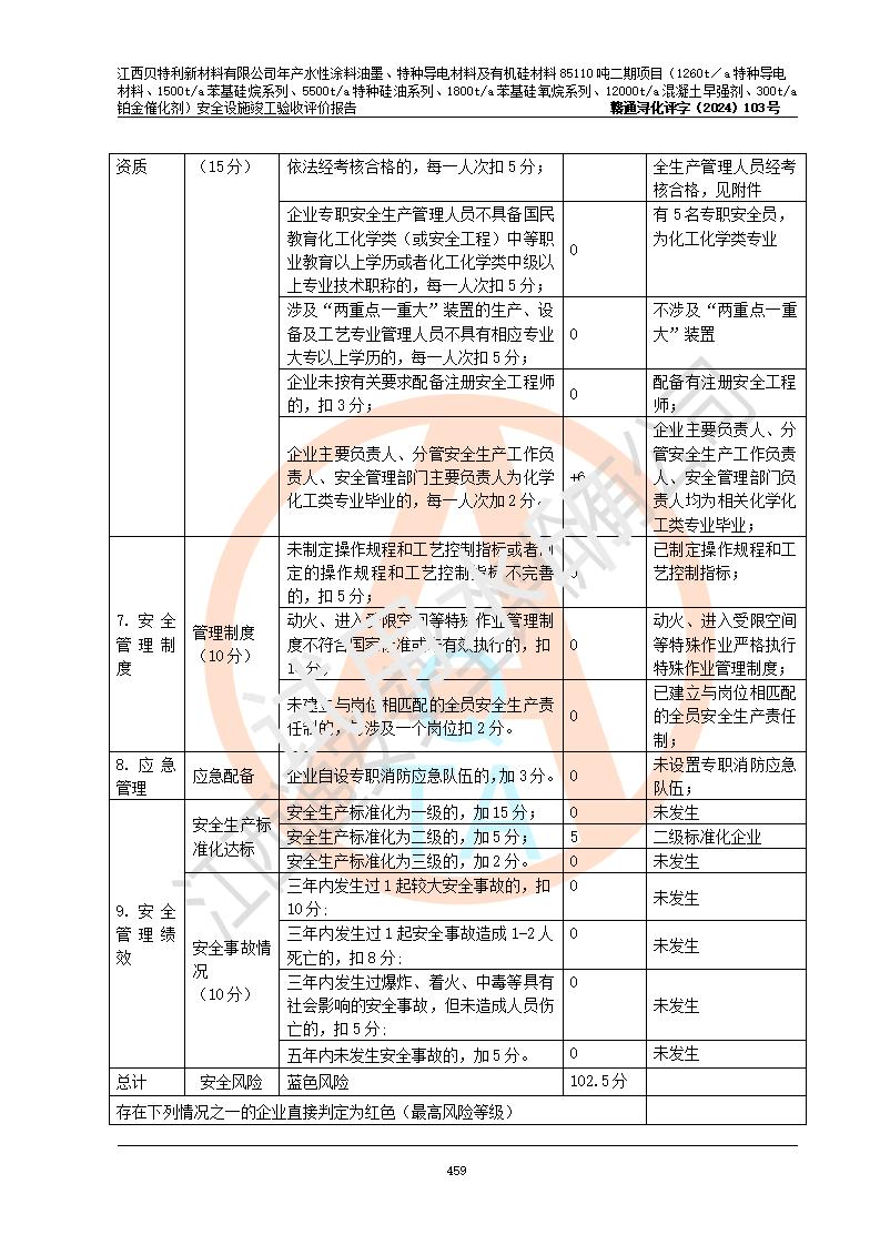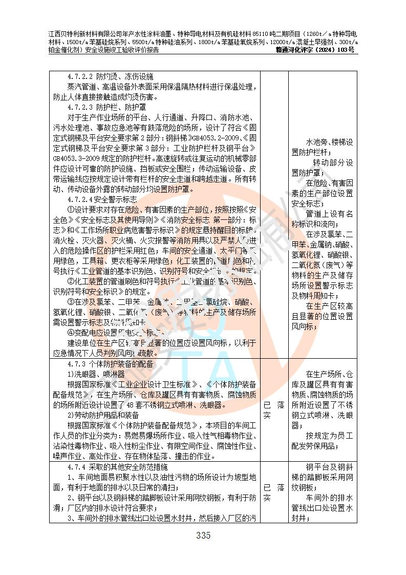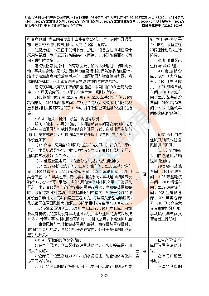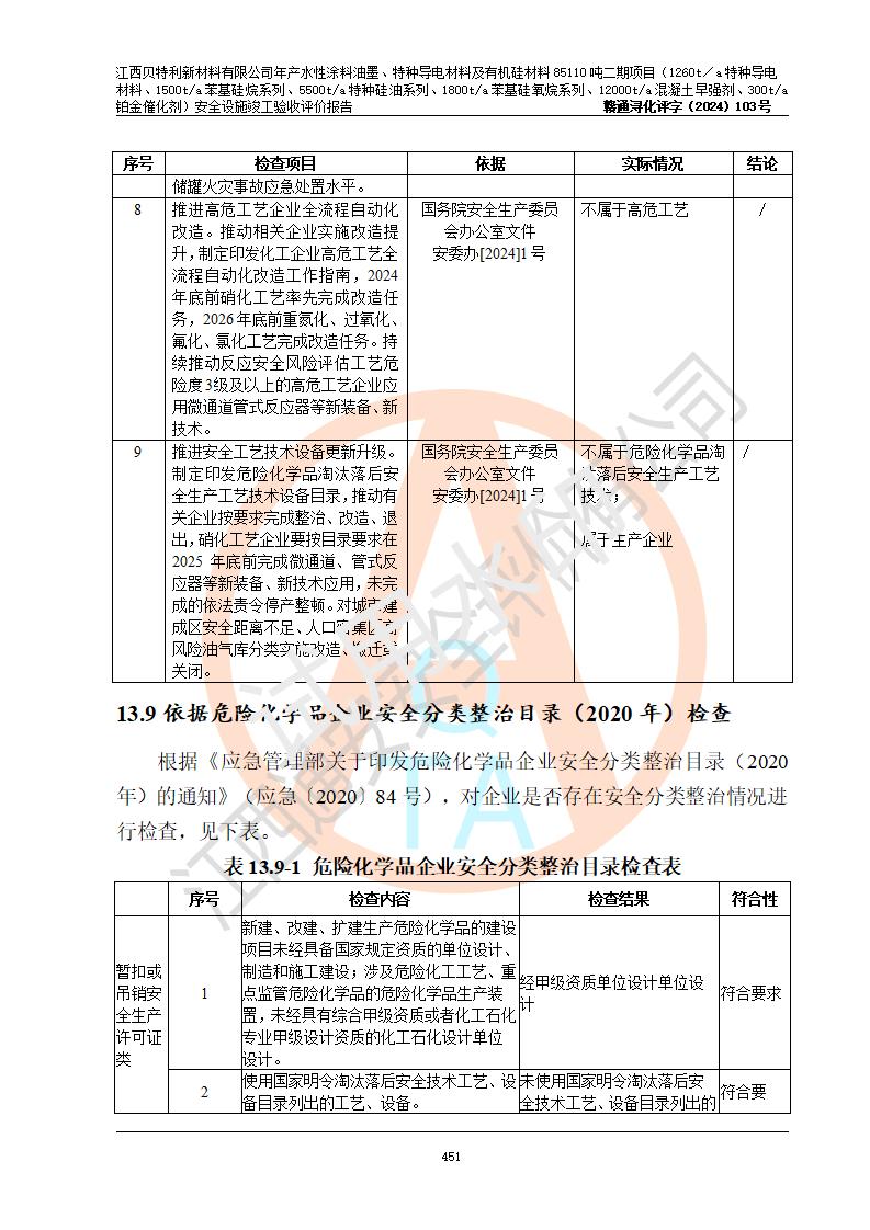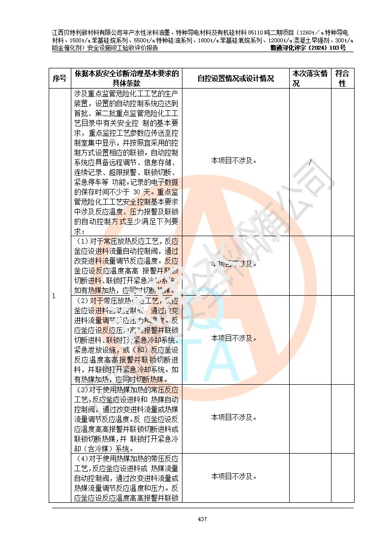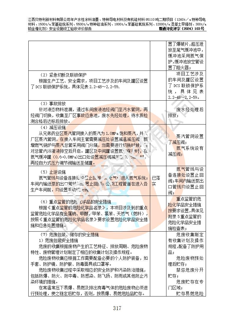 評價結論 | 經(jīng)評價組評價,江西貝特利新材料有限公司1260t/a特種導電材料、1500t/a苯基硅烷系列、5500t/a特種硅油系列、1800t/a苯基硅氧烷系列、12000t/a混凝土早強劑、300t/a鉑金催化劑項目廠址、總平面布置、現(xiàn)場設備布置情況與設計圖紙一致,本次項目按設計要求,設置有DCS系統(tǒng)、SIS系統(tǒng)、GDS系統(tǒng),符合《江西省應急管理廳關于印發(fā)<江西省化工企業(yè)自動化提升實施方案>(試行)的通知》贛應急字[2021]190號,符合《危險化學品生產(chǎn)建設項目安全風險防控指南(試行)》規(guī)定竣工驗收的安全條件;企業(yè)主要負責人、安全管理部門負責人均為化學、化工相關專業(yè),且有三年以上化工行業(yè)從業(yè)經(jīng)歷,企業(yè)主要負責人及安全管理人員已取得危險化學品企業(yè)主要負責人及安全管理人員考核合格證。項目選擇的工藝過程及設備設施的安全可靠性能達到**法規(guī)、標準規(guī)定要求。 項目運行后存在的主要危險、有害因素有:火災、其他爆炸、容器爆炸、中毒與窒息等;存在的主要有害因素有化學物質(zhì)危害等;針對存在的危險、有害因素,企業(yè)采取了**的安全技術措施及安全管理措施,符合**有關法規(guī)、標準、規(guī)范要求;項目風險可控,其安全生產(chǎn)條件和安全管理方面具備竣工安全驗收的條件。 | |||||