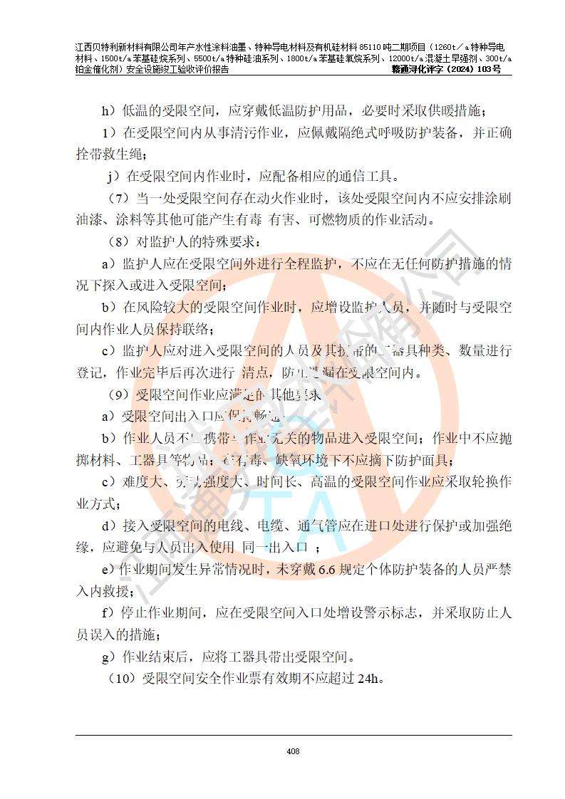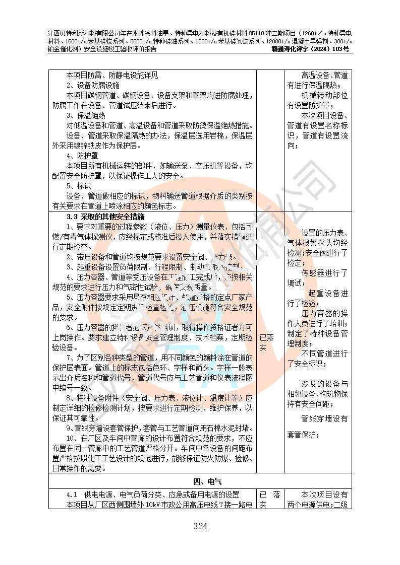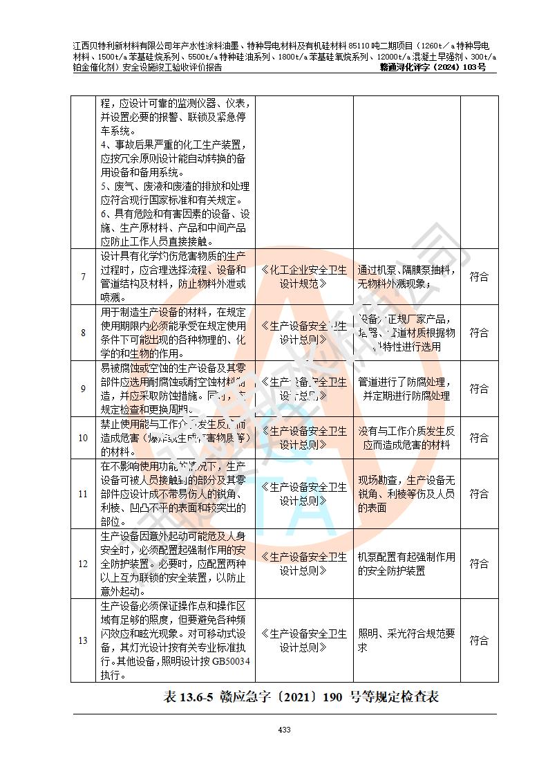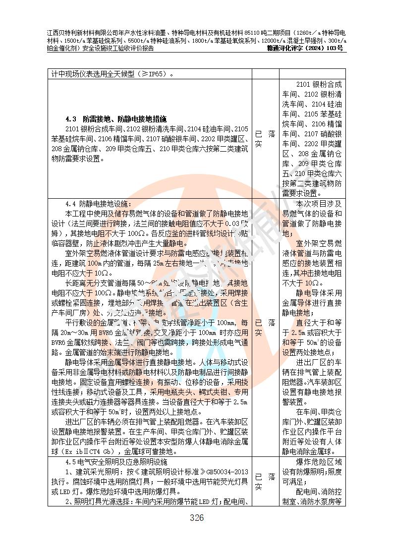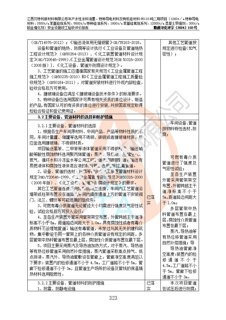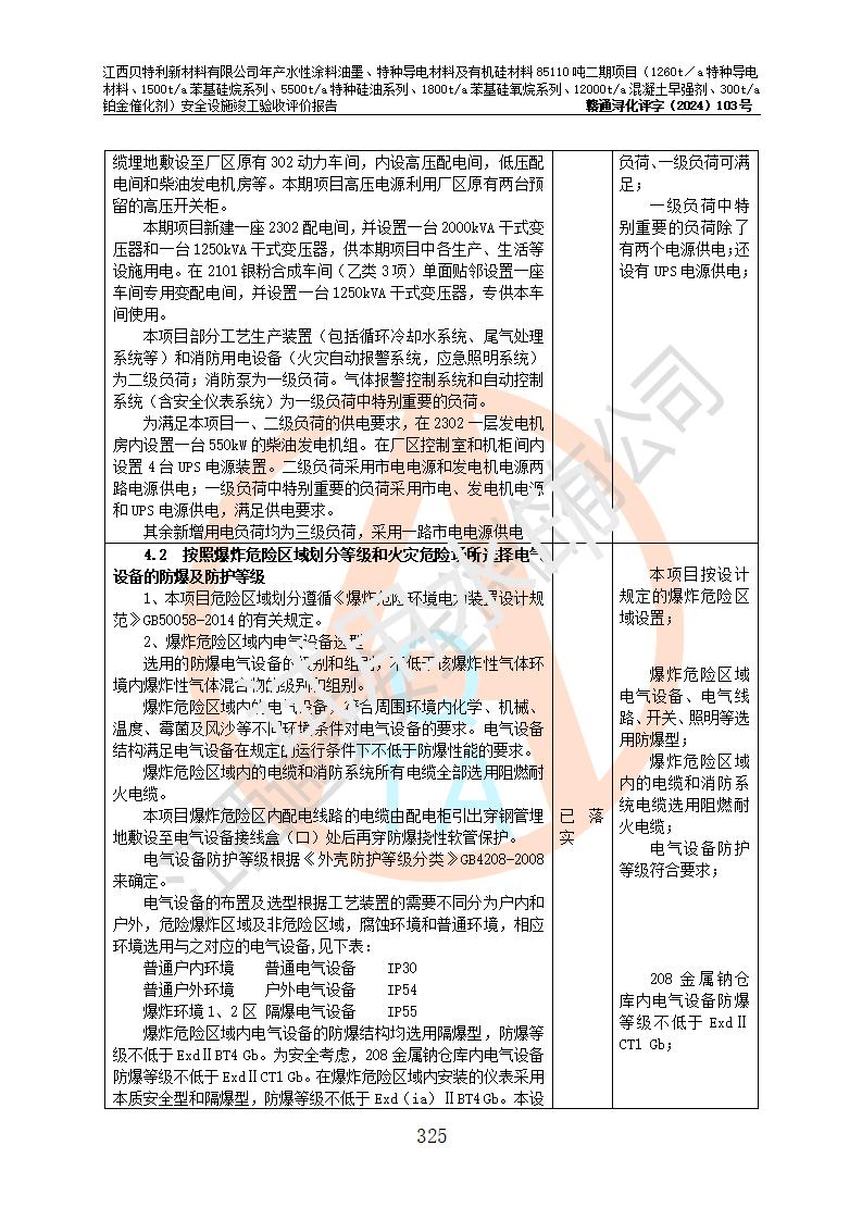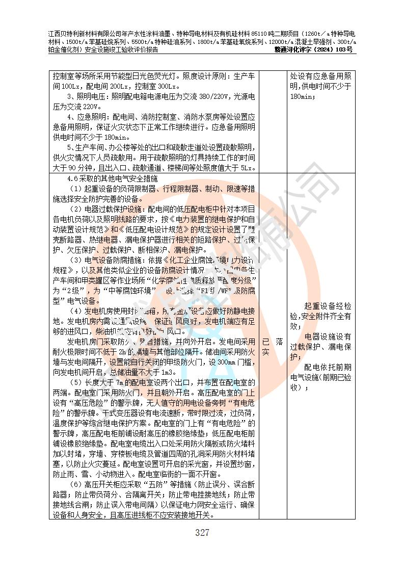 評價結論 | 經(jīng)評價組評價,江西貝特利新材料有限公司1260t/a特種導電材料、1500t/a苯基硅烷系列、5500t/a特種硅油系列、1800t/a苯基硅氧烷系列、12000t/a混凝土早強劑、300t/a鉑金催化劑項目廠址、總平面布置、現(xiàn)場設備布置情況與設計圖紙一致,本次項目按設計要求,設置有DCS系統(tǒng)、SIS系統(tǒng)、GDS系統(tǒng),符合《江西省應急管理廳關于印發(fā)<江西省化工企業(yè)自動化提升實施方案>(試行)的通知》贛應急字[2021]190號,符合《危險化學品生產(chǎn)建設項目安全風險防控指南(試行)》規(guī)定竣工驗收的安全條件;企業(yè)主要負責人、安全管理部門負責人均為化學、化工相關專業(yè),且有三年以上化工行業(yè)從業(yè)經(jīng)歷,企業(yè)主要負責人及安全管理人員已取得危險化學品企業(yè)主要負責人及安全管理人員考核合格證。項目選擇的工藝過程及設備設施的安全可靠性能達到**法規(guī)、標準規(guī)定要求。 項目運行后存在的主要危險、有害因素有:火災、其他爆炸、容器爆炸、中毒與窒息等;存在的主要有害因素有化學物質(zhì)危害等;針對存在的危險、有害因素,企業(yè)采取了**的安全技術措施及安全管理措施,符合**有關法規(guī)、標準、規(guī)范要求;項目風險可控,其安全生產(chǎn)條件和安全管理方面具備竣工安全驗收的條件。 | |||||